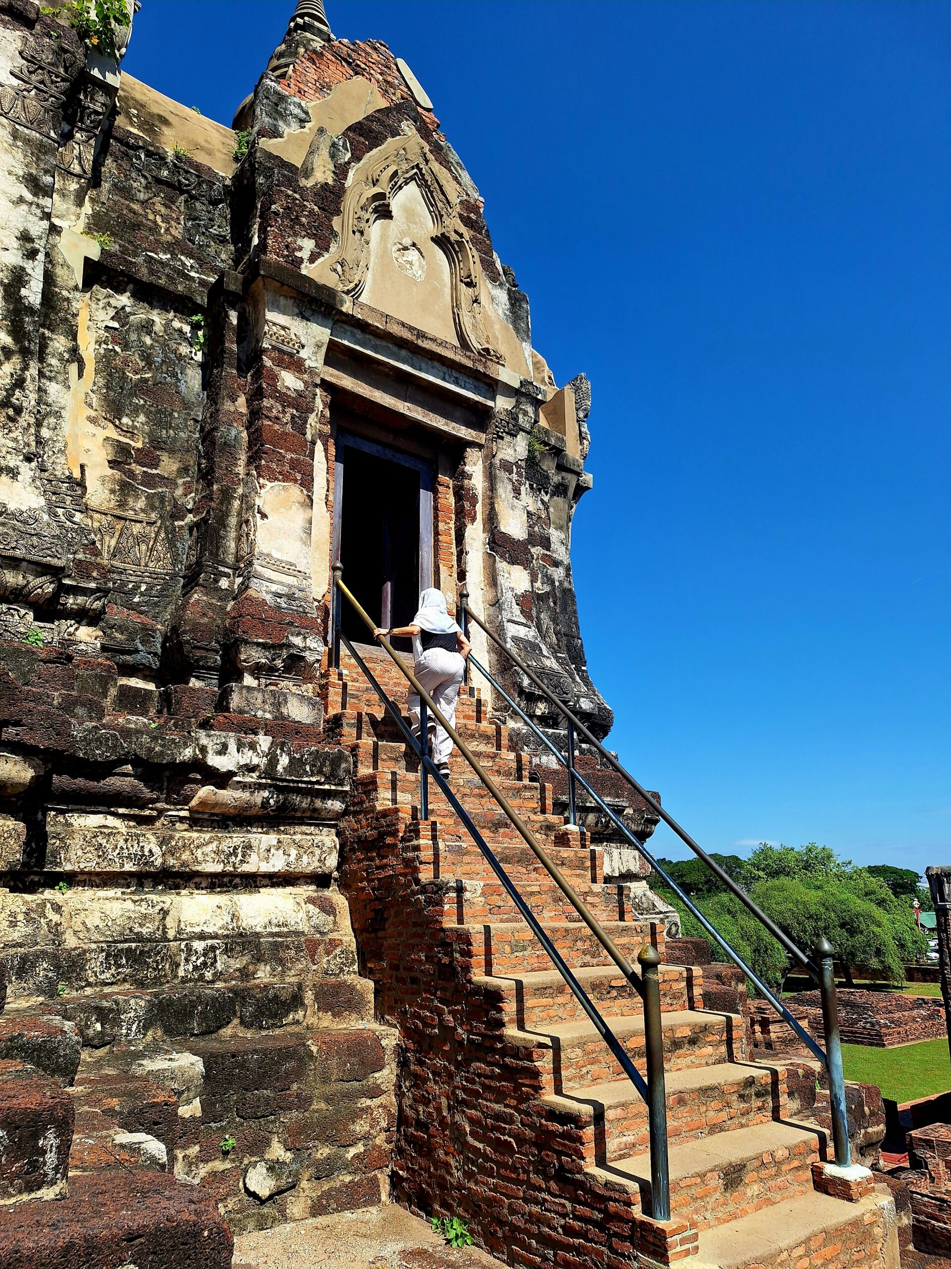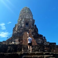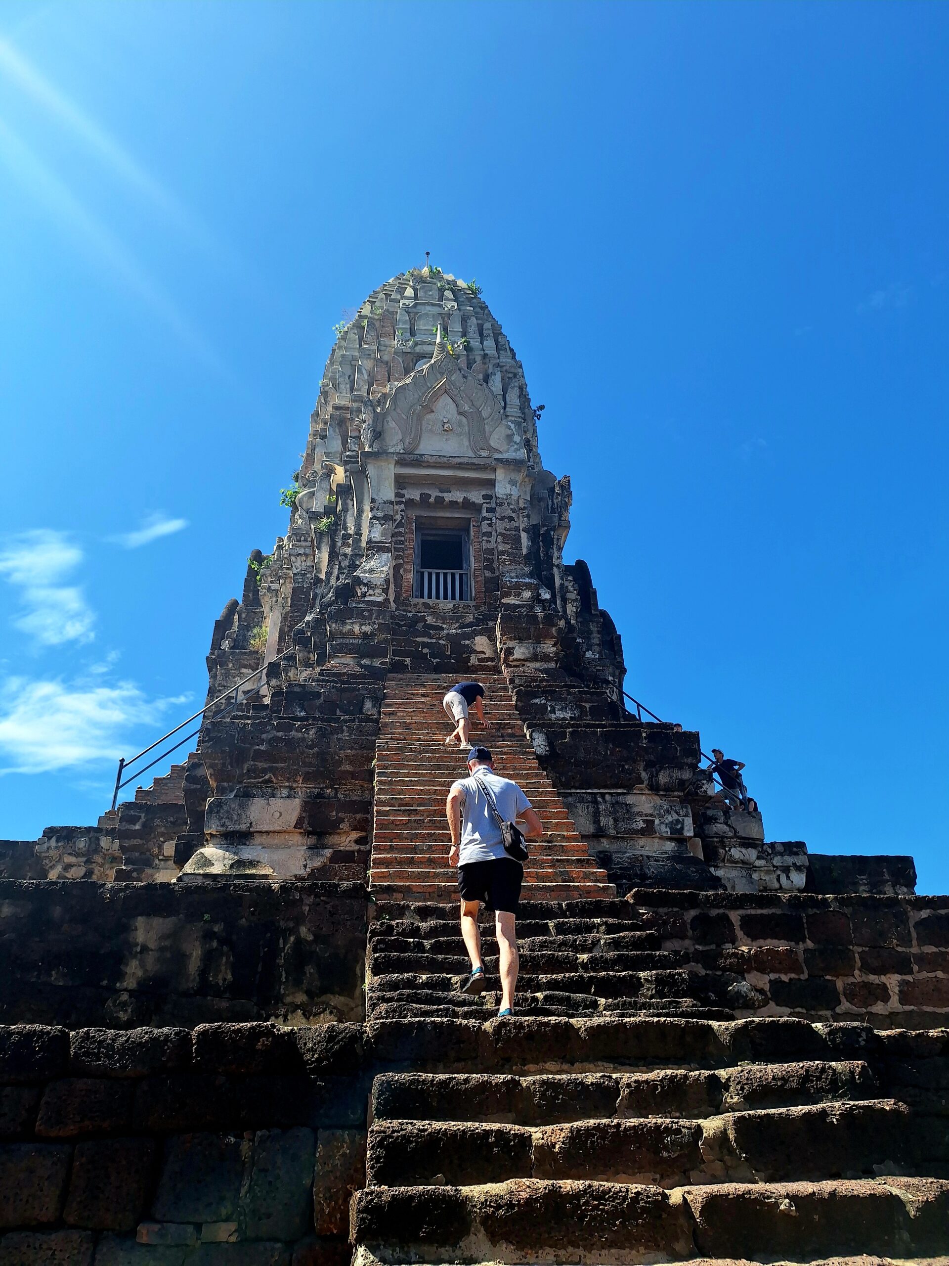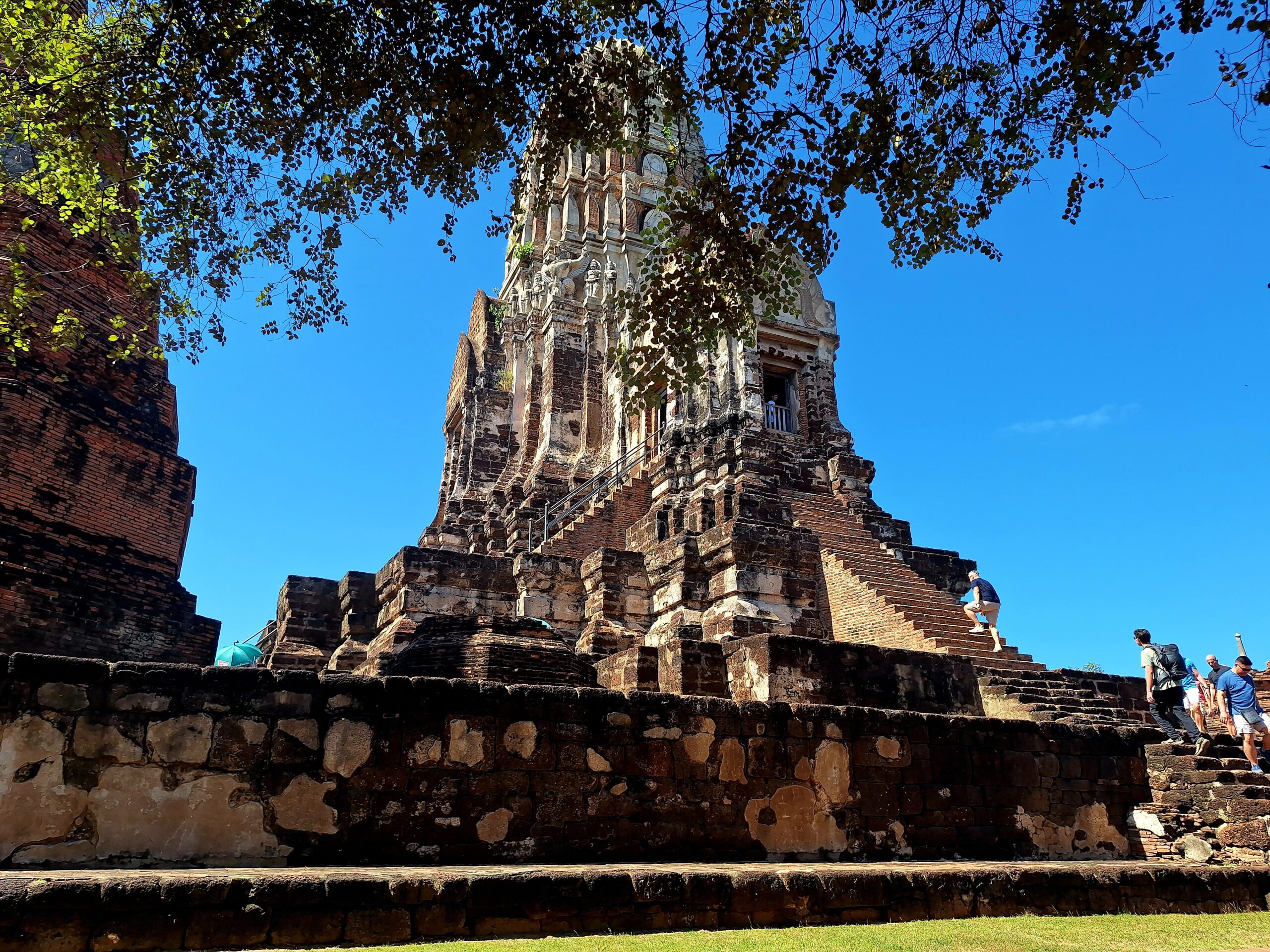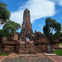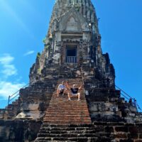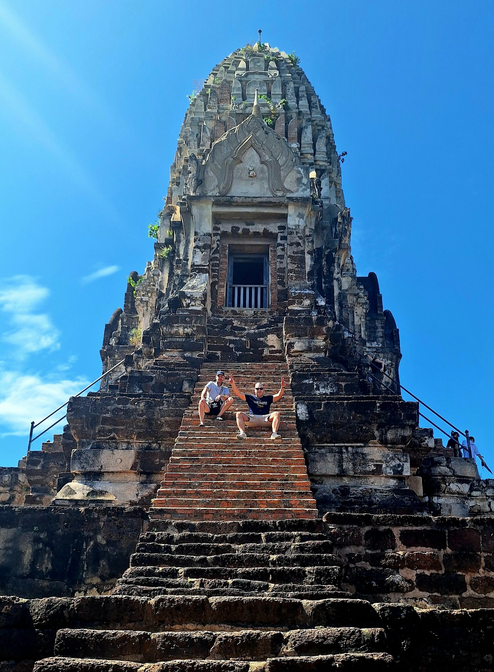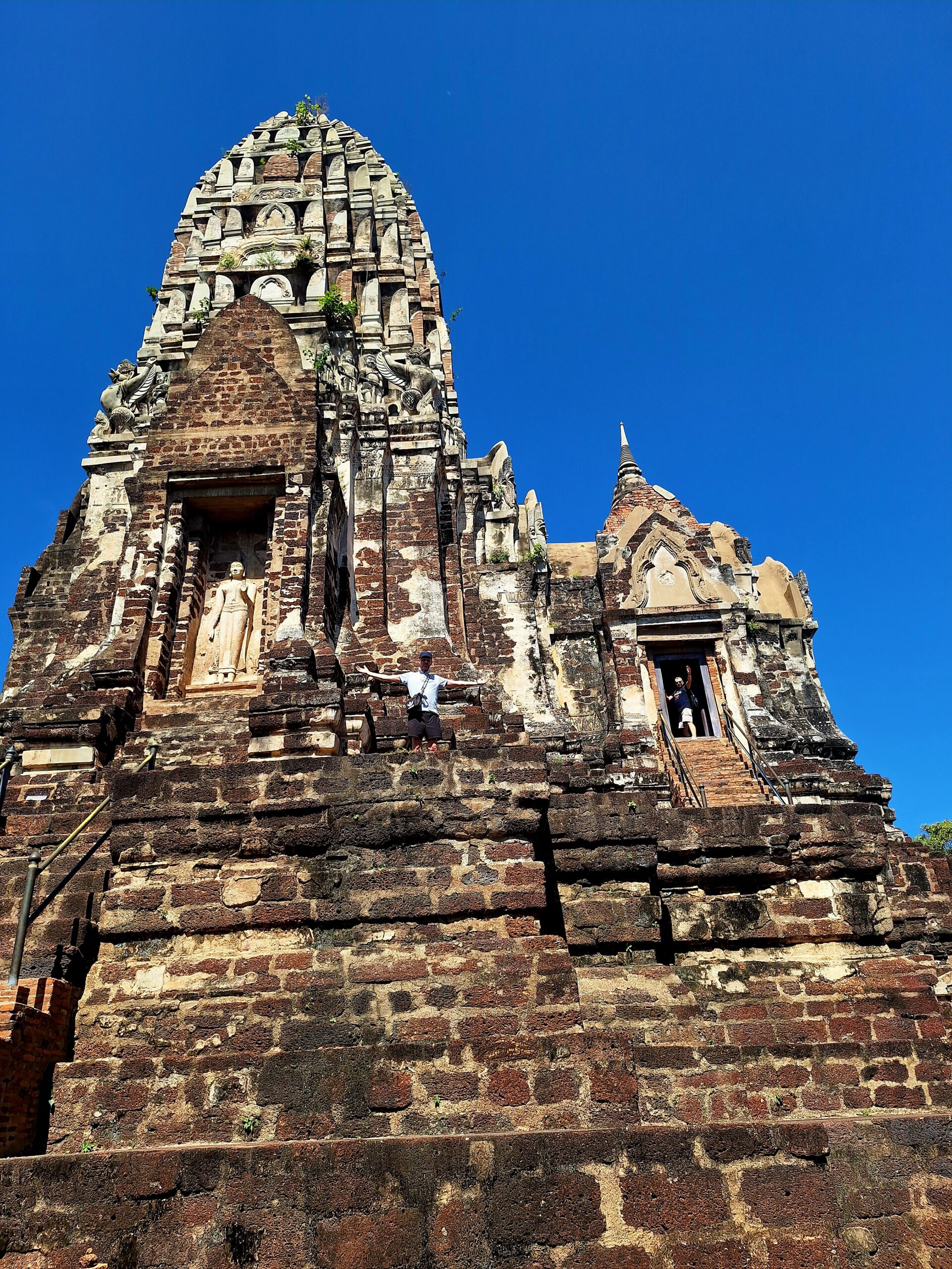 Na miejscu najpierw była kawa jeszcze na stacji kolejowej, a potem jazda tuk-tukiem do pierwszej świątyni (koszt stały odgórny 250 THB). Zazwyczaj z tego co czytałem wszyscy zaczynają wędrówkę między pozostałościami świątyń od Wat Ratchaburana – wstęp kosztował 50 THB. My zrobiliśmy tak samo. Miejsce robi oszałamiające wrażenie. Można wejść po schodach na górę do świątyni. Do pozostałych świątyń kupiliśmy bilet zbiorczy za 250 THB, nie wiemy dlaczego tylko ta jedna świątynia miała osobny bilet?