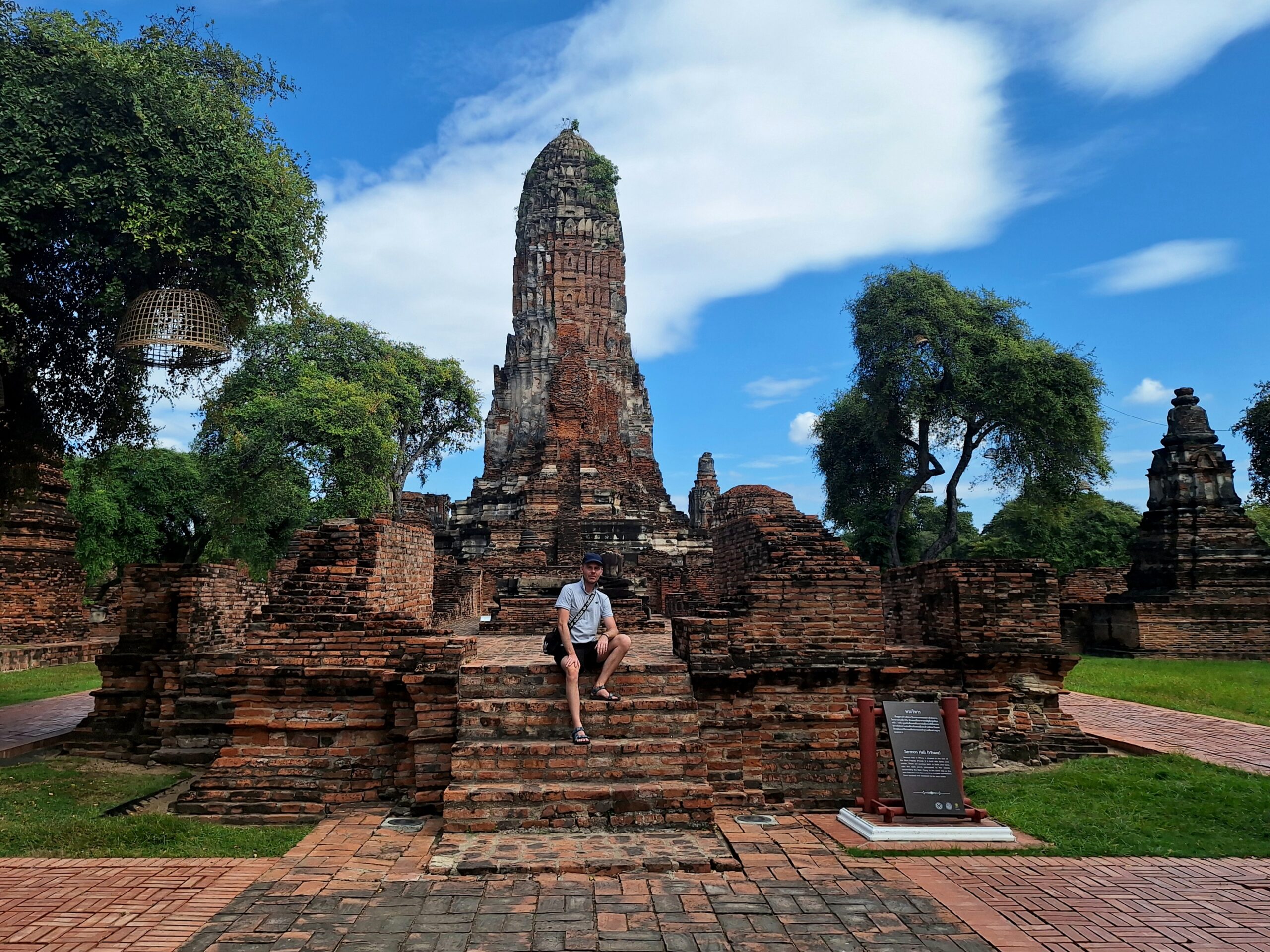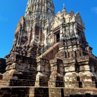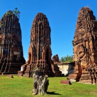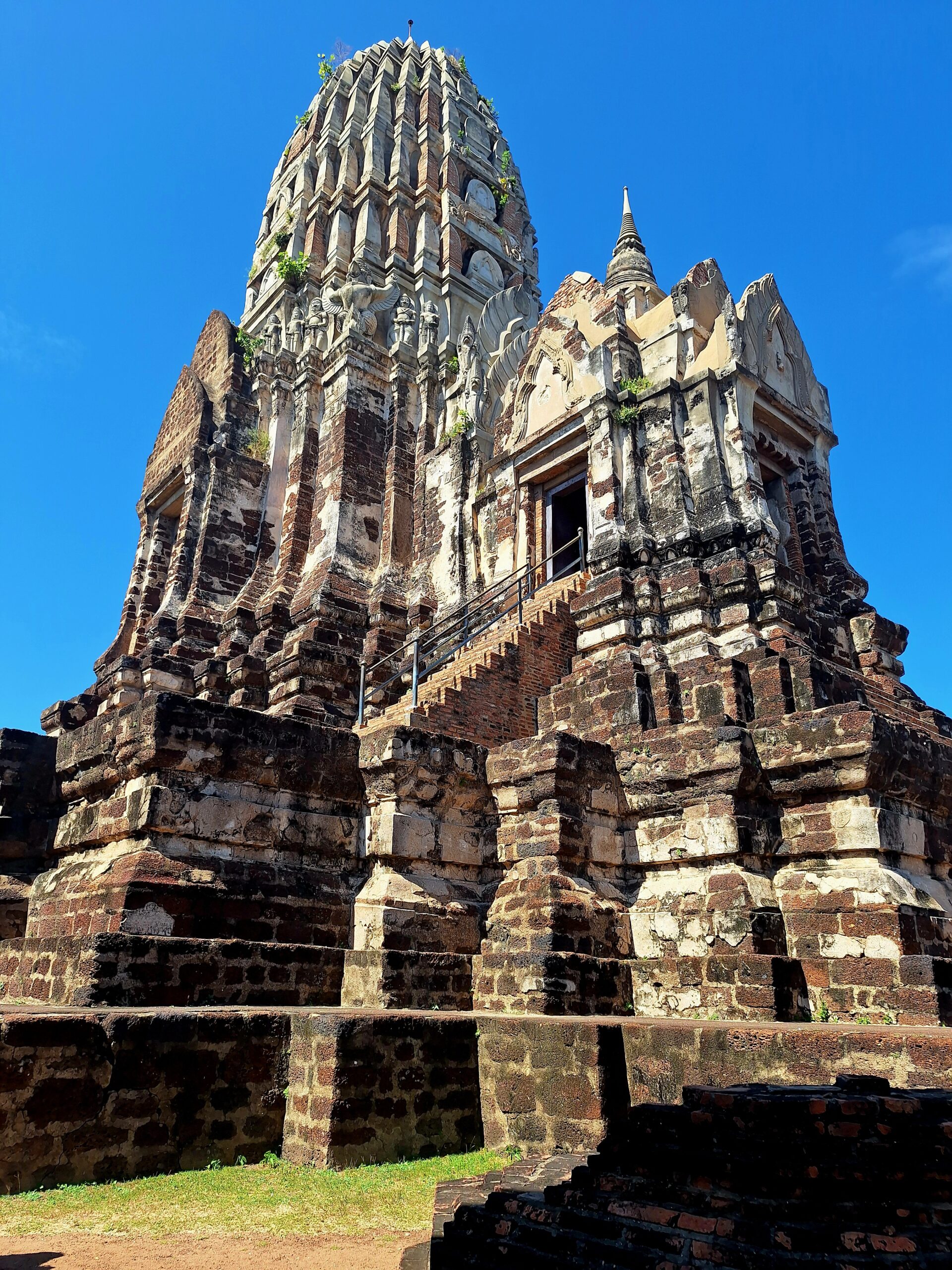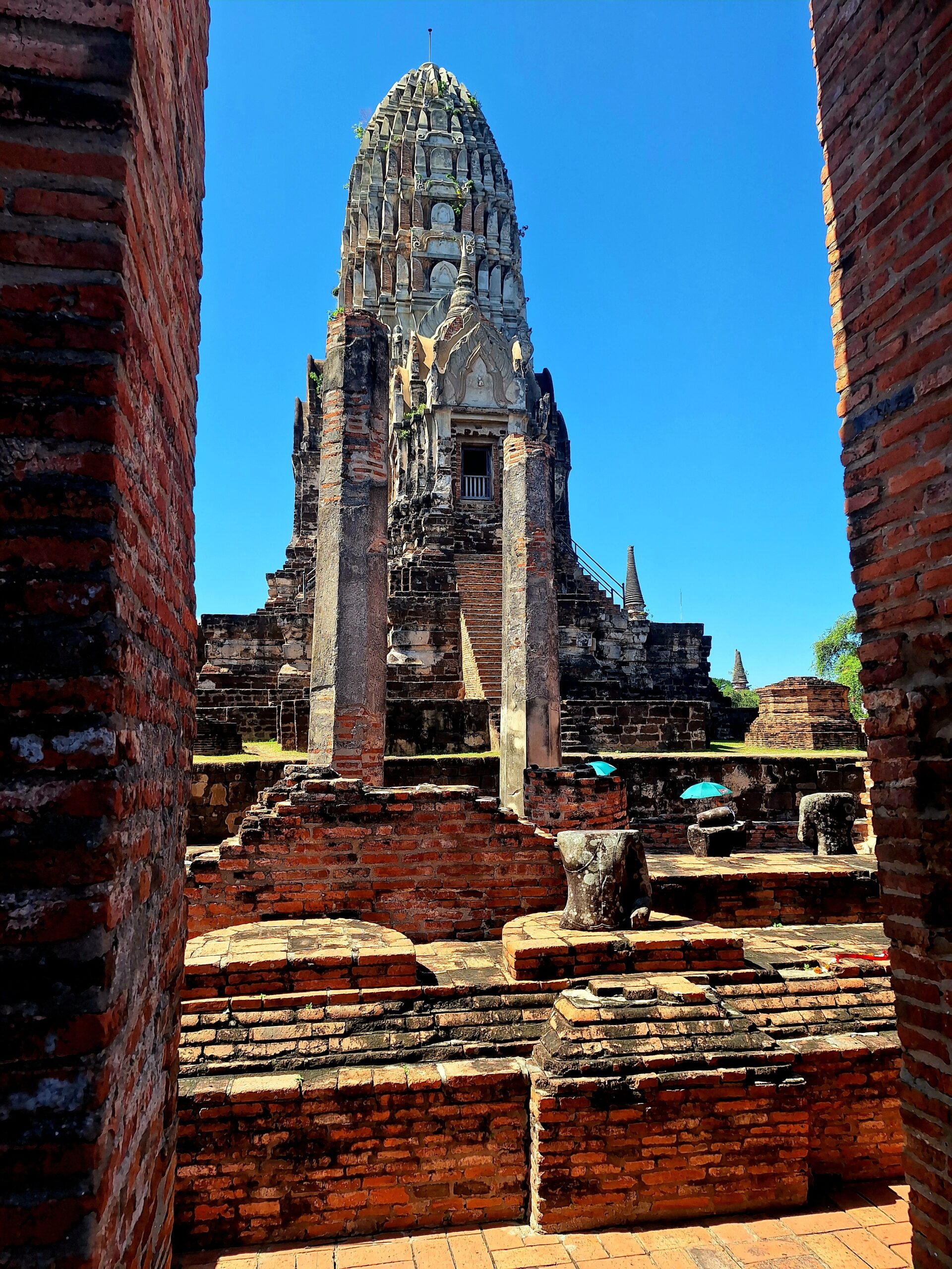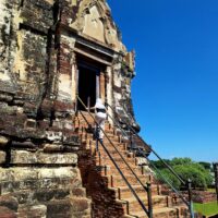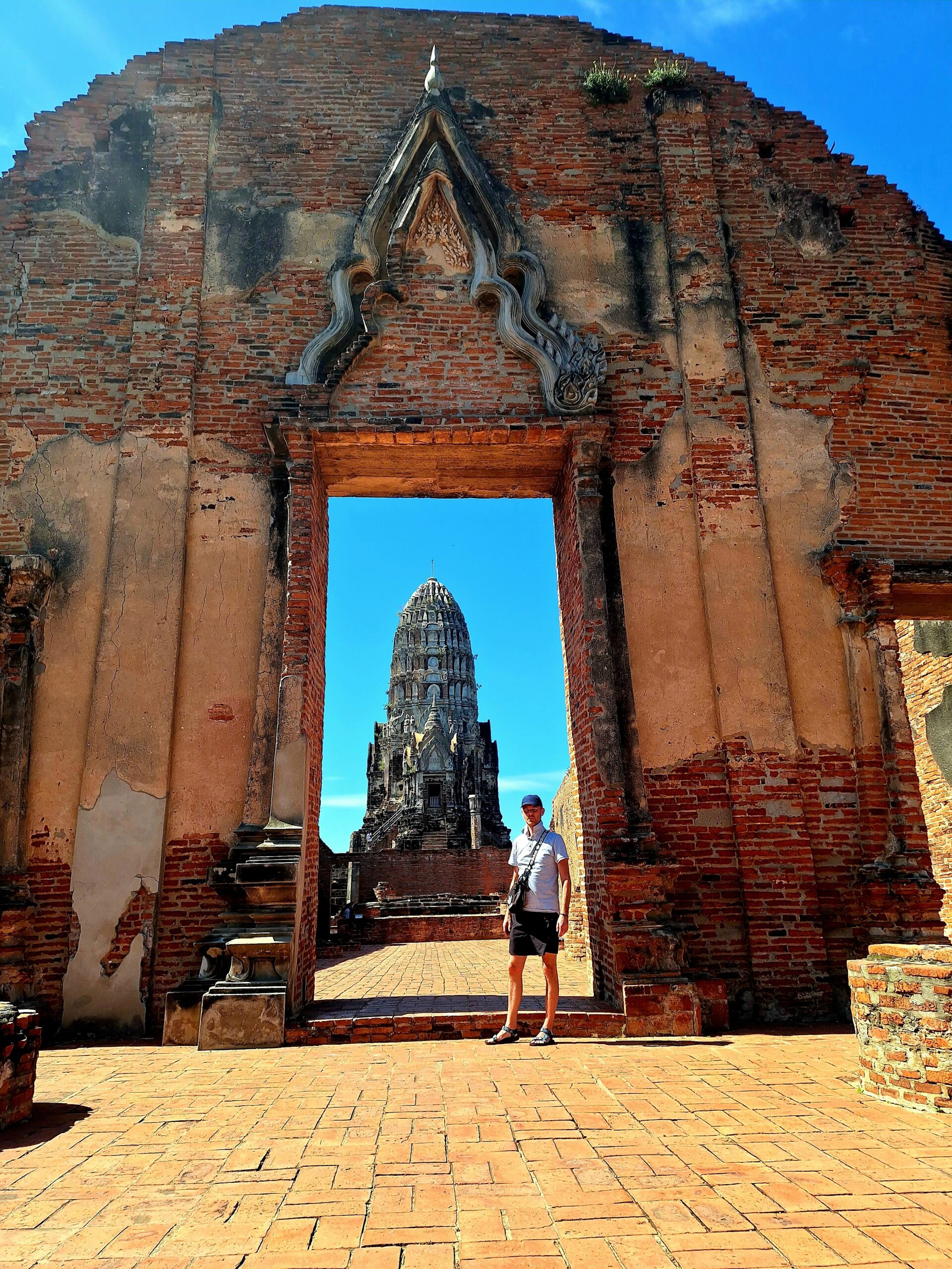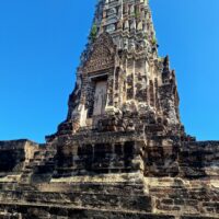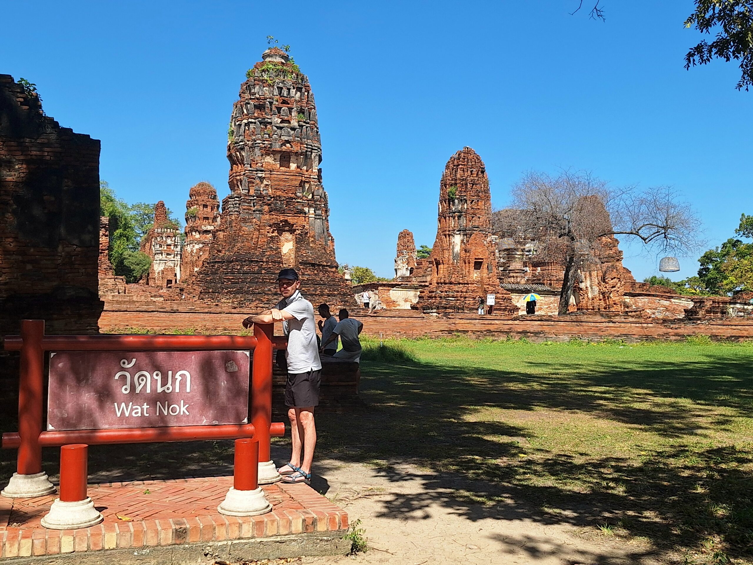 Na miejscu najpierw była kawa jeszcze na stacji kolejowej, a potem jazda tuk-tukiem do pierwszej świątyni (koszt stały odgórny 250 THB). Zazwyczaj z tego co czytałem wszyscy zaczynają wędrówkę między pozostałościami świątyń od Wat Ratchaburana – wstęp kosztował 50 THB. My zrobiliśmy tak samo. Miejsce robi oszałamiające wrażenie. Można wejść po schodach na górę do świątyni. Do pozostałych świątyń kupiliśmy bilet zbiorczy za 250 THB, nie wiemy dlaczego tylko ta jedna świątynia miała osobny bilet?