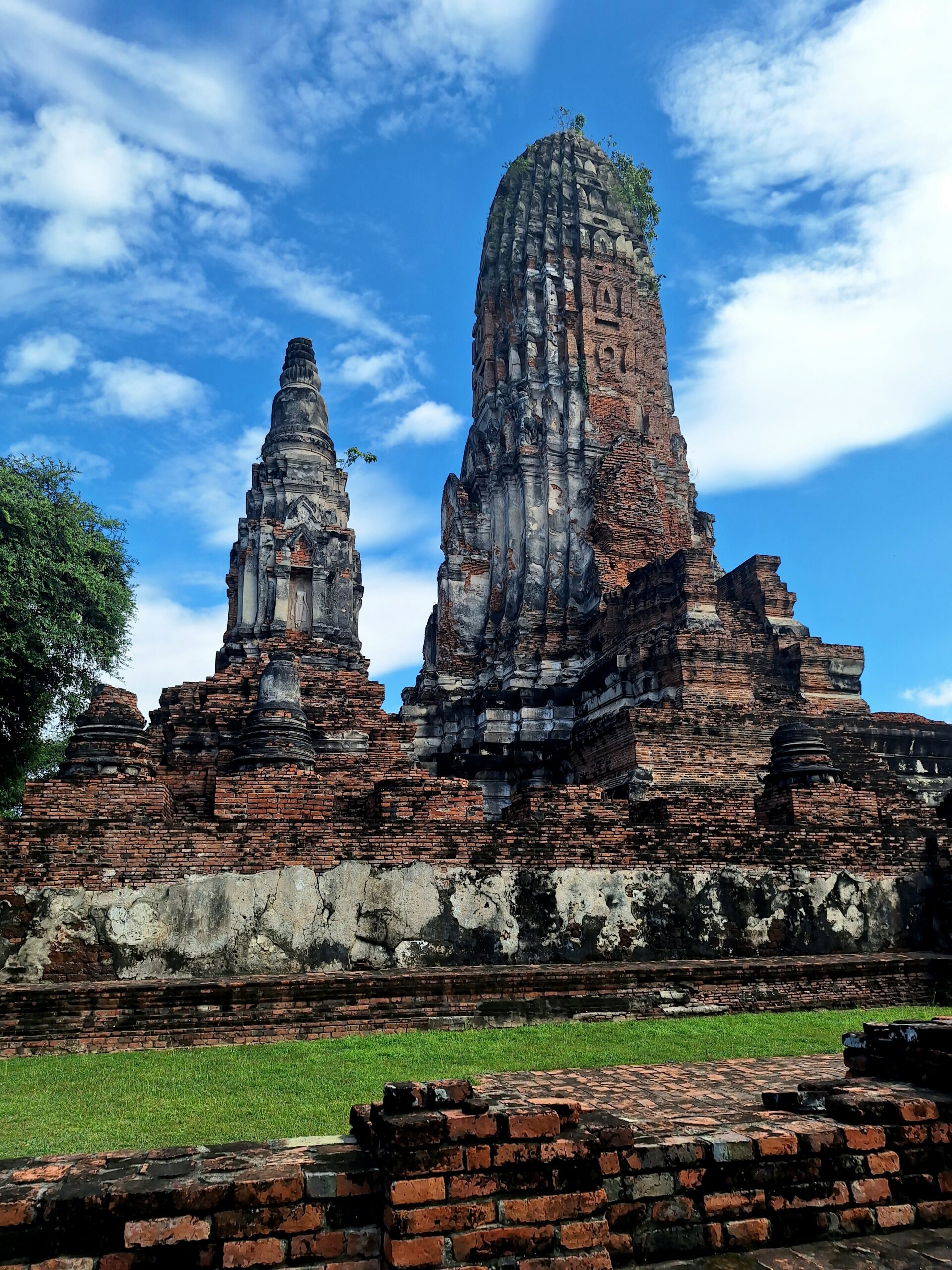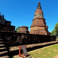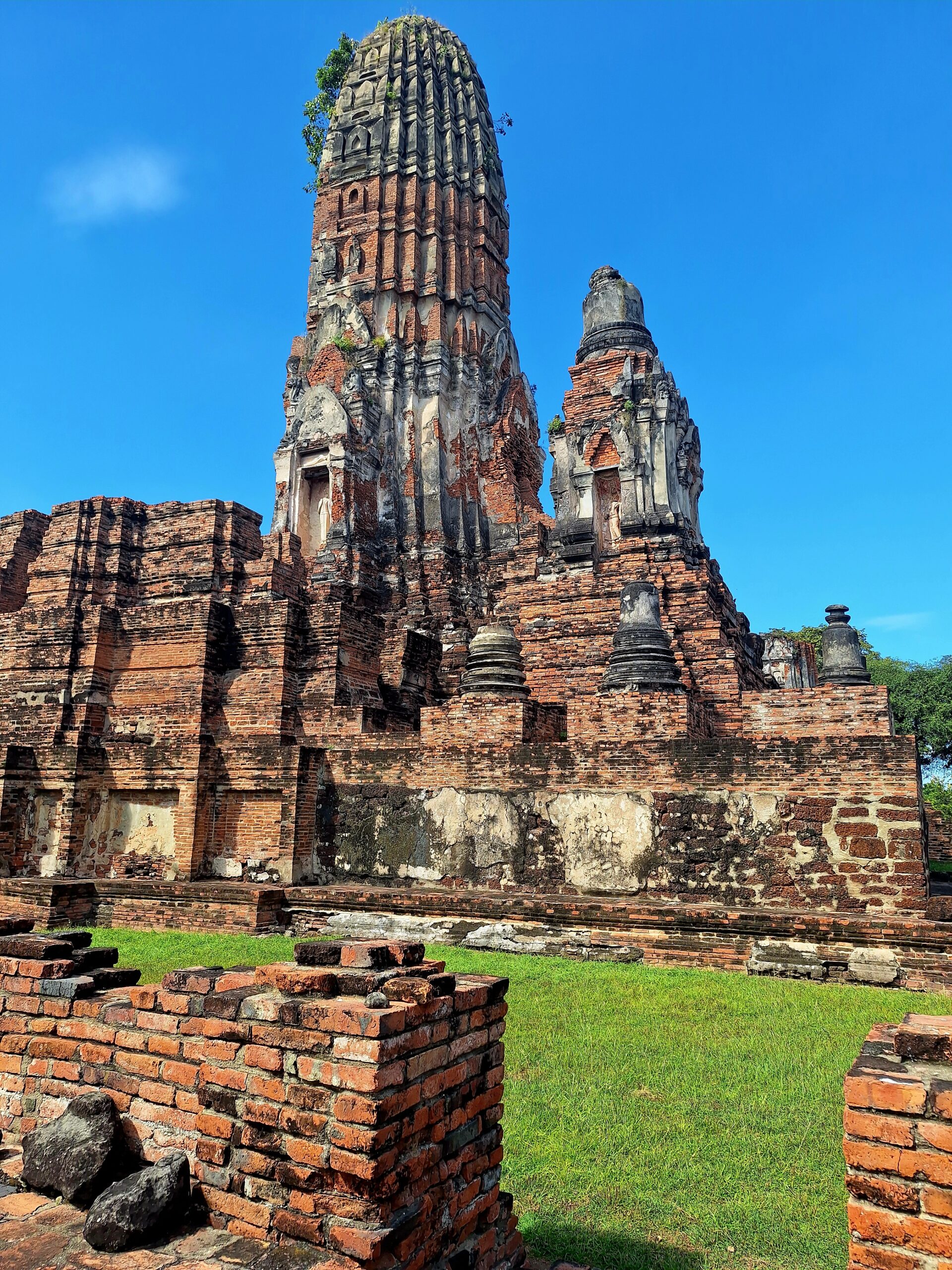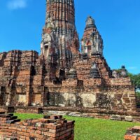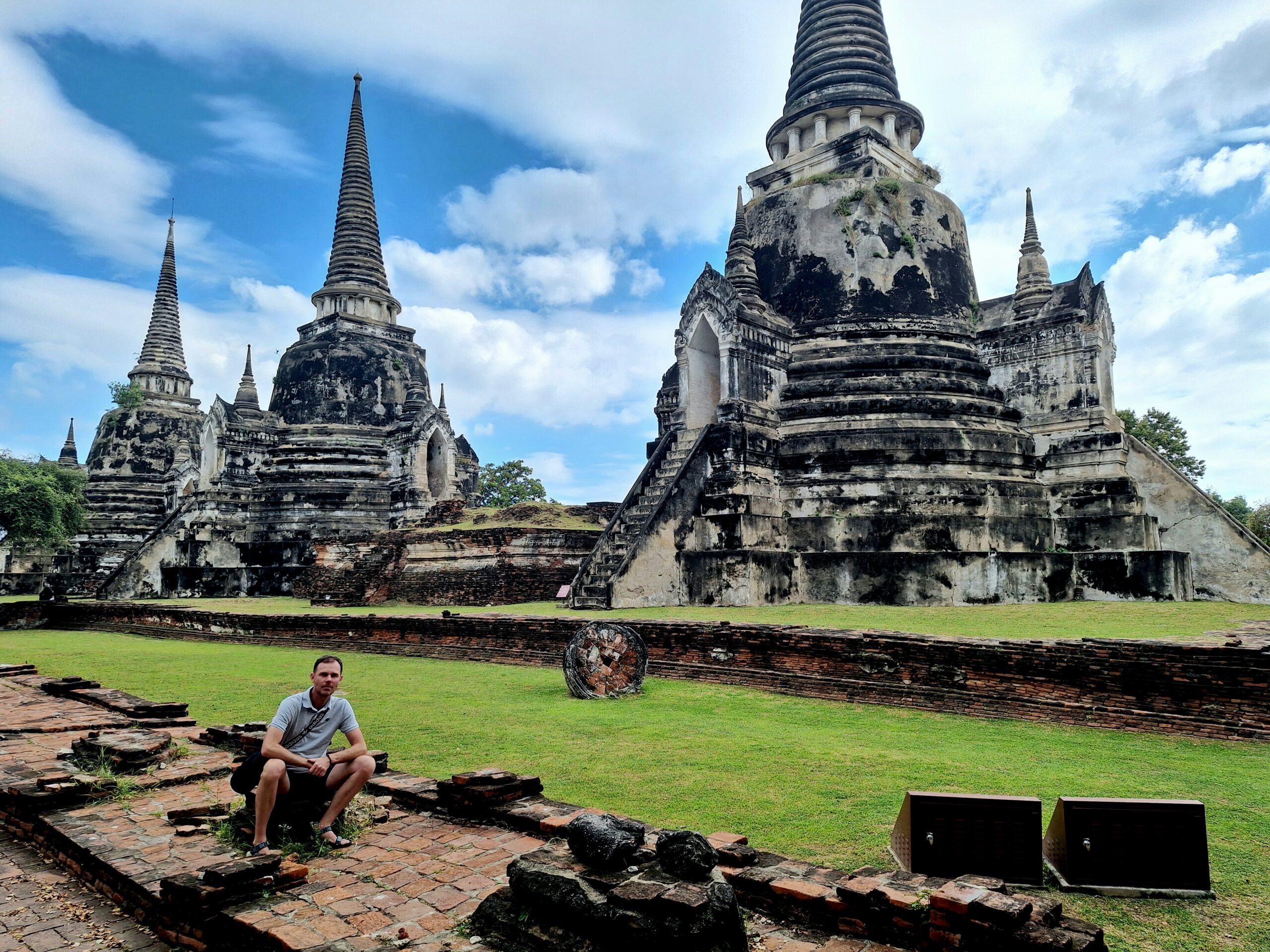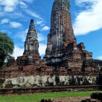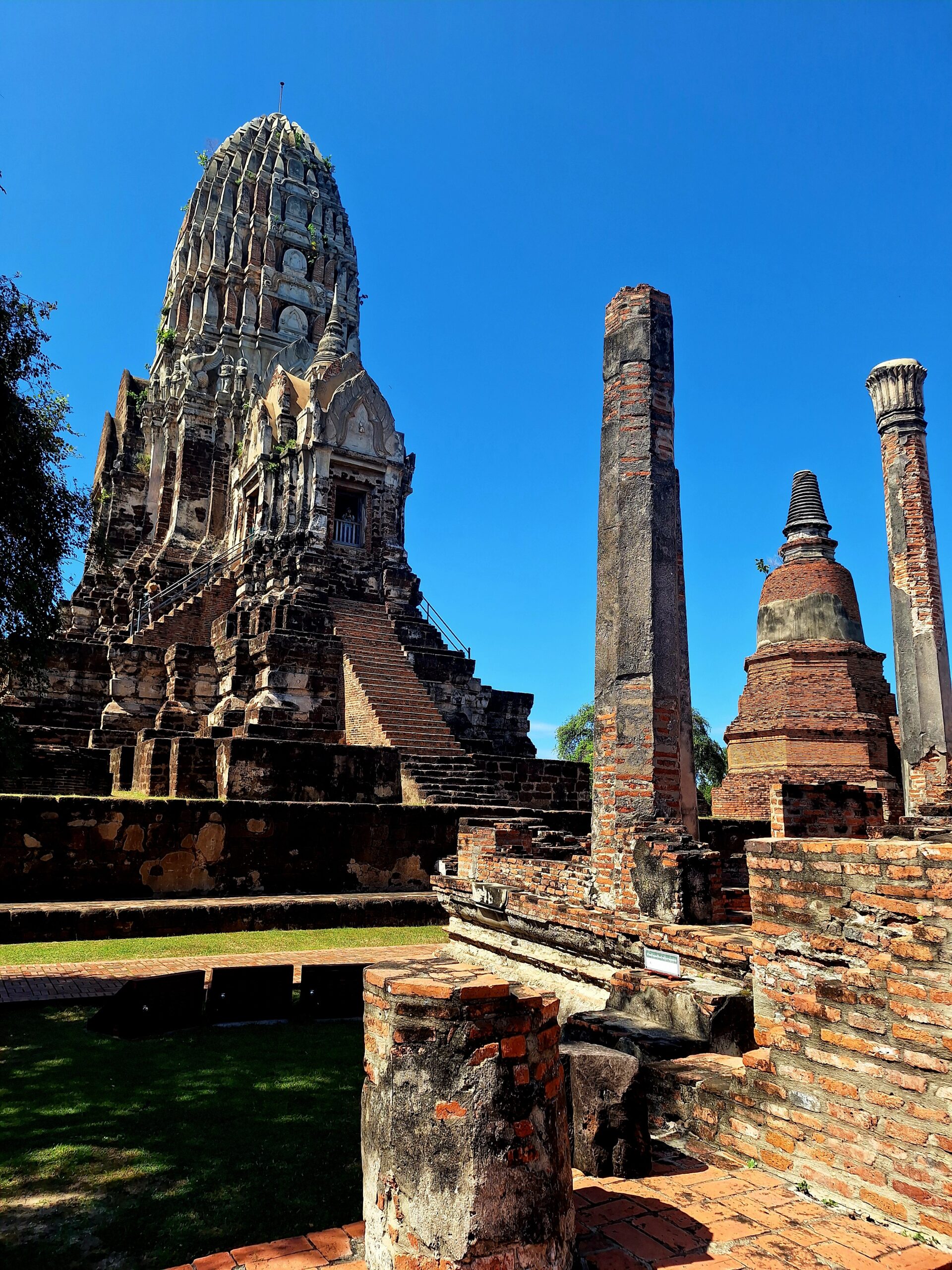 Na miejscu najpierw była kawa jeszcze na stacji kolejowej, a potem jazda tuk-tukiem do pierwszej świątyni (koszt stały odgórny 250 THB). Zazwyczaj z tego co czytałem wszyscy zaczynają wędrówkę między pozostałościami świątyń od Wat Ratchaburana – wstęp kosztował 50 THB. My zrobiliśmy tak samo. Miejsce robi oszałamiające wrażenie. Można wejść po schodach na górę do świątyni. Do pozostałych świątyń kupiliśmy bilet zbiorczy za 250 THB, nie wiemy dlaczego tylko ta jedna świątynia miała osobny bilet?