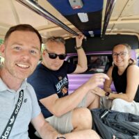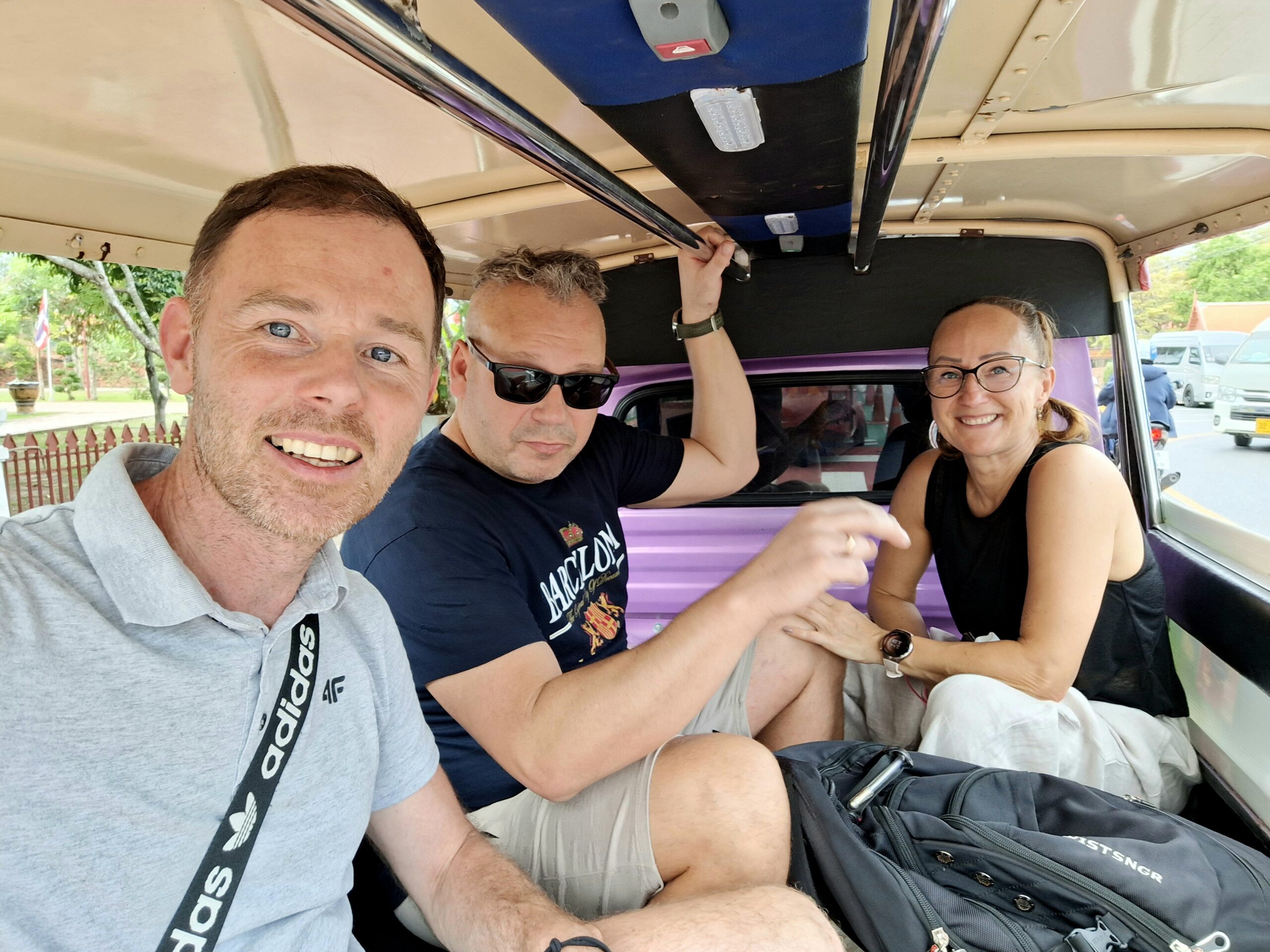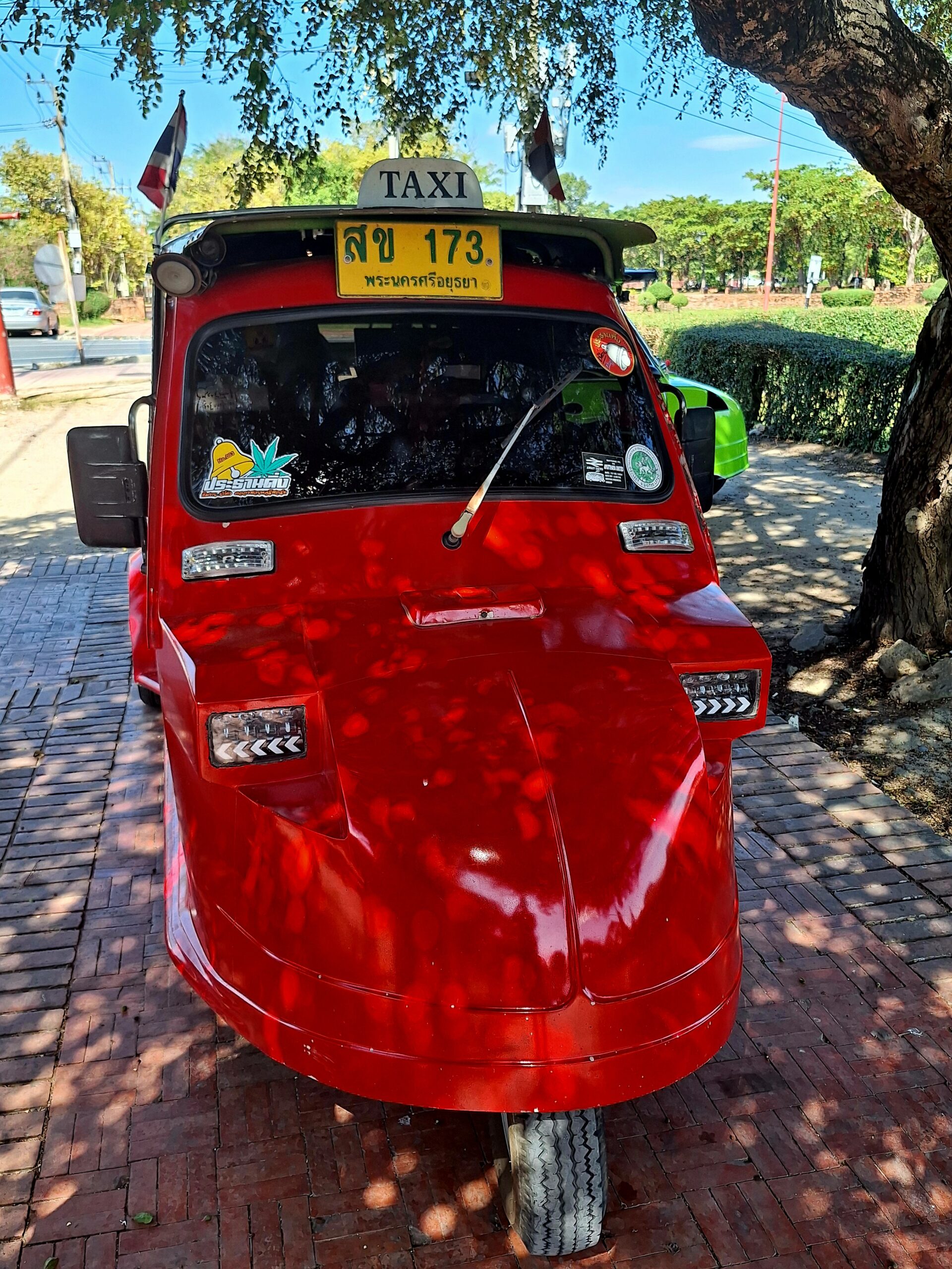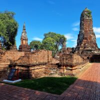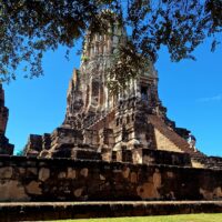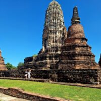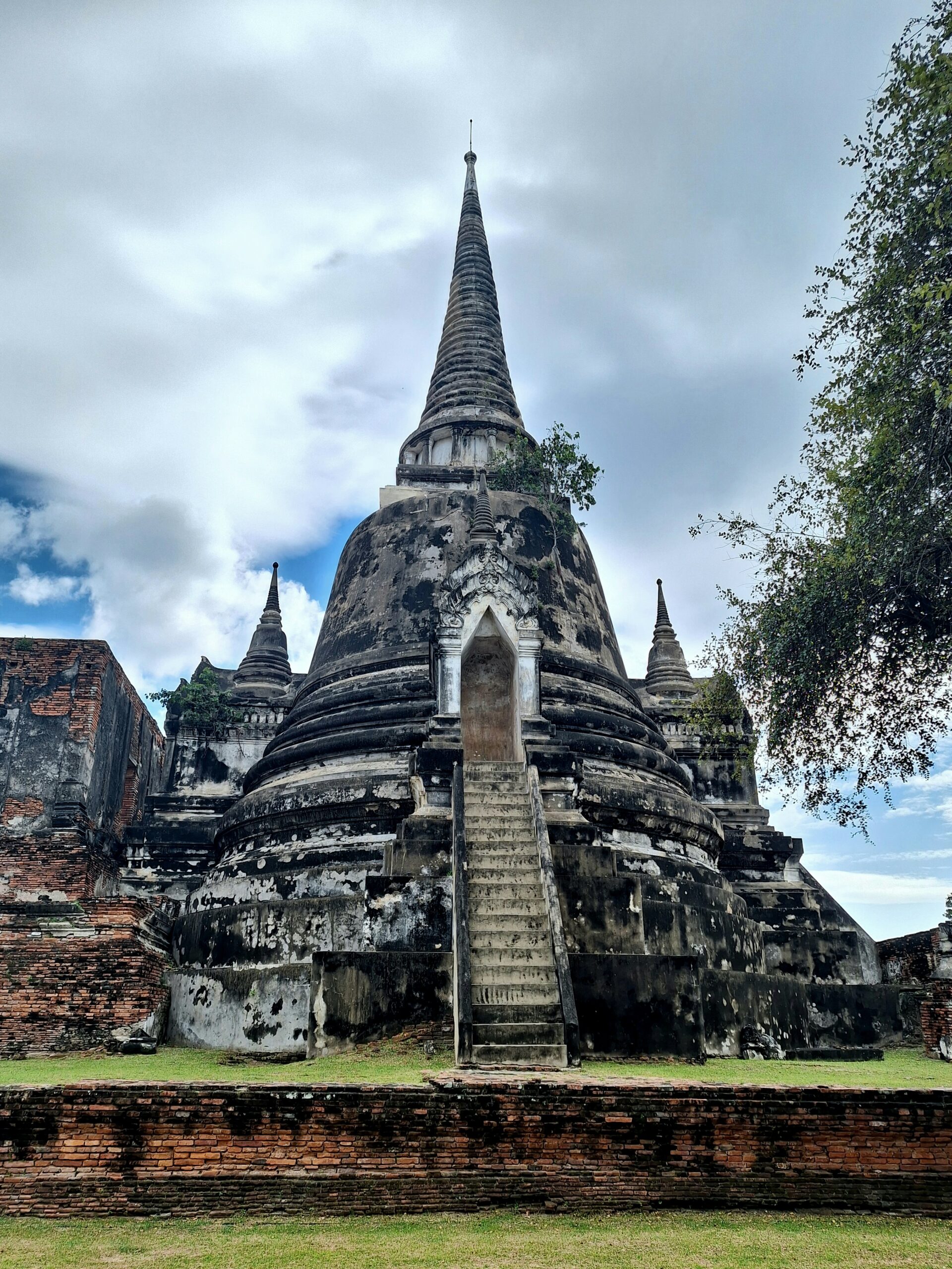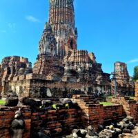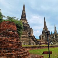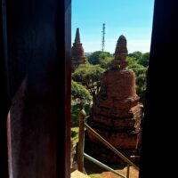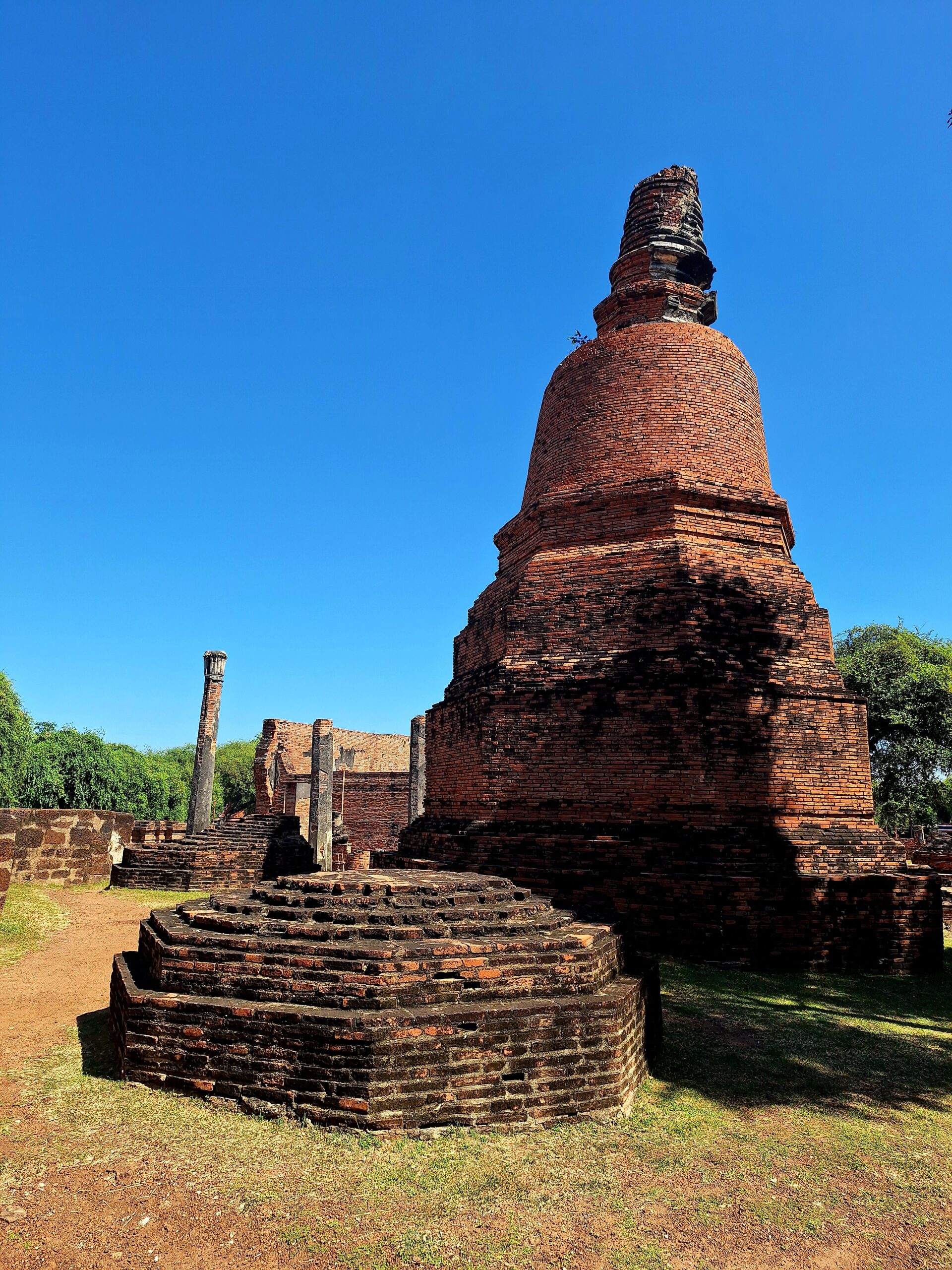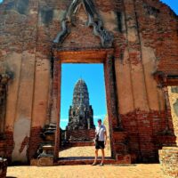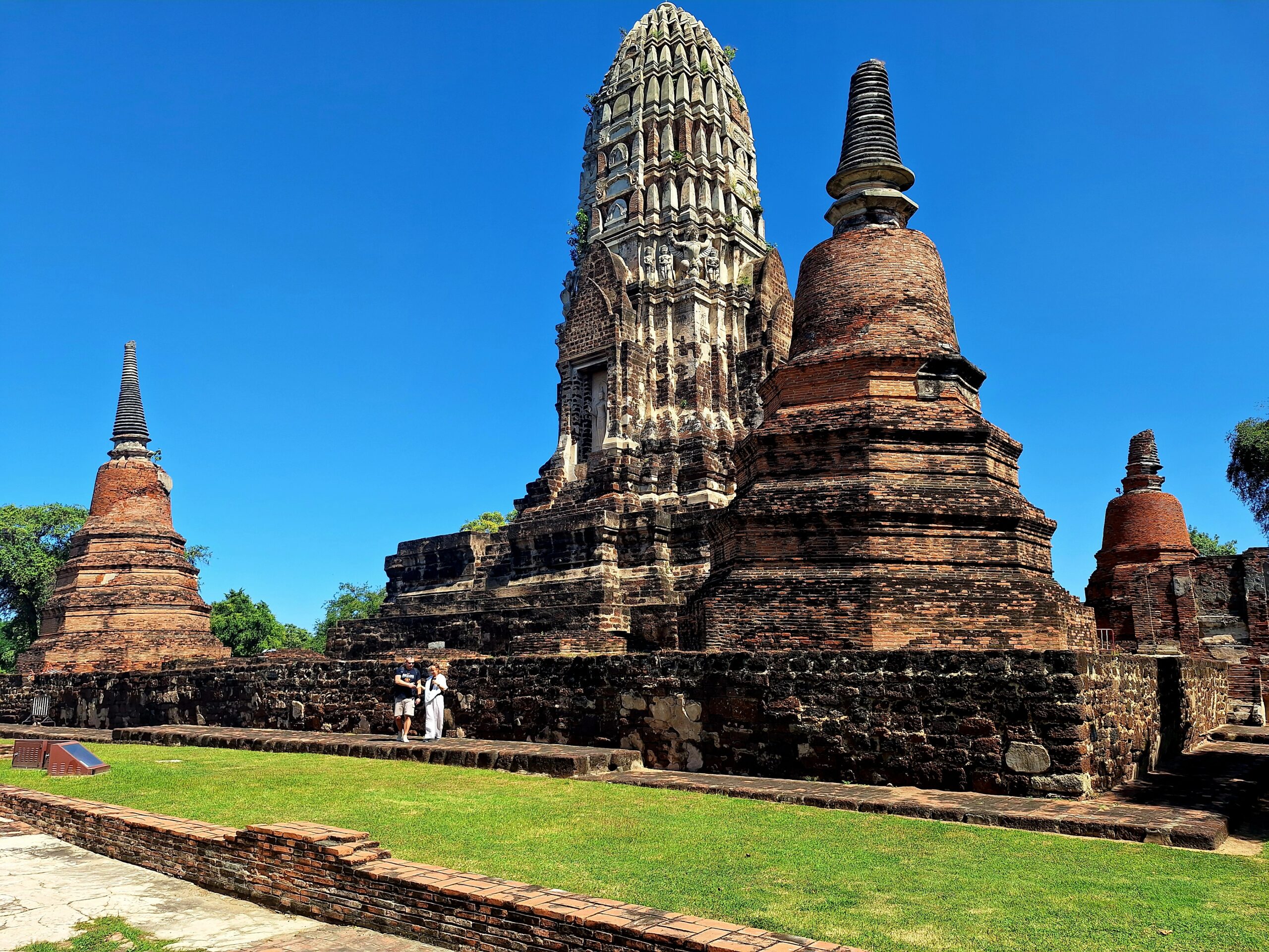 Na miejscu najpierw była kawa jeszcze na stacji kolejowej, a potem jazda tuk-tukiem do pierwszej świątyni (koszt stały odgórny 250 THB). Zazwyczaj z tego co czytałem wszyscy zaczynają wędrówkę między pozostałościami świątyń od Wat Ratchaburana – wstęp kosztował 50 THB. My zrobiliśmy tak samo. Miejsce robi oszałamiające wrażenie. Można wejść po schodach na górę do świątyni. Do pozostałych świątyń kupiliśmy bilet zbiorczy za 250 THB, nie wiemy dlaczego tylko ta jedna świątynia miała osobny bilet?