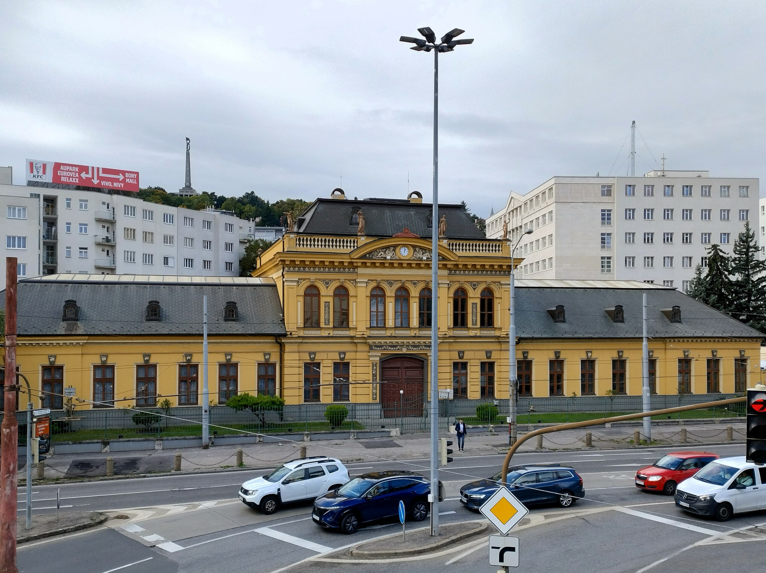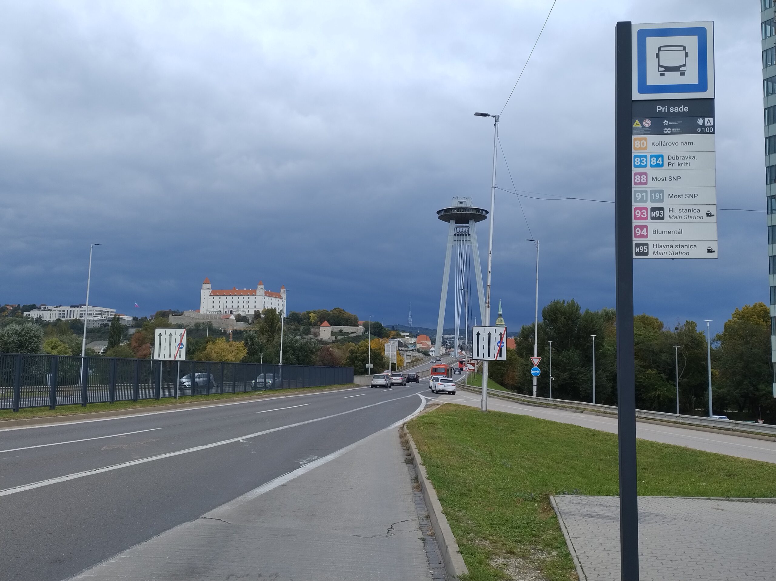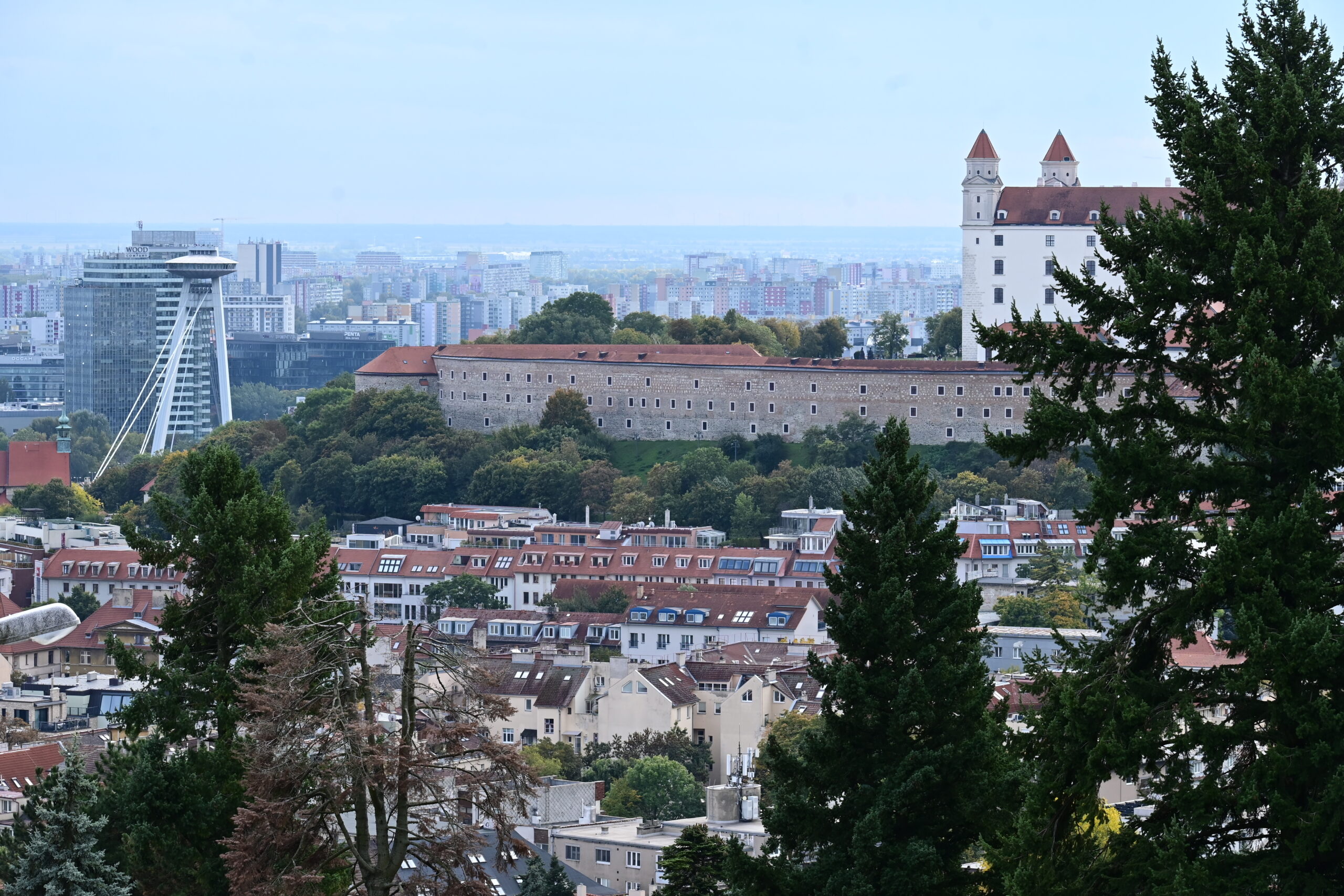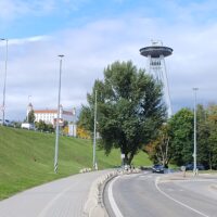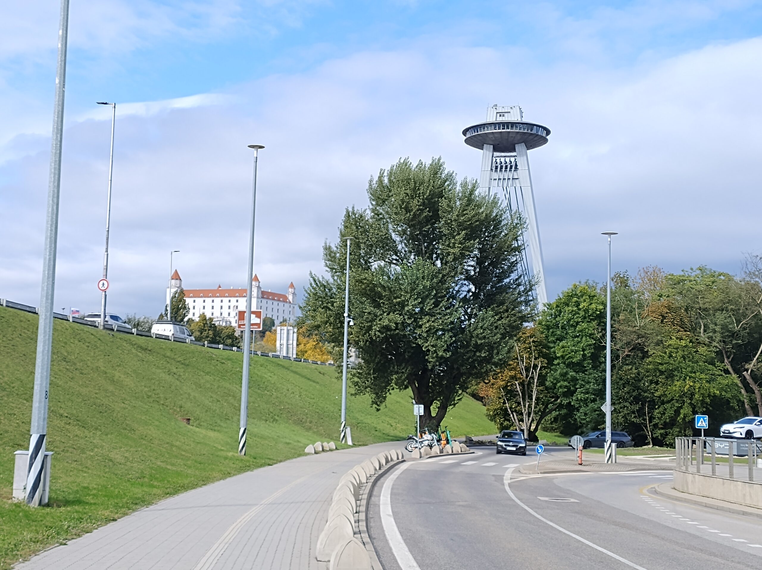 Na wzgórze Slavin spod dworca prowadzą strome schody. Ich pokonanie zajęło mi dobre 15min. Niestety jak dotarłem na miejsce rozpadało się, więc autobusem nr 147 zjechałem do miasta pod pałac prezydencki – Prezidentský palác. Tu zrobiłem tylko kilka zdjęć i ruszyłem dalej do kolejnej atrakcji miasta, czyli wieży UFO. Dostać się tam tylko można od strony południowej, po opuszczeniu środka transportu miejskiego trzeba iść ścieżką wzdłuż nasypu do podnóża, gdzie są kasy.
