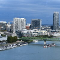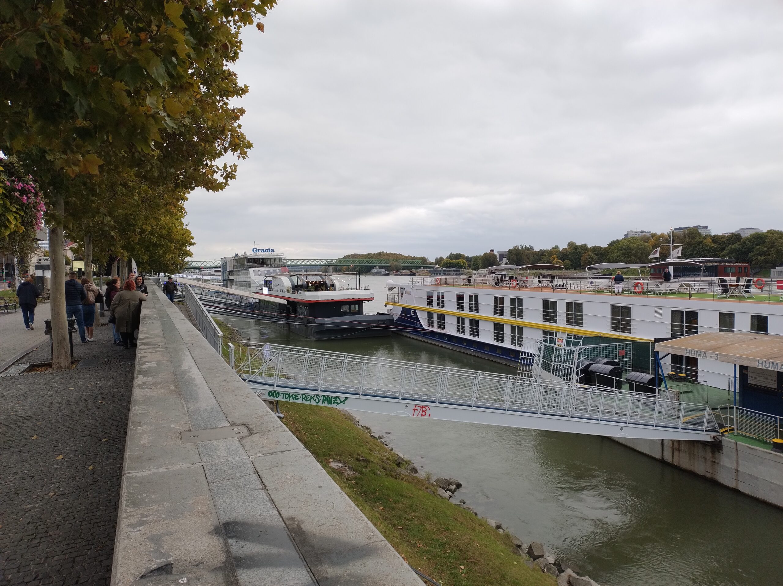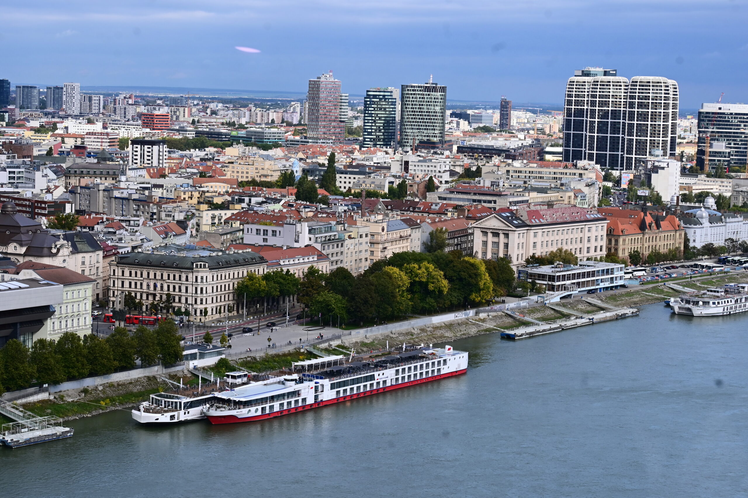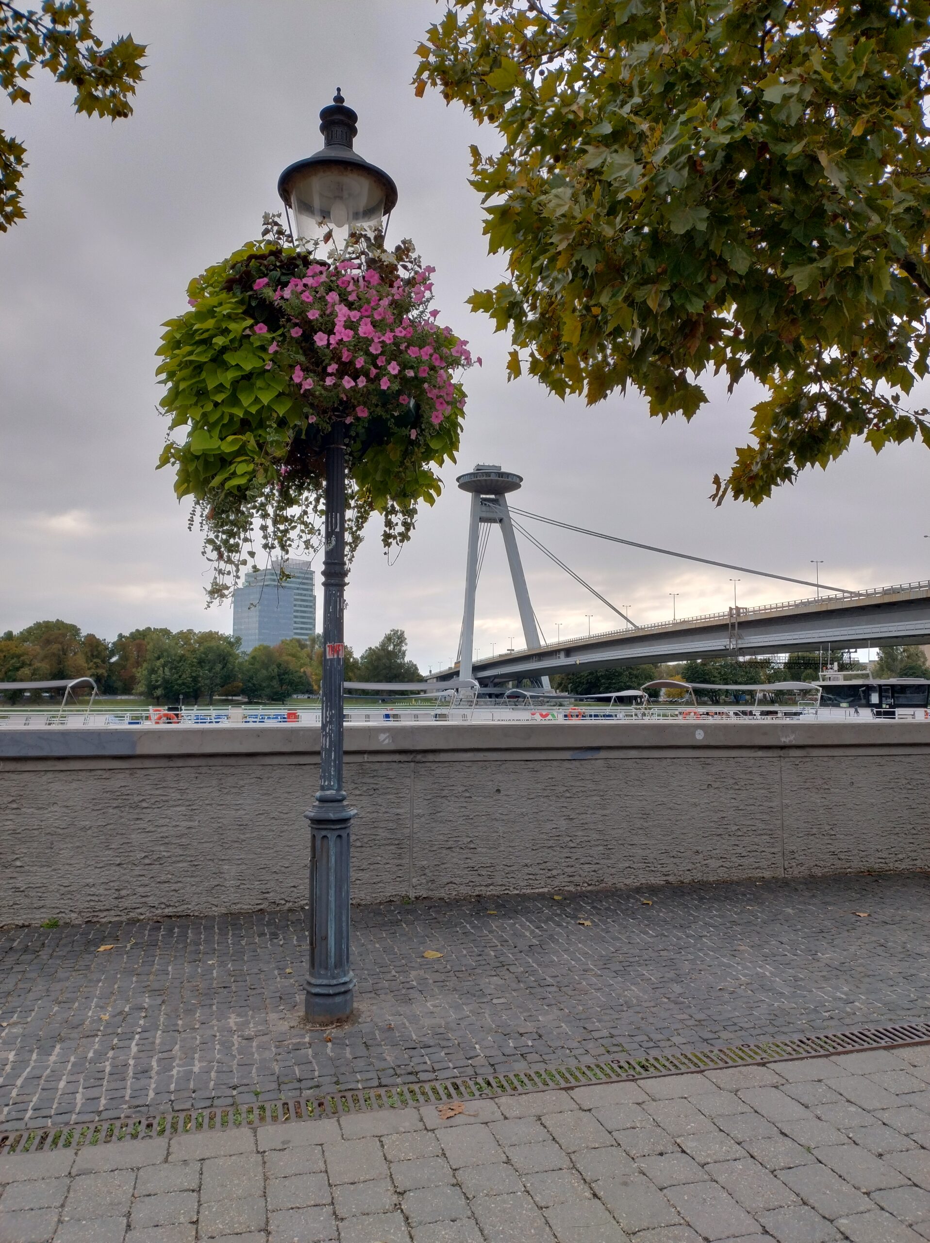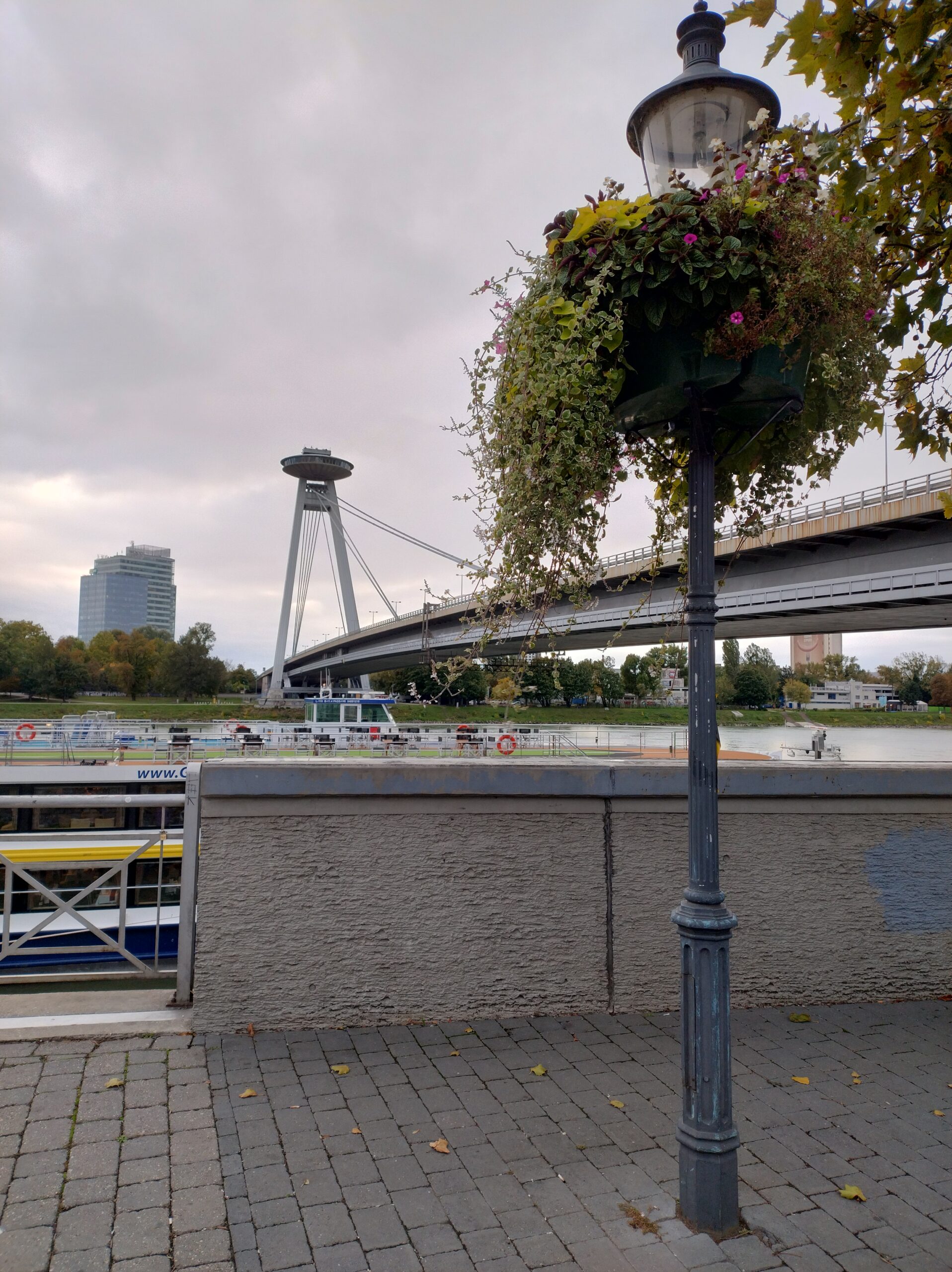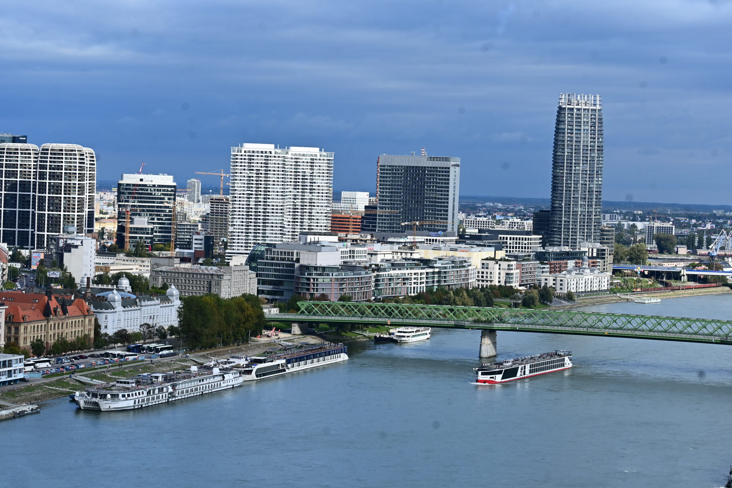 Po obiedzie mając kartę miejską jeszcze zwiedziłem ratusz wraz z wieżą, skąd widać pięknie część starówki i zamek. Trochę zmęczony udałem się do hotelu, żeby odsapnąć na godzinkę. Po powrocie na miasto w planie miałem przejść promenadą nad Dunajem. Gdy doszedłem do rzeki zaczęły nadciągać takie czarne chmury, że stwierdziłem iż bezpieczniej będzie pojechać autobusem do końca deptaku, gdzie znajduje się centrum handlowe Eurovea (przynajmniej będzie gdzie przeczekać opady), i stamtąd wracać. Po półgodzinie ostro już padało. Dlatego wykorzystałem ten czas na zakupy w Spar na kolację.