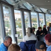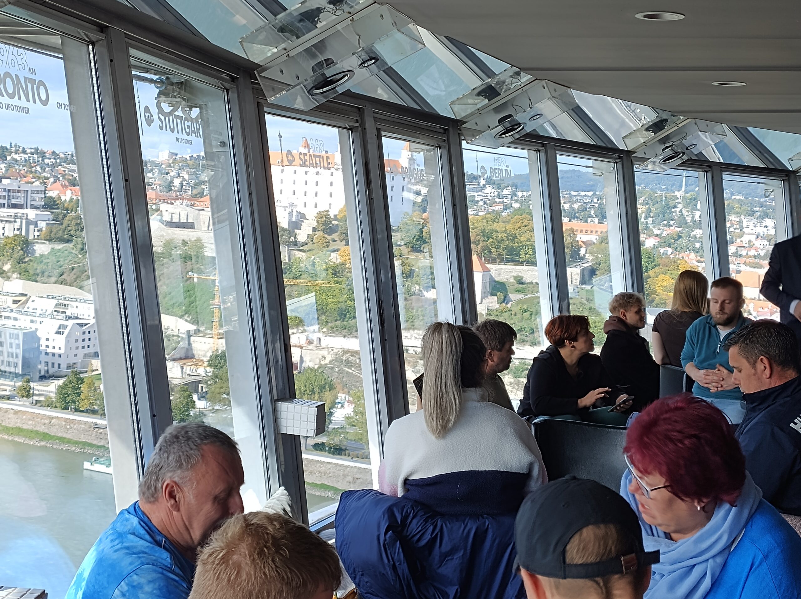 Widok z góry sam w sobie jest super (na szczęście się przejaśniło i nawet wyszło słońce). Prawda jest taka, że to całe UFO to czysta komercja. Windą dojeżdżamy do restauracji. I tylko kilka stolików jest dostępnych do tego żeby usiąść na kawę czy piwko w moim przypadku, reszta to część gdzie wpuszczają tylko gości na jedzenie. A bilet kosztuje 10 Euro, więc też nie mało. W dniu kiedy ja byłem górny taras był zamknięty. Więc wszyscy gnieździli się przy tych kilku stolikach, a mimo iż byłem tam w okolicy godziny 15, restauracja była pustawa, a turystów sporo.