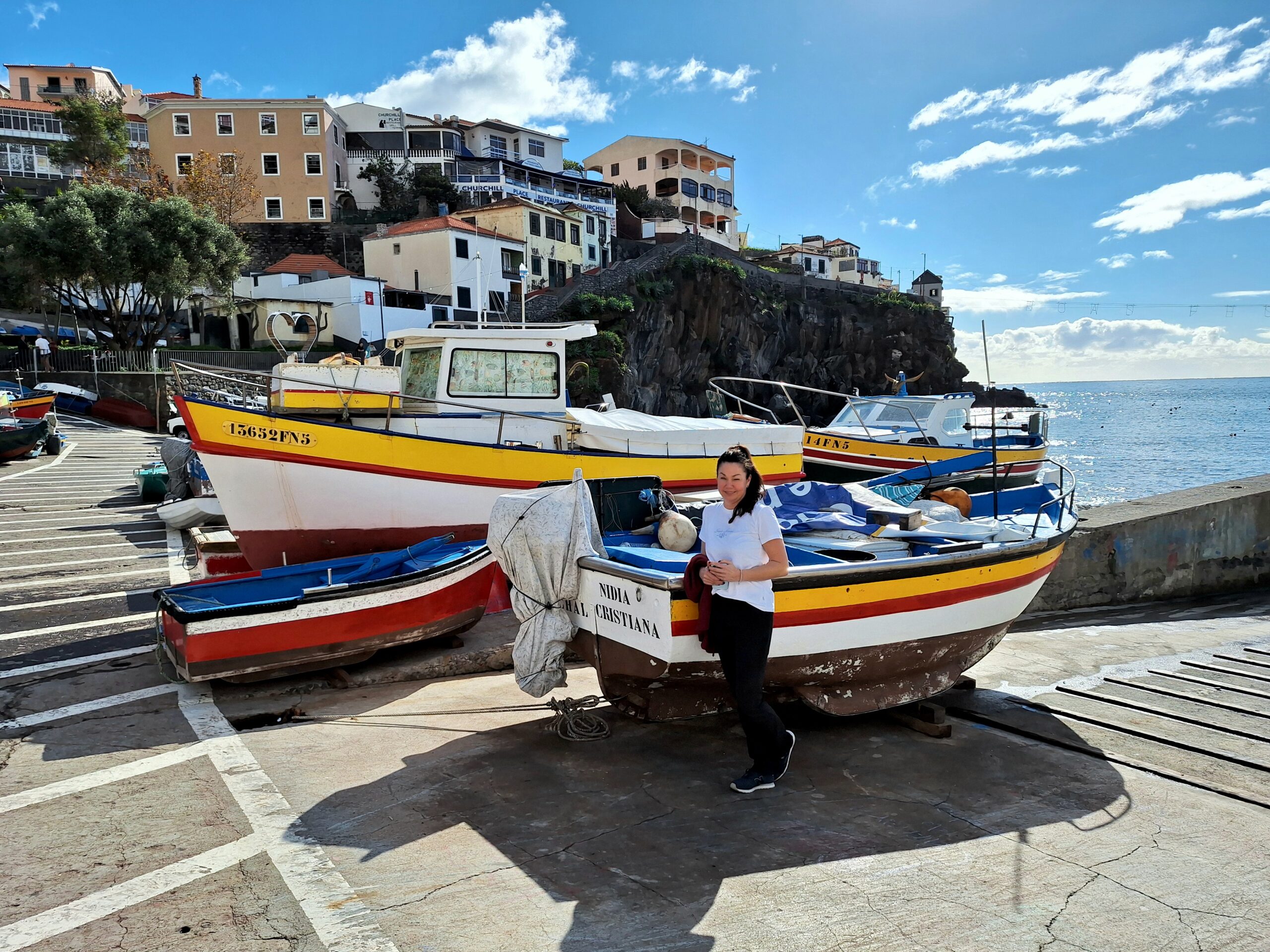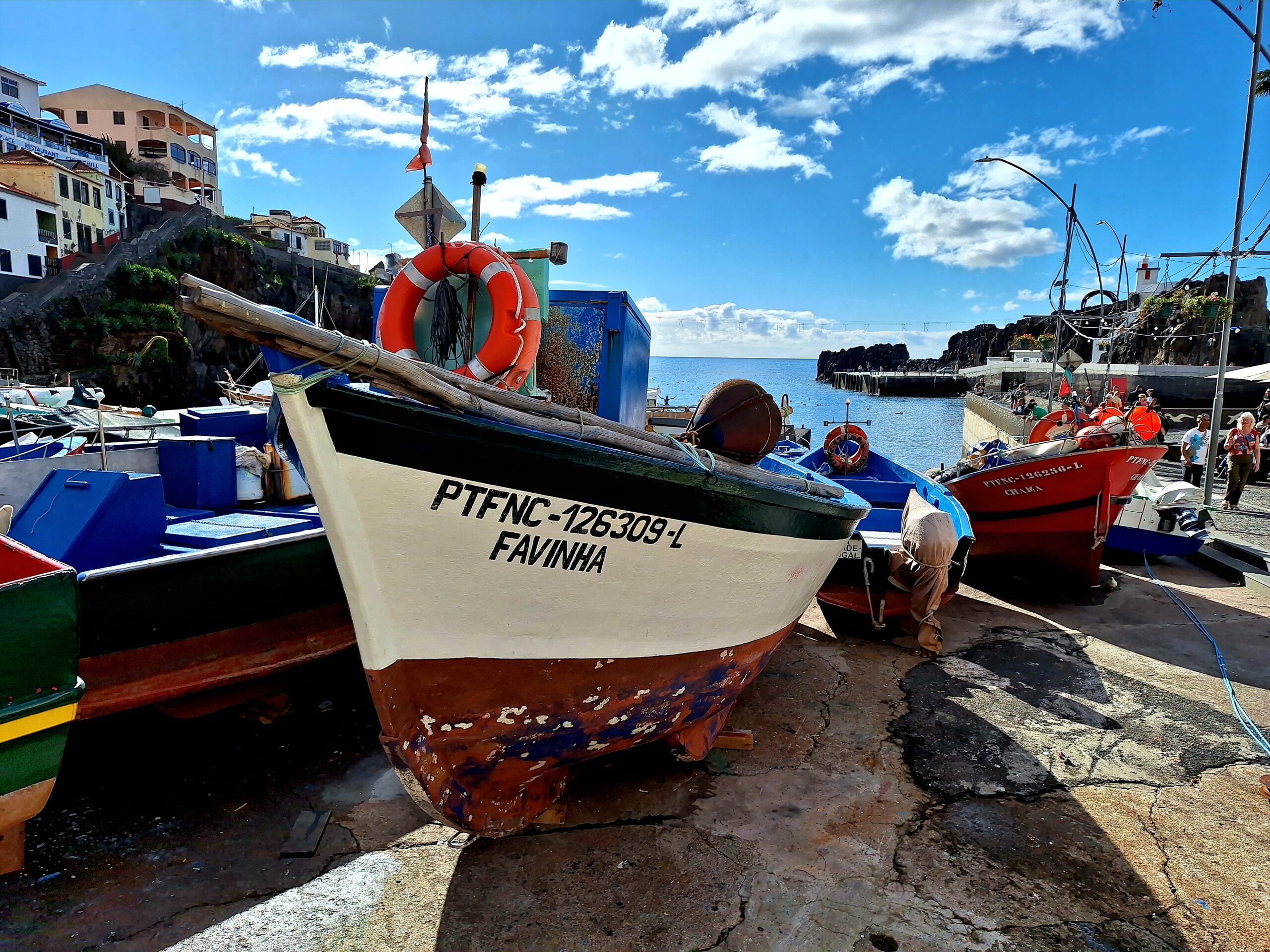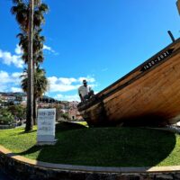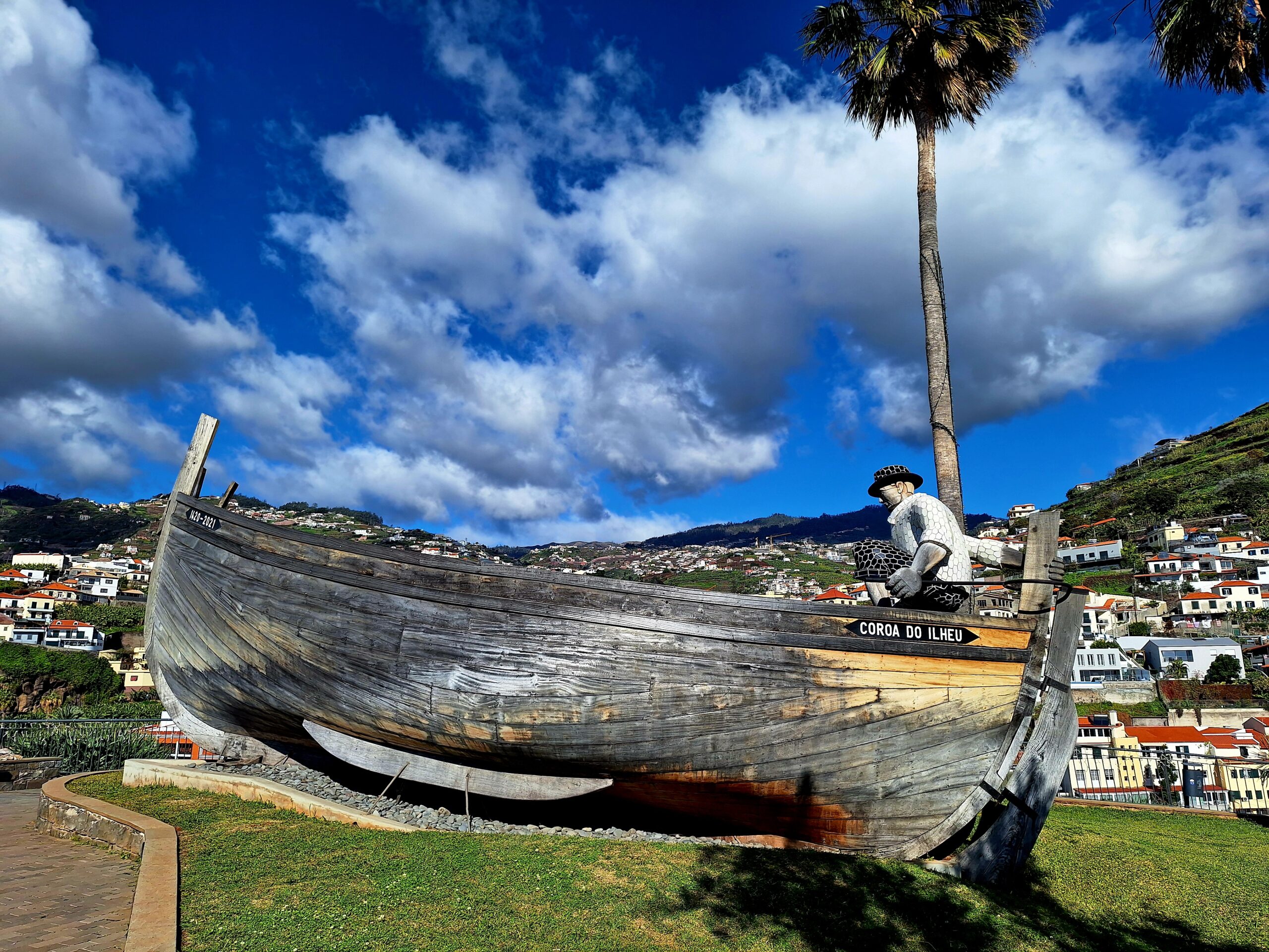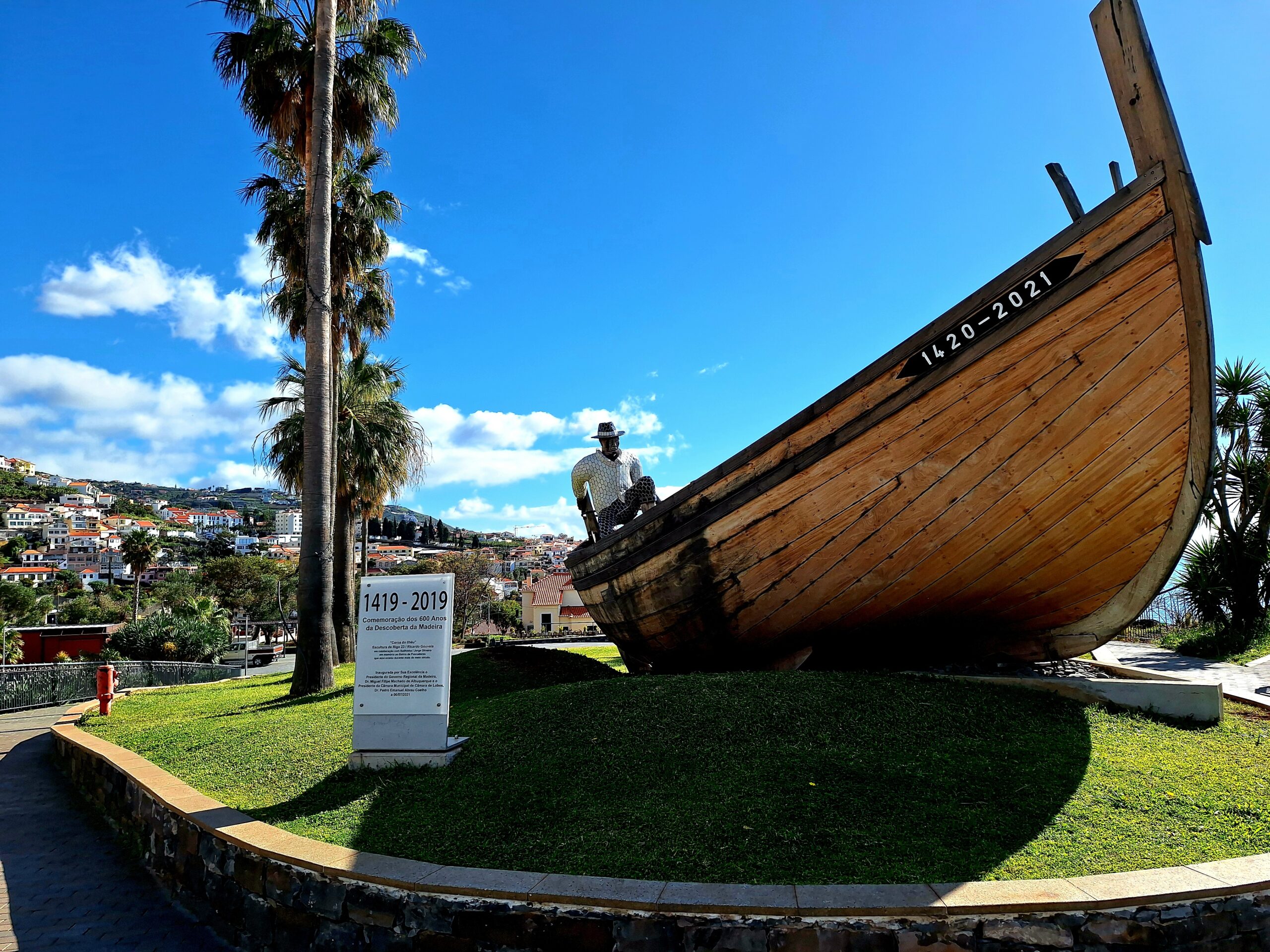 Jest słońce, to i masa ludzi w mieście. W kafejkach przy odnowionej promenadzie i zatoczce portowej wszystko pozajmowane. Każdy relaksuje się przy kawie. My obeszliśmy zatokę dookoła i relaksowaliśmy się na słońcu na Ilhéu de Câmara, czyli w górnej części starego miasta. Postawiono tu drewnianą łódkę upamiętniającą odkrycie Madery – Dos 600 anos da Descoberta da Madeira. Dwadzieścia minut opalania wystarczyło, ruszamy dalej szukać miejsca na obiad.