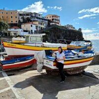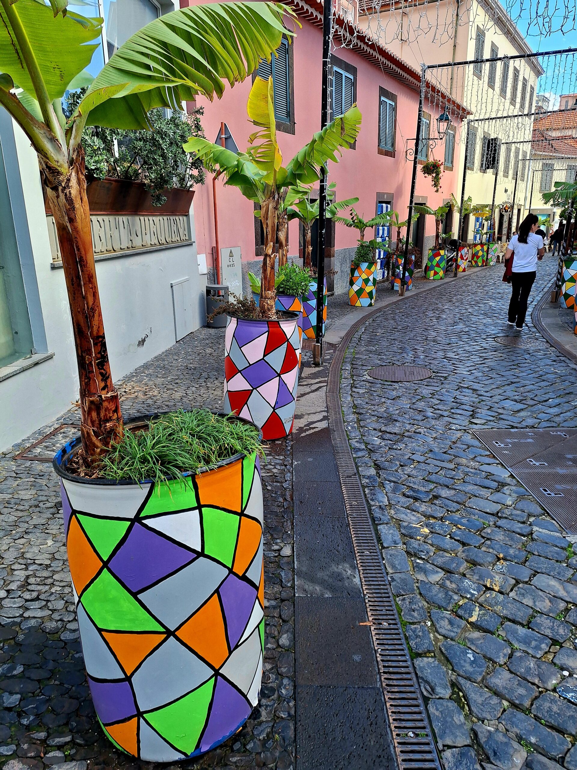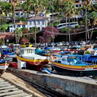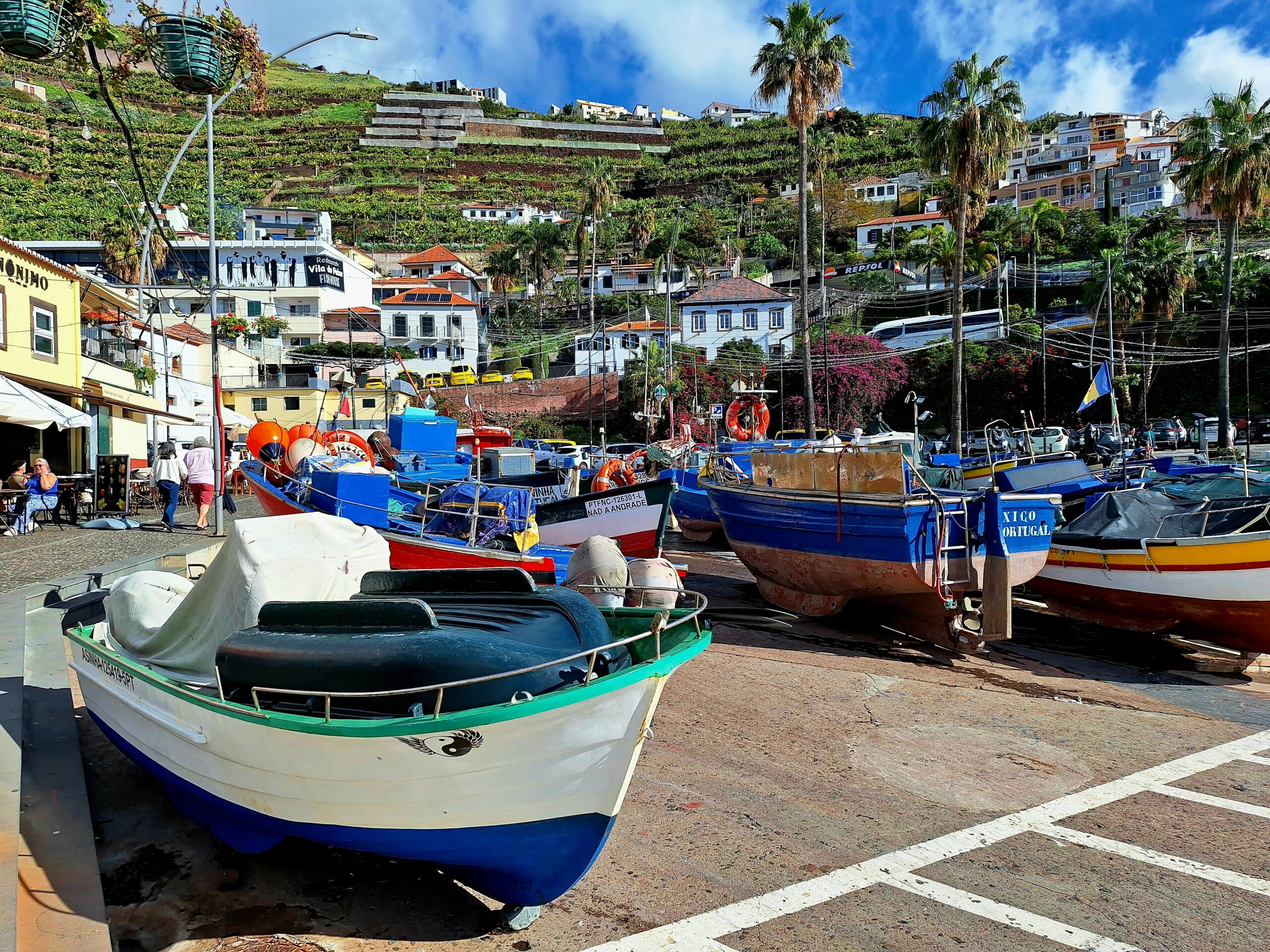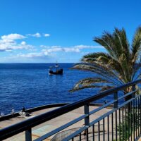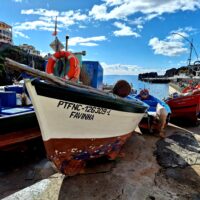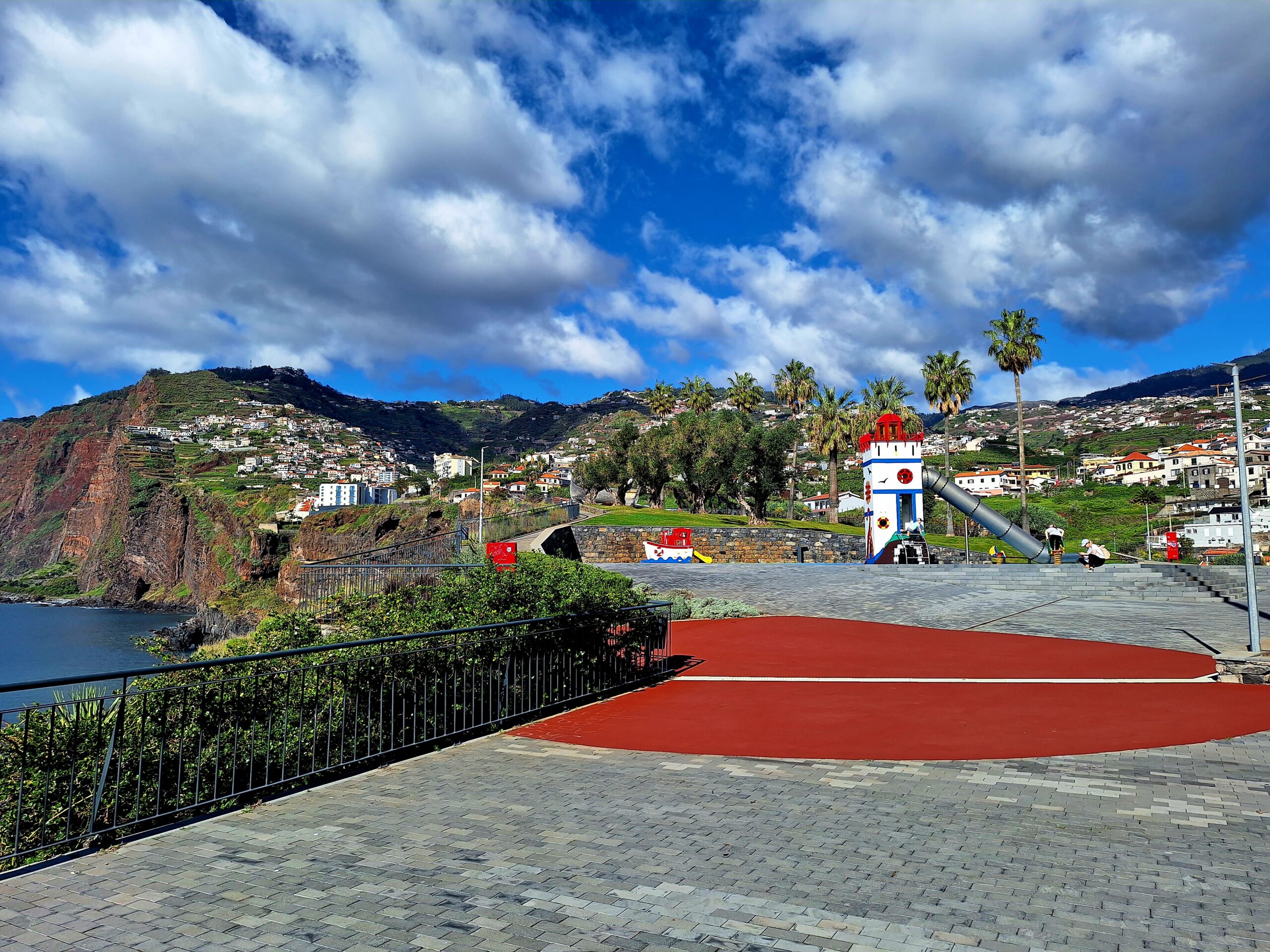 Jest słońce, to i masa ludzi w mieście. W kafejkach przy odnowionej promenadzie i zatoczce portowej wszystko pozajmowane. Każdy relaksuje się przy kawie. My obeszliśmy zatokę dookoła i relaksowaliśmy się na słońcu na Ilhéu de Câmara, czyli w górnej części starego miasta. Postawiono tu drewnianą łódkę upamiętniającą odkrycie Madery – Dos 600 anos da Descoberta da Madeira. Dwadzieścia minut opalania wystarczyło, ruszamy dalej szukać miejsca na obiad.