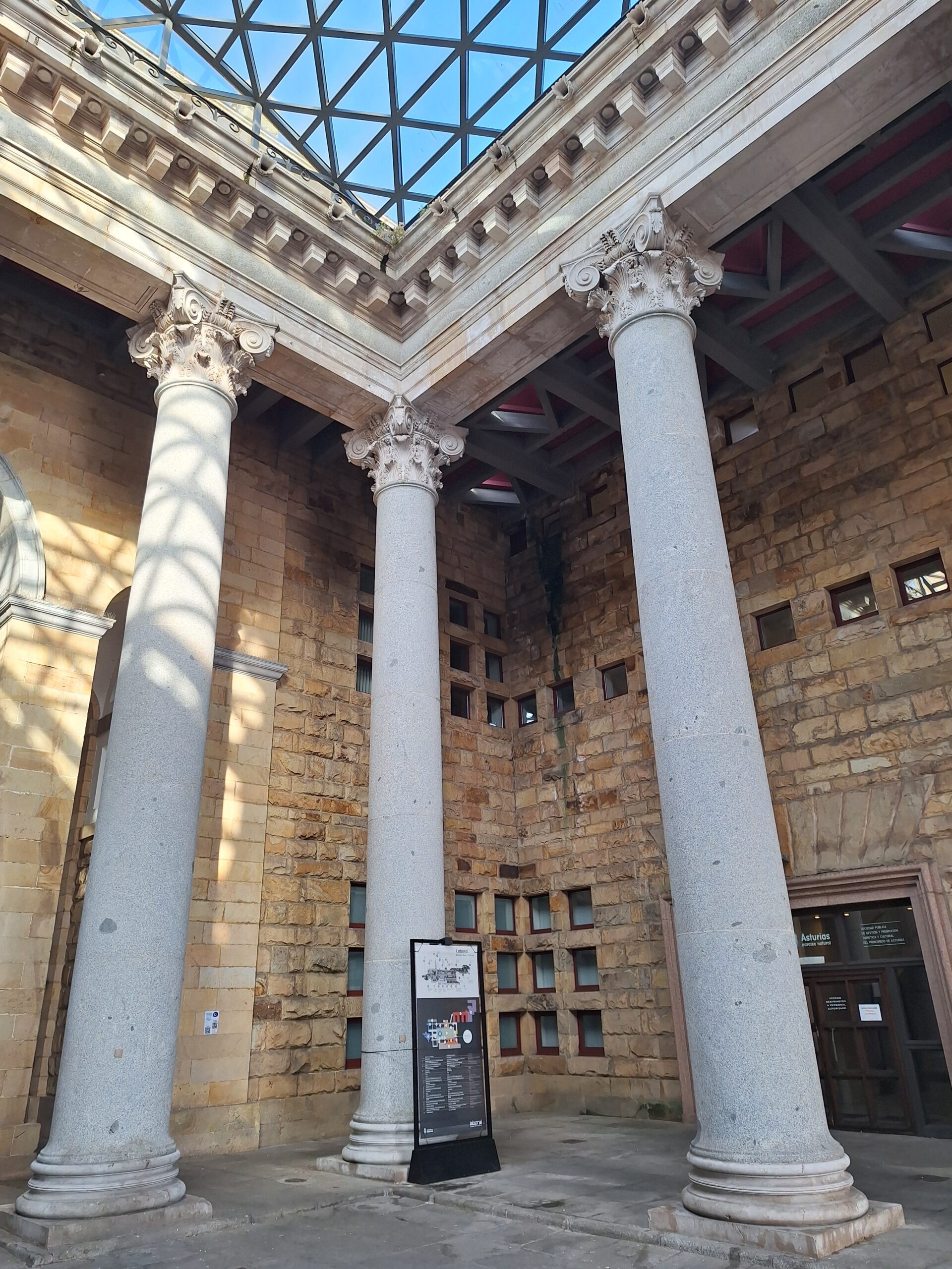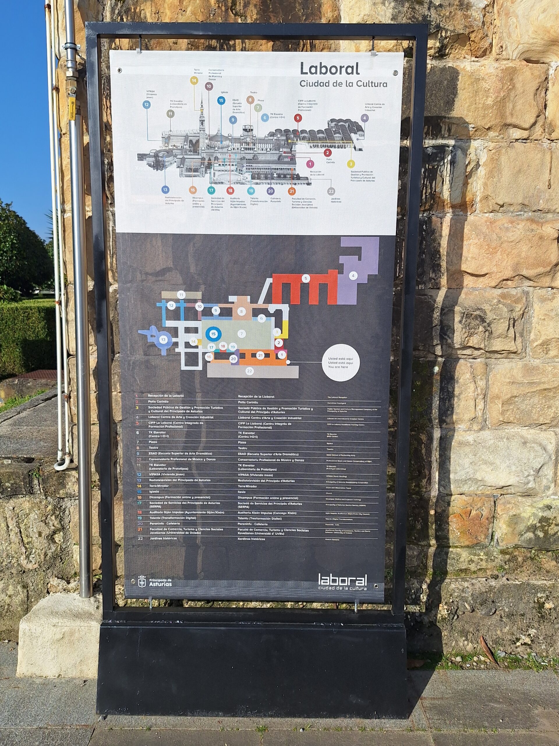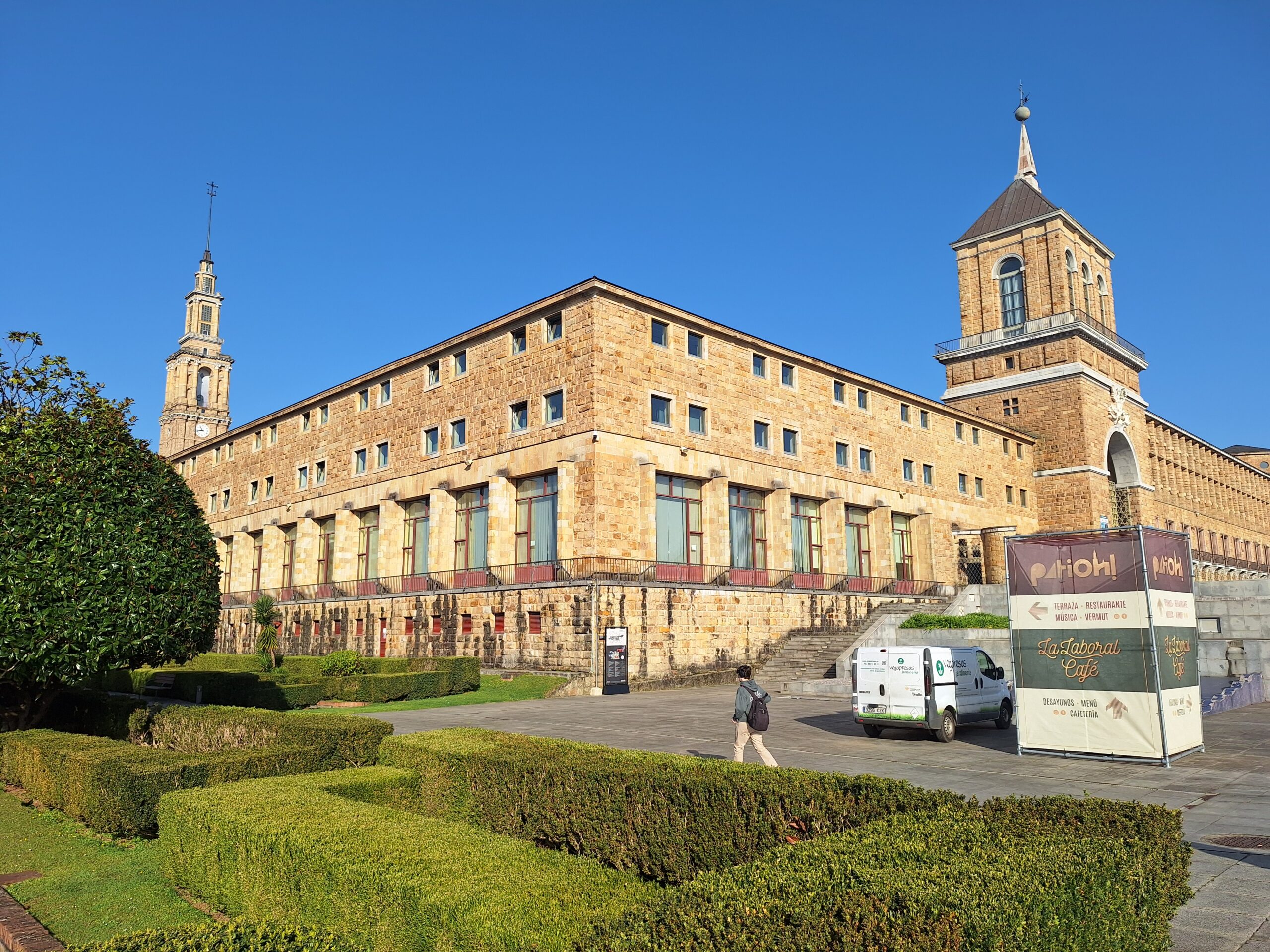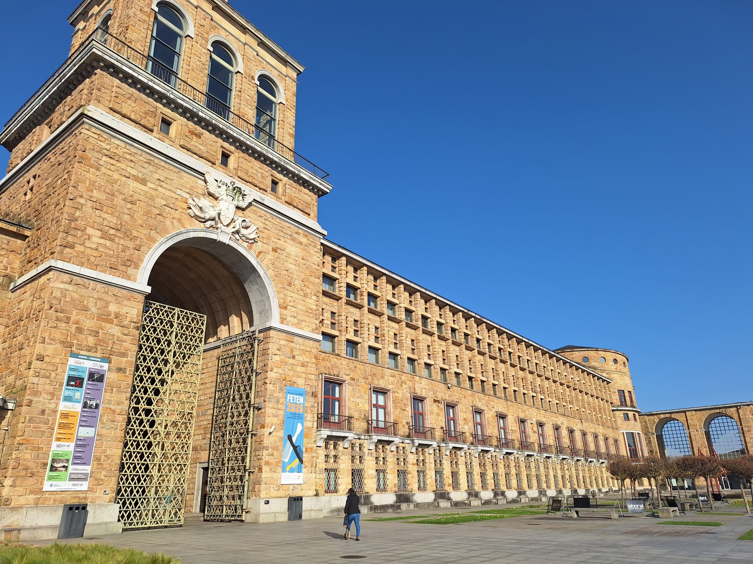 Laboral to miejsce niezwykłe. Aż trudno uwierzyć, że kiedyś był tu sierociniec. W 2007 roku przekształcono budynek w lokalne centrum kultury i rekreacji. Miejsce jest na wstępnej liście UNESCO od 2020 roku. Mimo iż wstęp do obiektu jest płatny, bezpłatnie można wejść na dziedziniec i do ogrodów. Jak tylko przejdzie się przez bramę wejściową, widać ogrom budowli i ciekawą formę, także kaplicy która jest po środku. Wewnątrz fasadę teatru wieńczy symbol frankizmu. Orzeł św. Jana trzyma tarczę z herbami Kastylii, Leónu, Aragonii, Nawarry i Granady.