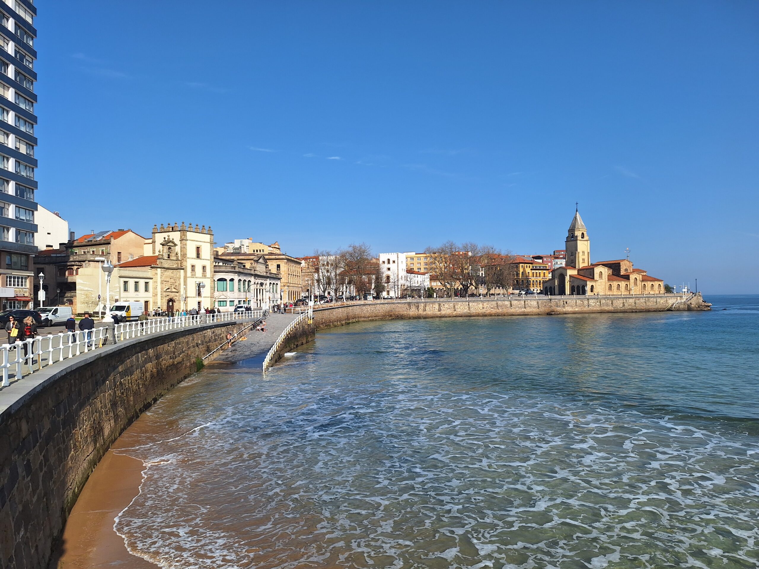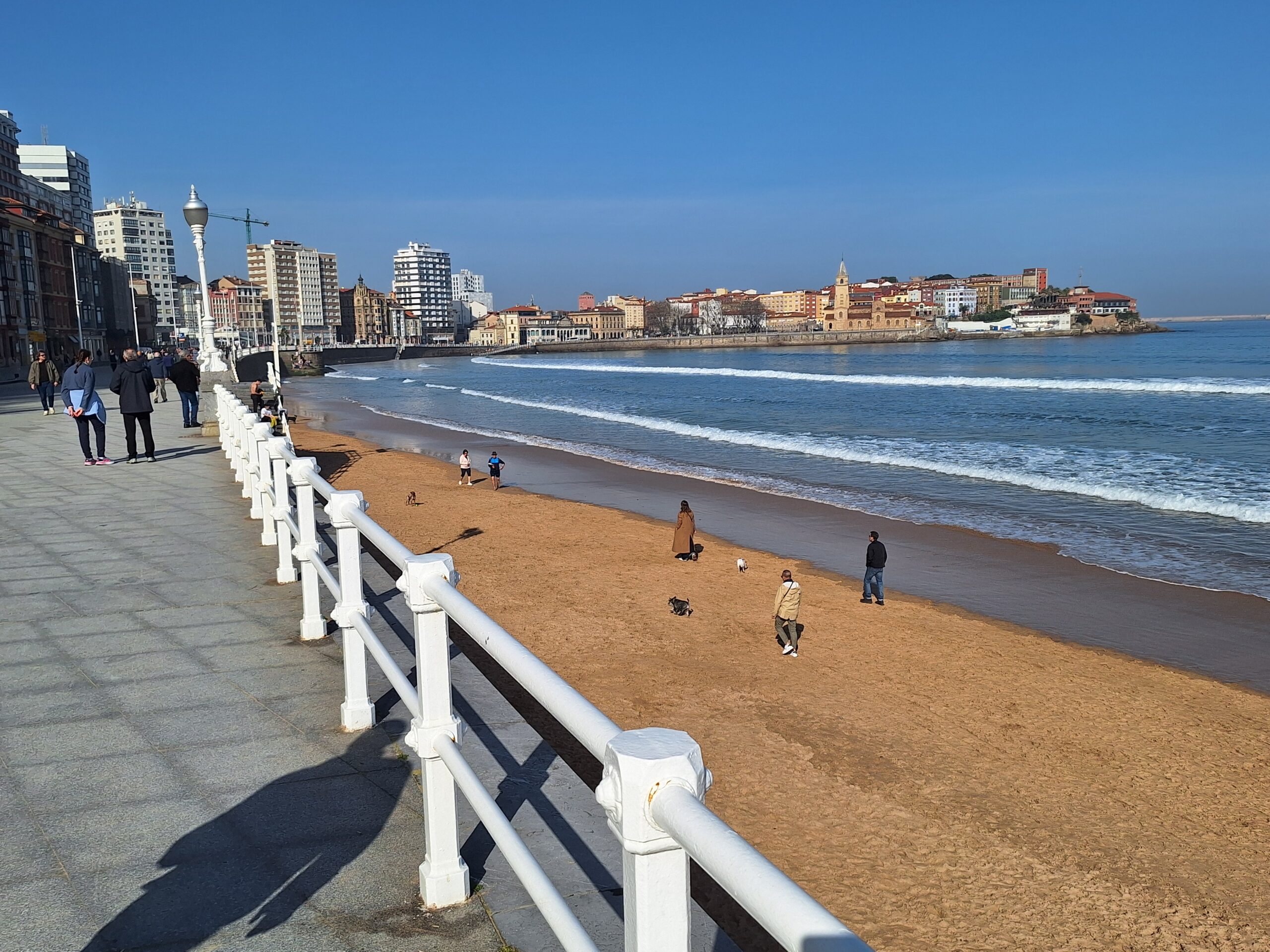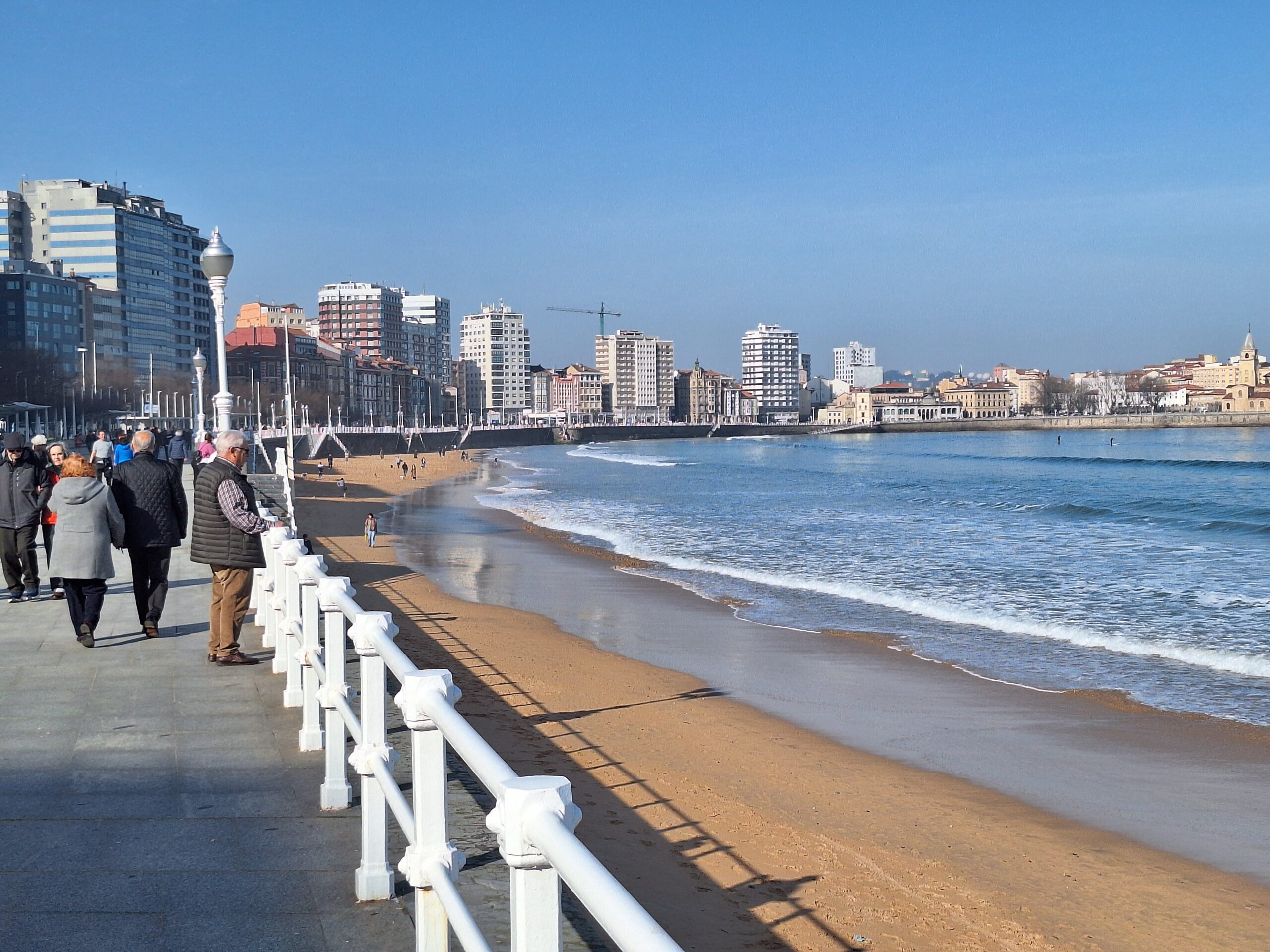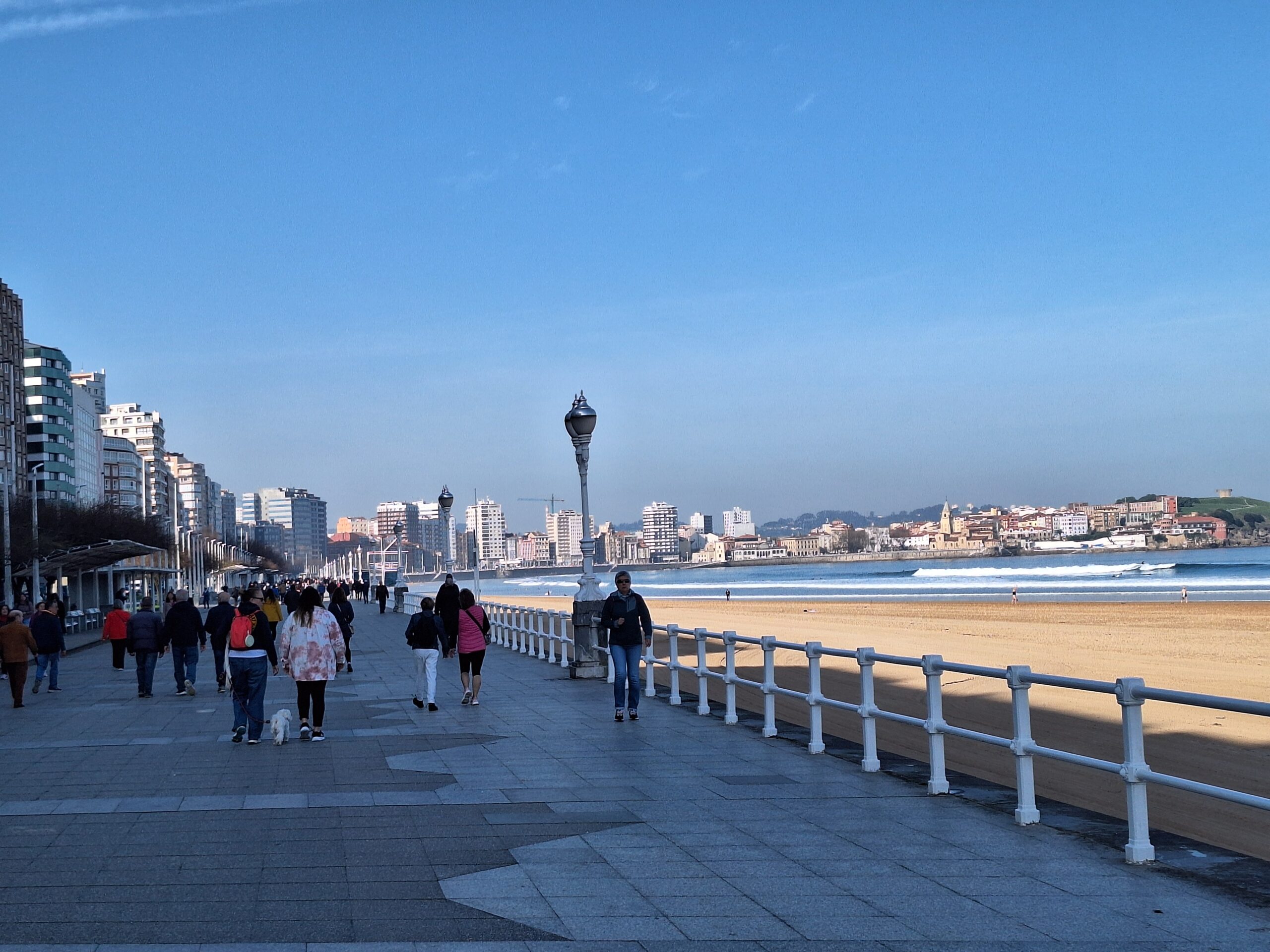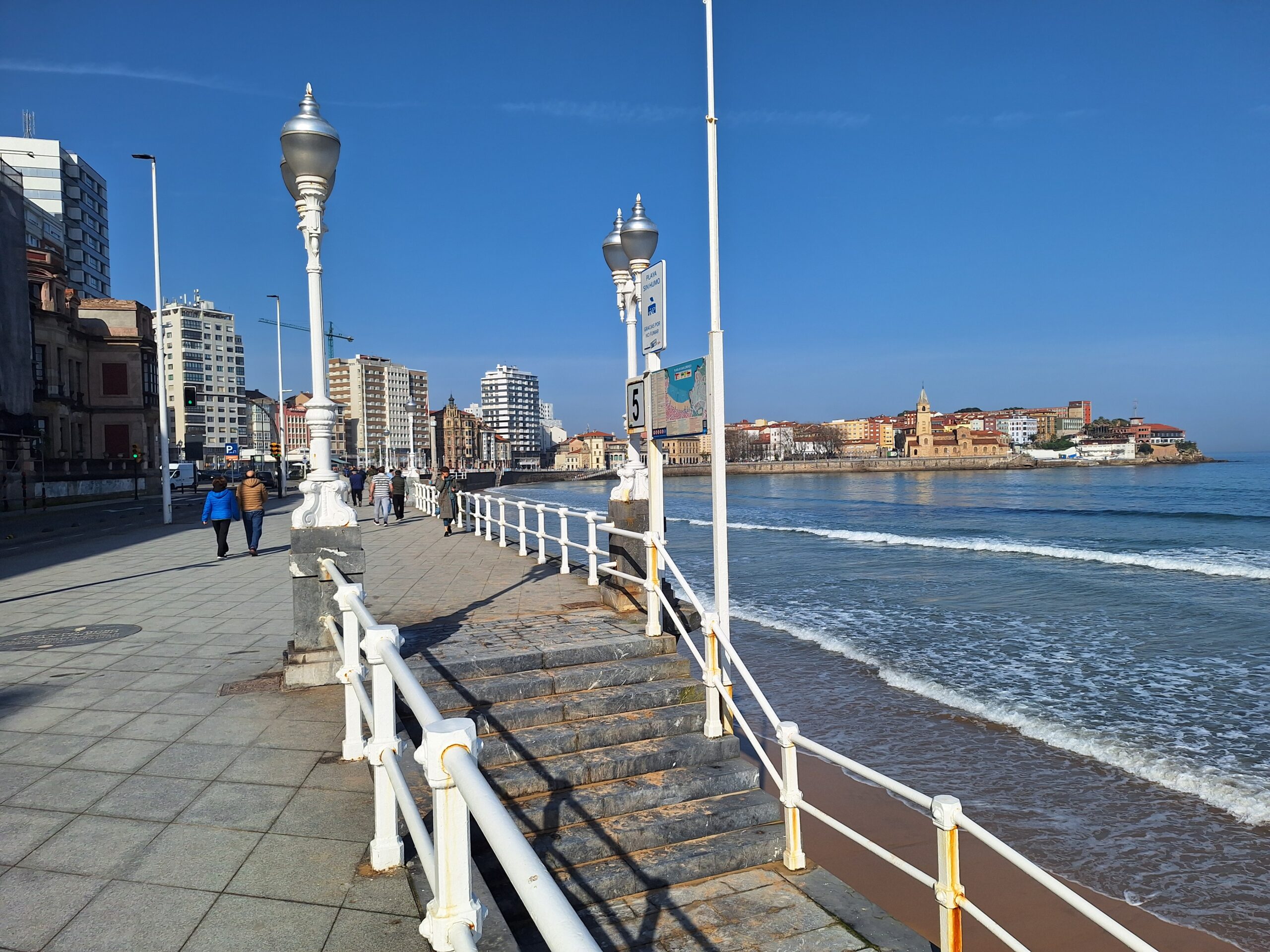 Po powrocie do miasta wysiadłem z autobusu koło Plaza de Toros. Jednak arena mnie rozczarowała, wszystko pozamykane. Przez pobliski park doszedłem do Playa de San Lorenzo, długiej plaży na końcu której znajduje się cypel Cimadevilla z fortecą. Ponieważ nie miałem już czasu wdrapać się na górę, przeszedłem tylko przez Plaza Mayor na Plazuela del Marqués, gdzie znajduje się fontanna Fuente y Estatua de Pelayo (odsłonięta w 1891 roku, przedstawia pomnik pierwszego króla Asturii), oraz najstarsze zachowane kamienice. Na wprost przyjemnie popatrzyć na basen portowy z jachtami (Dársena de Fomentín). Przechodnie robią sobie także zdjęcia przy napisie Gijón (Las Letronas).