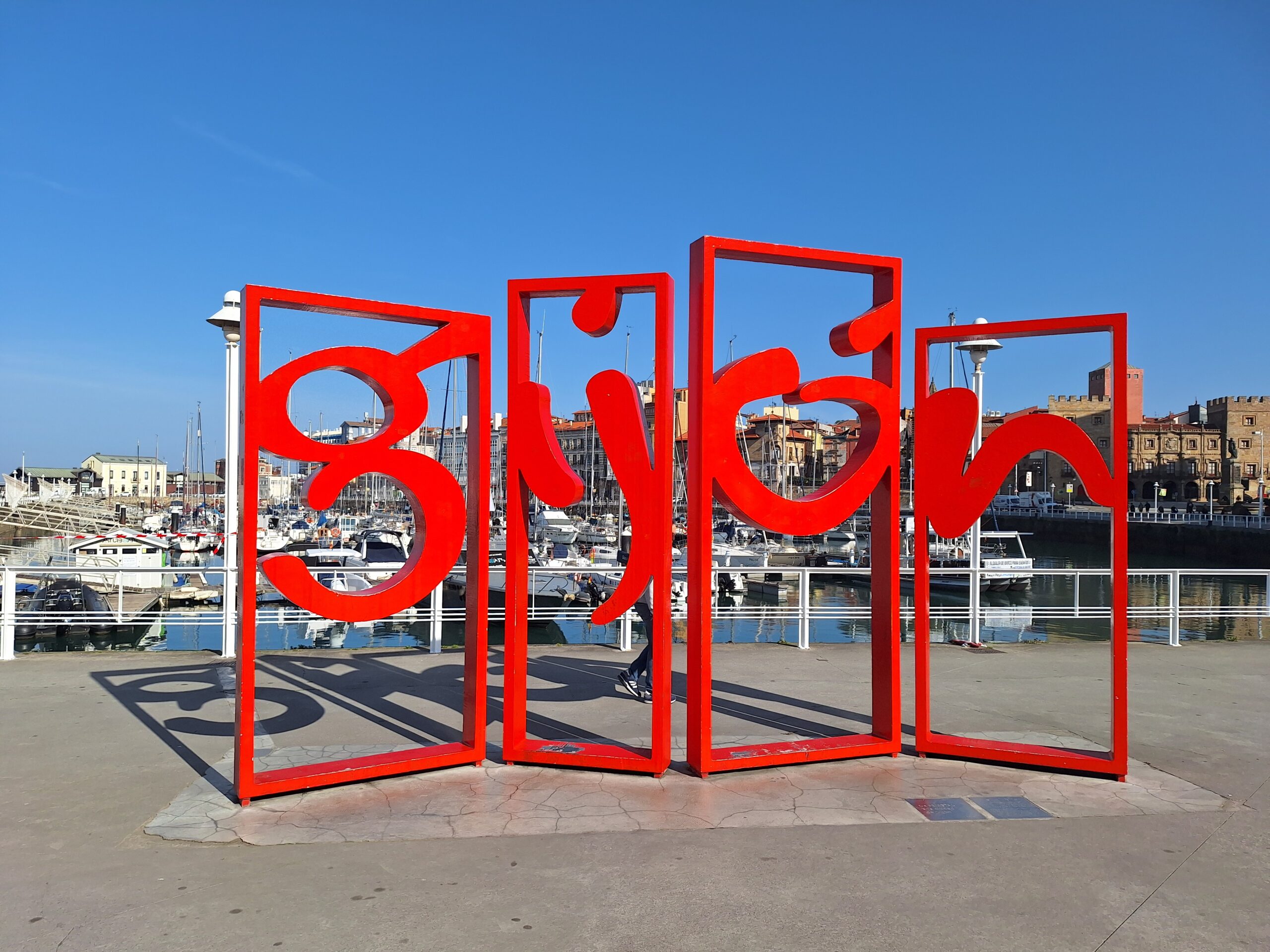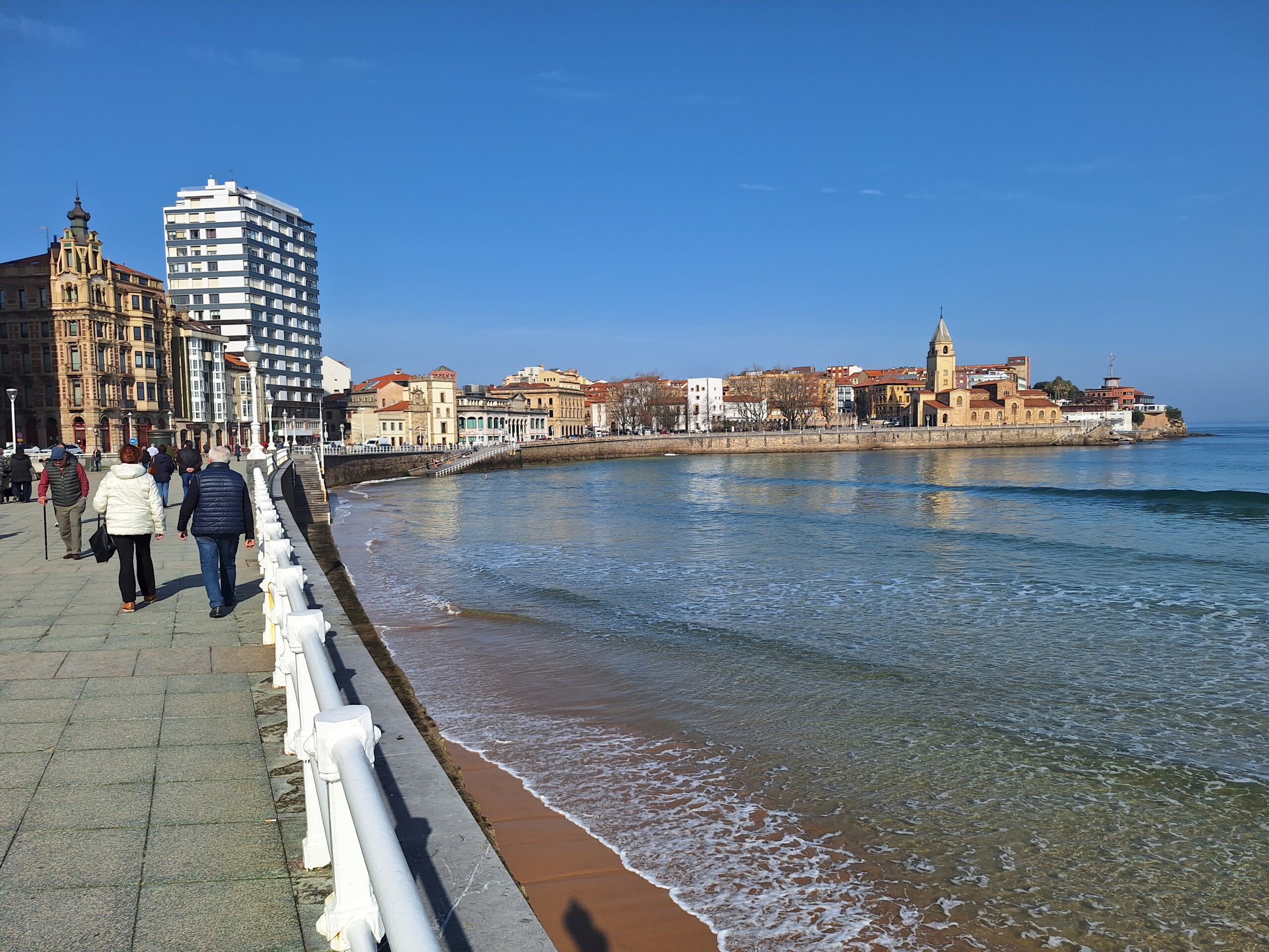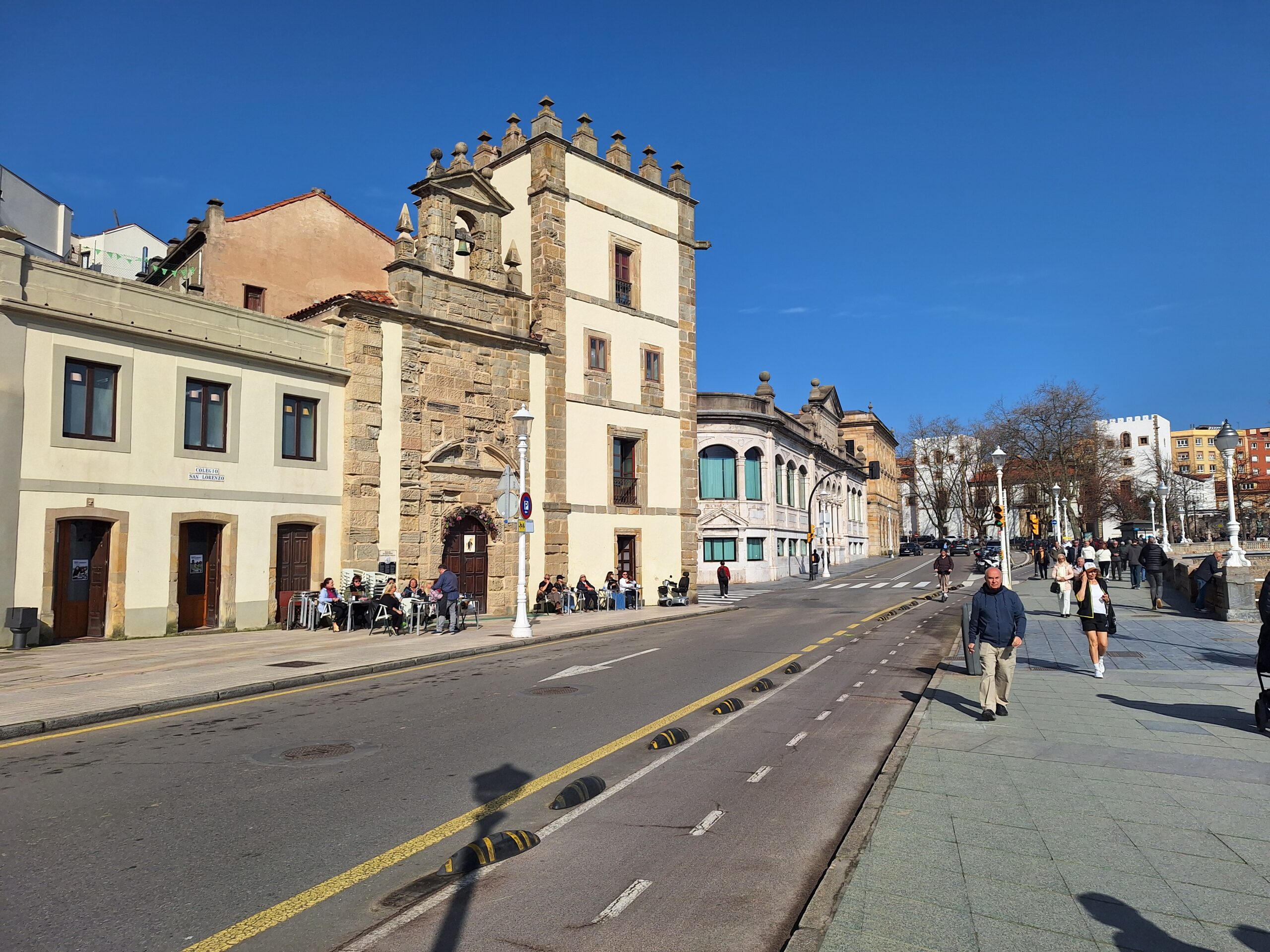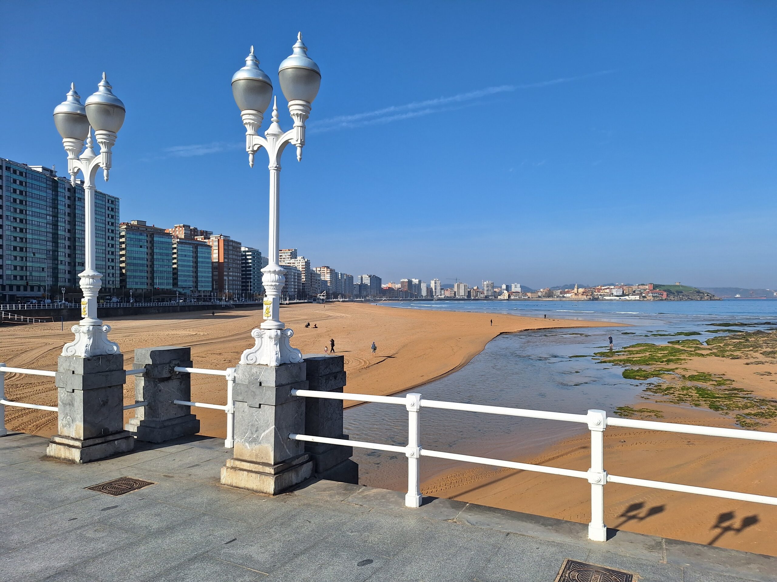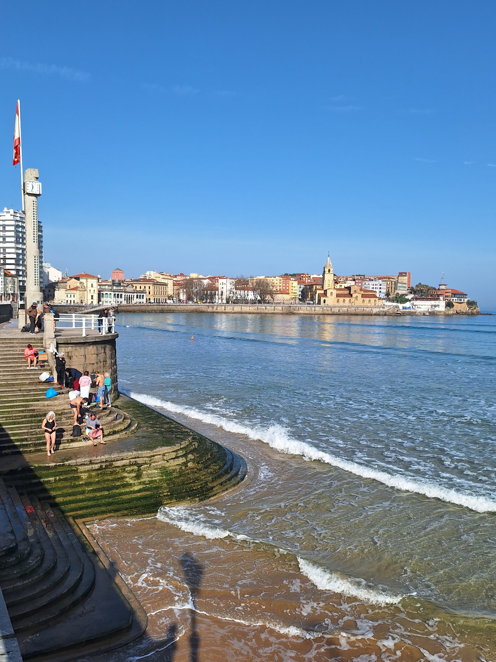 Po powrocie do miasta wysiadłem z autobusu koło Plaza de Toros. Jednak arena mnie rozczarowała, wszystko pozamykane. Przez pobliski park doszedłem do Playa de San Lorenzo, długiej plaży na końcu której znajduje się cypel Cimadevilla z fortecą. Ponieważ nie miałem już czasu wdrapać się na górę, przeszedłem tylko przez Plaza Mayor na Plazuela del Marqués, gdzie znajduje się fontanna Fuente y Estatua de Pelayo (odsłonięta w 1891 roku, przedstawia pomnik pierwszego króla Asturii), oraz najstarsze zachowane kamienice. Na wprost przyjemnie popatrzyć na basen portowy z jachtami (Dársena de Fomentín). Przechodnie robią sobie także zdjęcia przy napisie Gijón (Las Letronas).
