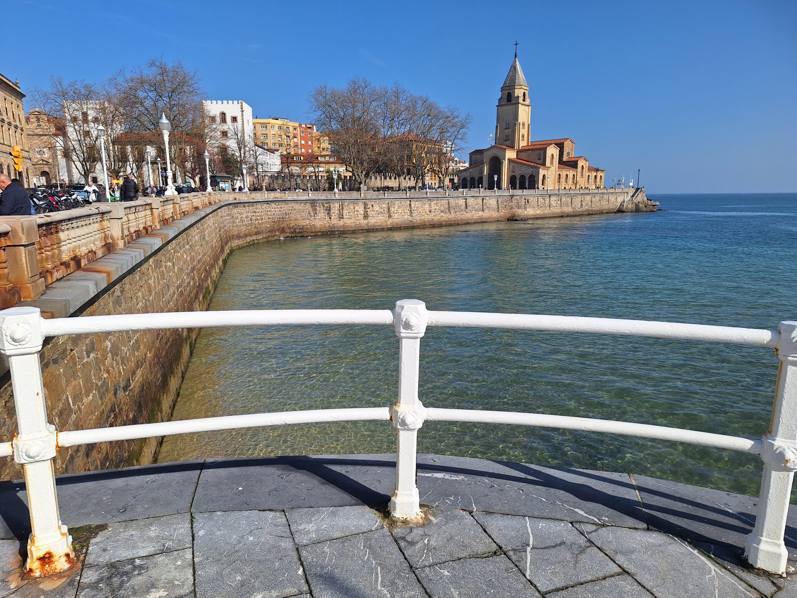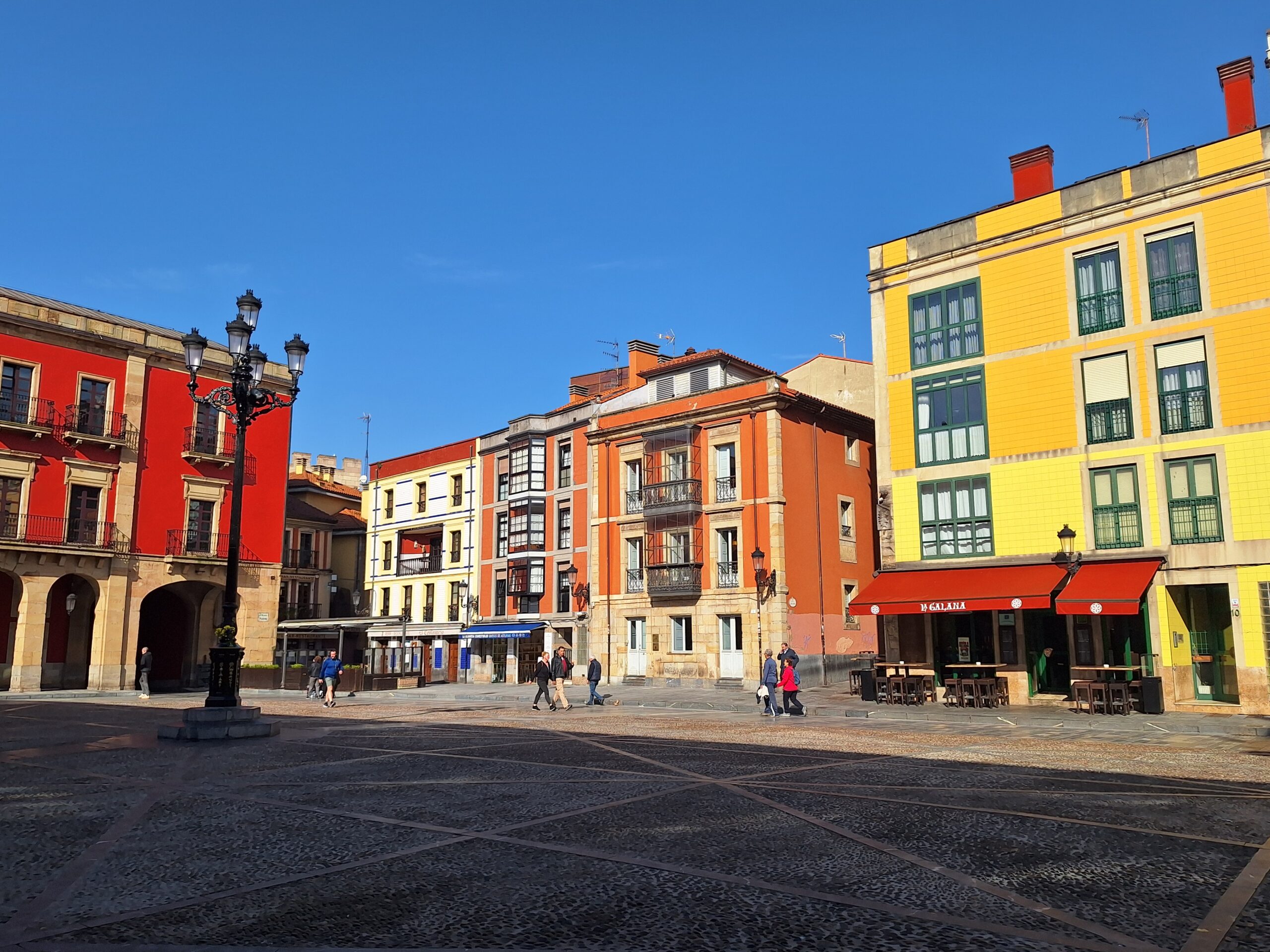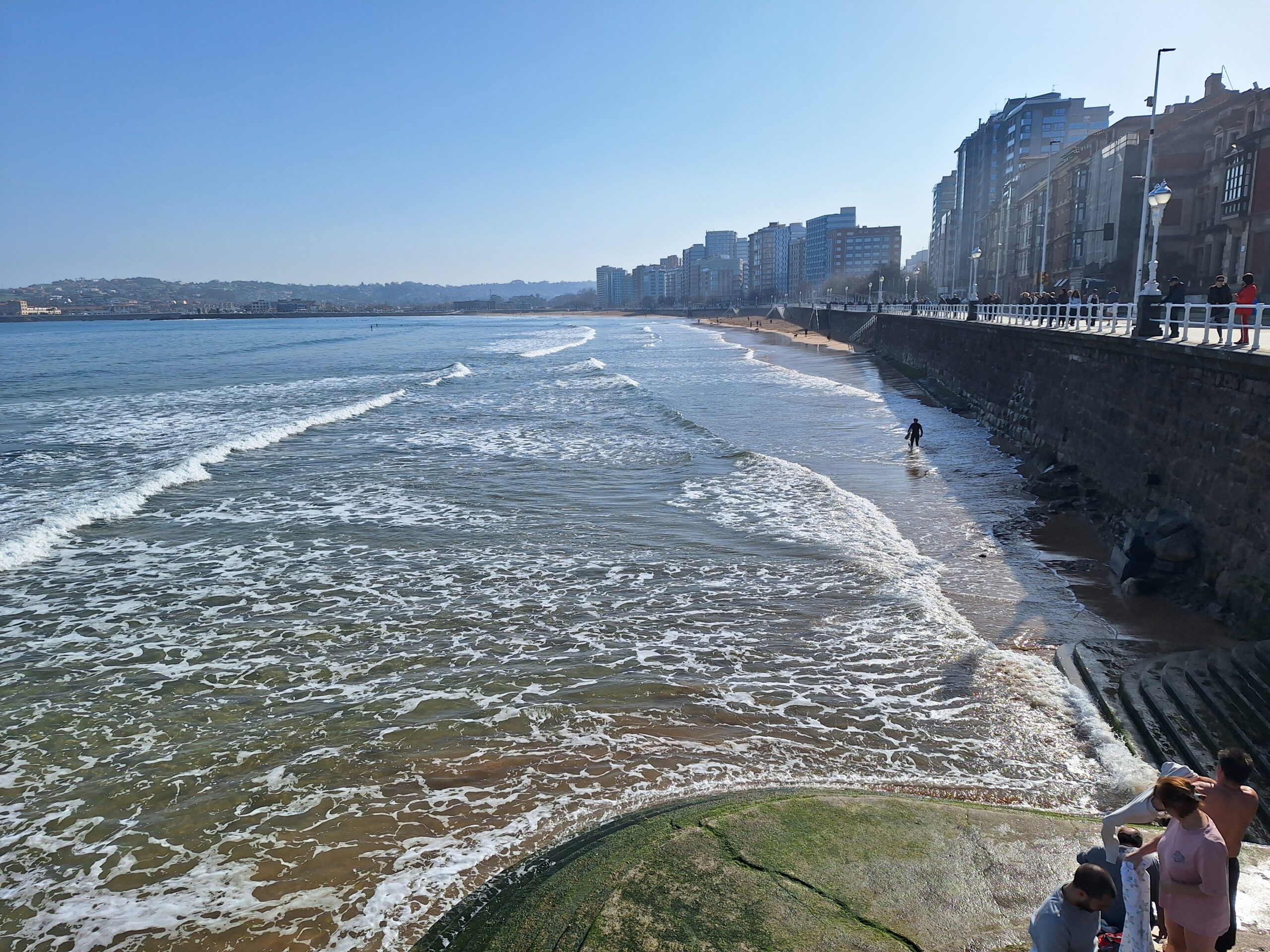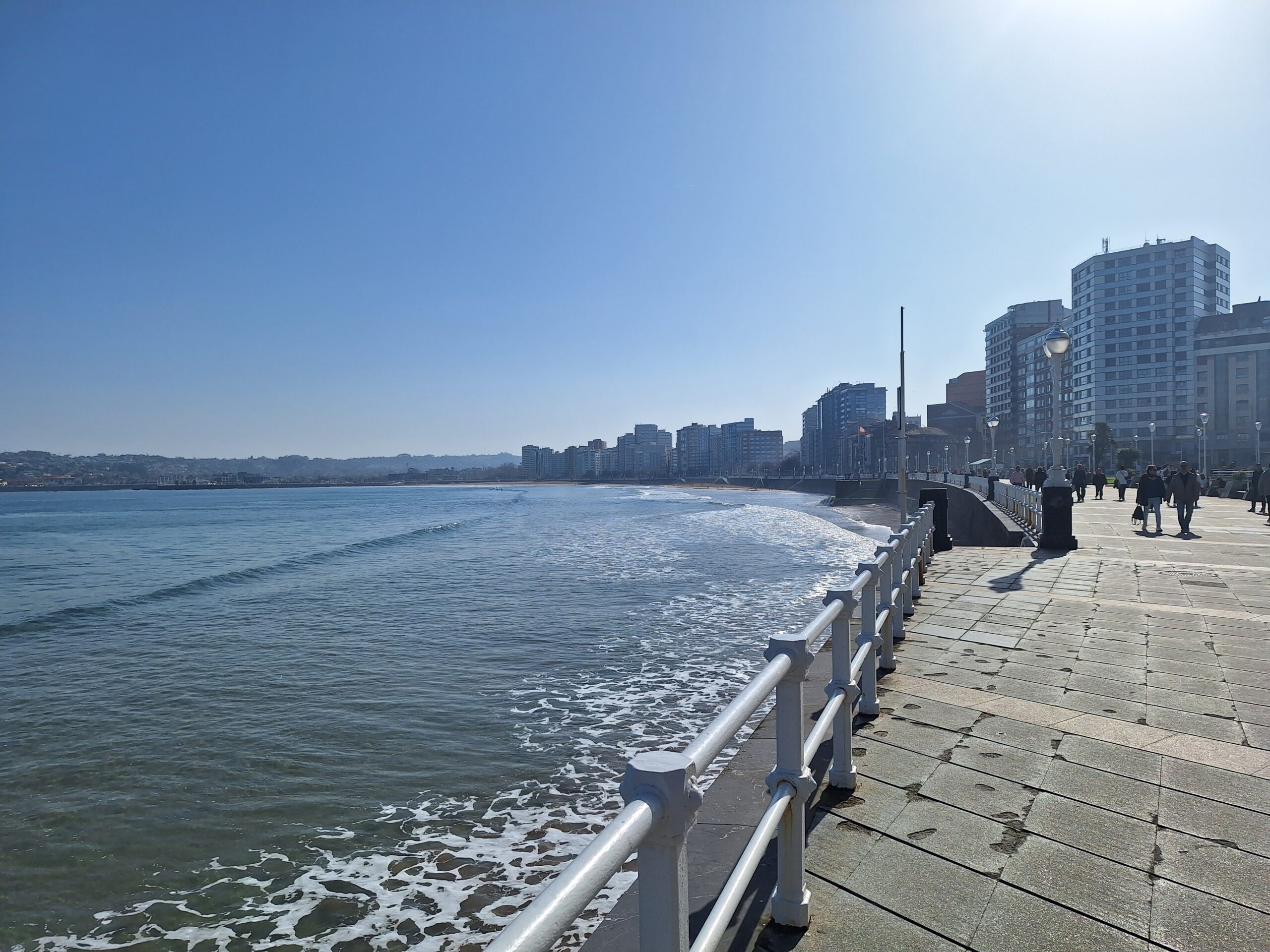 Po powrocie do miasta wysiadłem z autobusu koło Plaza de Toros. Jednak arena mnie rozczarowała, wszystko pozamykane. Przez pobliski park doszedłem do Playa de San Lorenzo, długiej plaży na końcu której znajduje się cypel Cimadevilla z fortecą. Ponieważ nie miałem już czasu wdrapać się na górę, przeszedłem tylko przez Plaza Mayor na Plazuela del Marqués, gdzie znajduje się fontanna Fuente y Estatua de Pelayo (odsłonięta w 1891 roku, przedstawia pomnik pierwszego króla Asturii), oraz najstarsze zachowane kamienice. Na wprost przyjemnie popatrzyć na basen portowy z jachtami (Dársena de Fomentín). Przechodnie robią sobie także zdjęcia przy napisie Gijón (Las Letronas).