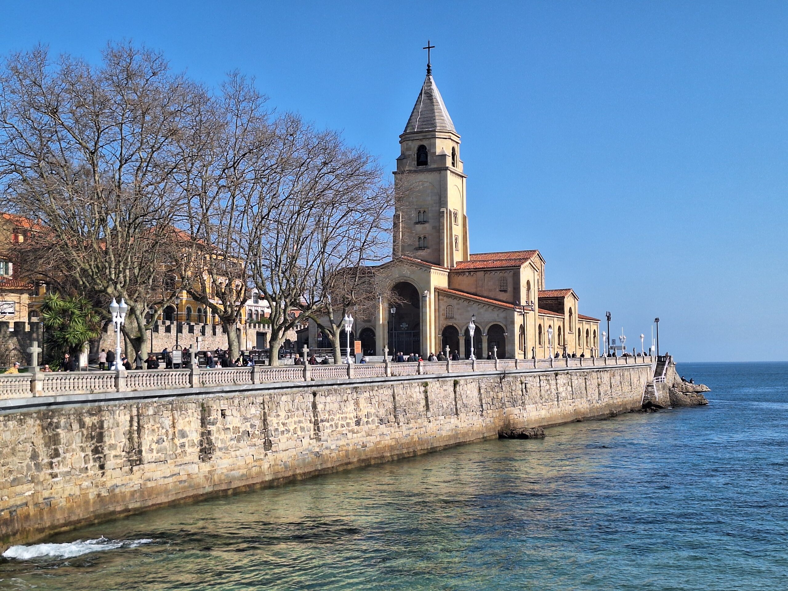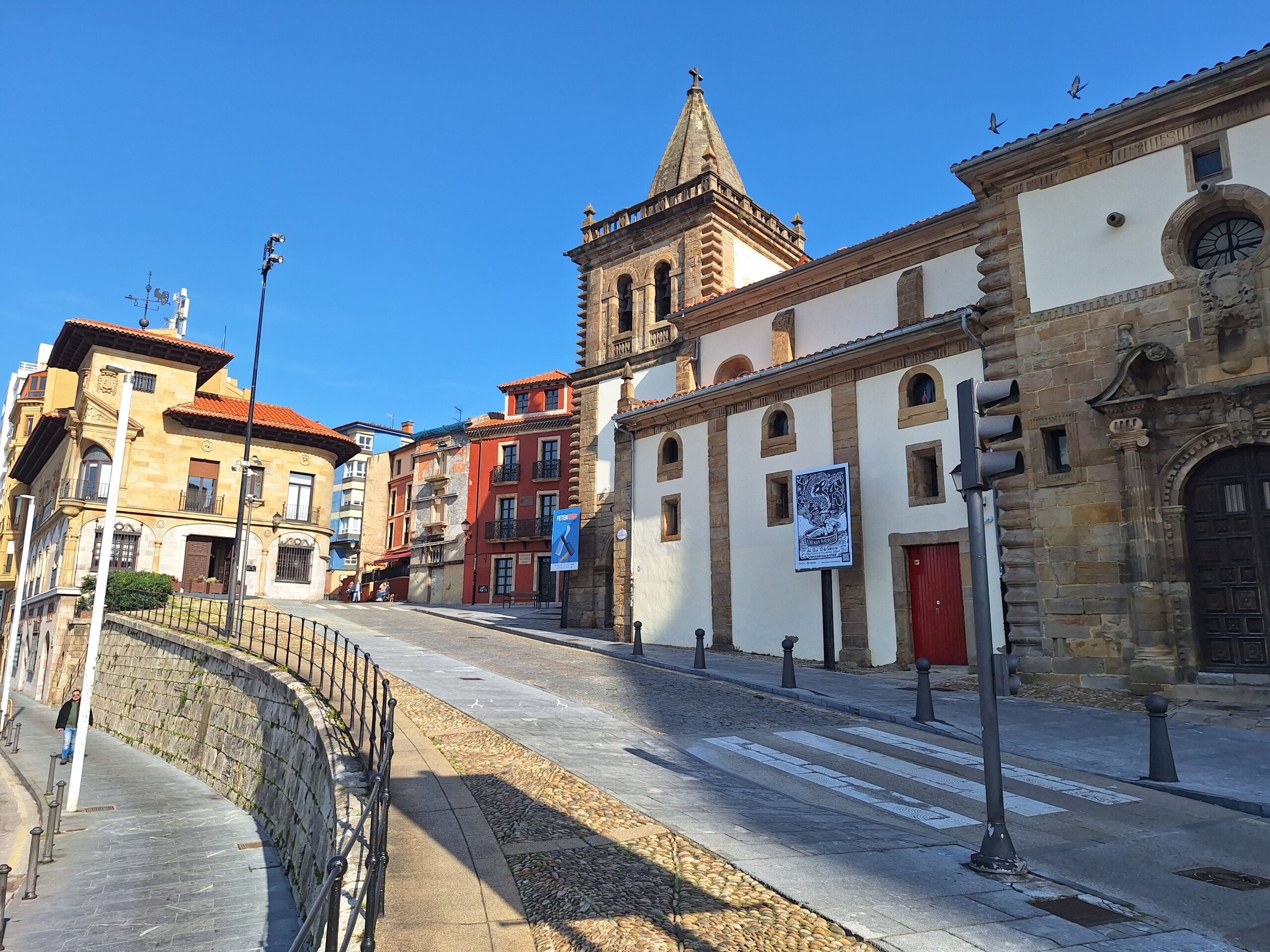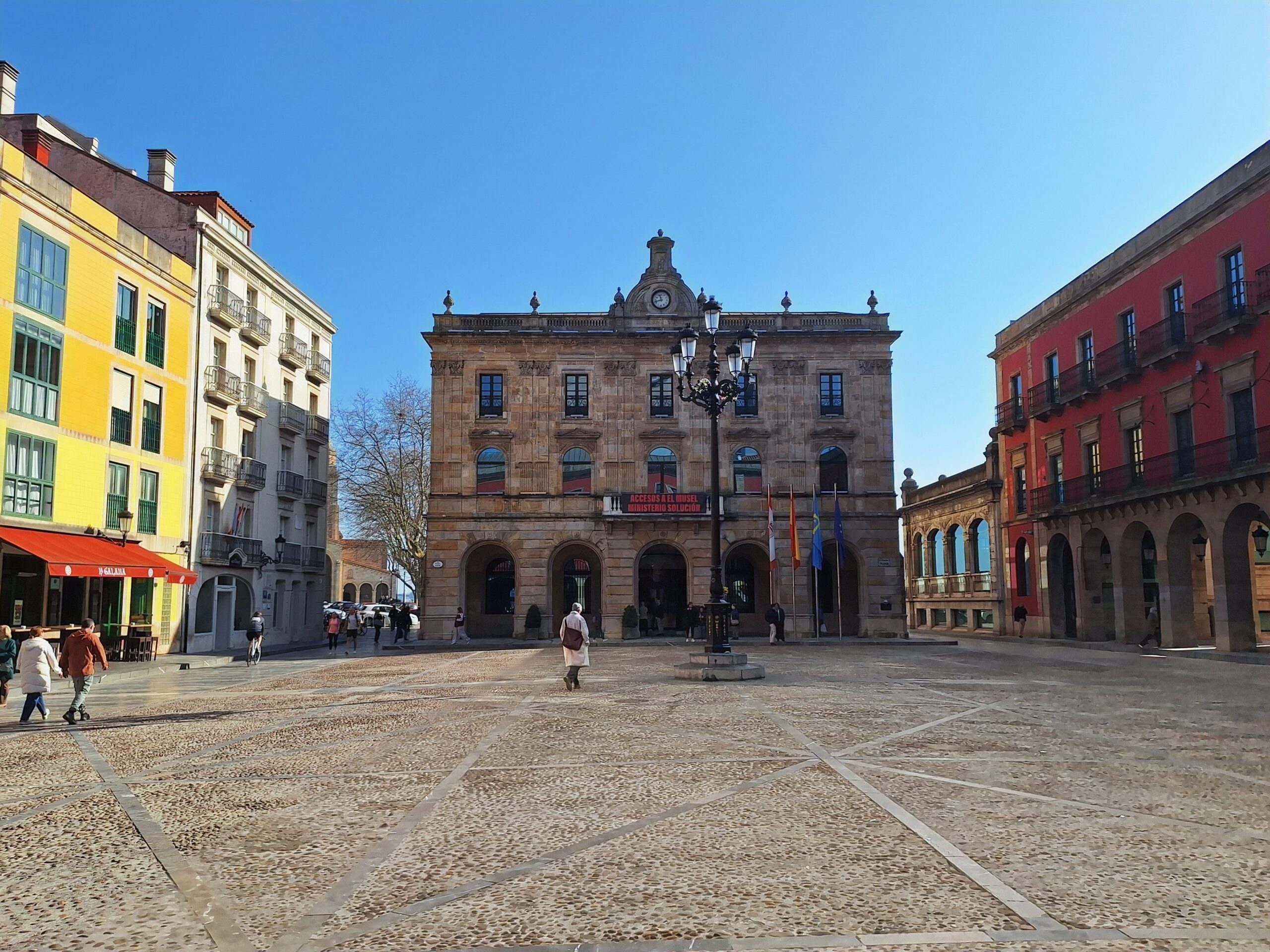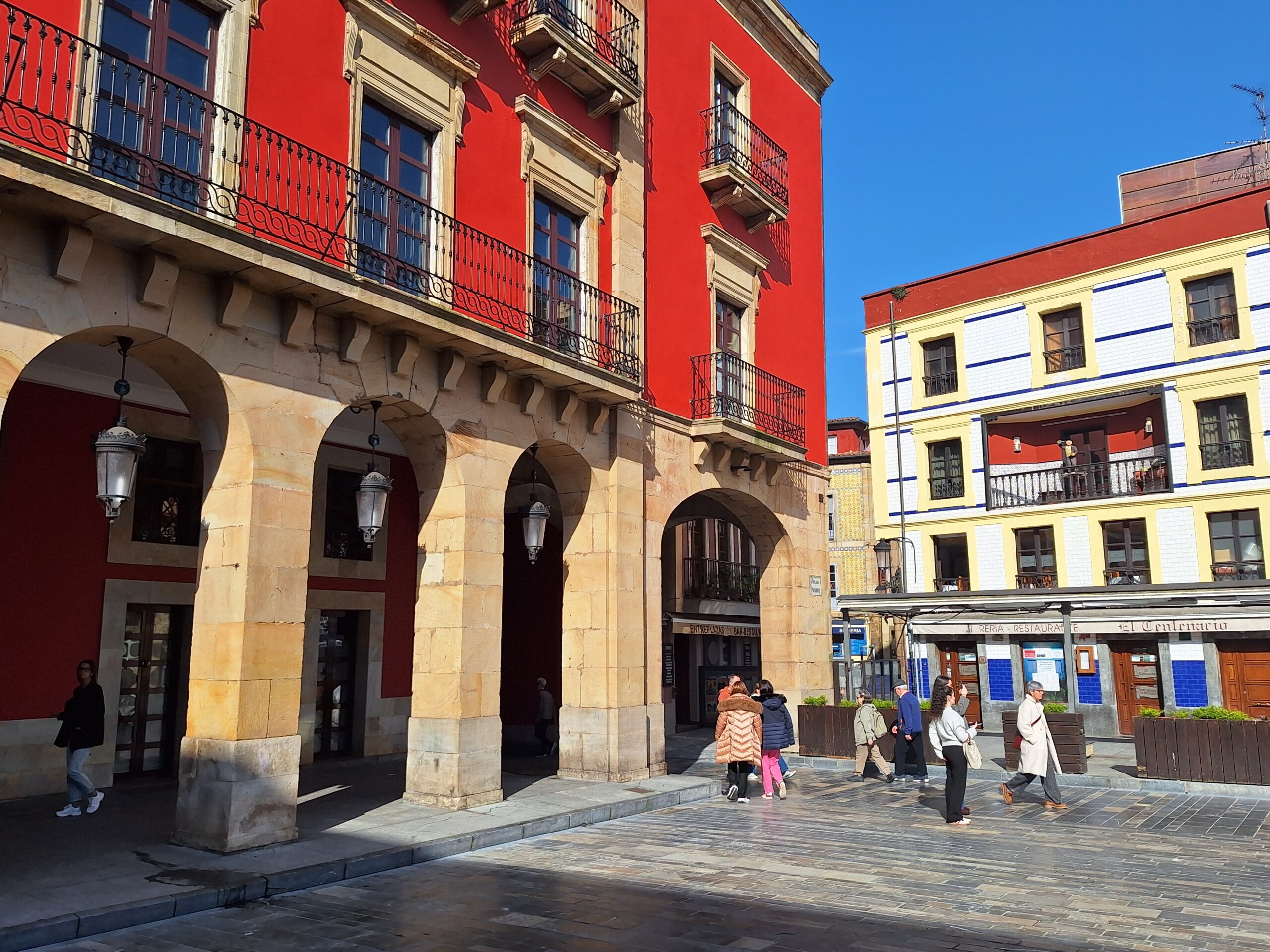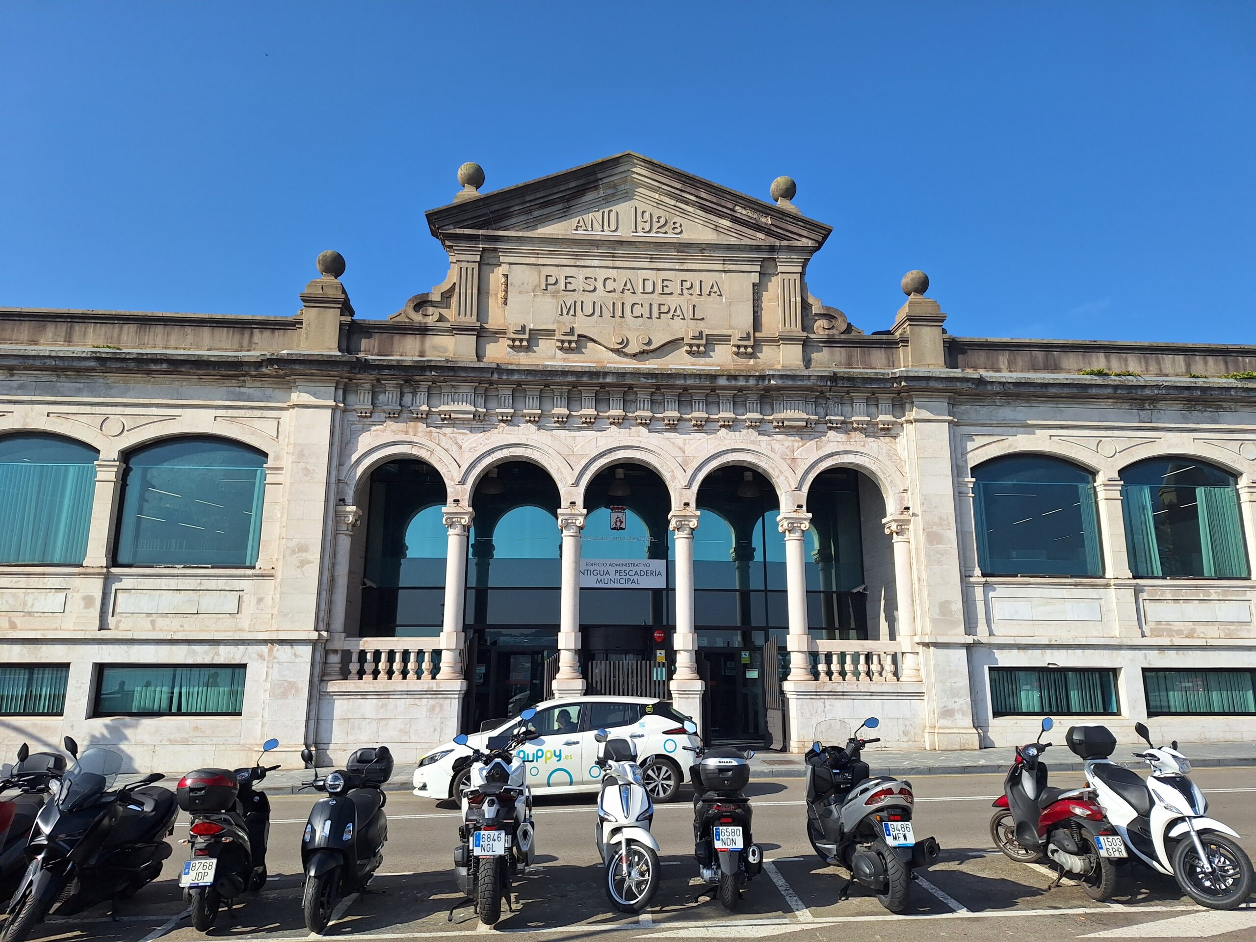 Po powrocie do miasta wysiadłem z autobusu koło Plaza de Toros. Jednak arena mnie rozczarowała, wszystko pozamykane. Przez pobliski park doszedłem do Playa de San Lorenzo, długiej plaży na końcu której znajduje się cypel Cimadevilla z fortecą. Ponieważ nie miałem już czasu wdrapać się na górę, przeszedłem tylko przez Plaza Mayor na Plazuela del Marqués, gdzie znajduje się fontanna Fuente y Estatua de Pelayo (odsłonięta w 1891 roku, przedstawia pomnik pierwszego króla Asturii), oraz najstarsze zachowane kamienice. Na wprost przyjemnie popatrzyć na basen portowy z jachtami (Dársena de Fomentín). Przechodnie robią sobie także zdjęcia przy napisie Gijón (Las Letronas).