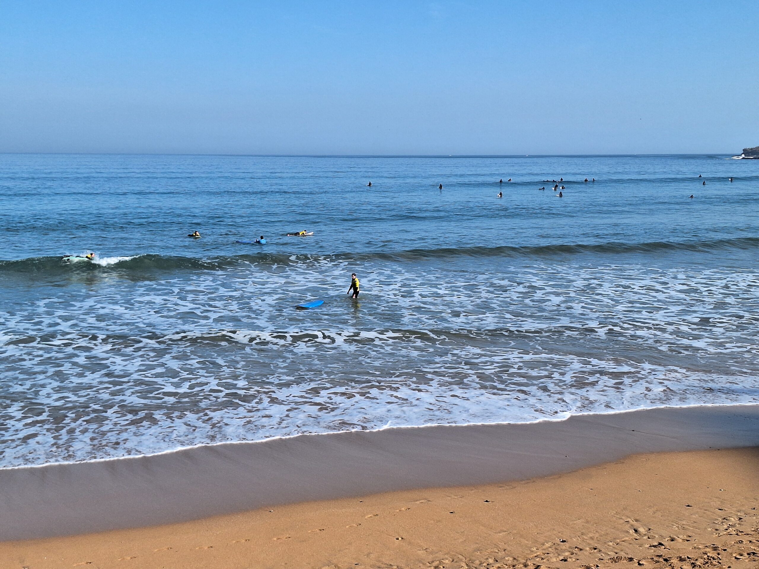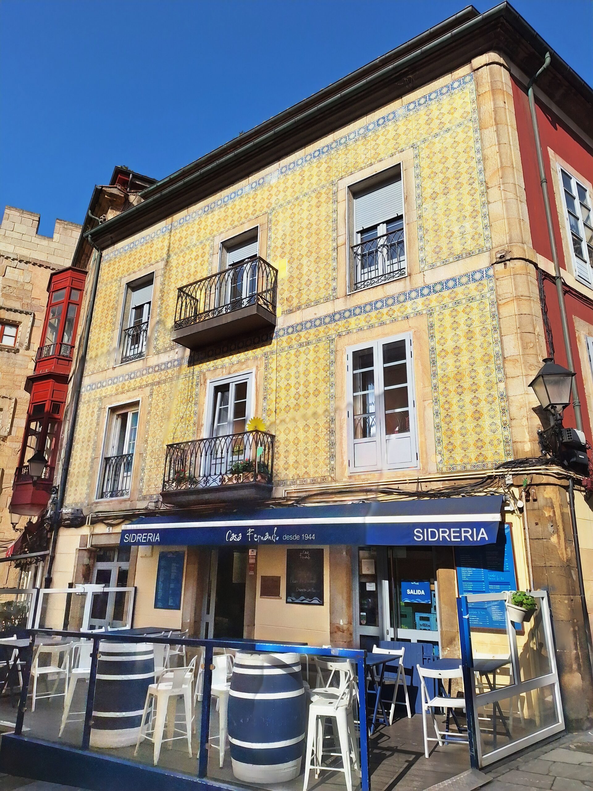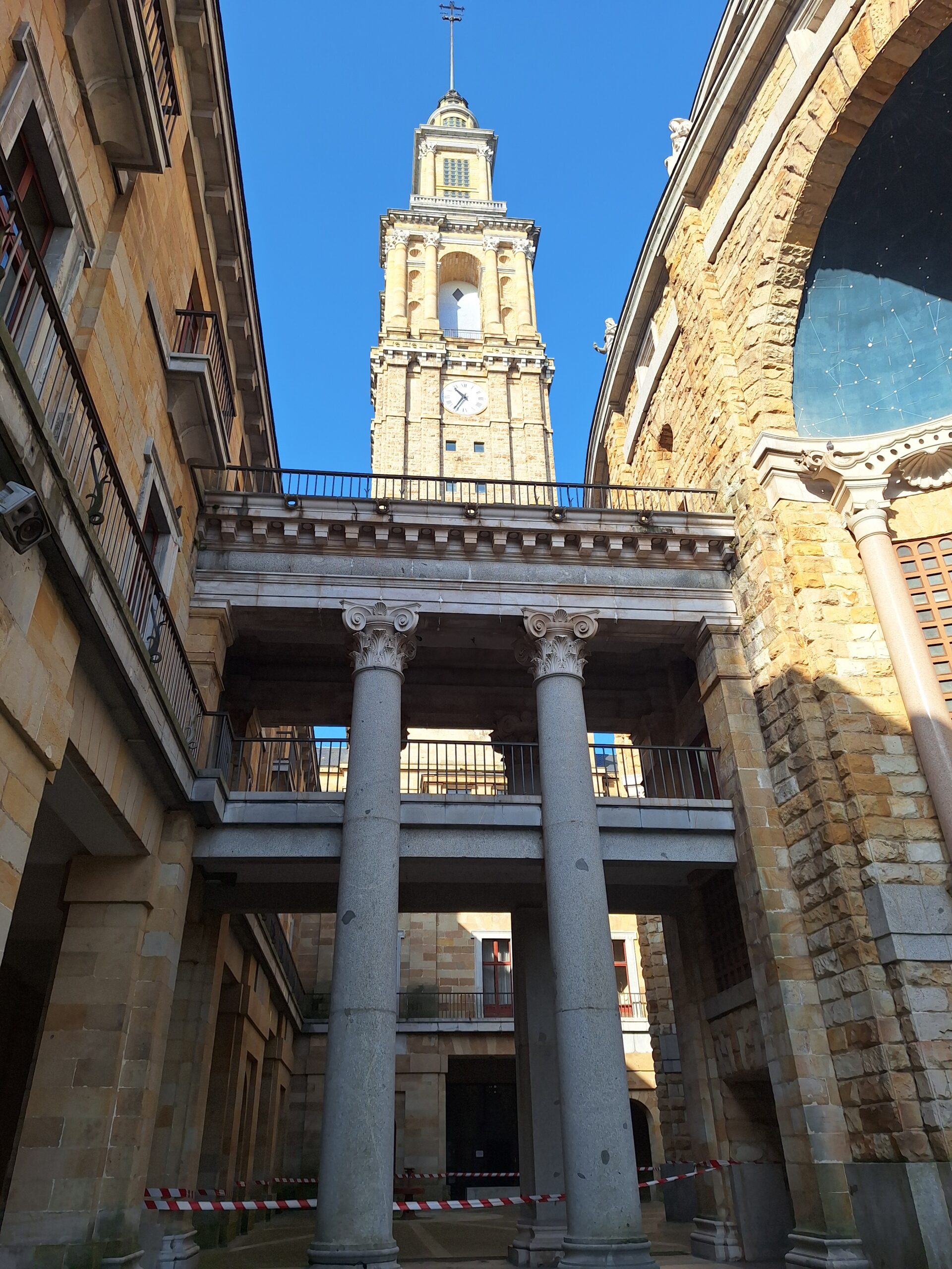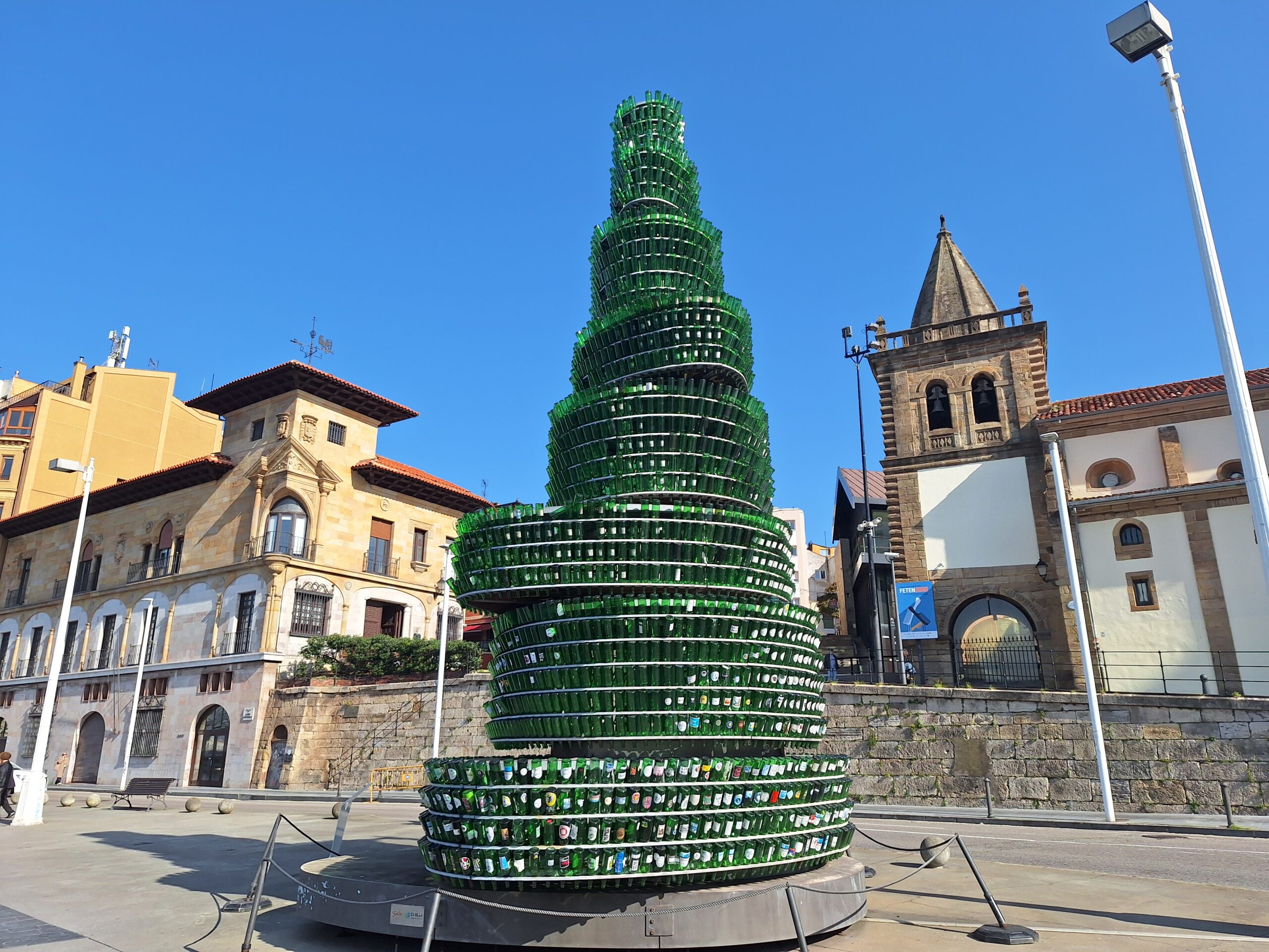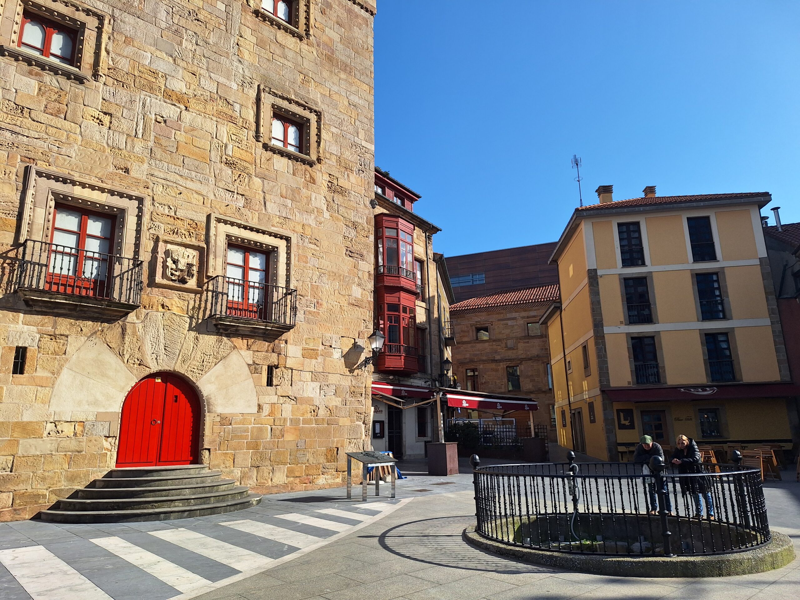 Po powrocie do miasta wysiadłem z autobusu koło Plaza de Toros. Jednak arena mnie rozczarowała, wszystko pozamykane. Przez pobliski park doszedłem do Playa de San Lorenzo, długiej plaży na końcu której znajduje się cypel Cimadevilla z fortecą. Ponieważ nie miałem już czasu wdrapać się na górę, przeszedłem tylko przez Plaza Mayor na Plazuela del Marqués, gdzie znajduje się fontanna Fuente y Estatua de Pelayo (odsłonięta w 1891 roku, przedstawia pomnik pierwszego króla Asturii), oraz najstarsze zachowane kamienice. Na wprost przyjemnie popatrzyć na basen portowy z jachtami (Dársena de Fomentín). Przechodnie robią sobie także zdjęcia przy napisie Gijón (Las Letronas).