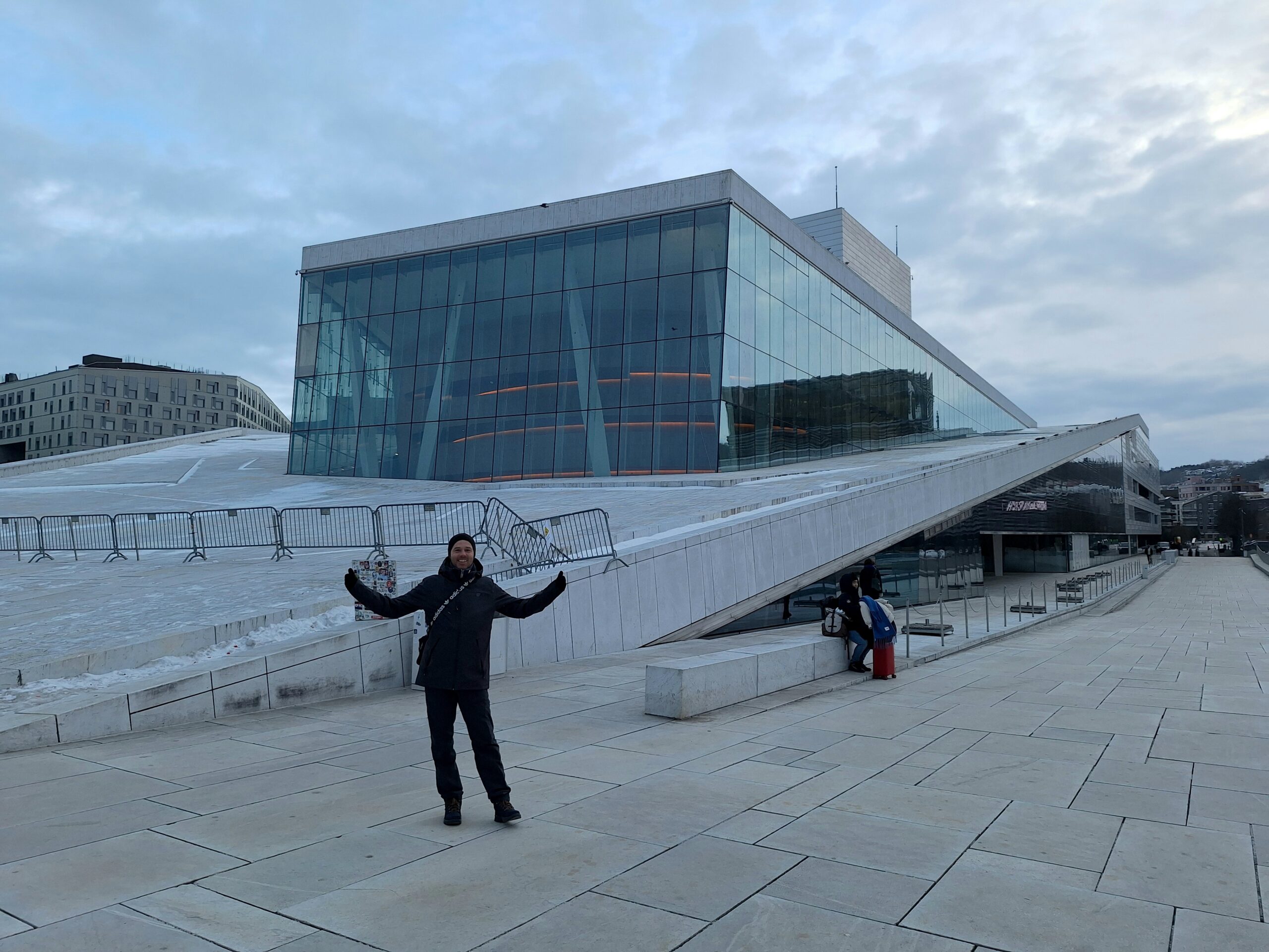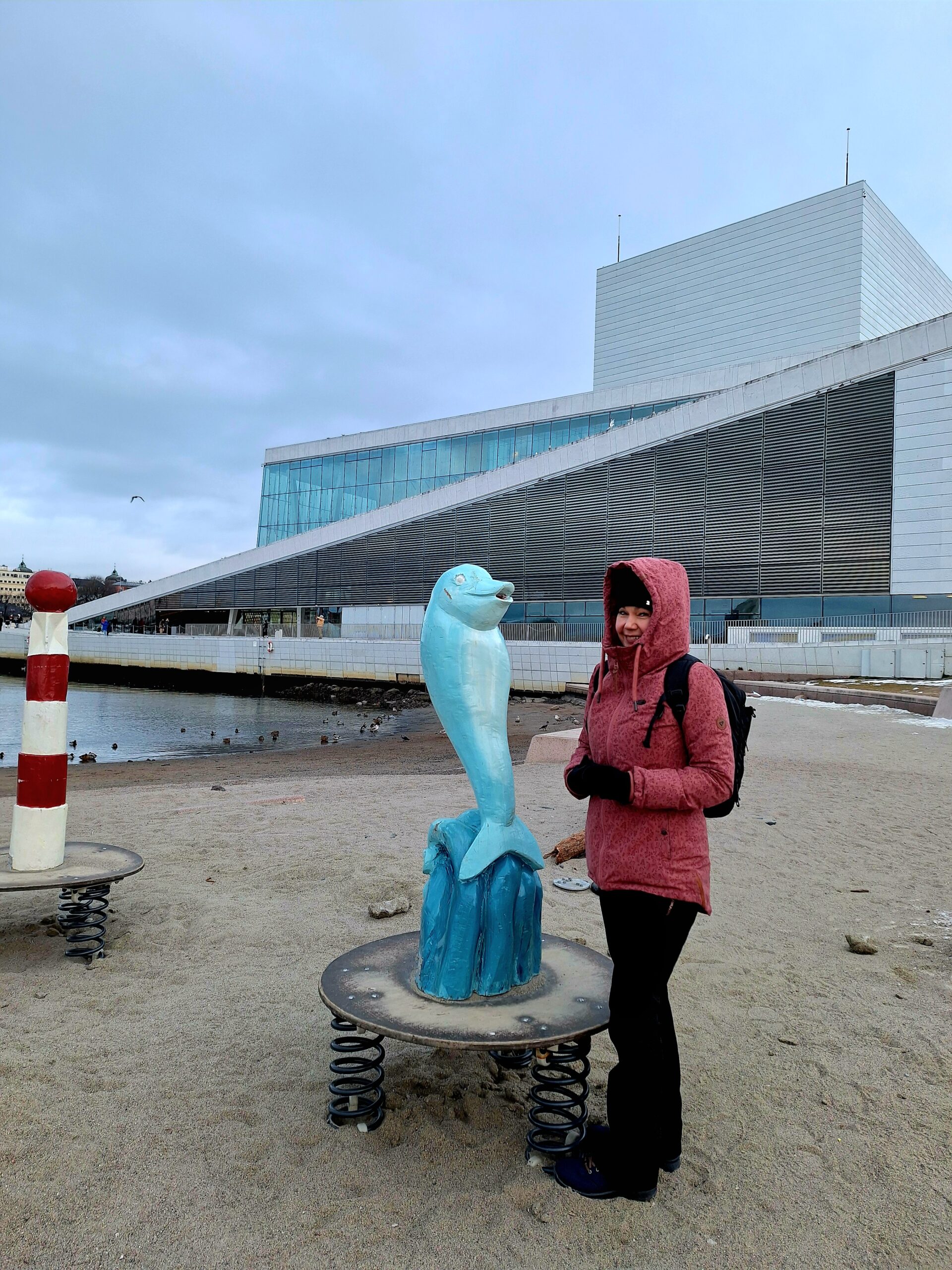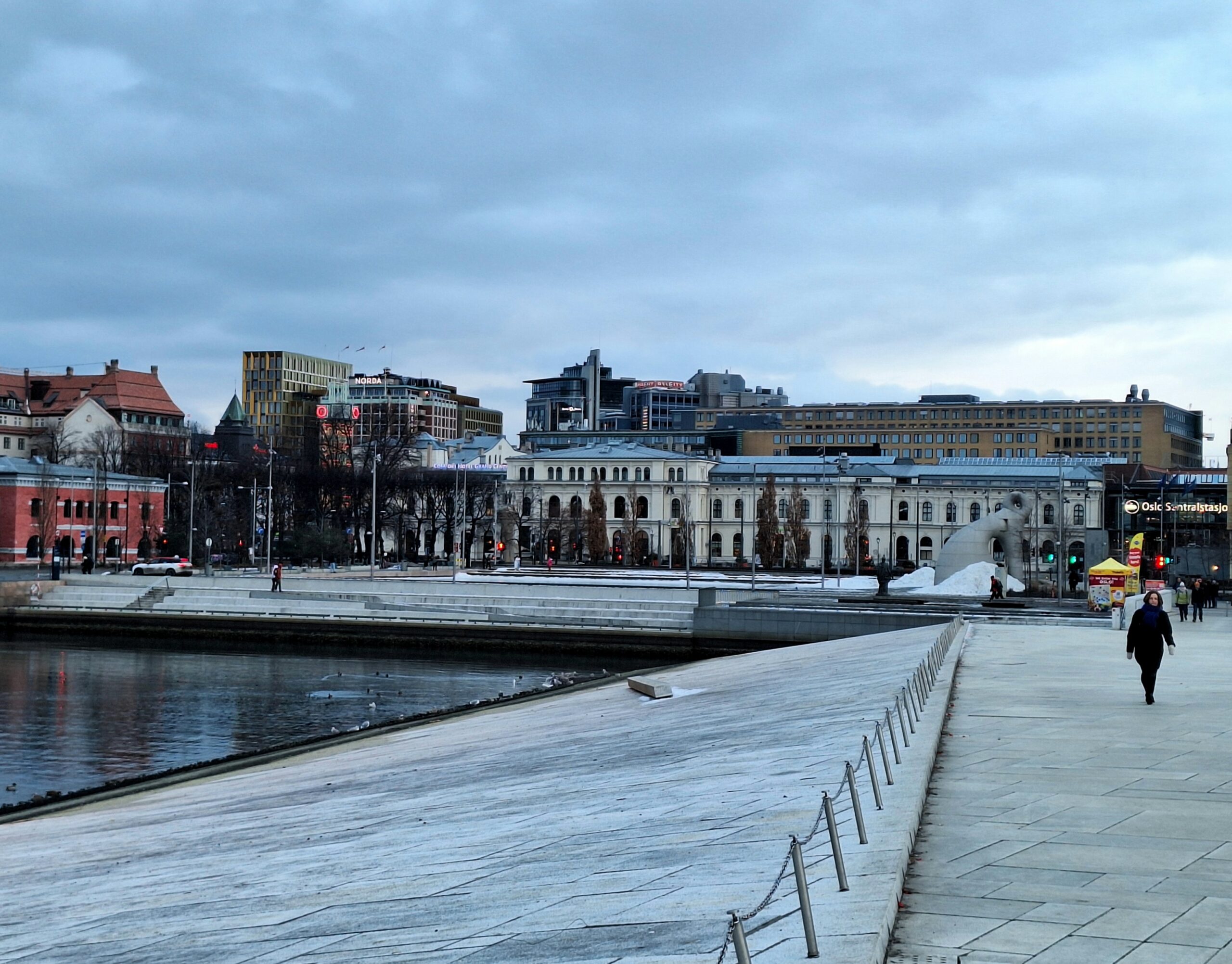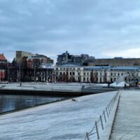 Opera w Oslo stoi praktycznie przy samej stacji kolejowej, nad kanałem Bjorvika, pod którym biegnie dwupasmowa droga. Liczyliśmy na to że w Oslo będzie biało, niestety od kilku dni nie spadł tu śnieg. A na spacer w mroźny poranek nie tylko my się wybraliśmy. Przed gmachem Opery (niestety nie można było wejść na dach) było całkiem sporo turystów.