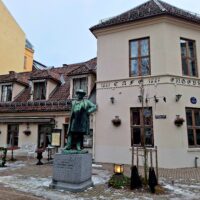 Na sam koniec krótkiego pobytu w stolicy Norwegii zostawiliśmy sobie pałac królewski oraz główną ulicę Karl Johans Gate. Z okolic ratusza pod pałac jest dosłownie parę kroków pod górę. Gdy doszliśmy na miejsce była trzynasta. Akurat rozpoczynała się parada zmiany warty. Chwilę popatrzyliśmy na nią, zrobiliśmy sobie zdjęcia przed pałacem, który do tej pory jest siedzibą monarchy, i ruszyliśmy w dół do stacji kolejowej. Po drodze minęliśmy ładny ceglany budynek Nationaltheatret (czyli teatru narodowego z pomnikami norweskich poetów Ibsena, dramatopisarza Bjørnsona), budynek parlamentu Stortinget. Zajrzeliśmy także do XVII w. katedry (Oslo Domkirke). Wchodząc do środka, wita nas spokojna i cicha atmosfera, z pięknie zdobionymi sufitami oraz witrażami. A także ciepło. Bo mroźna aura już nam się dawała we znaki, mimo iż byliśmy ciepło ubrani.