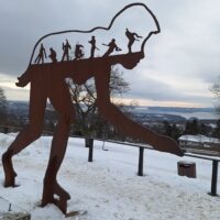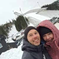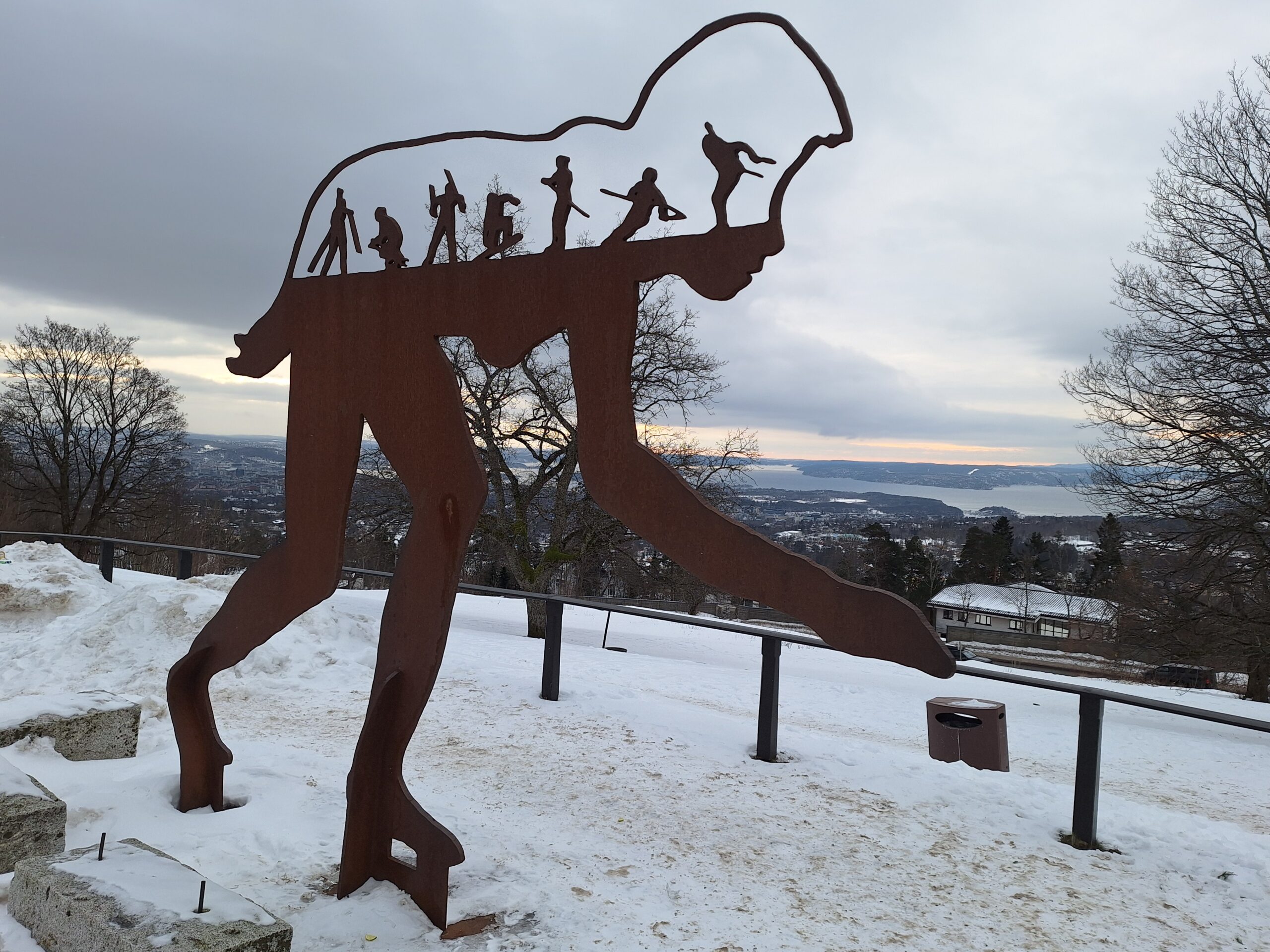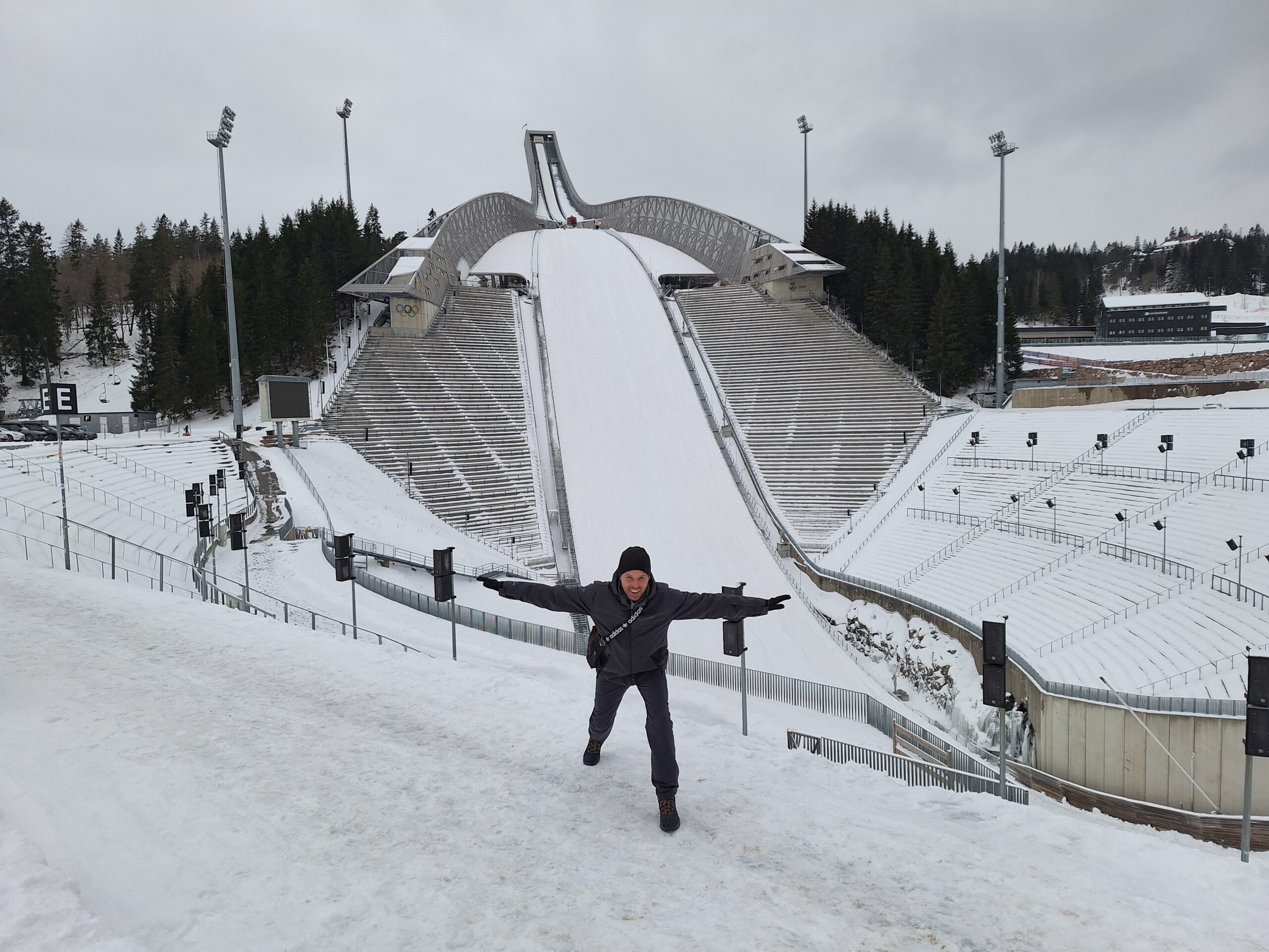 Koło stacji już było biało. Norwegowie nie oszczędzają na bezpieczeństwie i sporo wysypali tłucznia żeby można było dojść bezpiecznie pod skocznię. W metrze masa osób jechała z nartami biegowymi do ostatniej stacji, gdzie są trasy. Zupełnie inaczej niż u nas, gdzie przy takiej temperaturze wszyscy siedzą w domu. A tu nikt tym się nie przejmuje. Koło skoczni jest także stadion na którym odbywały się akurat zawody biatlonowe. My zrobiliśmy sobie kilka fotek, lądując telemarkiem, i wróciliśmy do metra, by pojechać pod park Vigelanda.