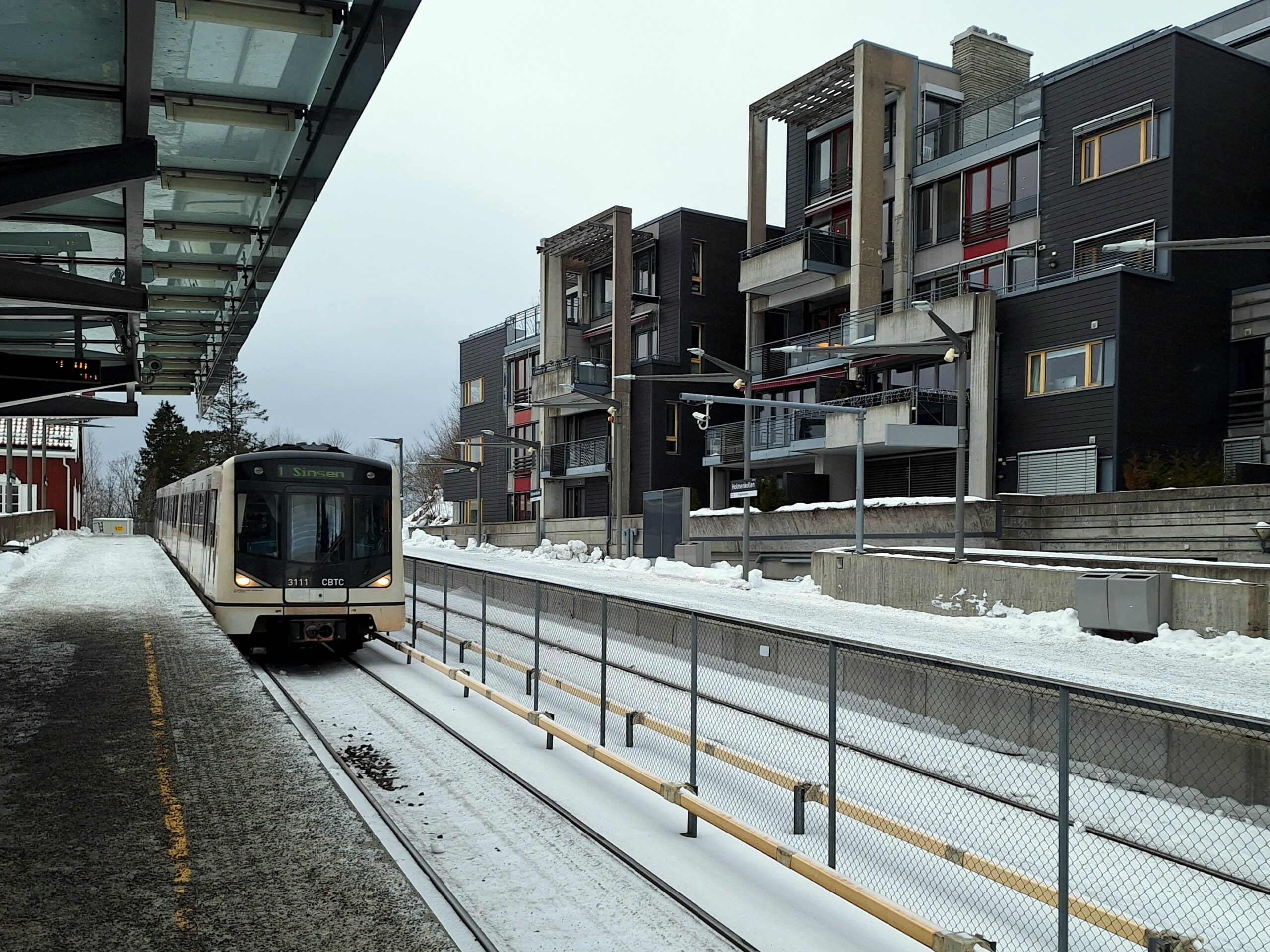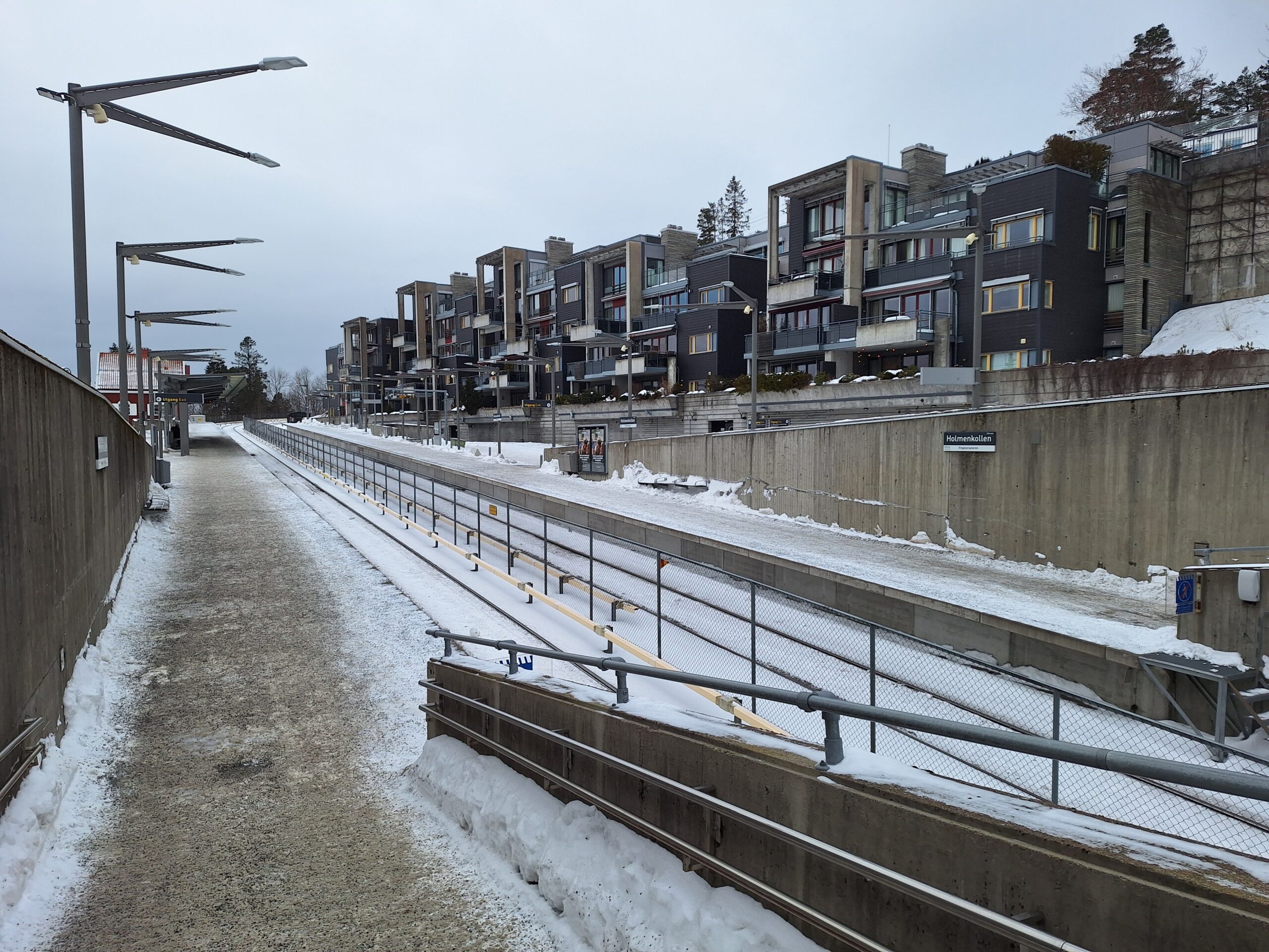 Po spacerze przez całą twierdzę dotarliśmy do stacji metra Stortinget by pojechać pod skocznię Holmenkollen (nie mogliśmy zlokalizować wejścia do metra, bo front jest przysłonięty plandeką i samo wejście jest w remoncie, dlatego trochę się naszukaliśmy jak tam wejść). Skocznia jest oddalona spory kawałek od centrum. Do celu dojechaliśmy linią metra nr 1 w kierunku Bergkrystallen (czas przejazdu 25min). Po drodze już na powierzchni kolejka zatrzymuje się aż na 15 przystankach, pokonując krętą drogę i różnicę wysokości prawie 300m.
