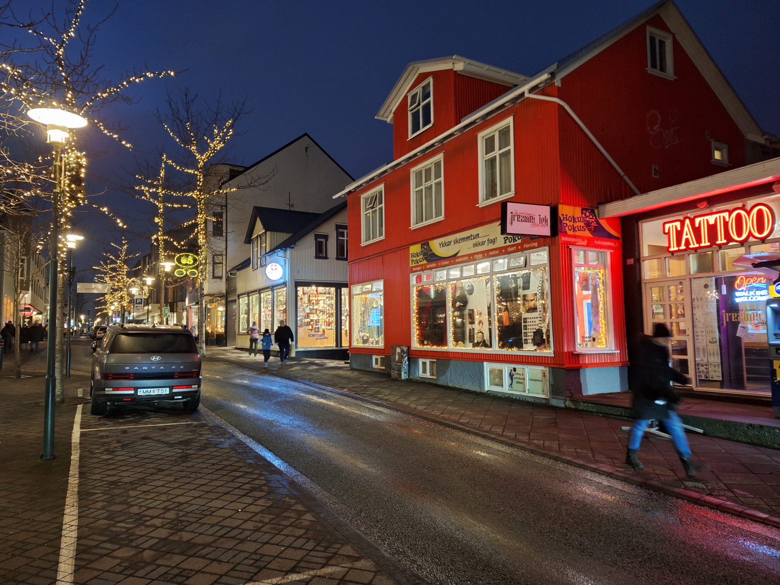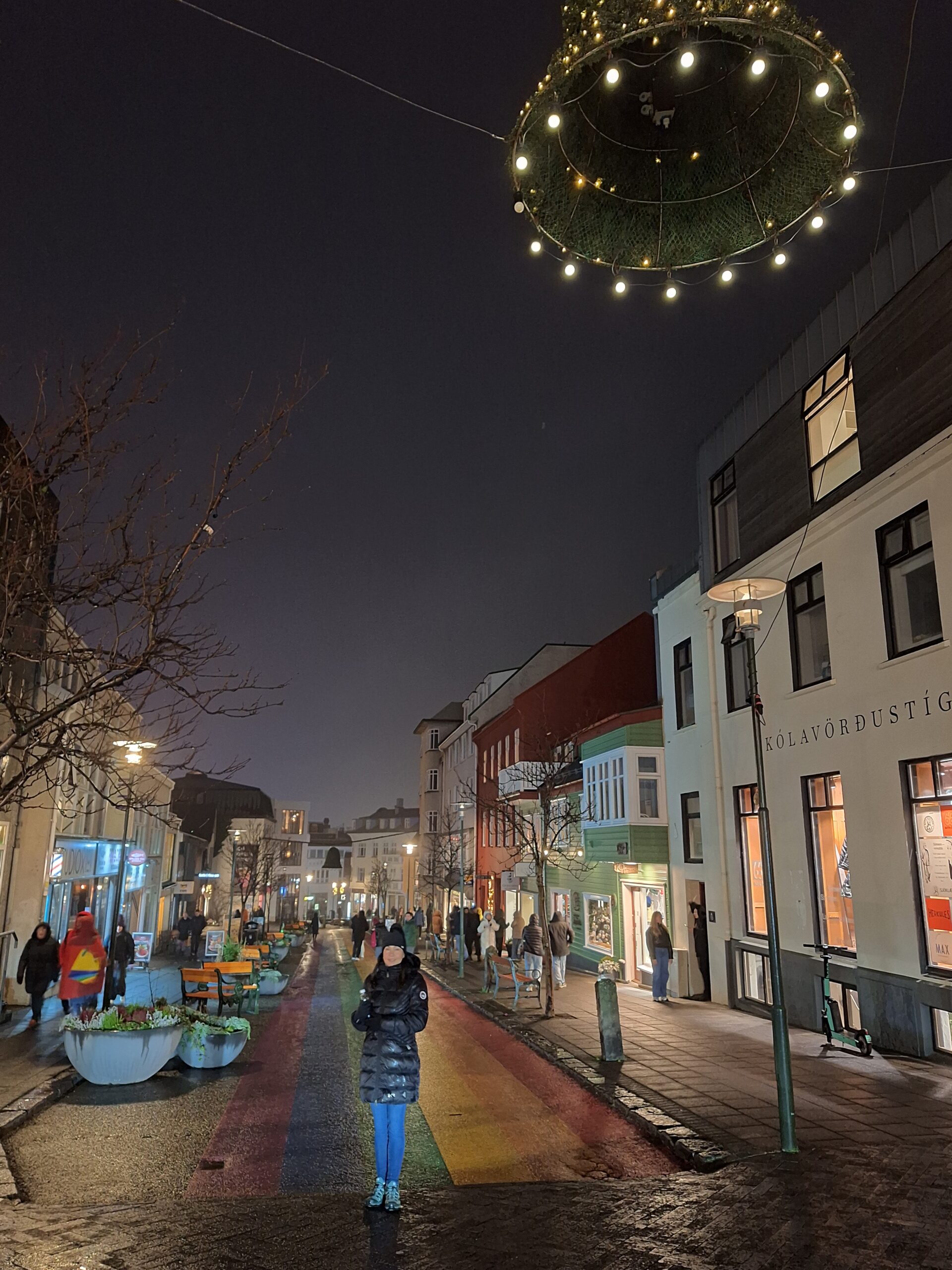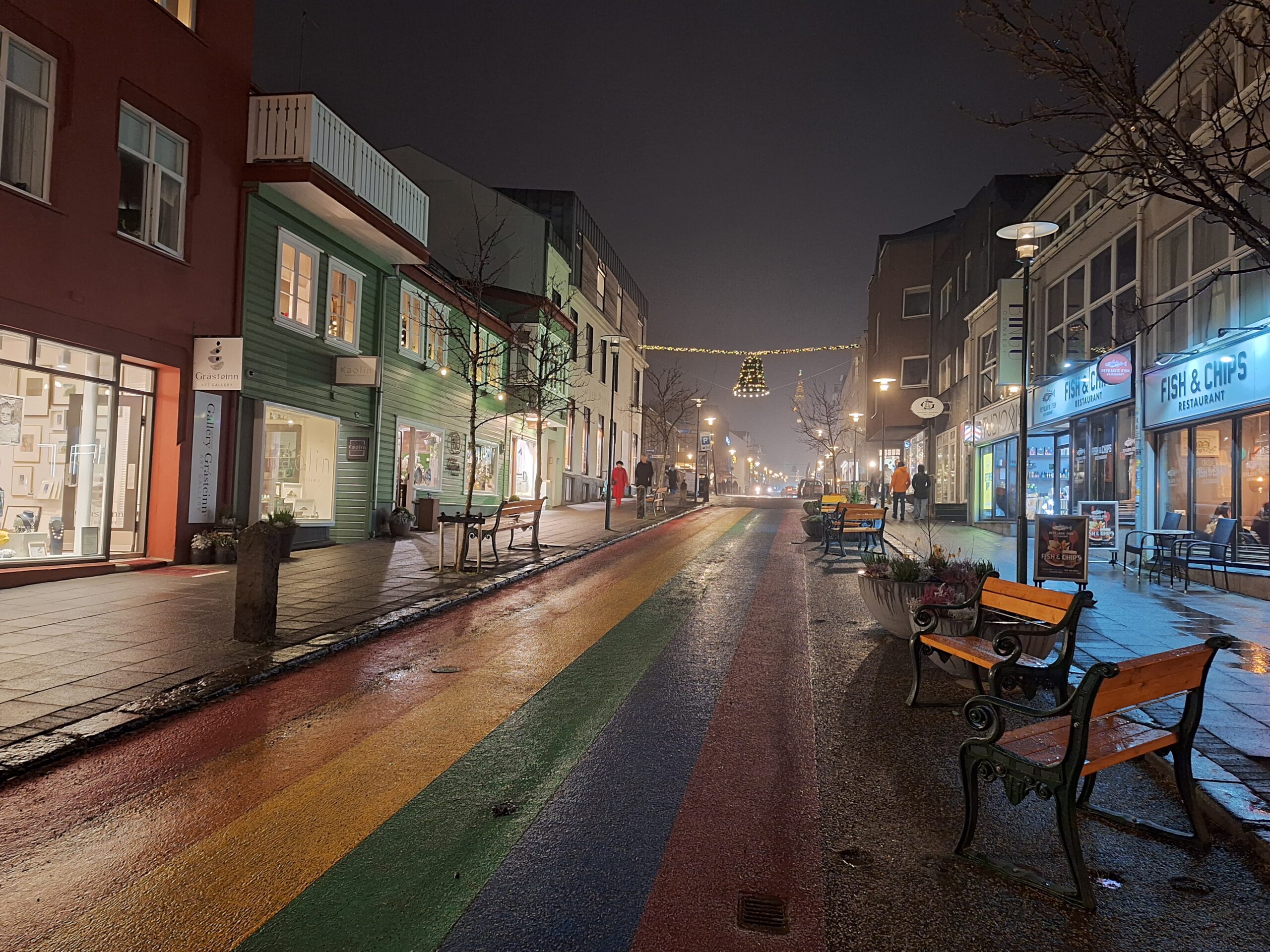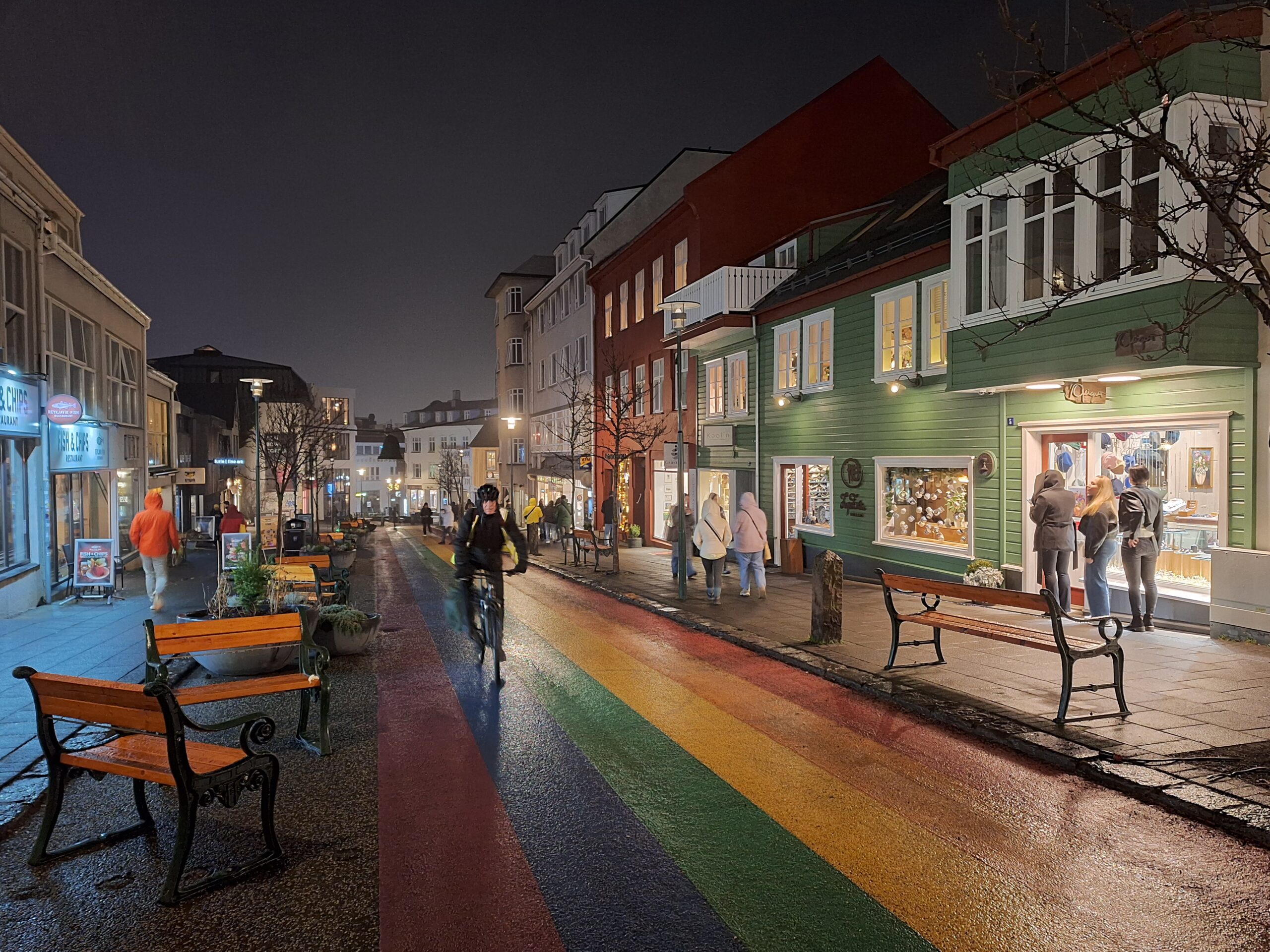 Po obiadokolacji poszliśmy pod katedrę Hallgrímskirkja, którą zwiedzimy jutro, dziś tylko kilka fotek i z wróciliśmy z powrotem na główną ulicę Laugavegur. Tu są najładniejsze kamienice nadające wyjątkowy urok temu miastu. Tak samo jak tęczowa ulica Skólavörðustígur Regnbogagatan. Zrobiło się wyraźniej chłodno, więc przed wieczornym spacerem okrężną drogą przez jeziorko wróciliśmy z centrum do apartamentu.