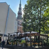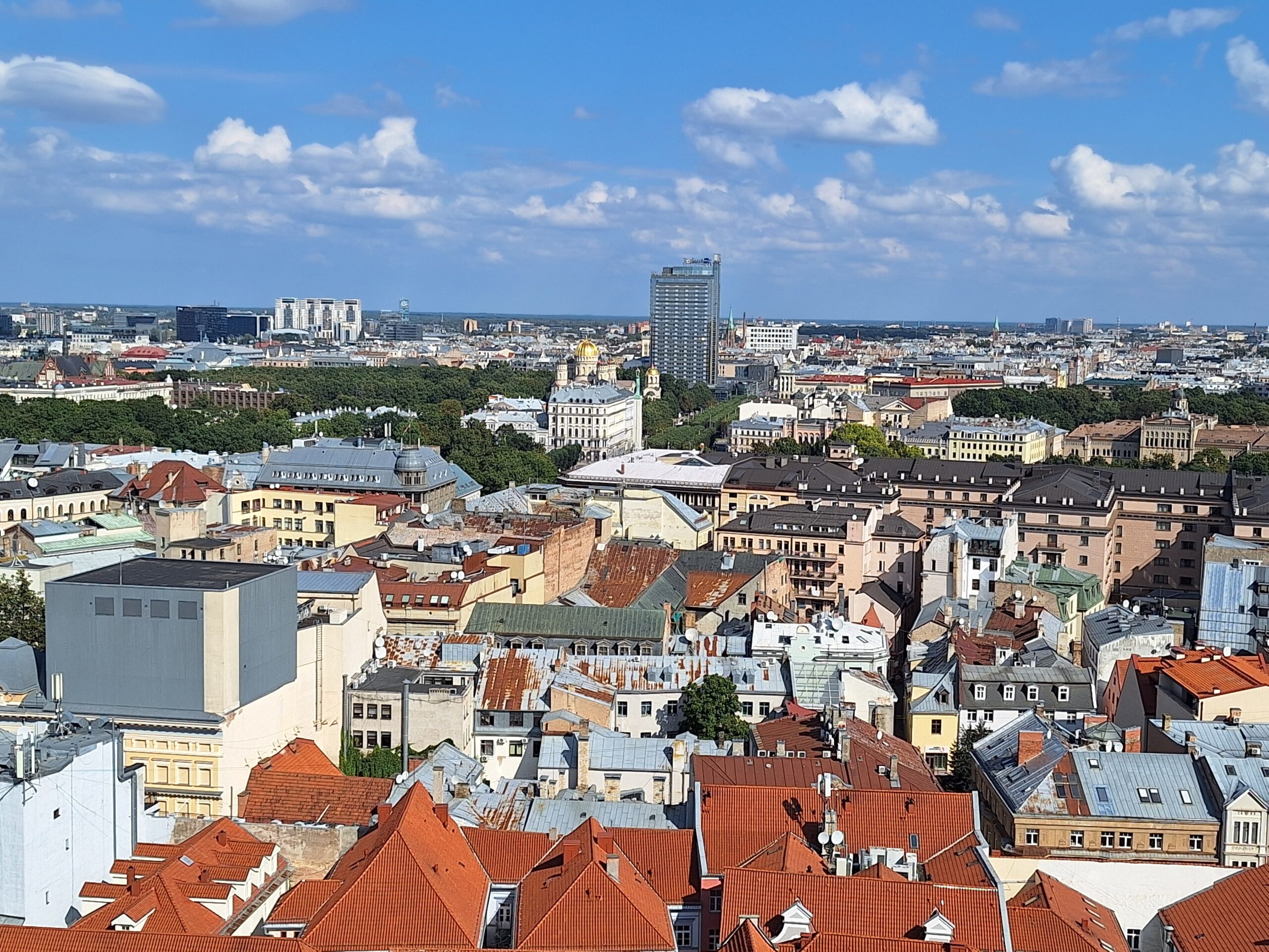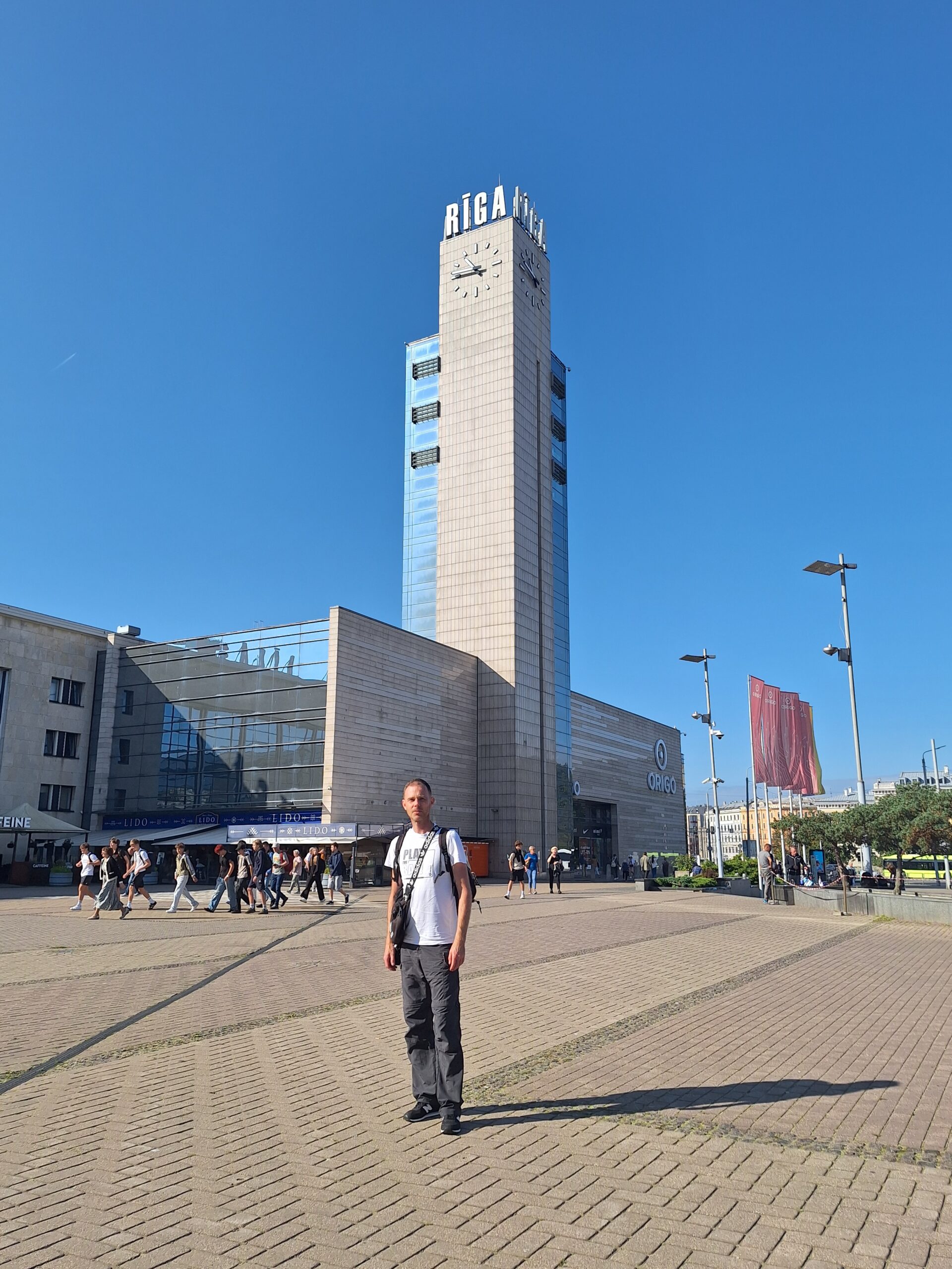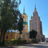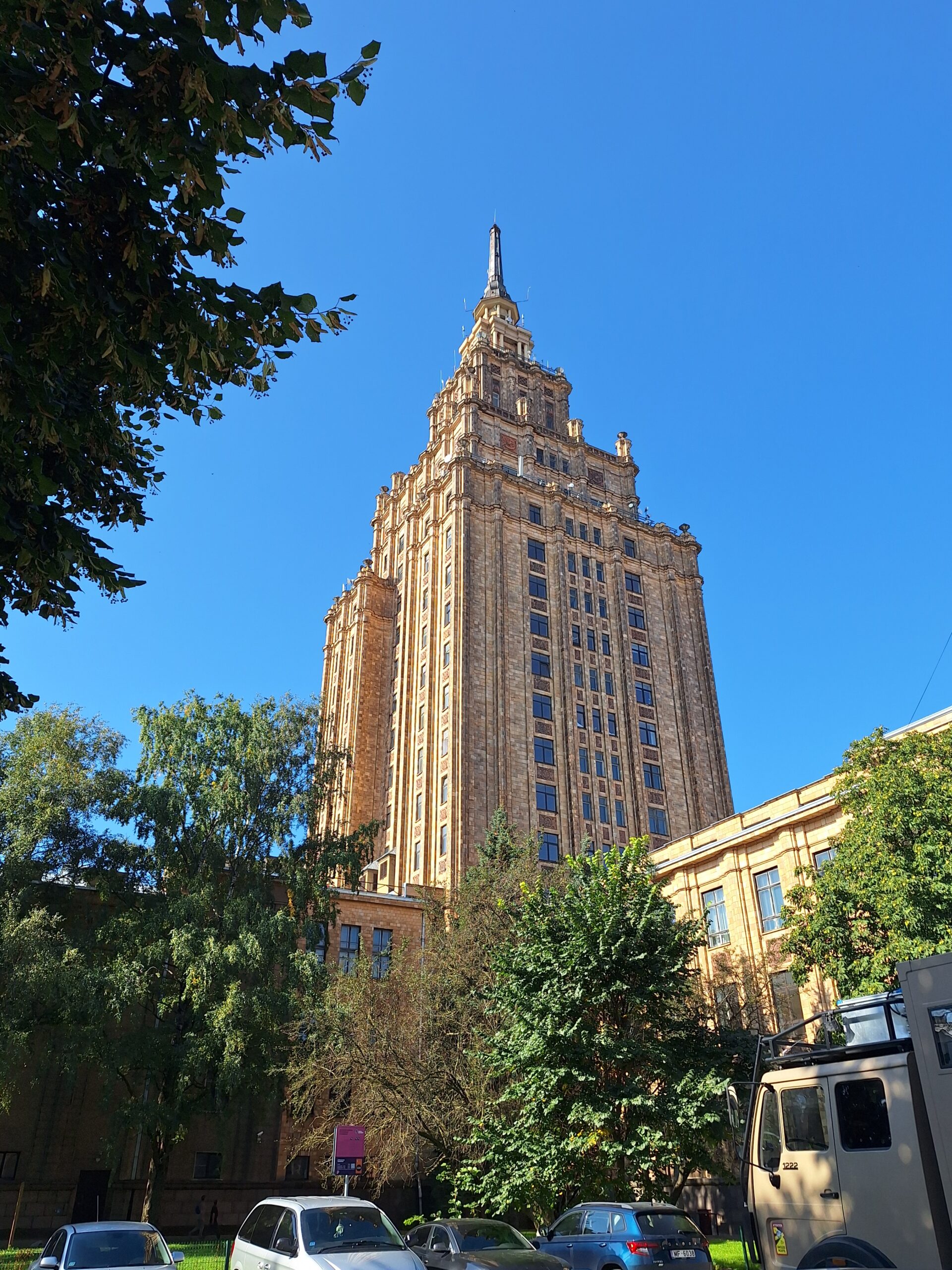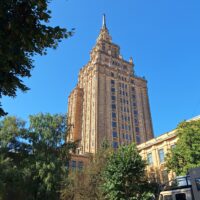 Ale mamy fart. Przez cały nasz pobyt w Rydze ma być tylko słońce. Po dotarciu do centrum, wstąpiliśmy do Restauracji Lido, gdzie można zjeść niedrogie śniadanie. To taka lokalna sieciówka ze sporą ilością miejscowych dań do wyboru. Mieści się ona w budynku dworca kolejowego Rīga Pasažieru, który połączony jest z centrum handlowym. Po kawie udaliśmy się do hotelu Mercure, który mieści się na tyłach owego centrum. Z uwagi na status w sieci Accor dostaliśmy pokoje wcześniej, bo już o 10 rano. Zostawiliśmy rzeczy i rodzice poszli na czerwony autobus Hop On Hop Off, którym łatwiej zwiedzą stolicę, a my w kierunku Latvijas Zinātņu akadēmija (budynek Łotewskiej Akademii Nauk – czyli ichniejszy Pałac Kultury, taki sam jak w Warszawie).