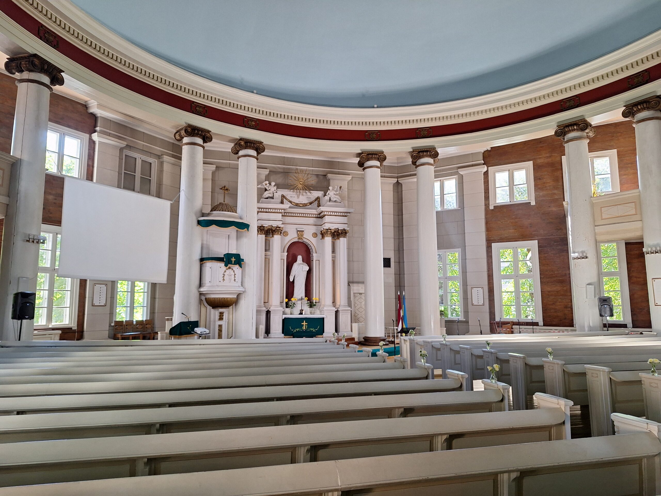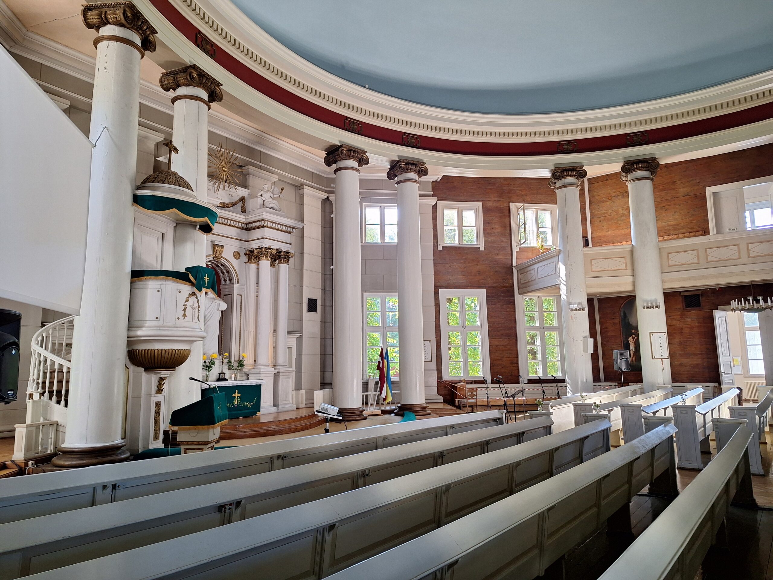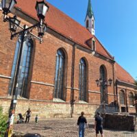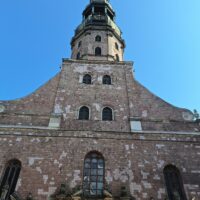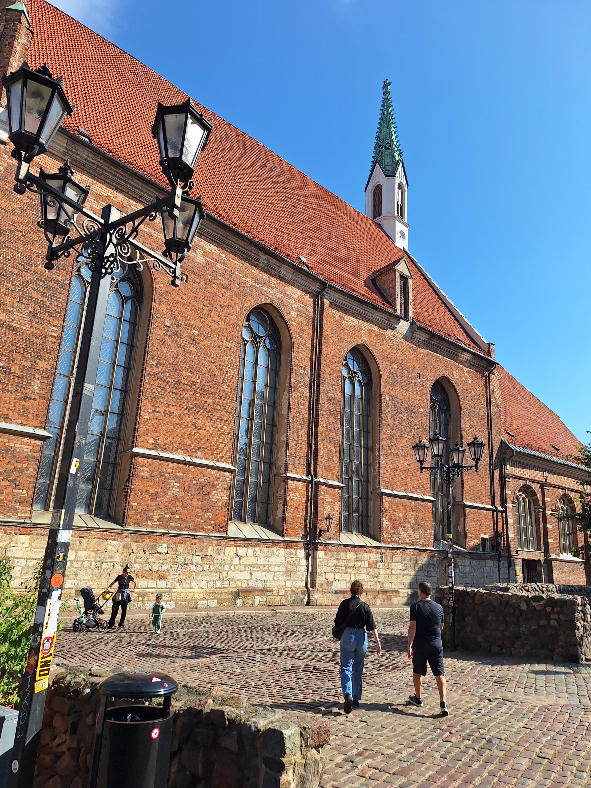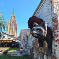 Idąc w jego kierunku wstąpiliśmy po drodze do Cerkwii Zwiastowania. Piękny budynek z żółtą elewacją i zielonym gontem na dachu. Piękne wnętrze. Niestety w środku nie można było robić zdjęć. Jedną ulicę dalej za Budynkiem Akademii Nauk jest kwartał kultury – Kultūras kvartāls „Lastādija”. Są tutaj wystawione rzeźby z rzeczy z odzysku oraz wielka postać lisa, który wystaje tajemniczo z kamienicy, wygląda to jak figura w 3D. Kolejnym miejscem, które chcieliśmy zobaczyć to panorama miasta z wieży widokowej Akademii (wstęp płatny 8 Euro), jednak jeszcze zanim tam dotarliśmy zajrzeliśmy do pobliskiego kościoła luterańskiego (Elijas iela 18) należącego do wyznania Ewangelicko-Augsburskiego. Zupełnie inne wnętrze niż kościół katolicki czy cerkiew. W kościele luterańskim byłem pierwszy raz.