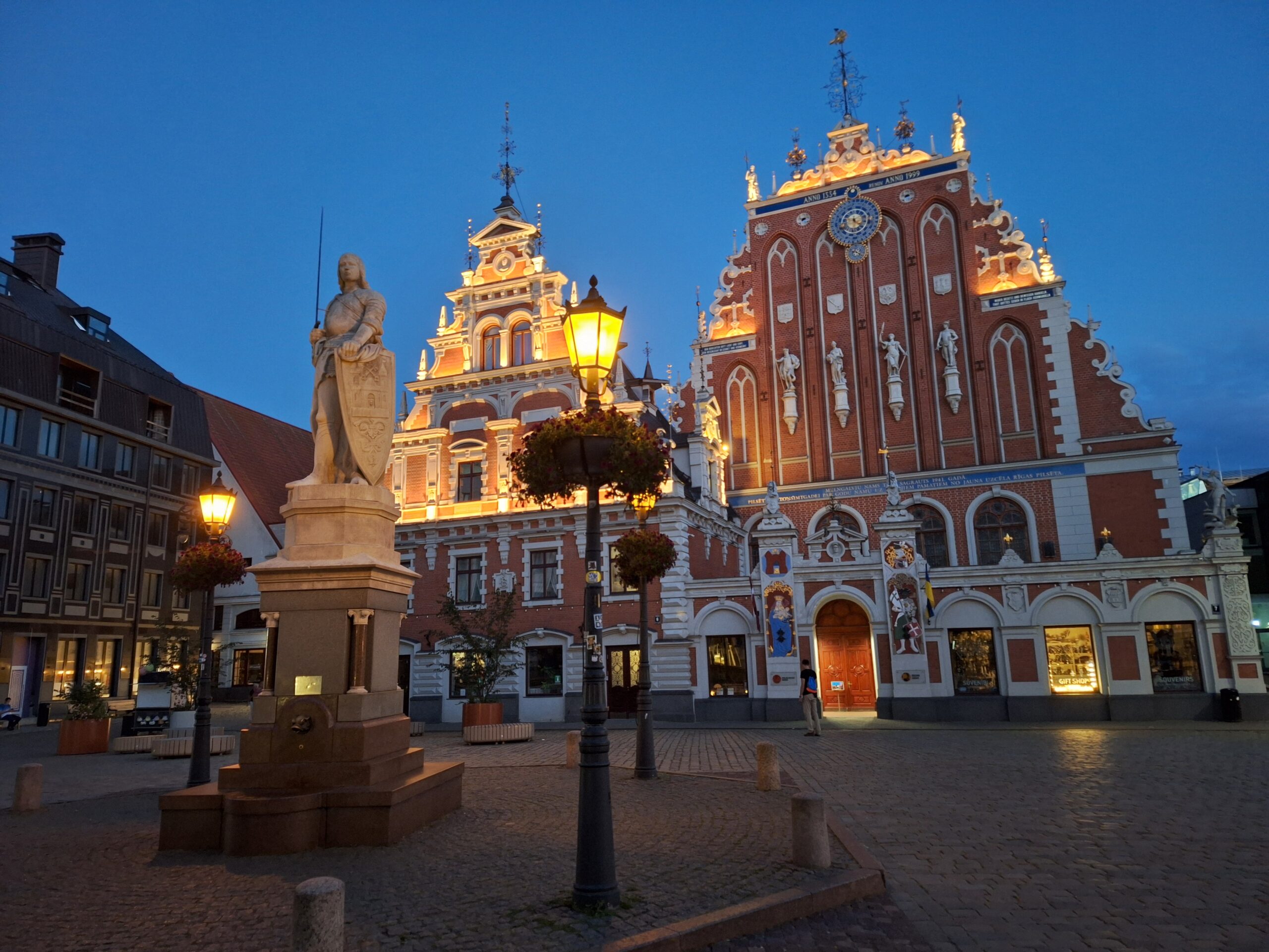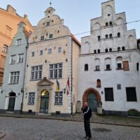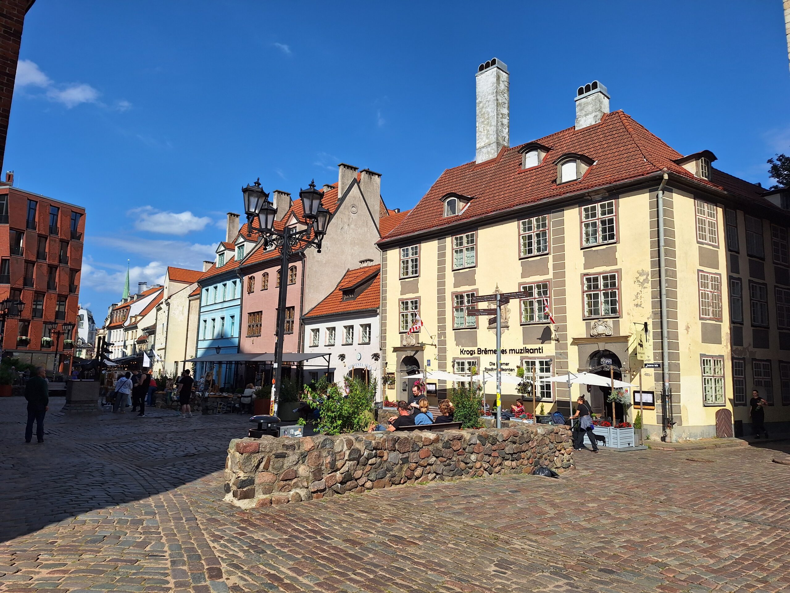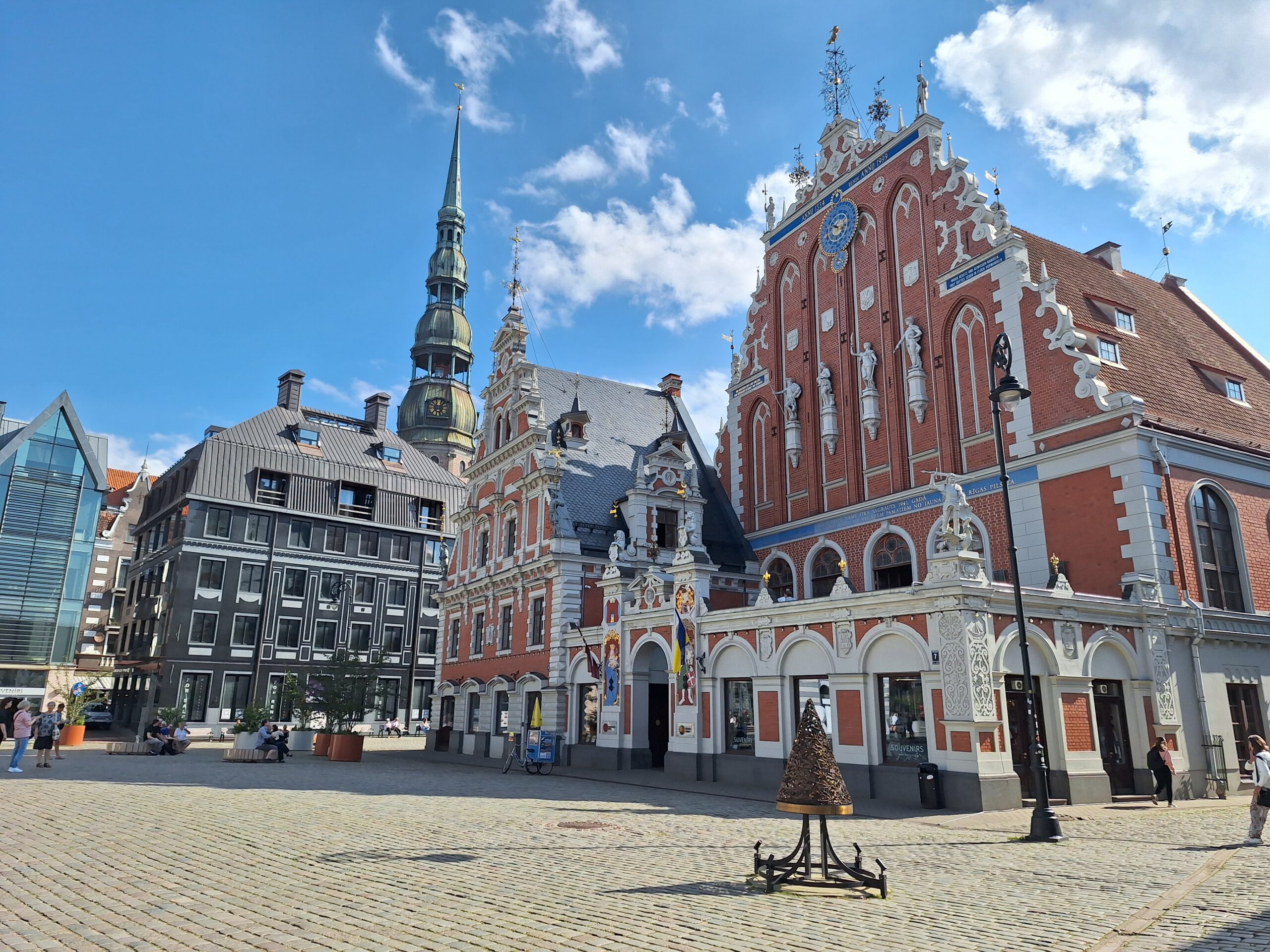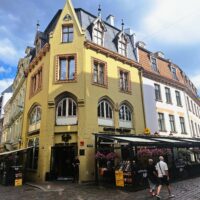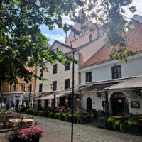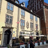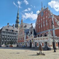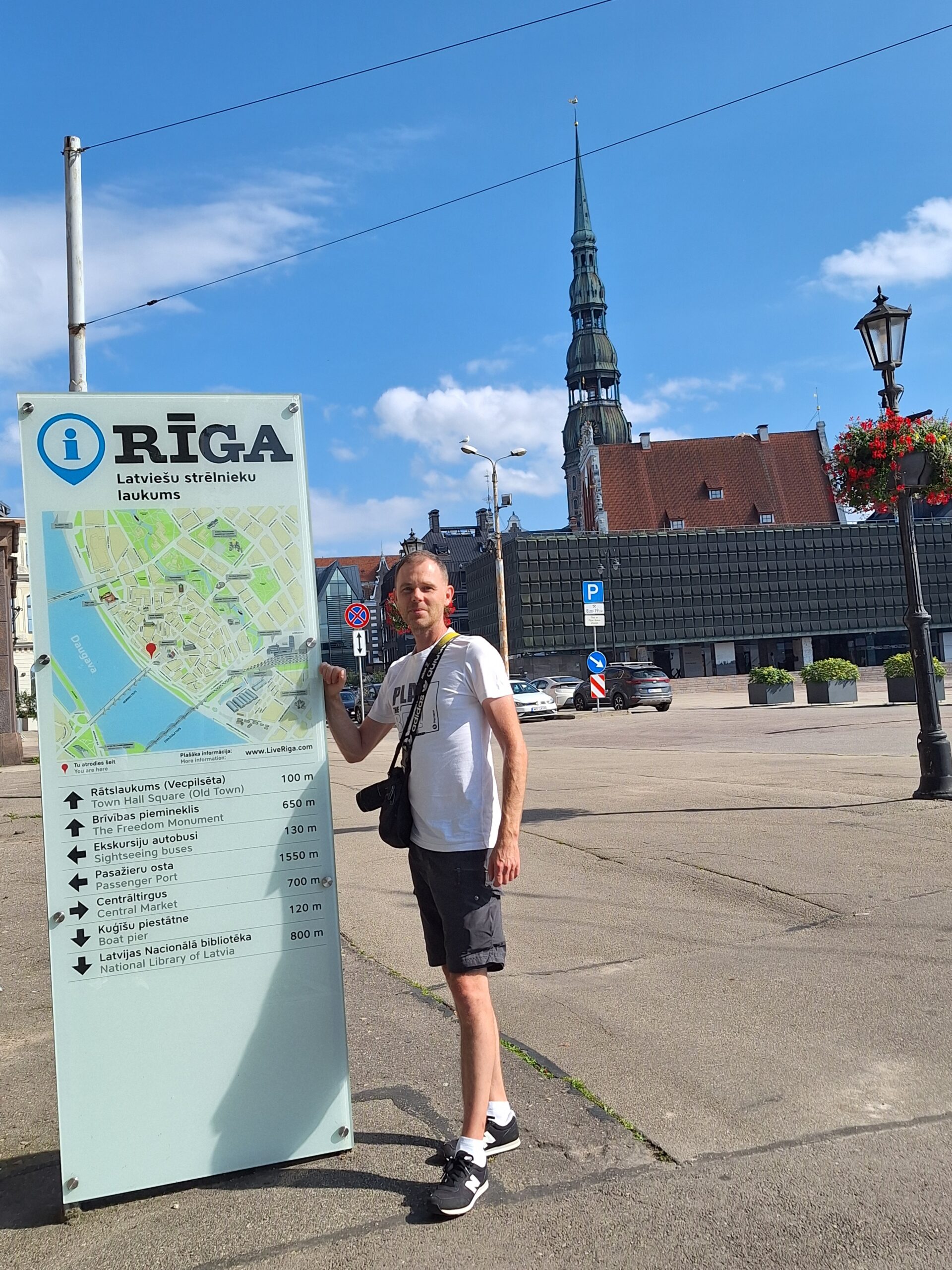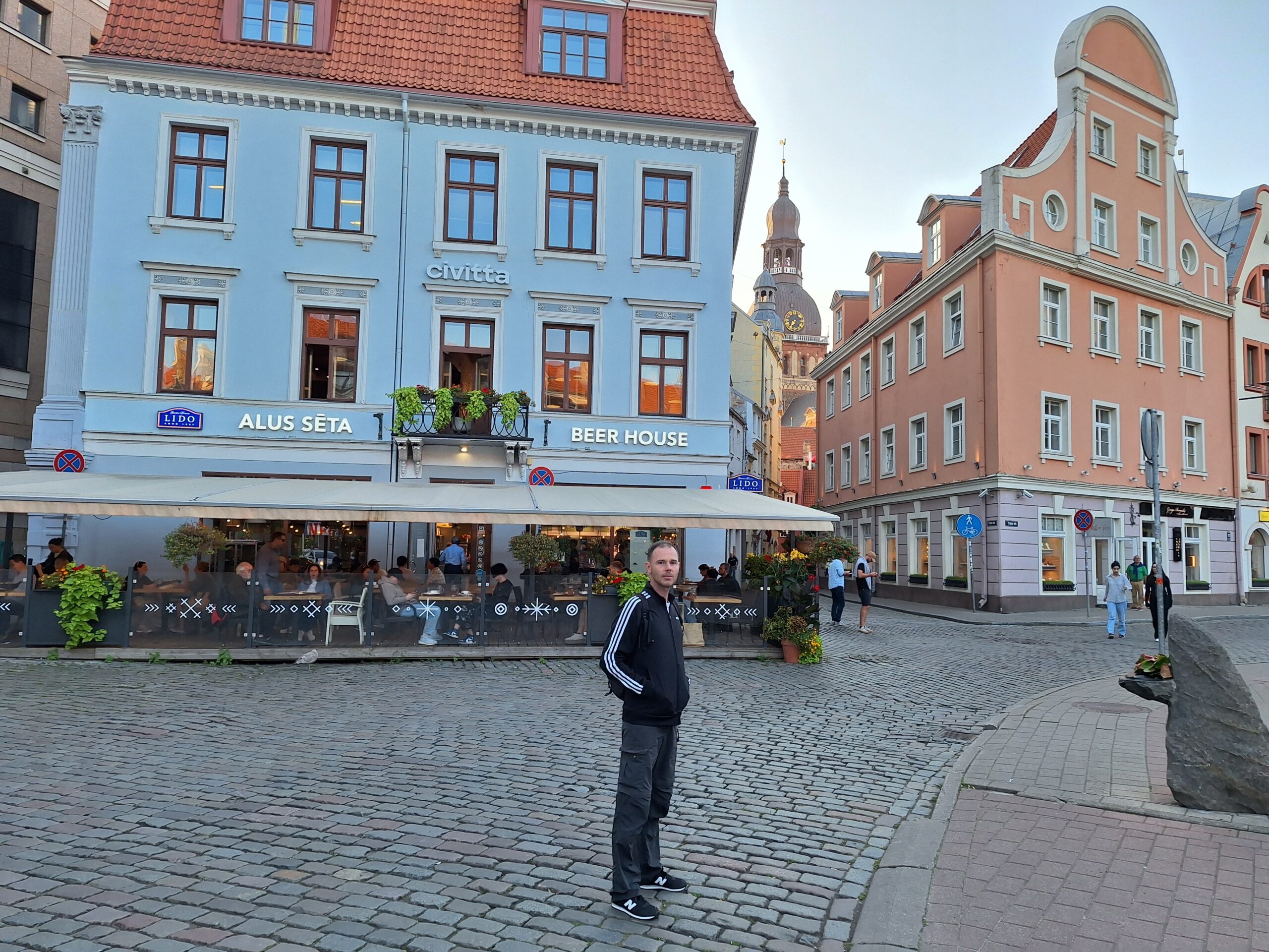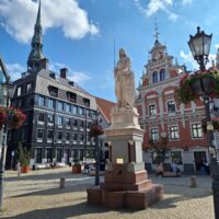 Po zjechaniu na dół udaliśmy się nad rzekę, by pospacerować w słońcu nowym deptakiem. Praktycznie brak ludzi, pojedyncze osoby spacerujące z psami. Ta część Rygi dopiero co została odnowiona. Trochę też się poopalaliśmy na ławeczce. Jest tutaj ładnie i czysto. Idąc dalej nad rzeką w kierunku zamku, doszliśmy do Rīgas Rātslaukums, czyli Placu Ratuszowego, przy którym stoi zabytkowy Dom Bractwa Czarnogłowych (łot. Melngalvju nams). To jeden z bardziej rozpoznawalnych budynków miasta, zbudowany w 1334 roku. Budynek ten stylem ten odzwierciedla ducha dawnej Hanzy.
