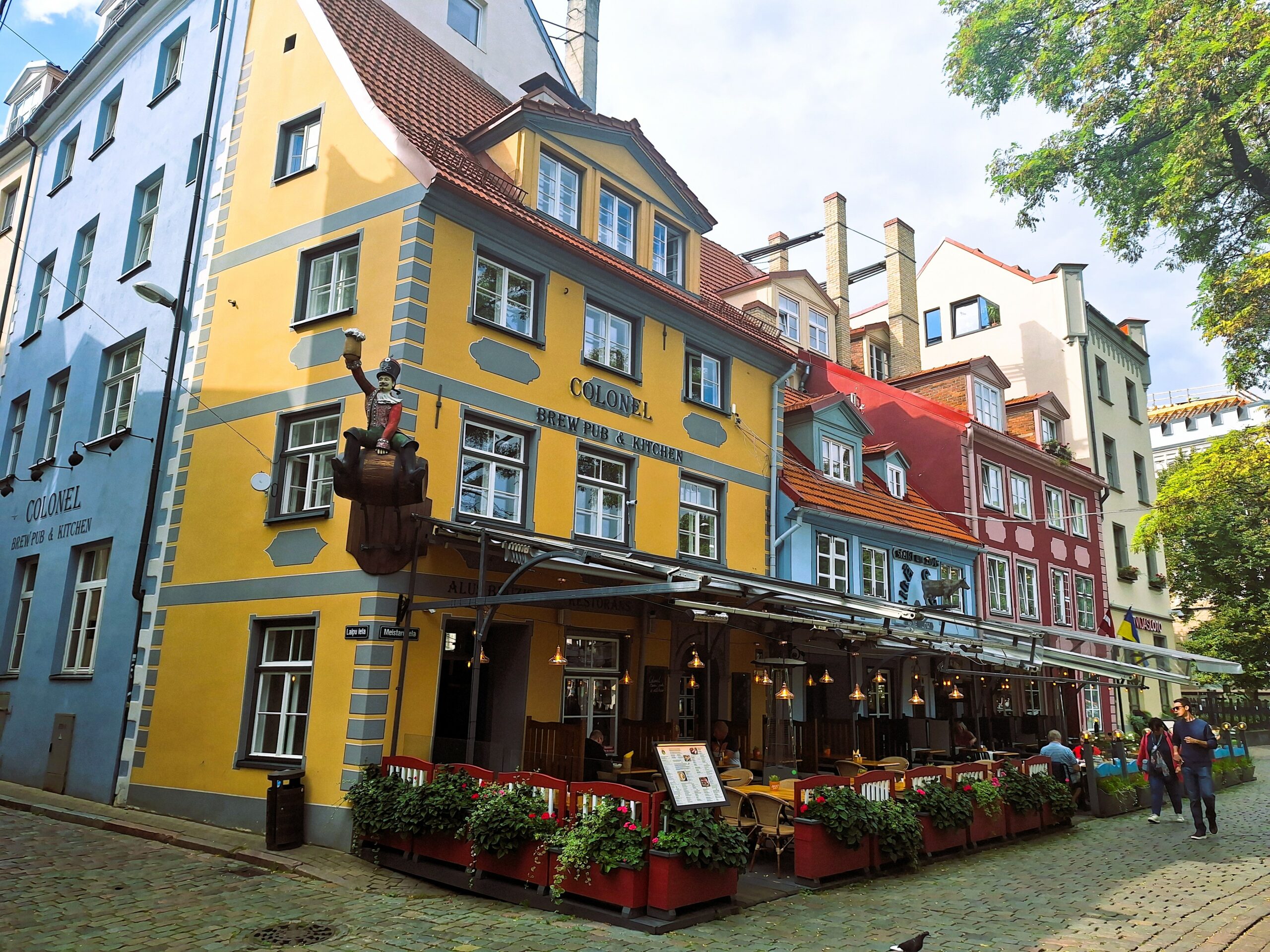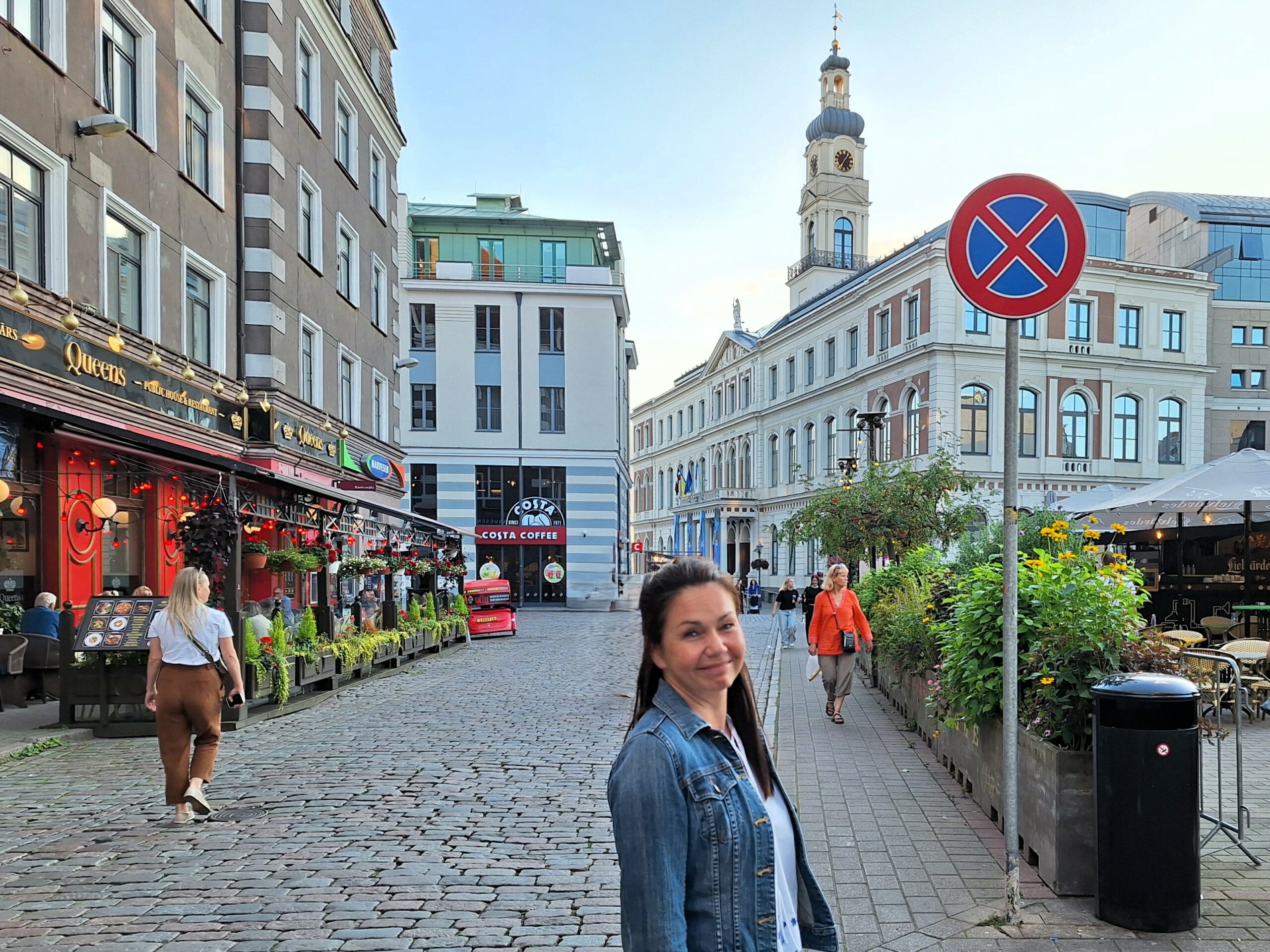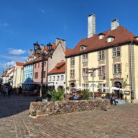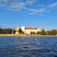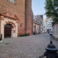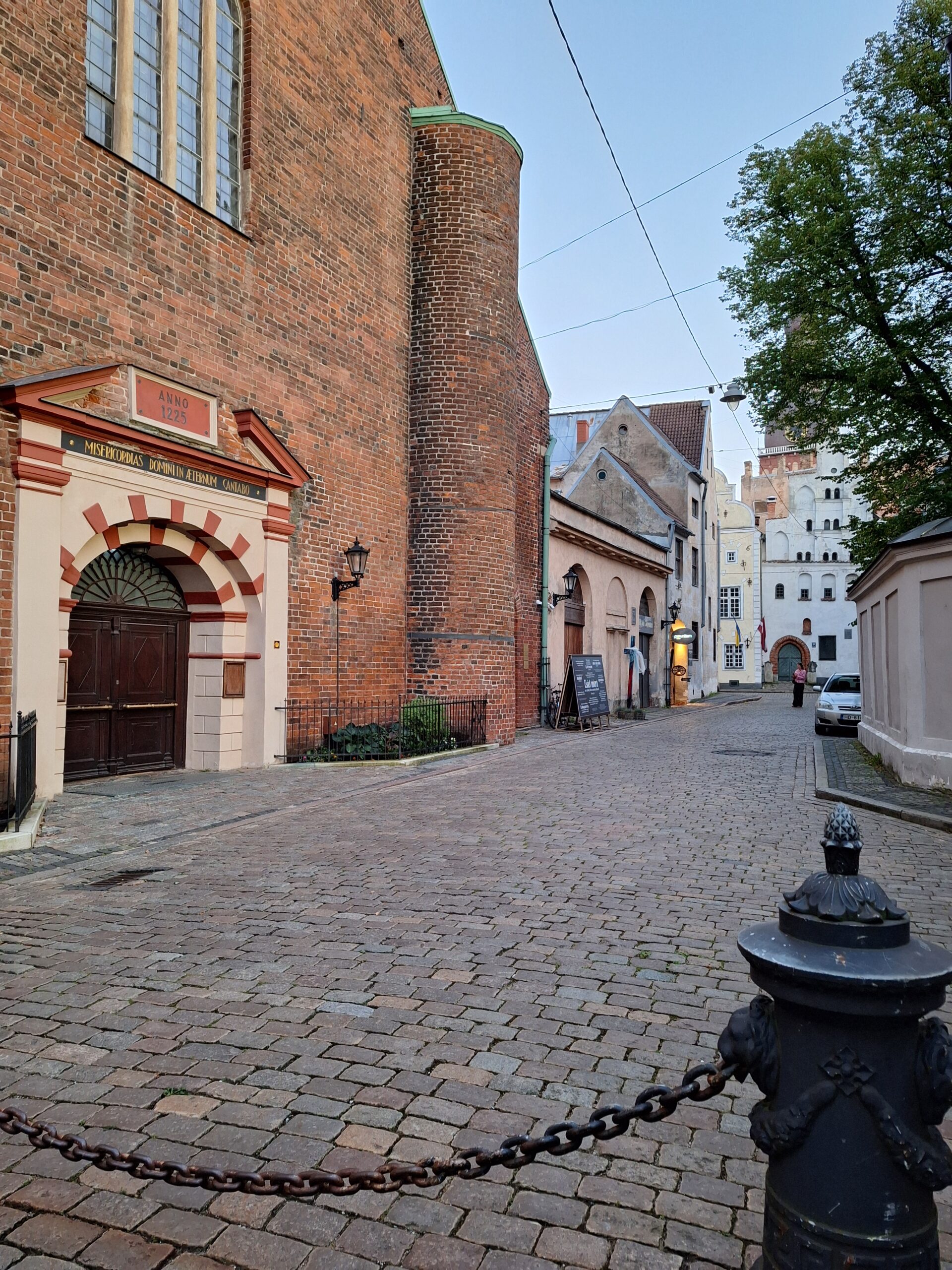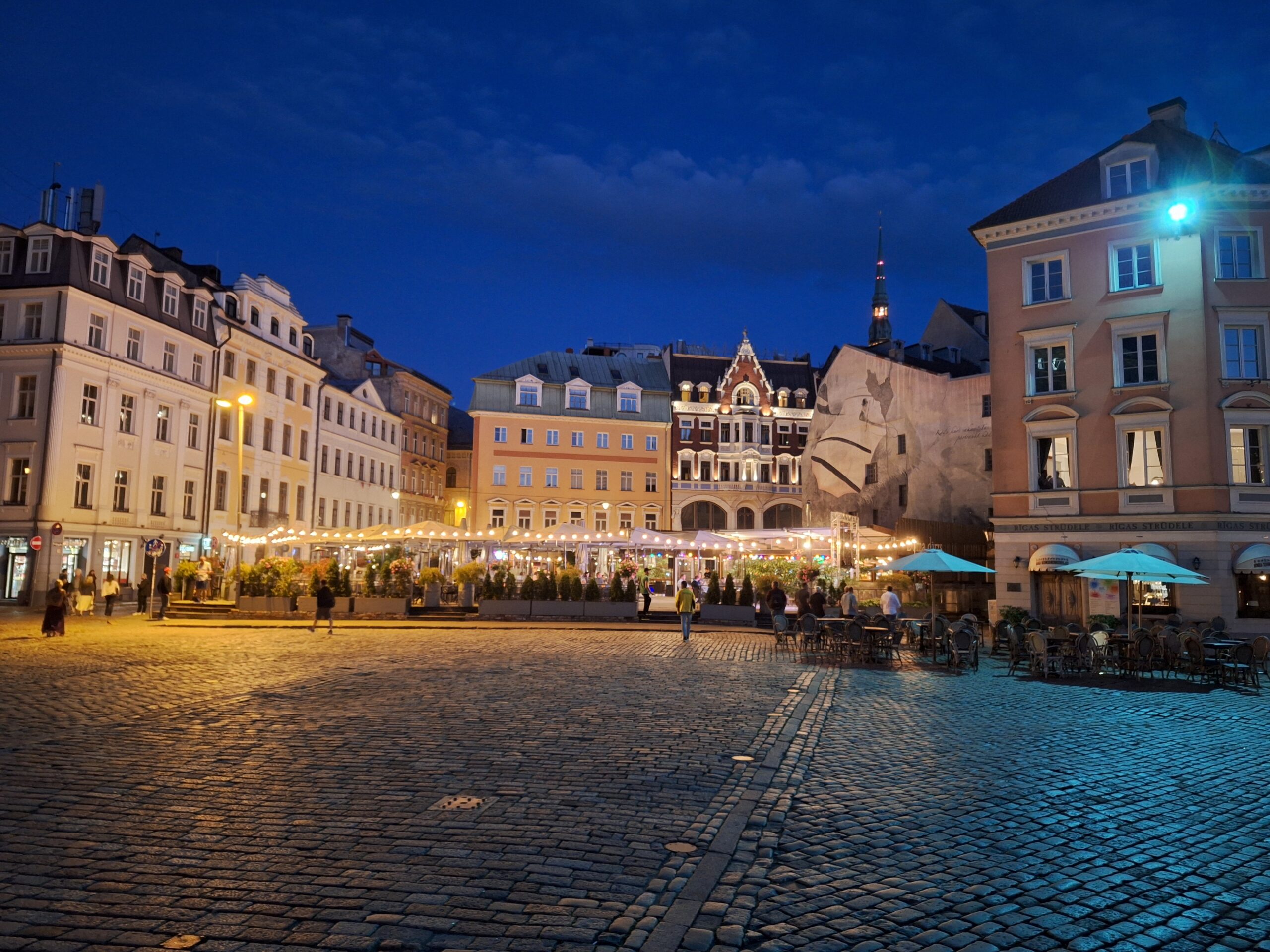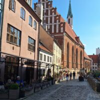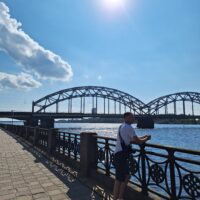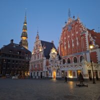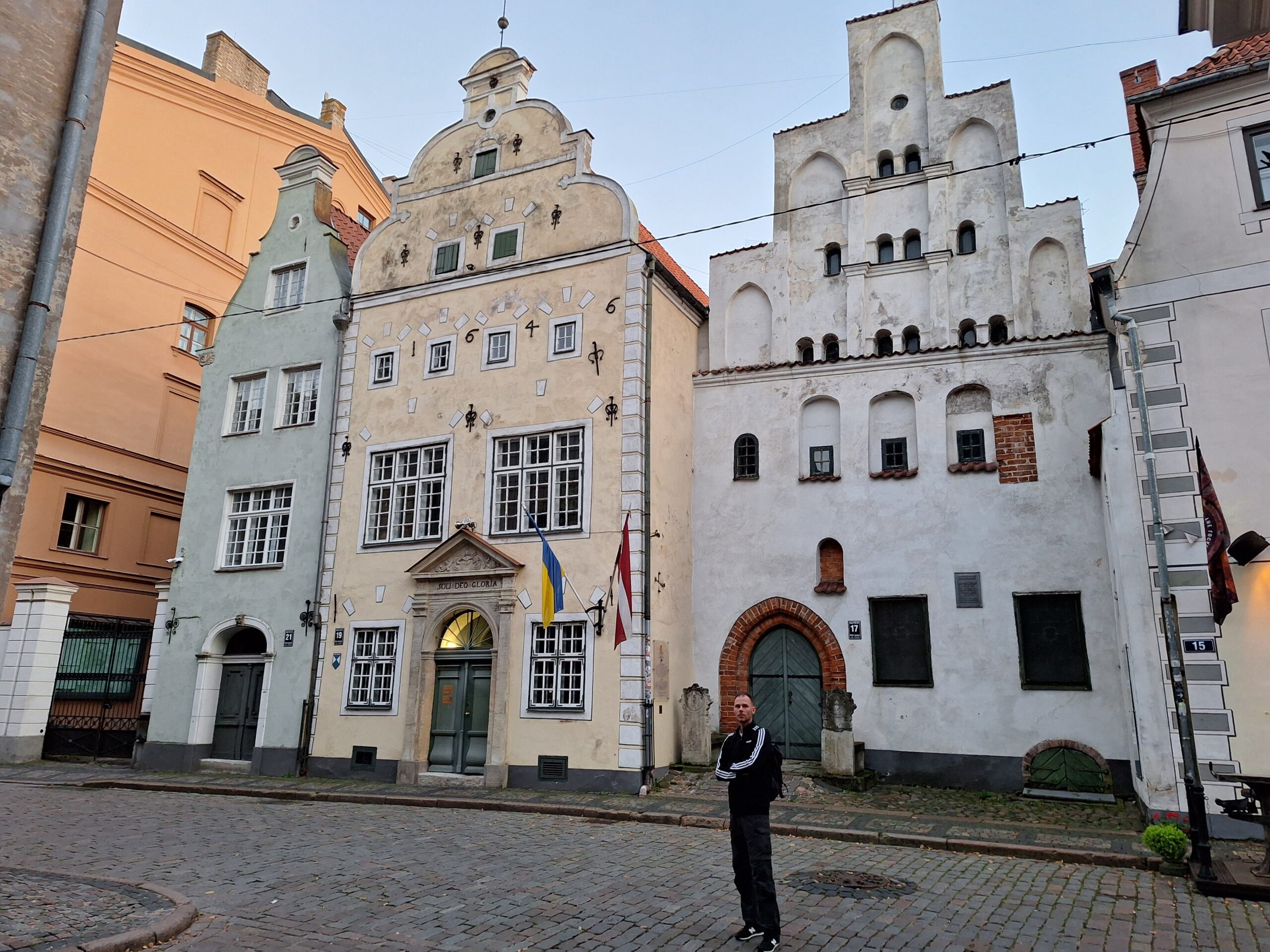 Po zjechaniu na dół udaliśmy się nad rzekę, by pospacerować w słońcu nowym deptakiem. Praktycznie brak ludzi, pojedyncze osoby spacerujące z psami. Ta część Rygi dopiero co została odnowiona. Trochę też się poopalaliśmy na ławeczce. Jest tutaj ładnie i czysto. Idąc dalej nad rzeką w kierunku zamku, doszliśmy do Rīgas Rātslaukums, czyli Placu Ratuszowego, przy którym stoi zabytkowy Dom Bractwa Czarnogłowych (łot. Melngalvju nams). To jeden z bardziej rozpoznawalnych budynków miasta, zbudowany w 1334 roku. Budynek ten stylem ten odzwierciedla ducha dawnej Hanzy.