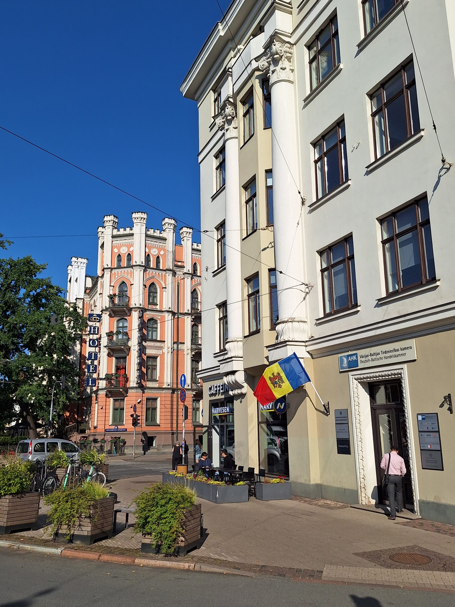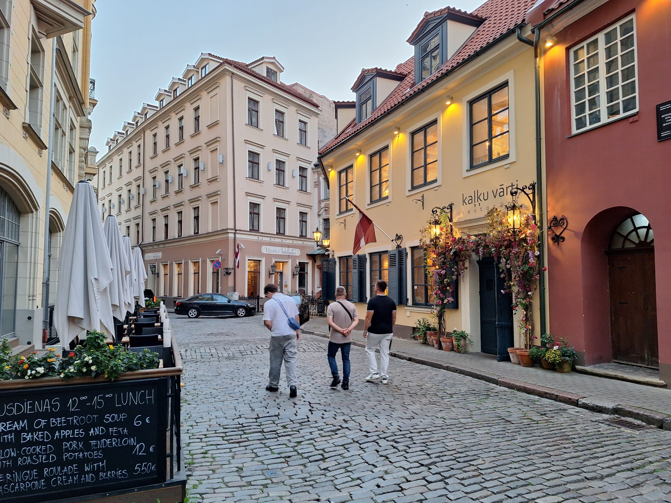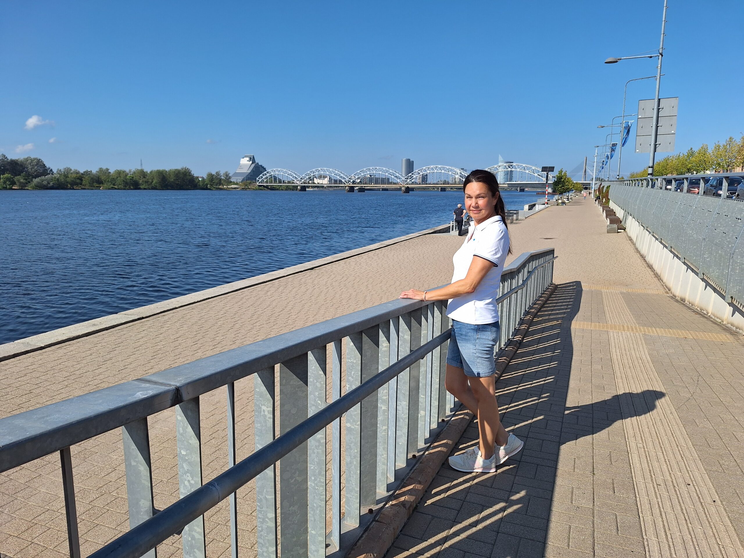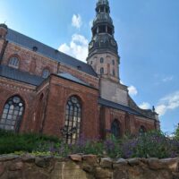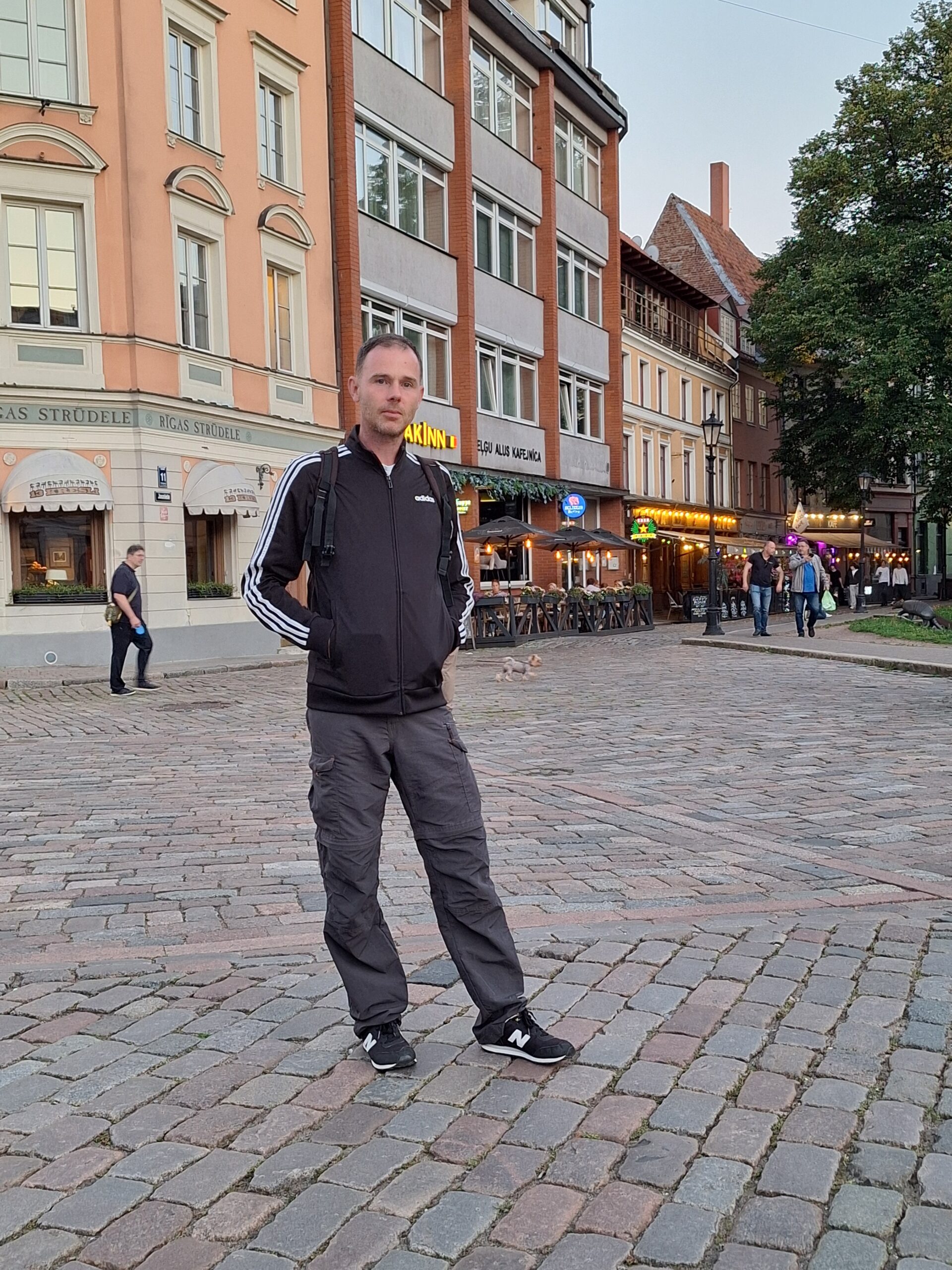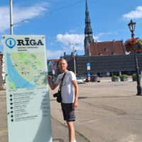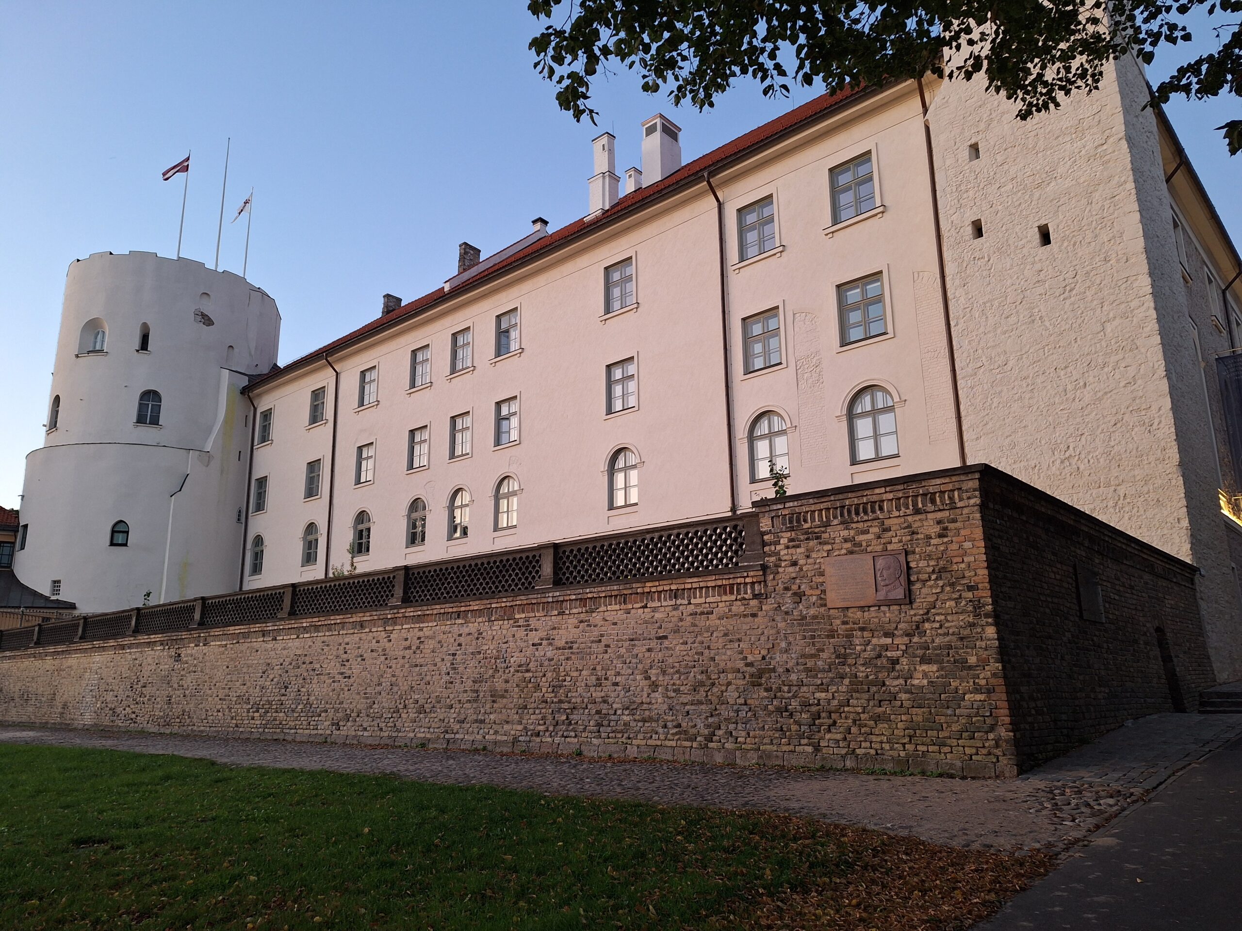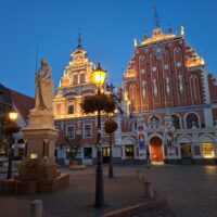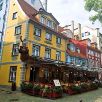 Po zjechaniu na dół udaliśmy się nad rzekę, by pospacerować w słońcu nowym deptakiem. Praktycznie brak ludzi, pojedyncze osoby spacerujące z psami. Ta część Rygi dopiero co została odnowiona. Trochę też się poopalaliśmy na ławeczce. Jest tutaj ładnie i czysto. Idąc dalej nad rzeką w kierunku zamku, doszliśmy do Rīgas Rātslaukums, czyli Placu Ratuszowego, przy którym stoi zabytkowy Dom Bractwa Czarnogłowych (łot. Melngalvju nams). To jeden z bardziej rozpoznawalnych budynków miasta, zbudowany w 1334 roku. Budynek ten stylem ten odzwierciedla ducha dawnej Hanzy.