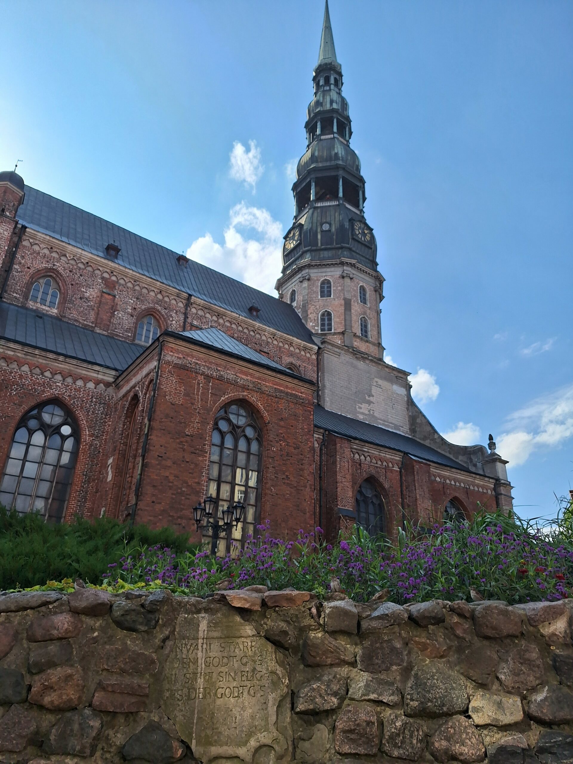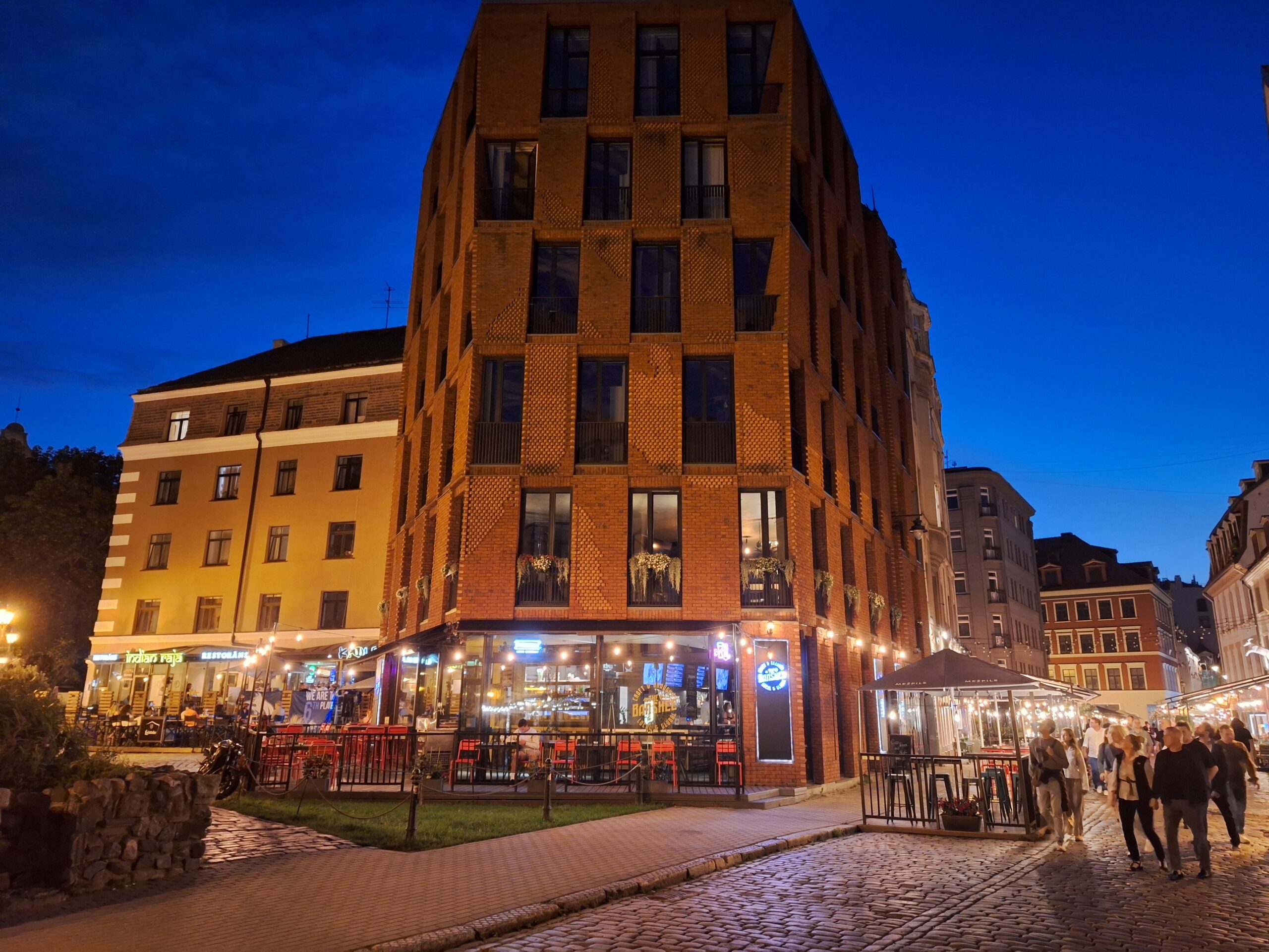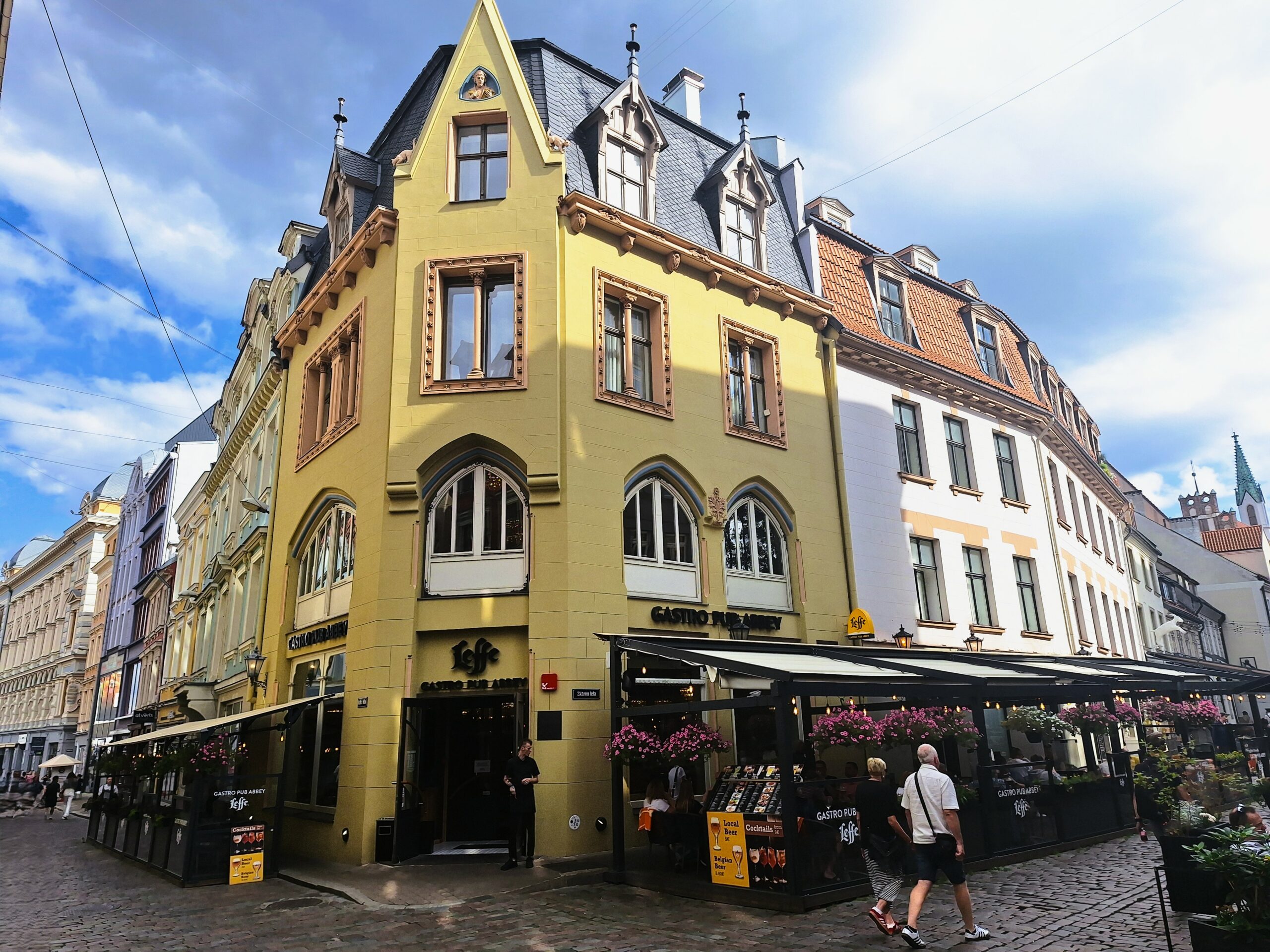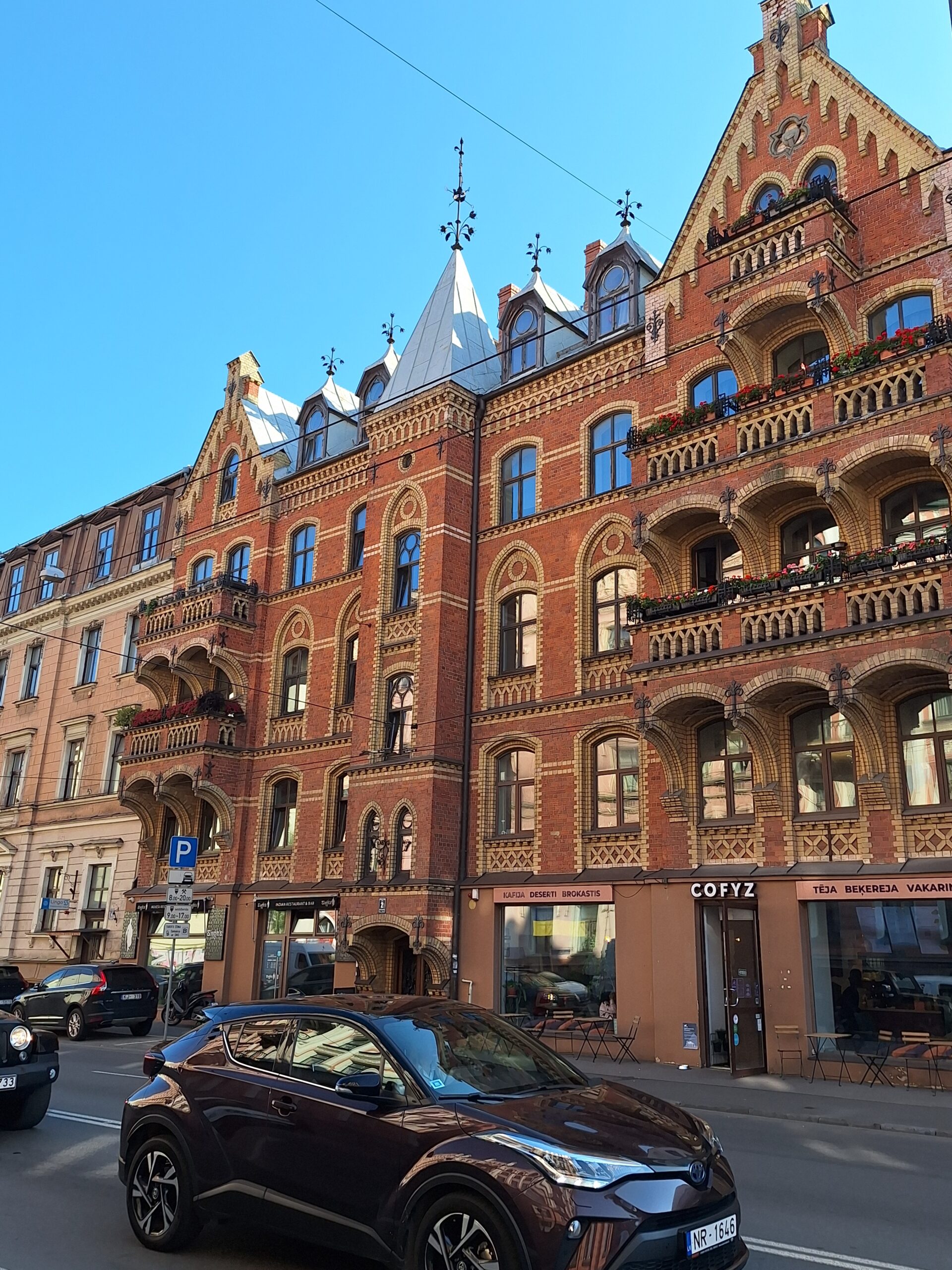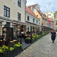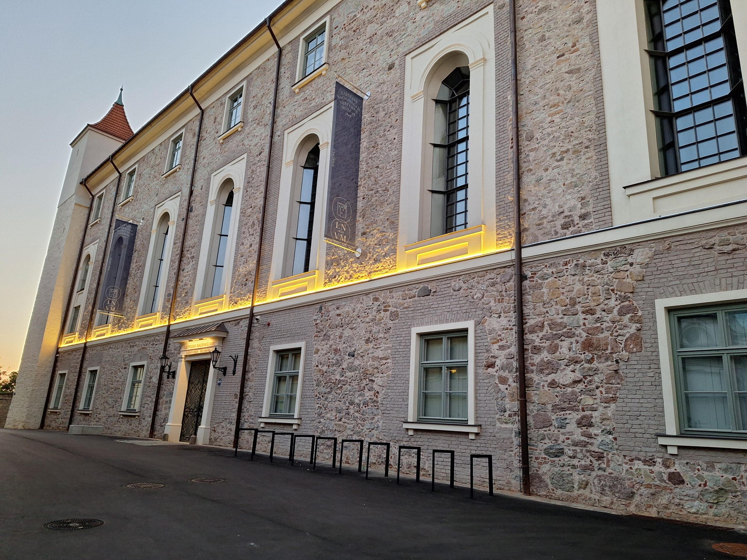 Po zjechaniu na dół udaliśmy się nad rzekę, by pospacerować w słońcu nowym deptakiem. Praktycznie brak ludzi, pojedyncze osoby spacerujące z psami. Ta część Rygi dopiero co została odnowiona. Trochę też się poopalaliśmy na ławeczce. Jest tutaj ładnie i czysto. Idąc dalej nad rzeką w kierunku zamku, doszliśmy do Rīgas Rātslaukums, czyli Placu Ratuszowego, przy którym stoi zabytkowy Dom Bractwa Czarnogłowych (łot. Melngalvju nams). To jeden z bardziej rozpoznawalnych budynków miasta, zbudowany w 1334 roku. Budynek ten stylem ten odzwierciedla ducha dawnej Hanzy.