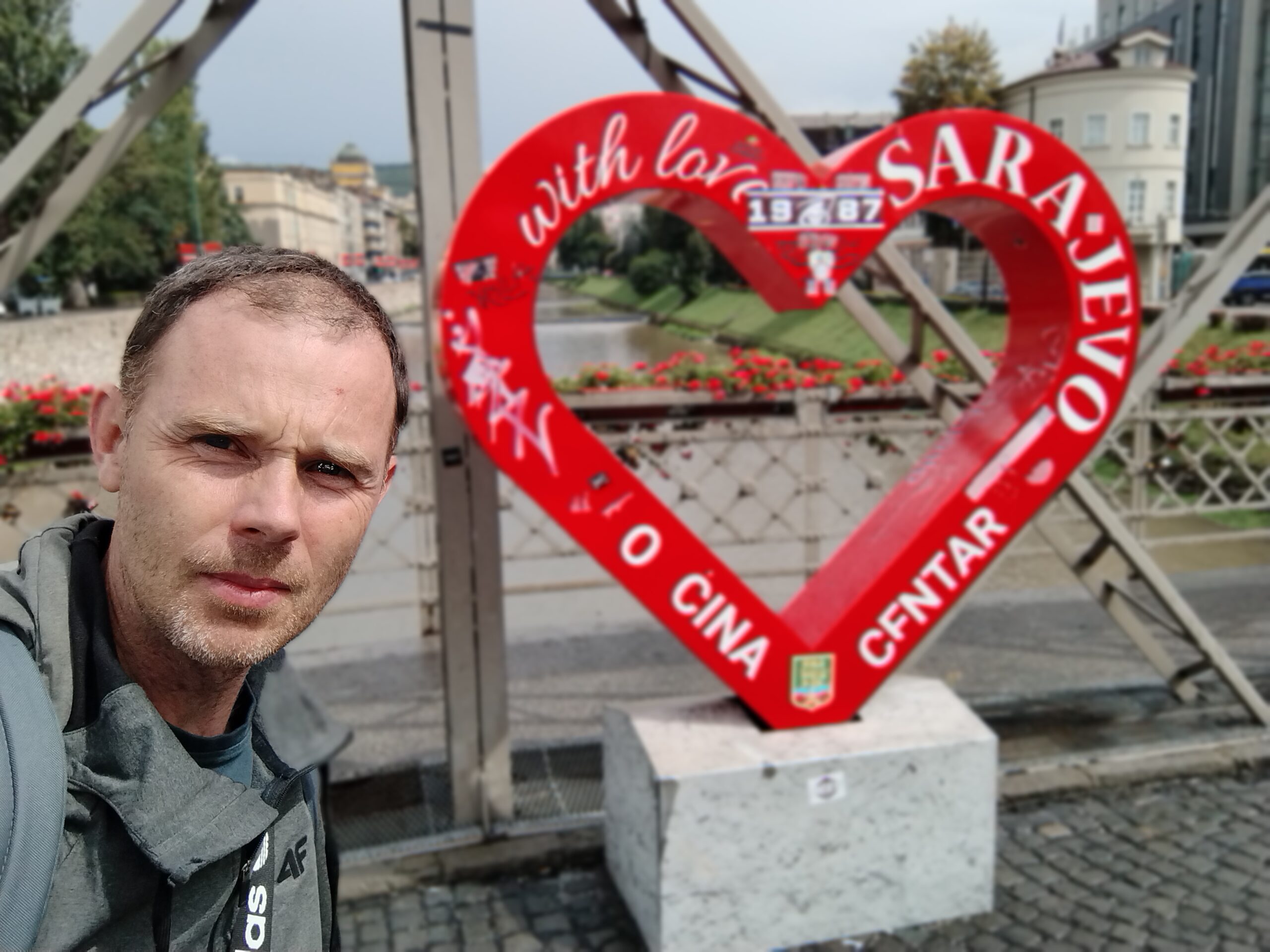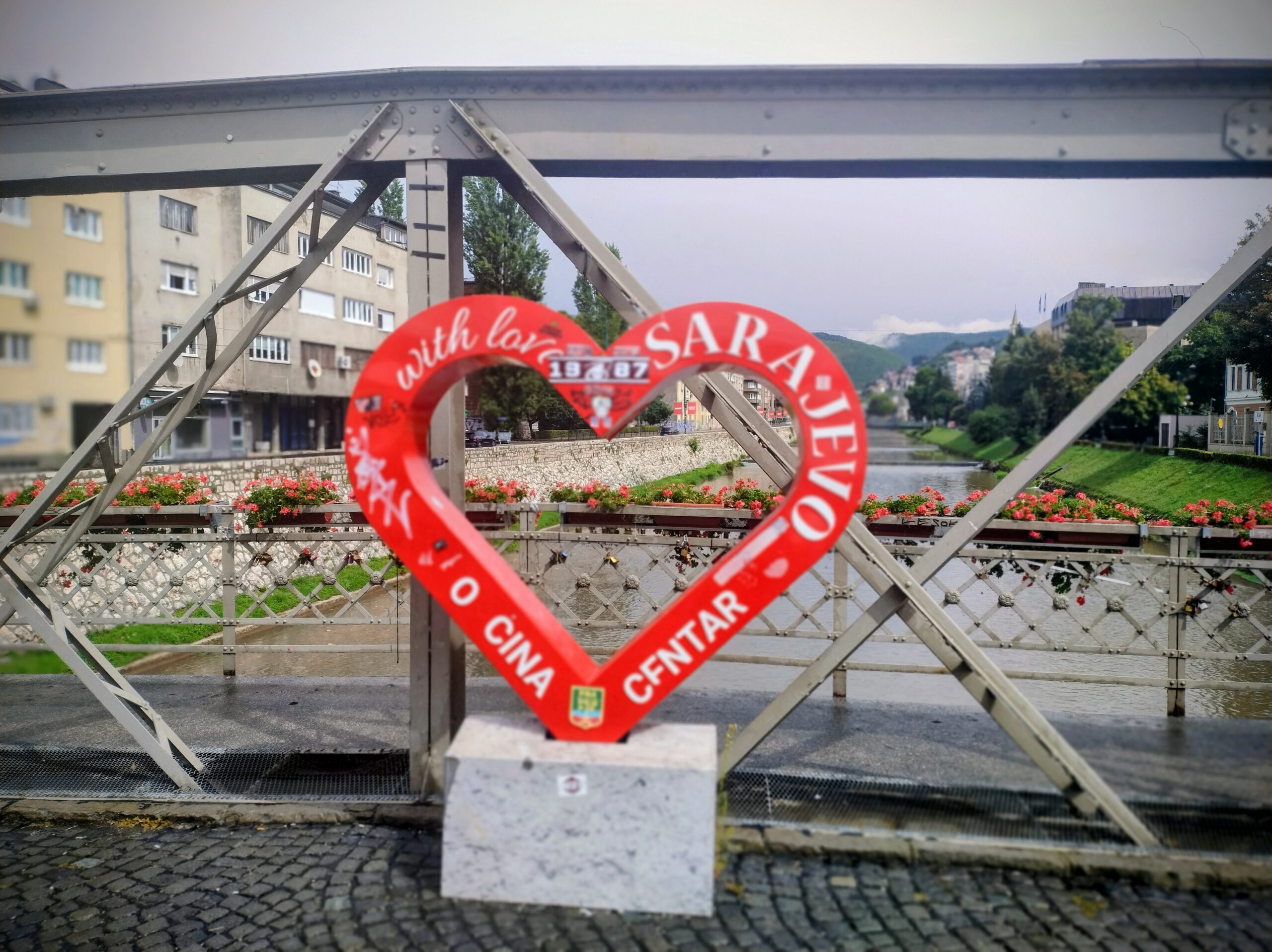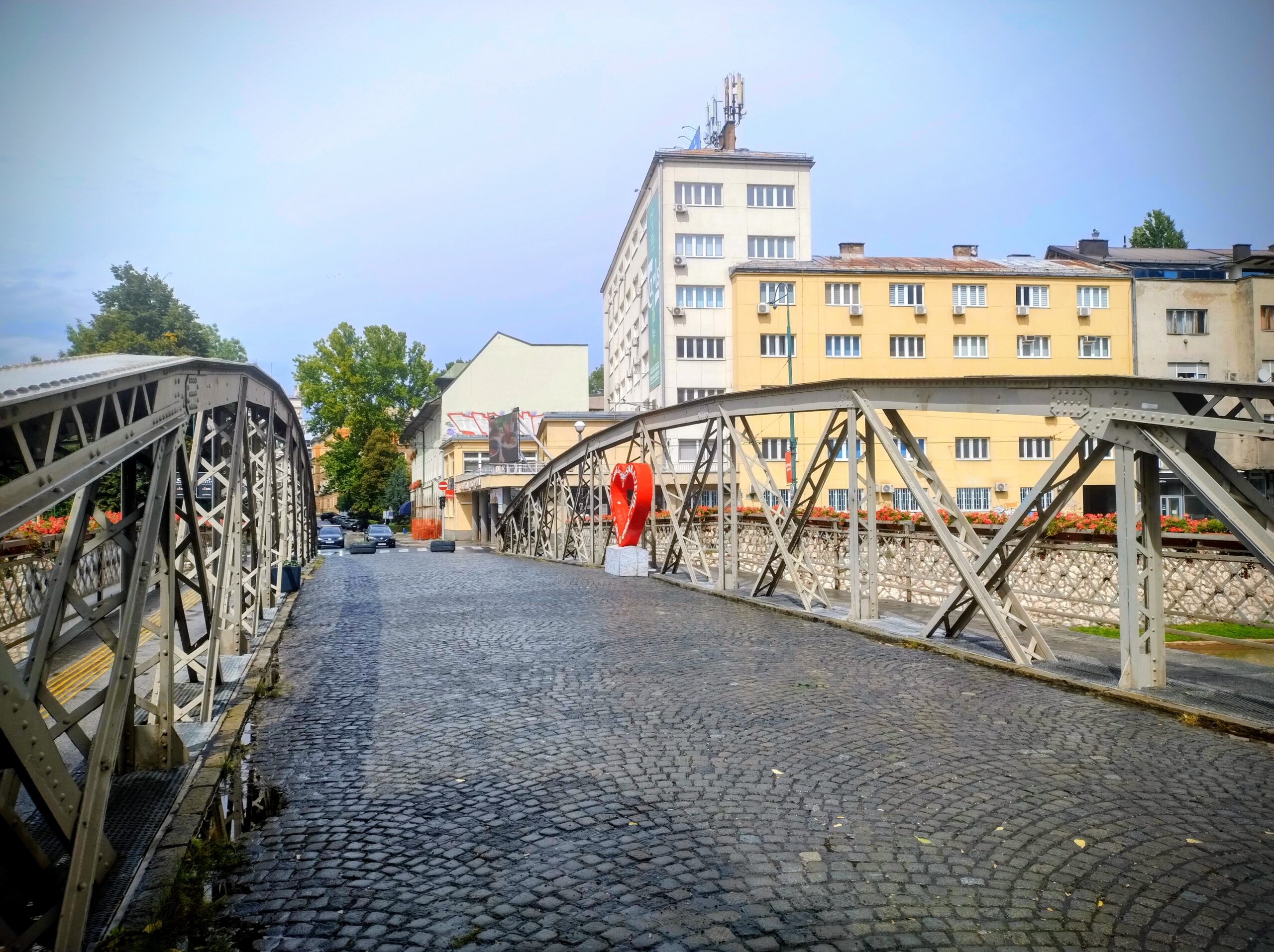 Do centrum trolejbusem jechałem niecałe 25min. Po mieście kursują nowoczesne czyste składy elektryczne. Wysiadłem koło mostu Hamze Hume, który jest przerzucony nad rzeką Miljacka. Tuż obok znajduje się inny most dla ruchu pieszego Tabla Eiffelov Most. Inaczej też nazywany Żelaznym Mostem. Zbudowany został w 1893r. Mieszkańcy wierzą że zaprojektował go sam słynny Gustav Eiffel, ale nie ma na to dowodów. Most został uszkodzony podczas wojny w Bośni, ale odrestaurowano go.