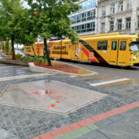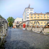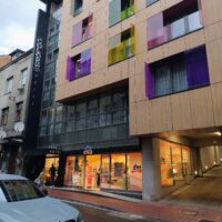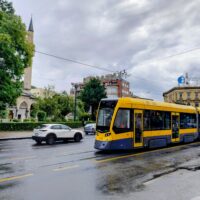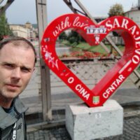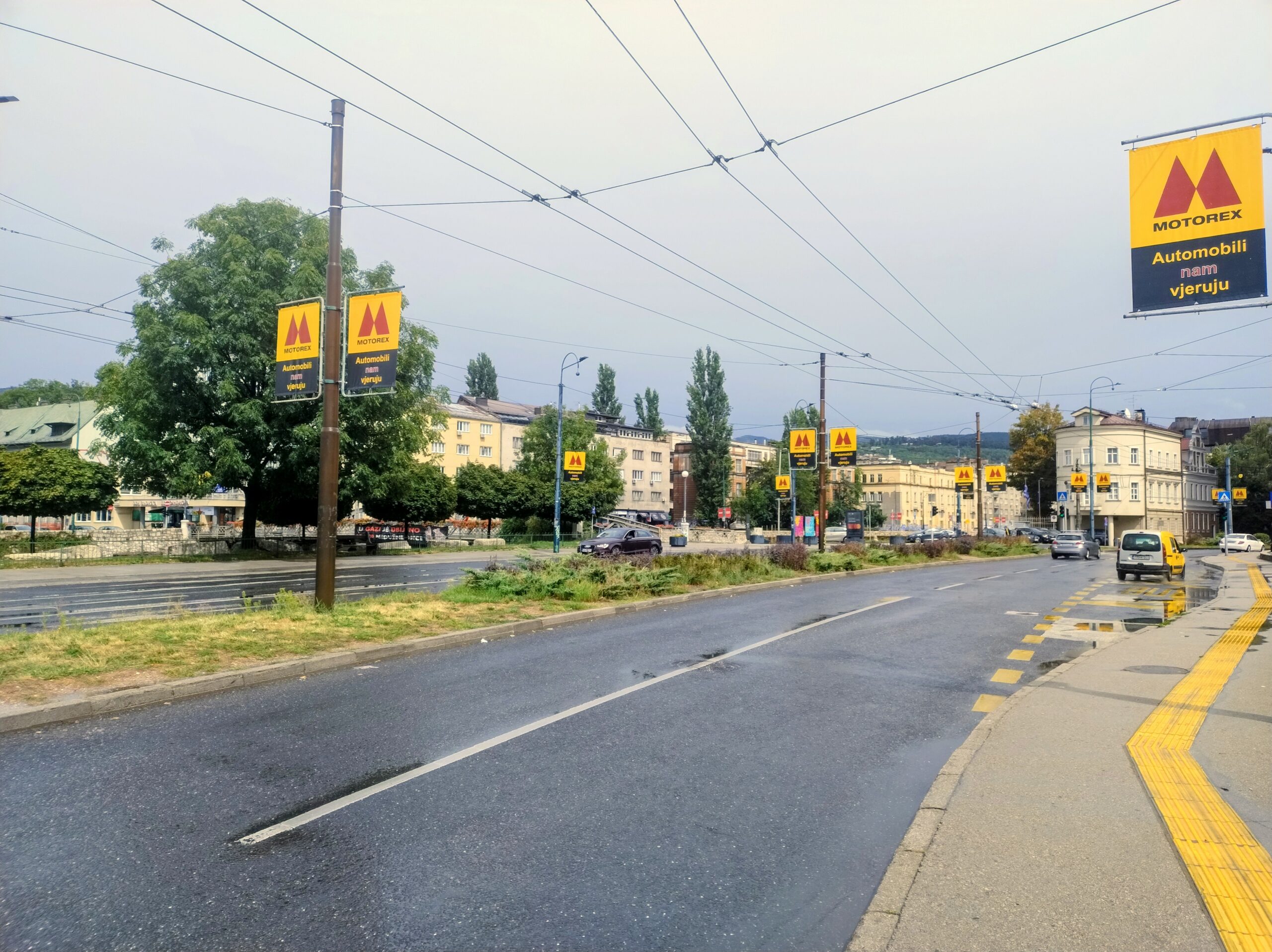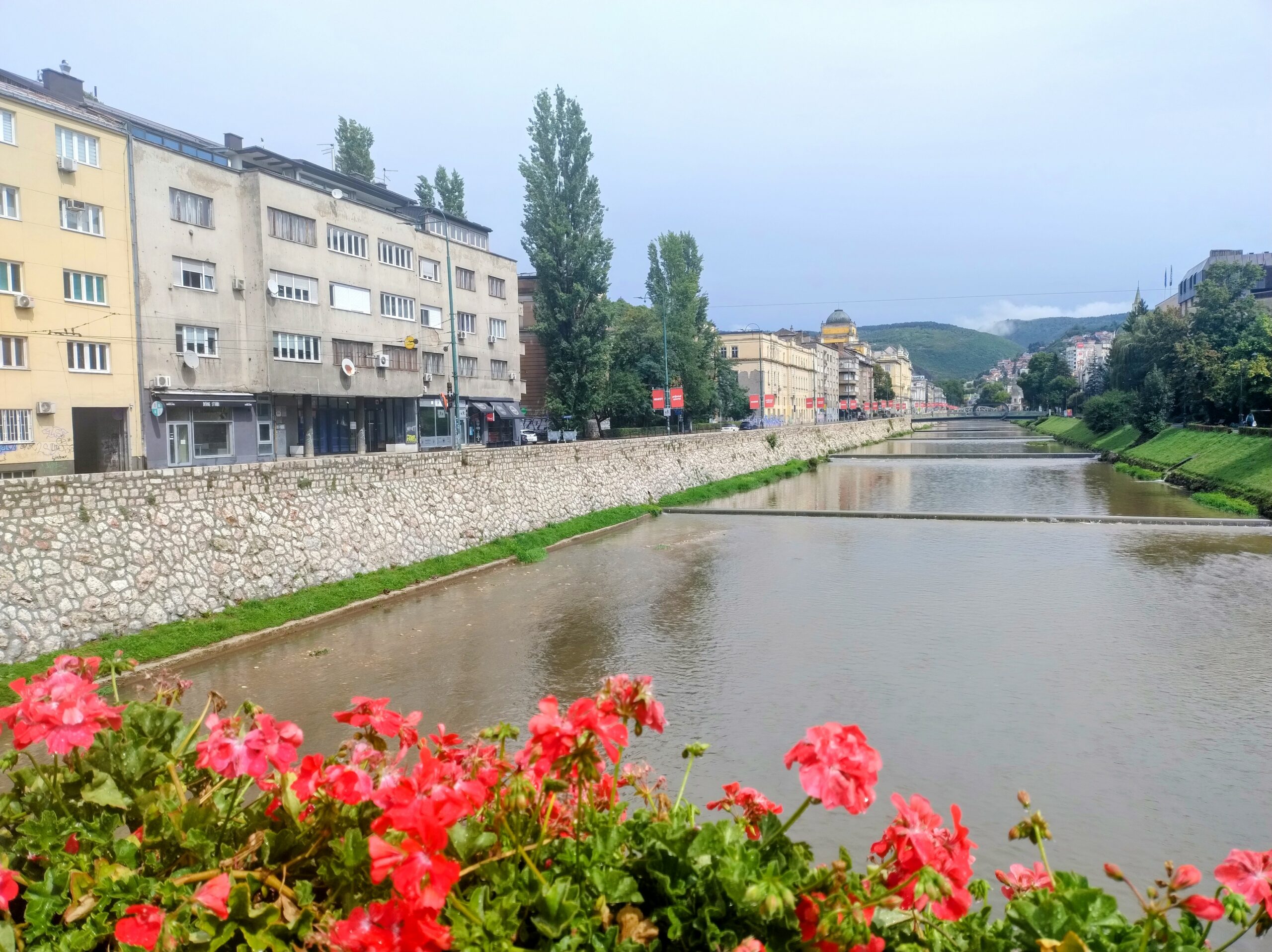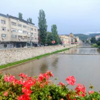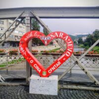 Do centrum trolejbusem jechałem niecałe 25min. Po mieście kursują nowoczesne czyste składy elektryczne. Wysiadłem koło mostu Hamze Hume, który jest przerzucony nad rzeką Miljacka. Tuż obok znajduje się inny most dla ruchu pieszego Tabla Eiffelov Most. Inaczej też nazywany Żelaznym Mostem. Zbudowany został w 1893r. Mieszkańcy wierzą że zaprojektował go sam słynny Gustav Eiffel, ale nie ma na to dowodów. Most został uszkodzony podczas wojny w Bośni, ale odrestaurowano go.