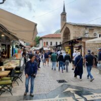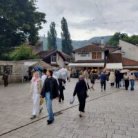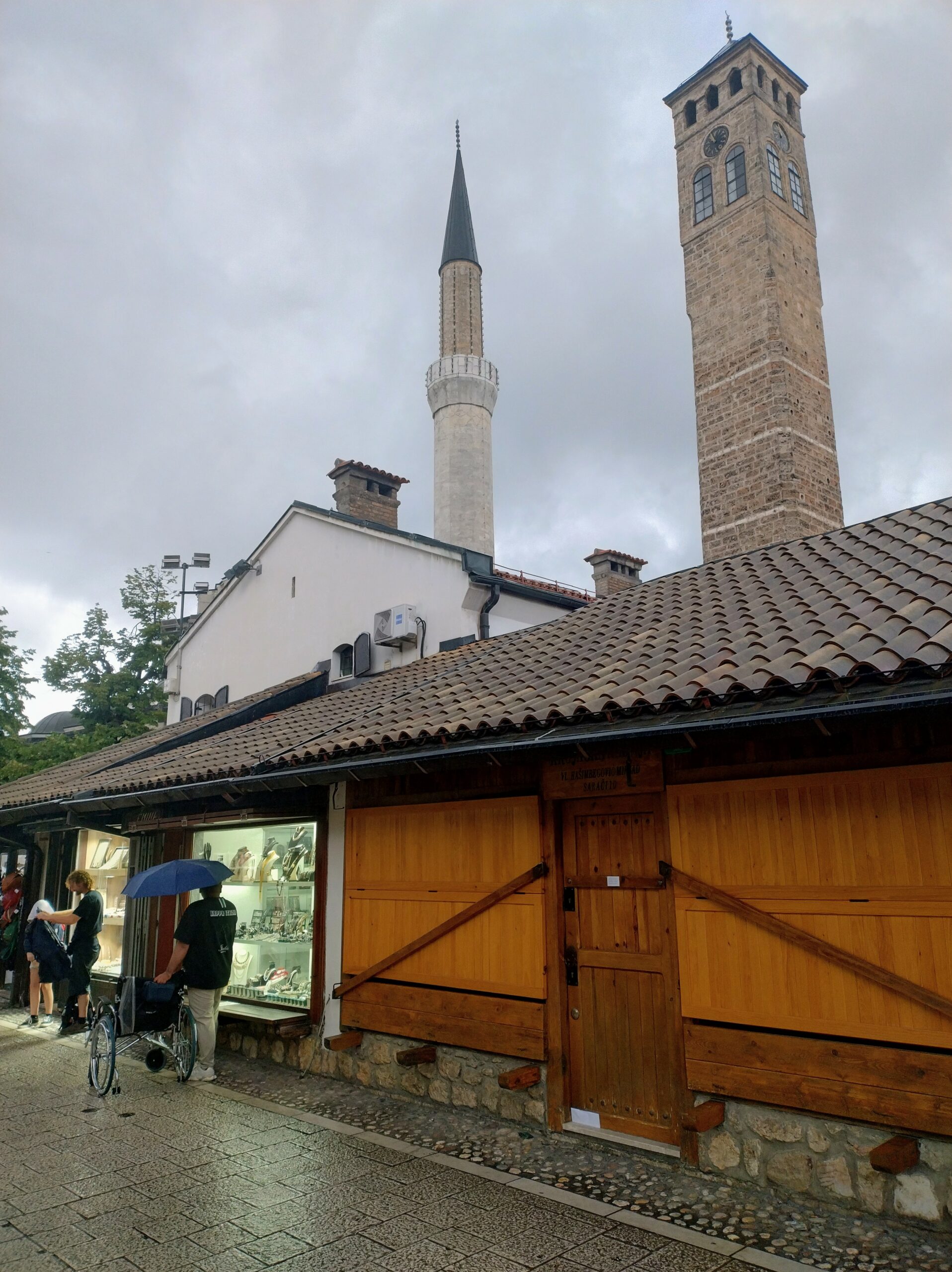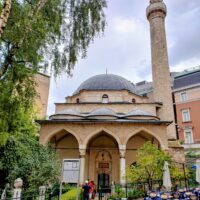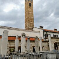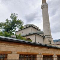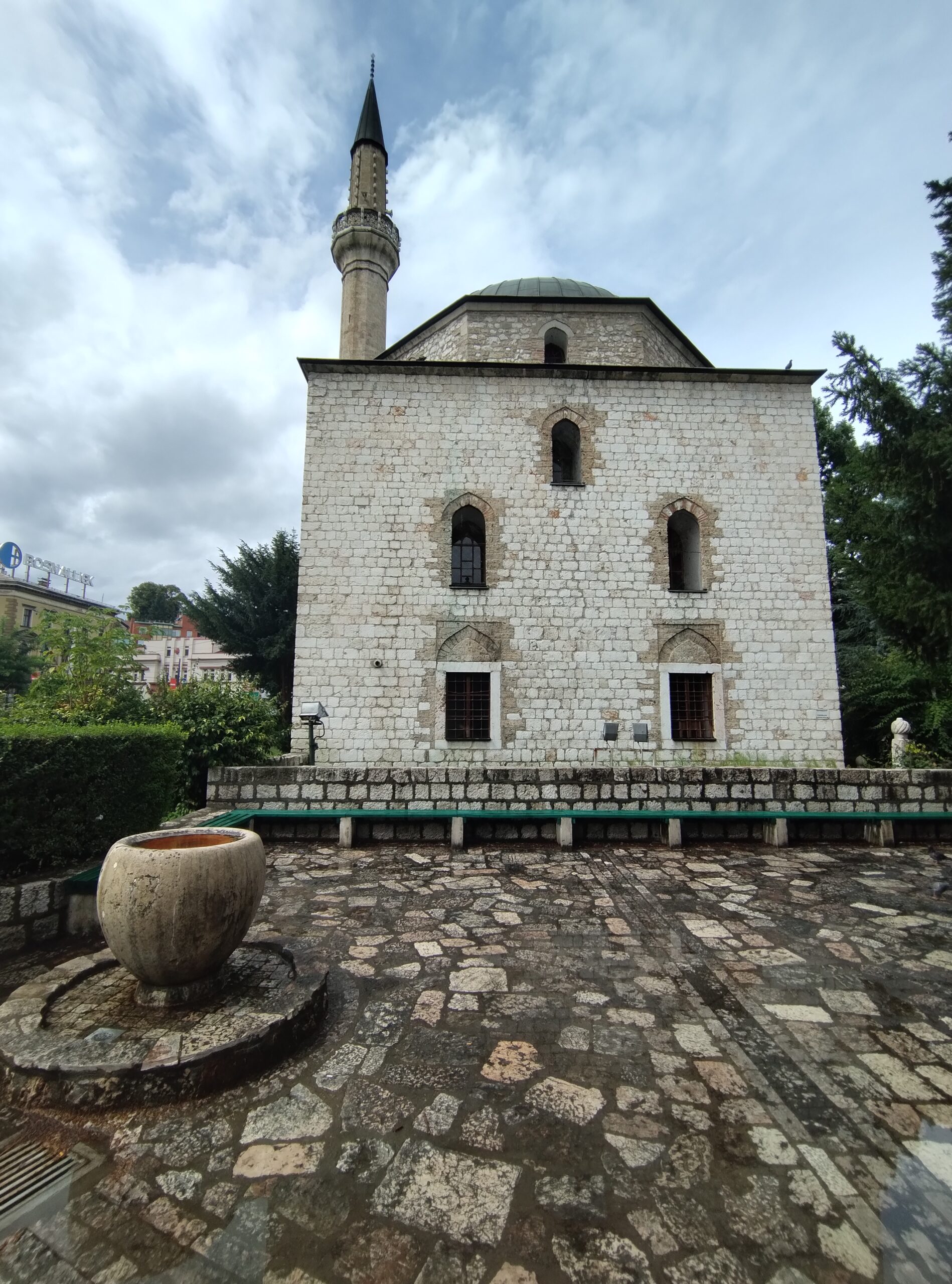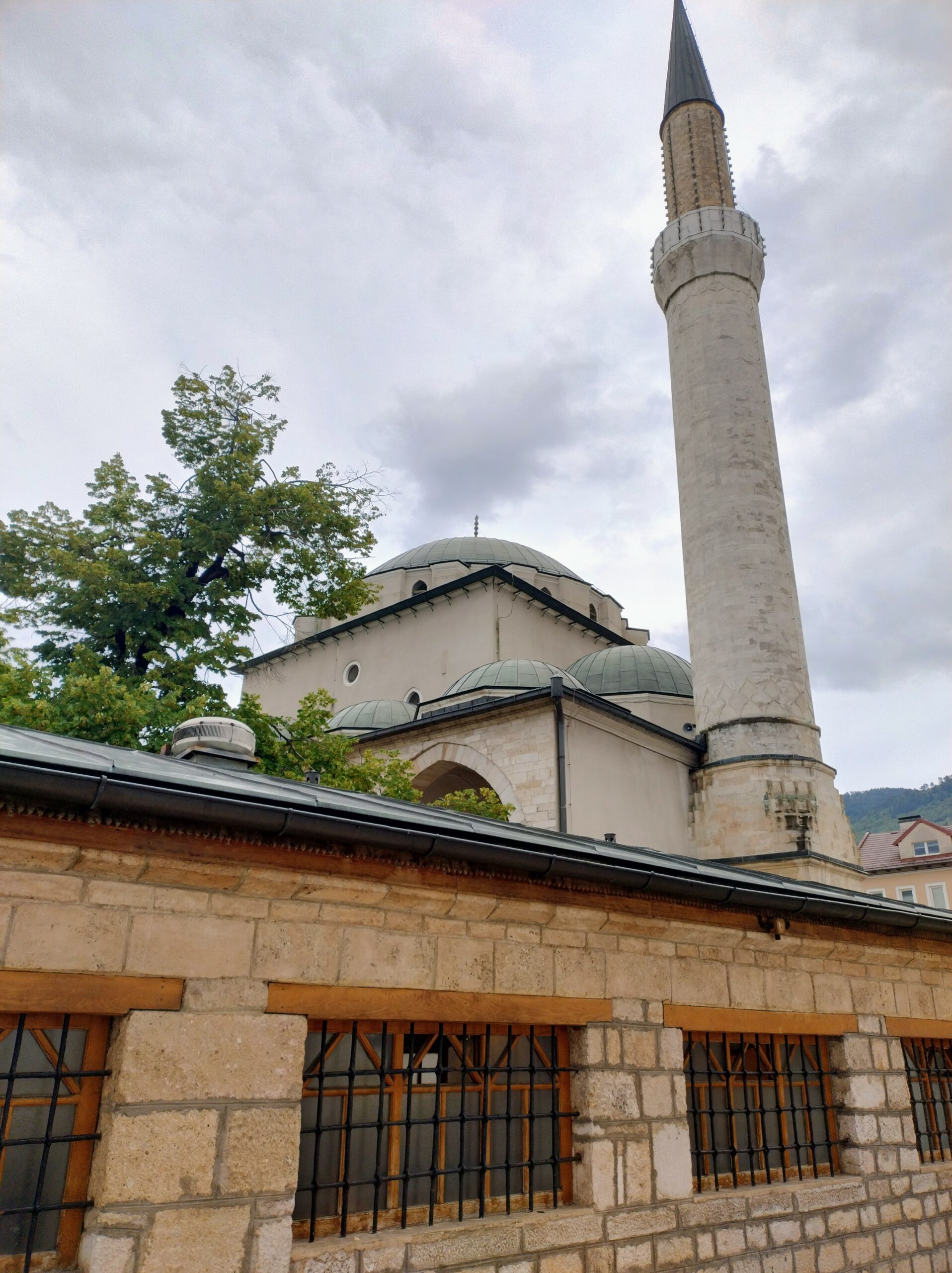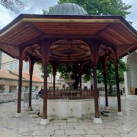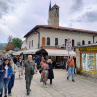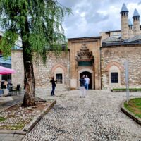 Centrum starego miasta zaczyna się mniej więcej w okolicy wieży zegarowej Sahat-kula. Stoi ona po przeciwnej stronie dużego meczetu Gazi Husrev-begova džamija z 1532r. Głównego ośrodka muzułmańskiego w kraju. Dalej niestety nie doszedłem, bo znowu zaczęło padać. Wróciłem więc szybkim krokiem do hotelu. A kolację zjadłem w hotelowej restauracji.
