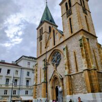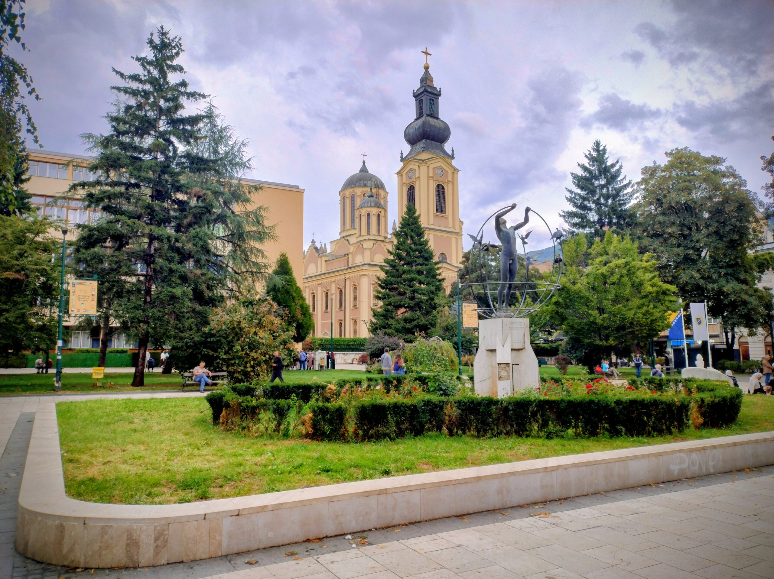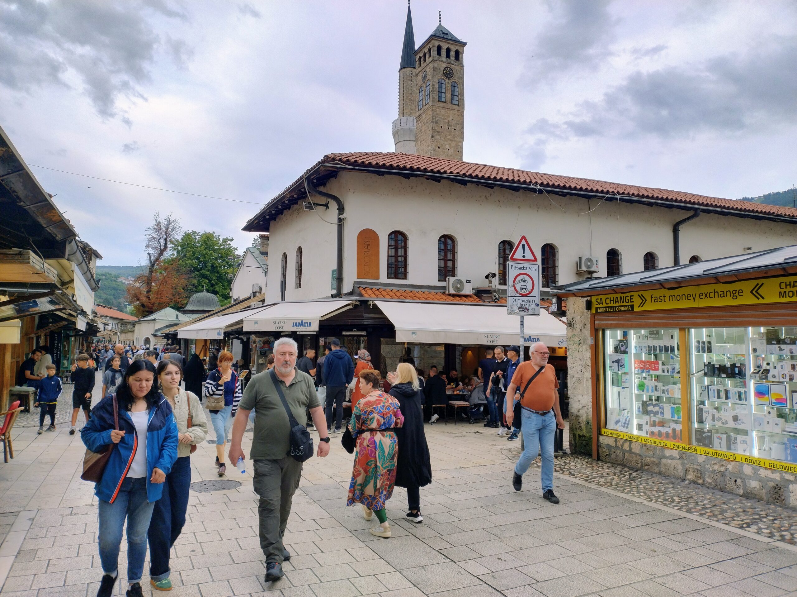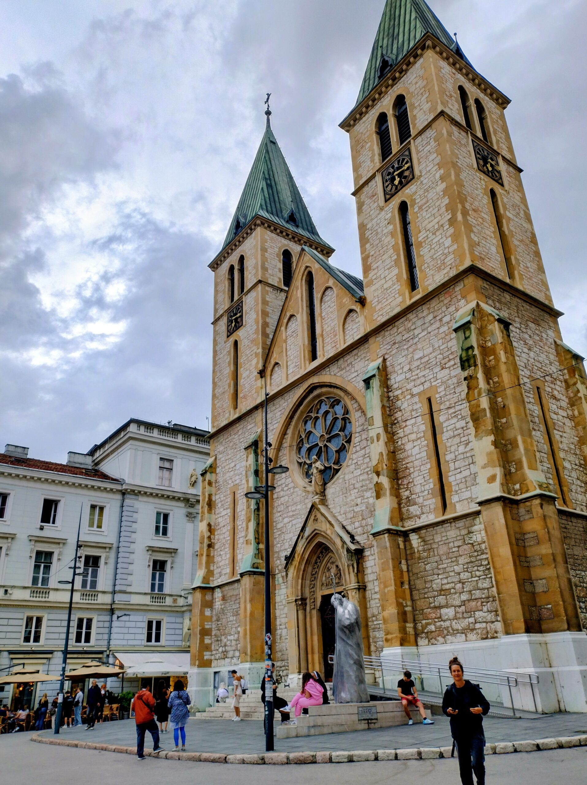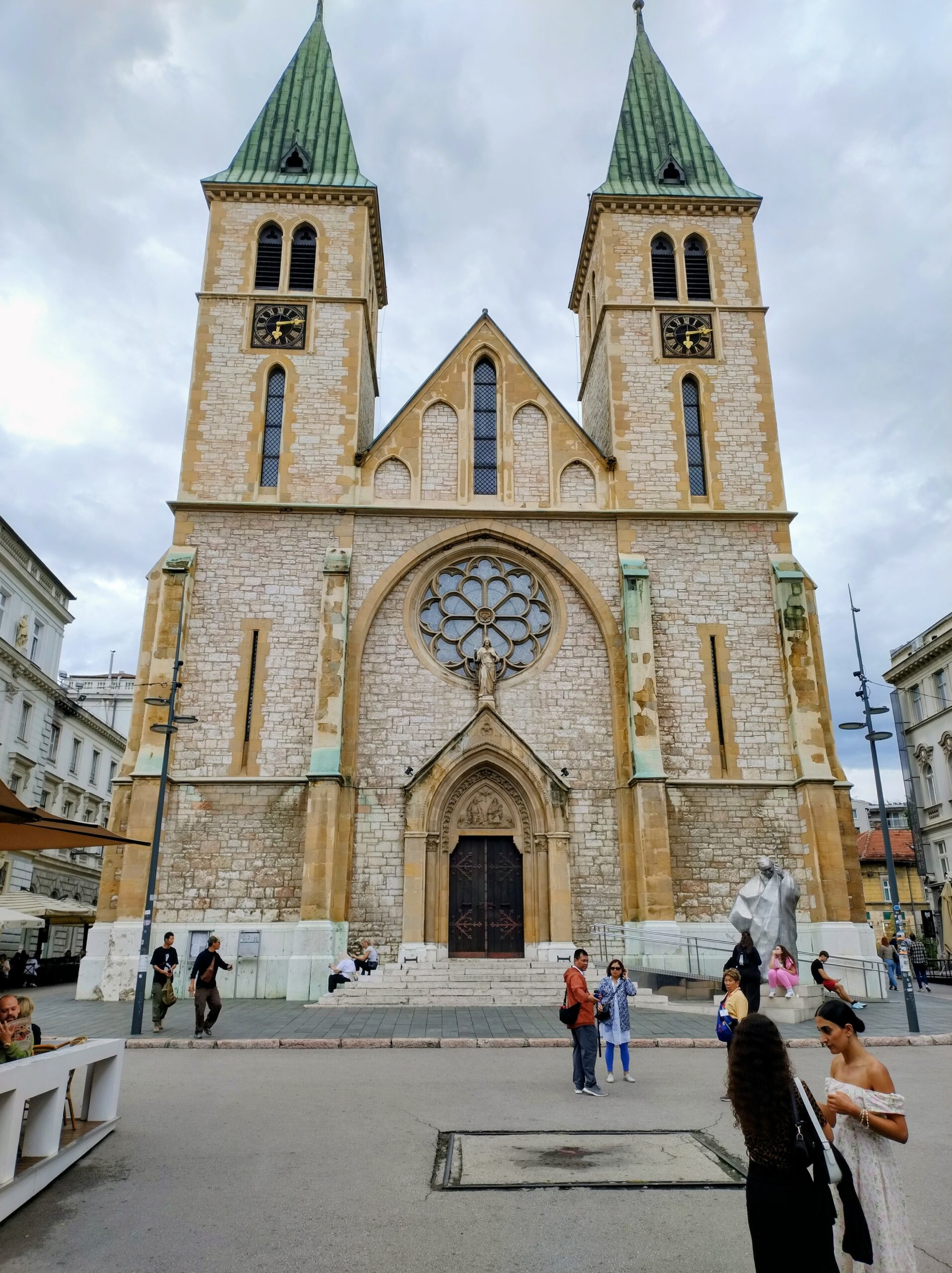 Od tego miejsca odchodzi ulica Ferhadija, która jest wyłączona z ruchu kołowego, i jest jednym z głównych ulic spacerowych Sarajeva. Na małym placu Trg Fra Grge Martića stoi katolicka gotycka Katedrala Srca Isusova z XIXw. A przed nią stoi pomnik naszego papieża Jana Pawła II. Kawałek dalej przy tej samej ulicy nieco na uboczu jest meczet Ferhadija džamija. I to co się od razu rzuca w oczy w tym mieście to tolerancja wyznaniowa.