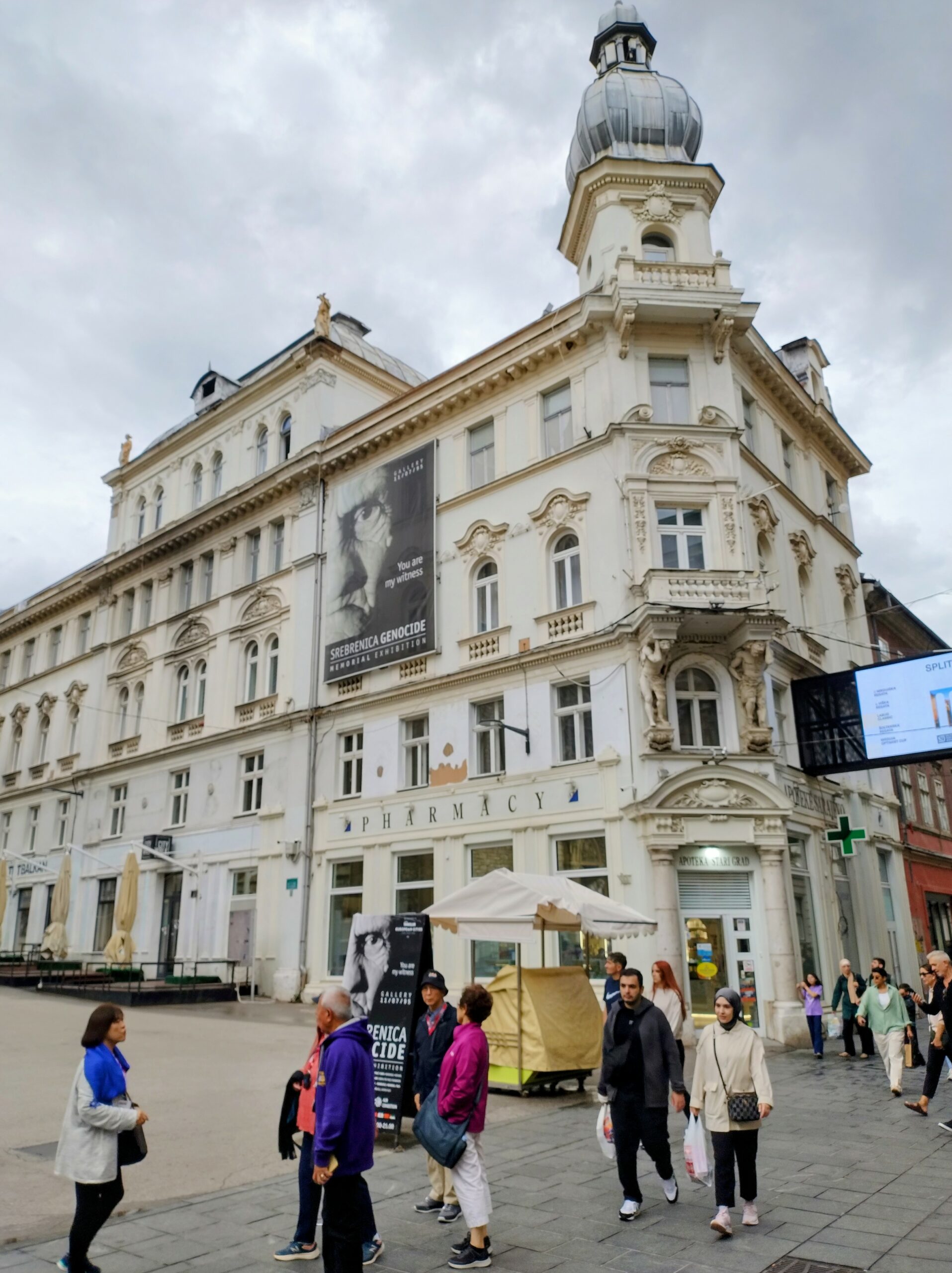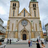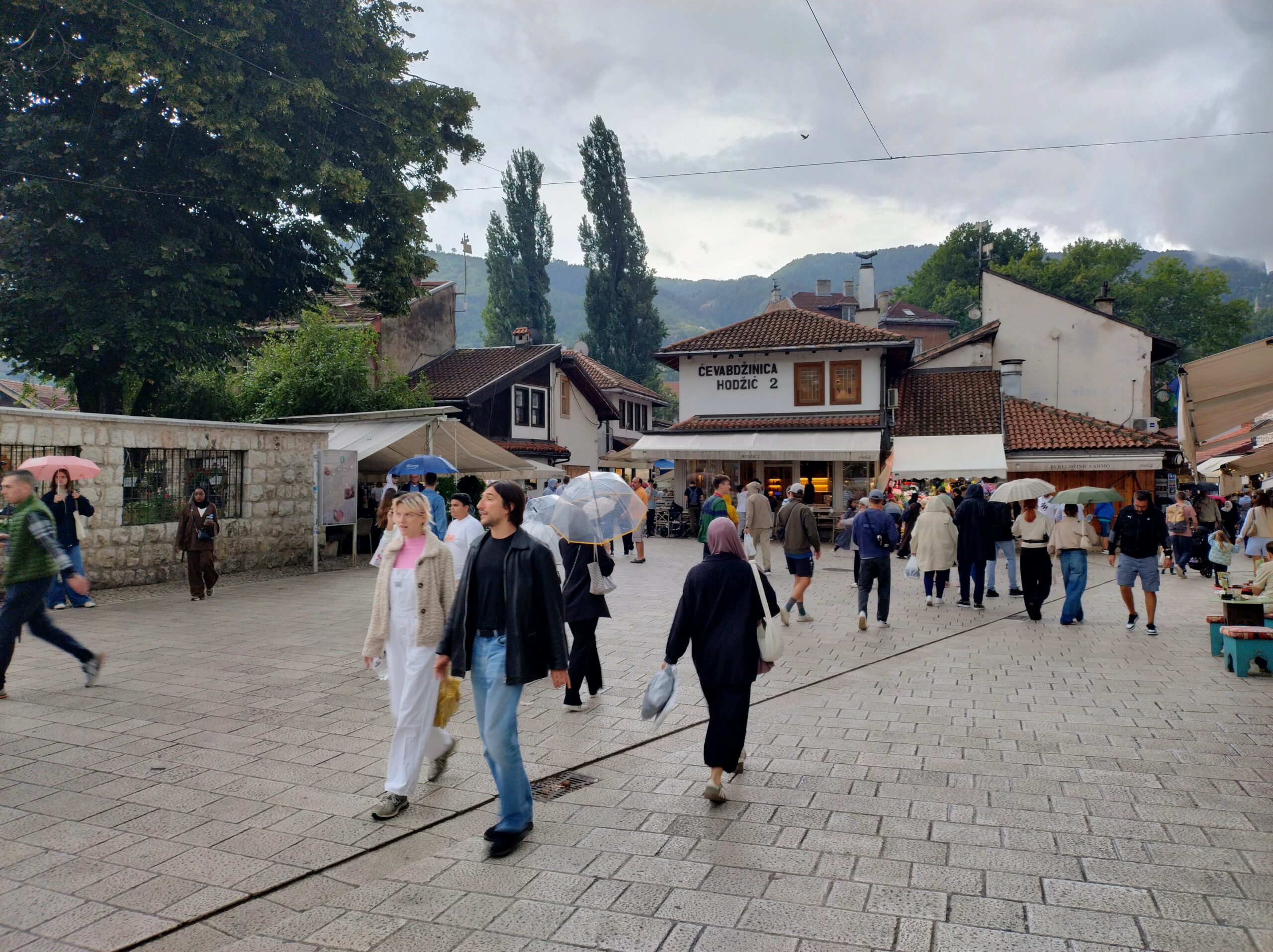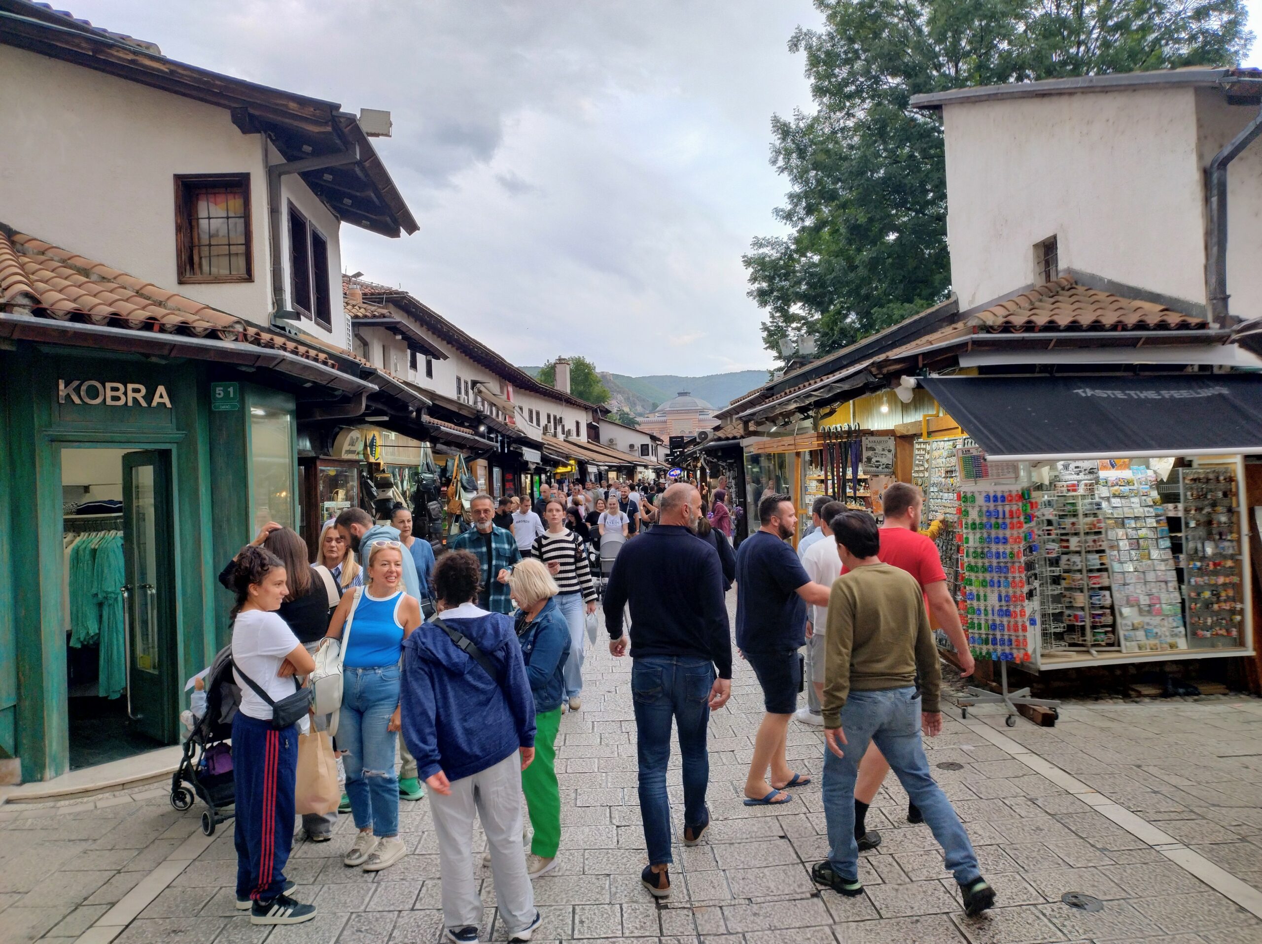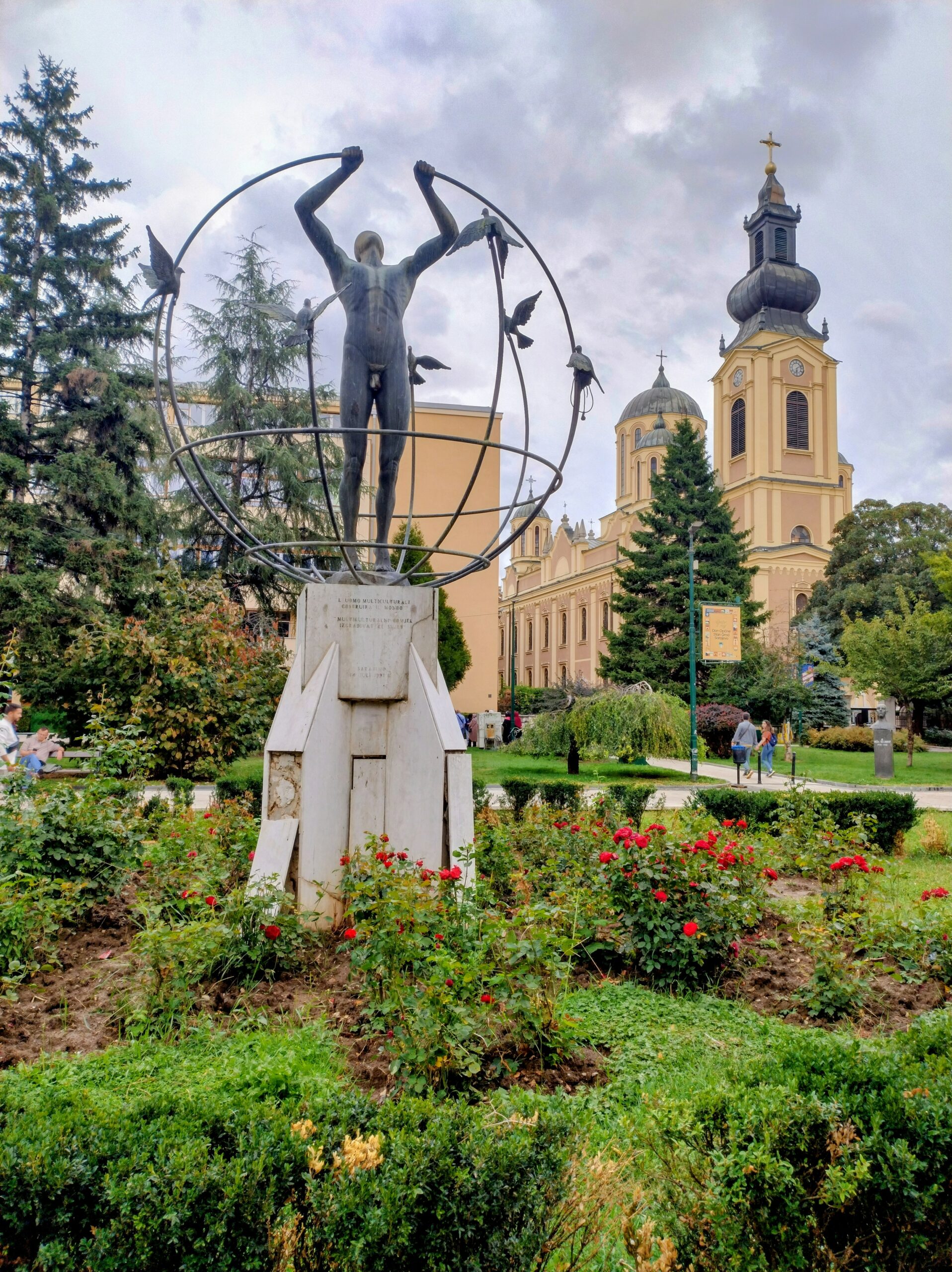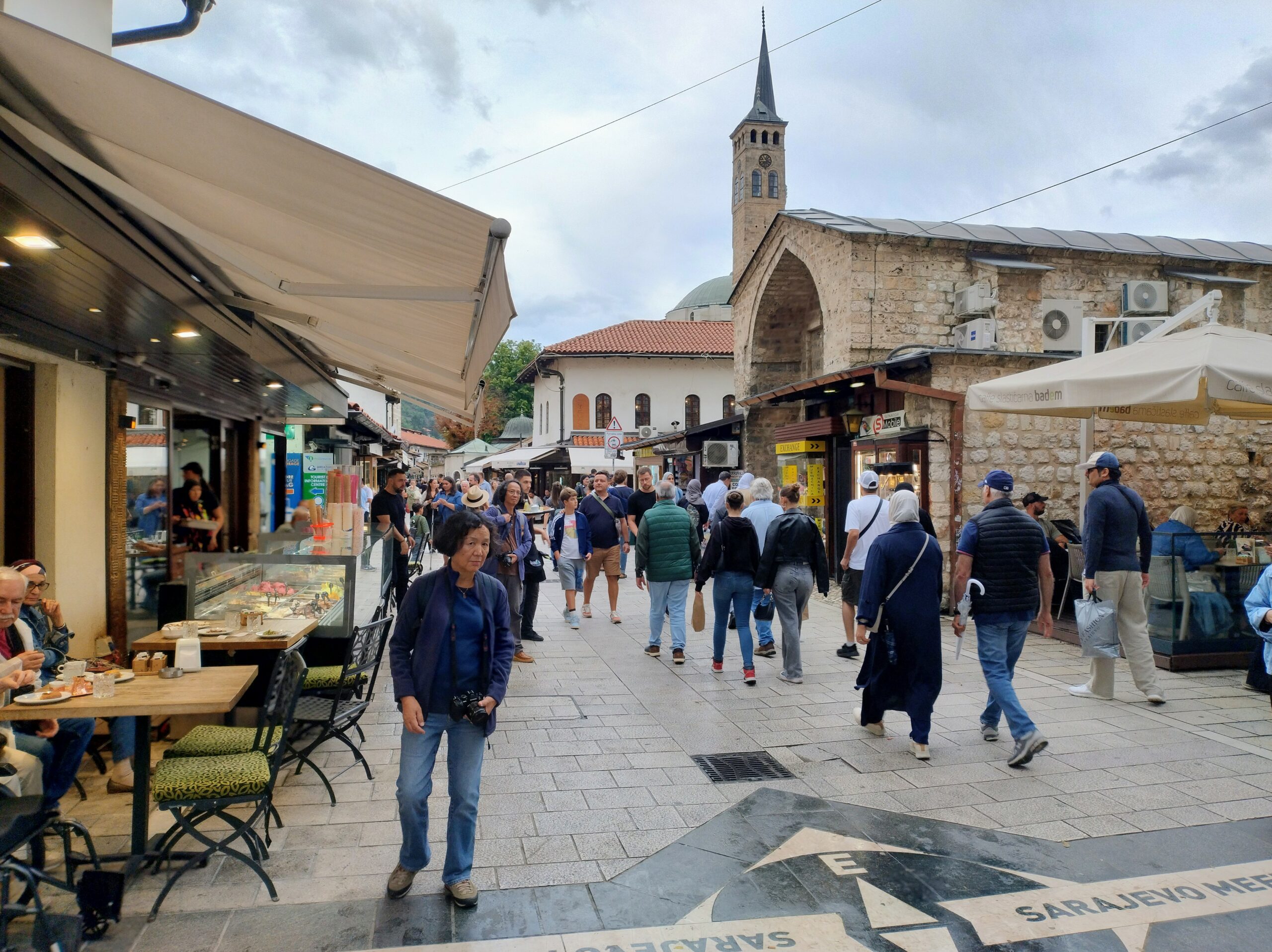 Od tego miejsca odchodzi ulica Ferhadija, która jest wyłączona z ruchu kołowego, i jest jednym z głównych ulic spacerowych Sarajeva. Na małym placu Trg Fra Grge Martića stoi katolicka gotycka Katedrala Srca Isusova z XIXw. A przed nią stoi pomnik naszego papieża Jana Pawła II. Kawałek dalej przy tej samej ulicy nieco na uboczu jest meczet Ferhadija džamija. I to co się od razu rzuca w oczy w tym mieście to tolerancja wyznaniowa.