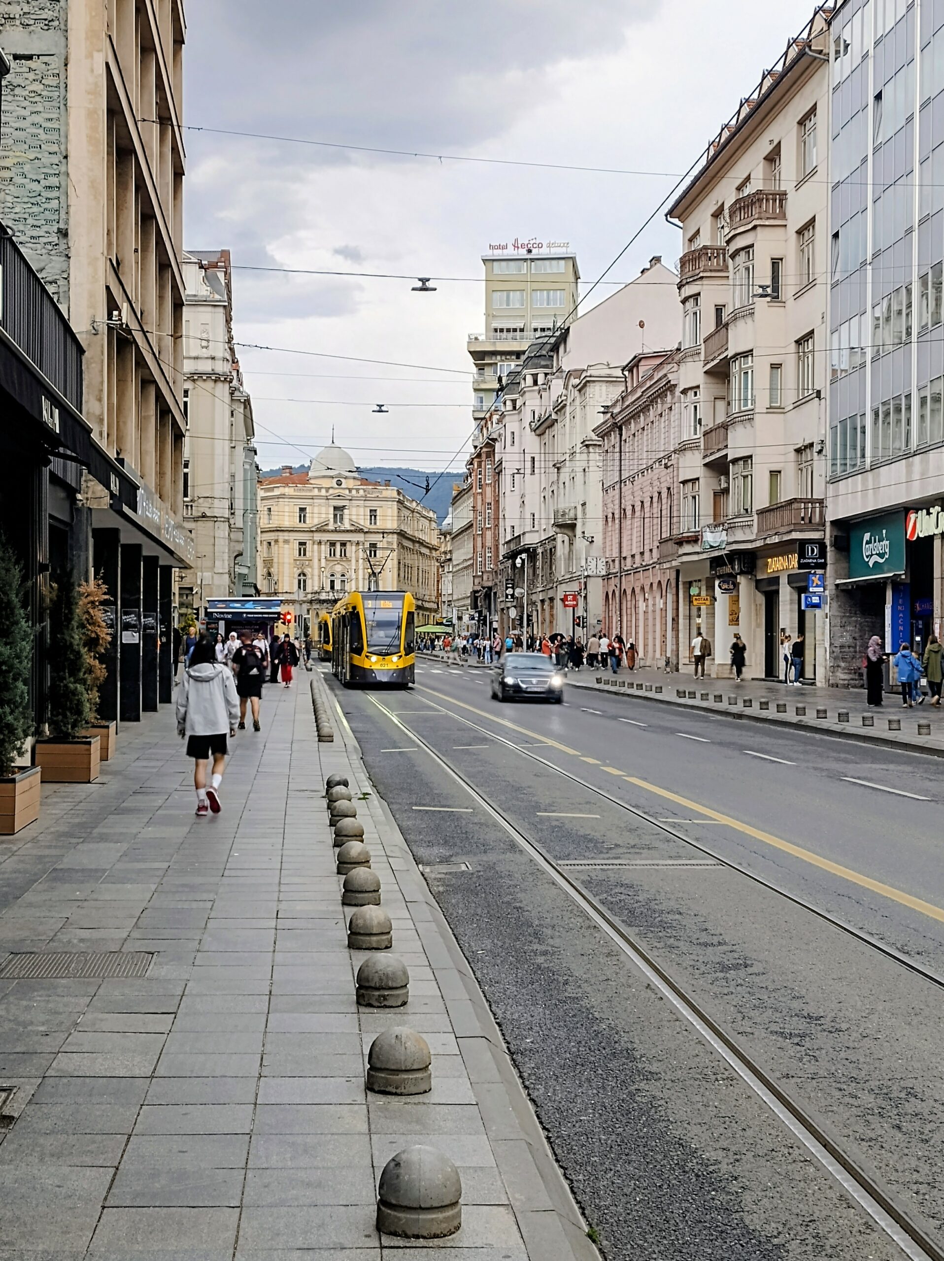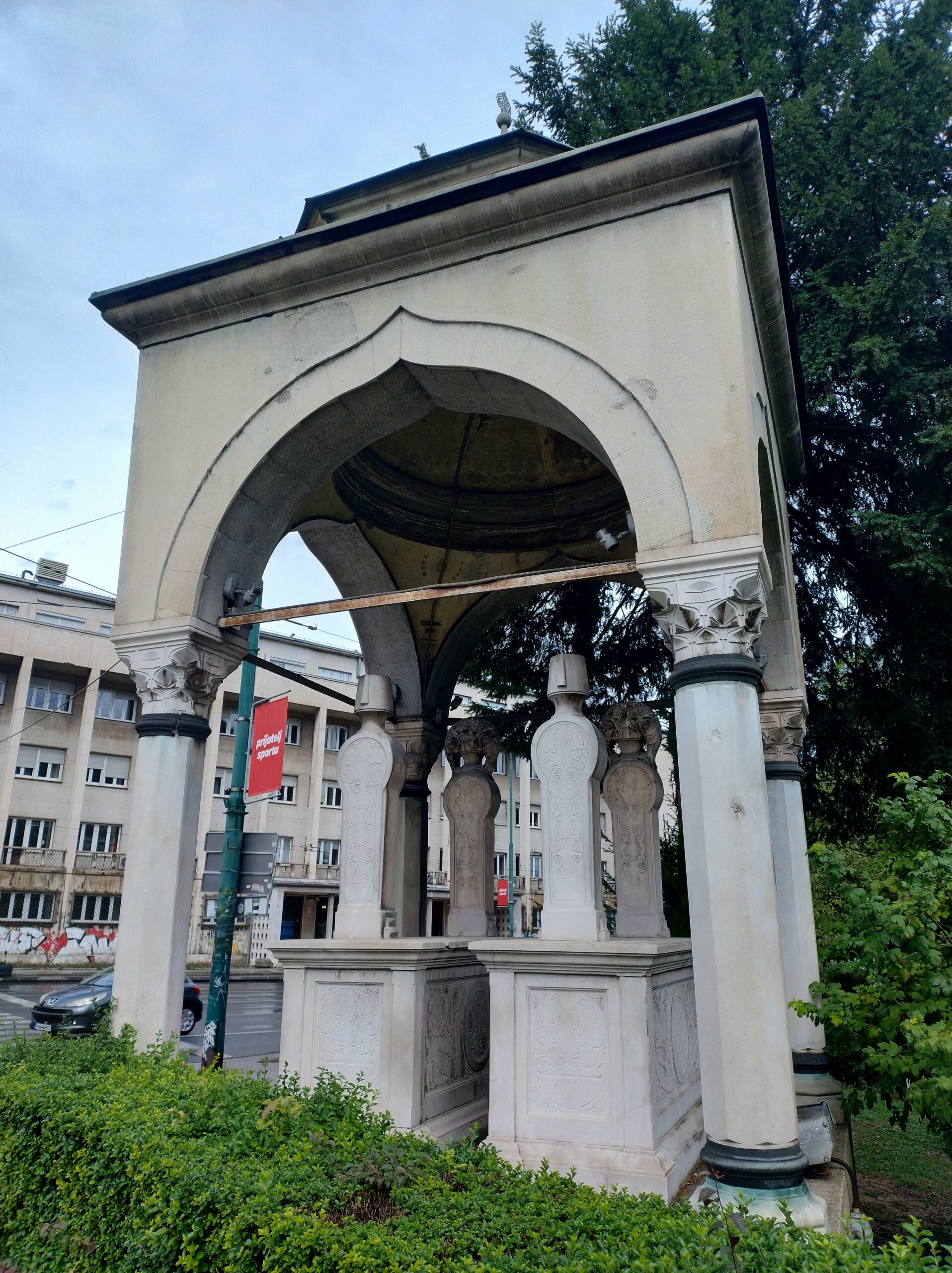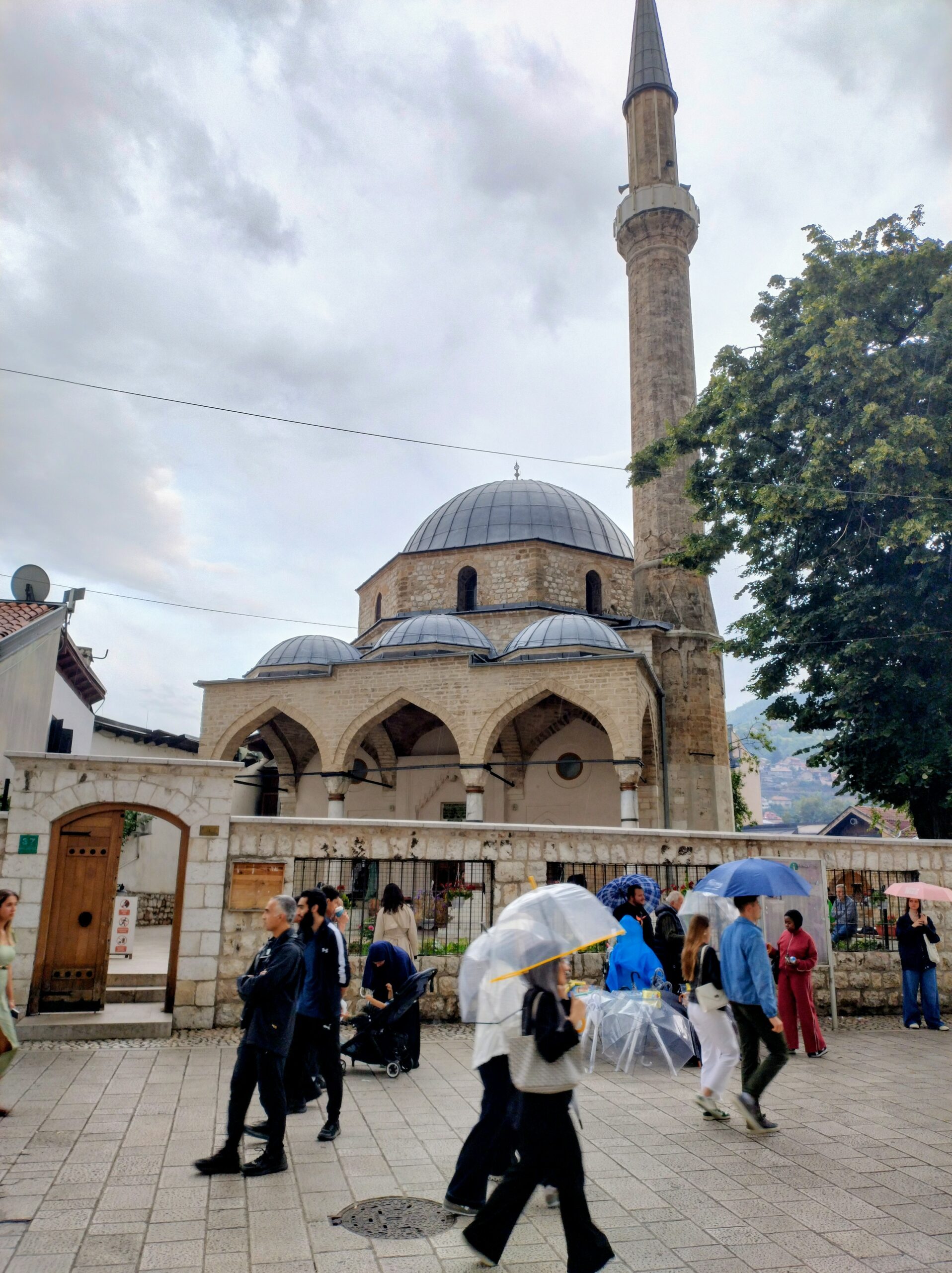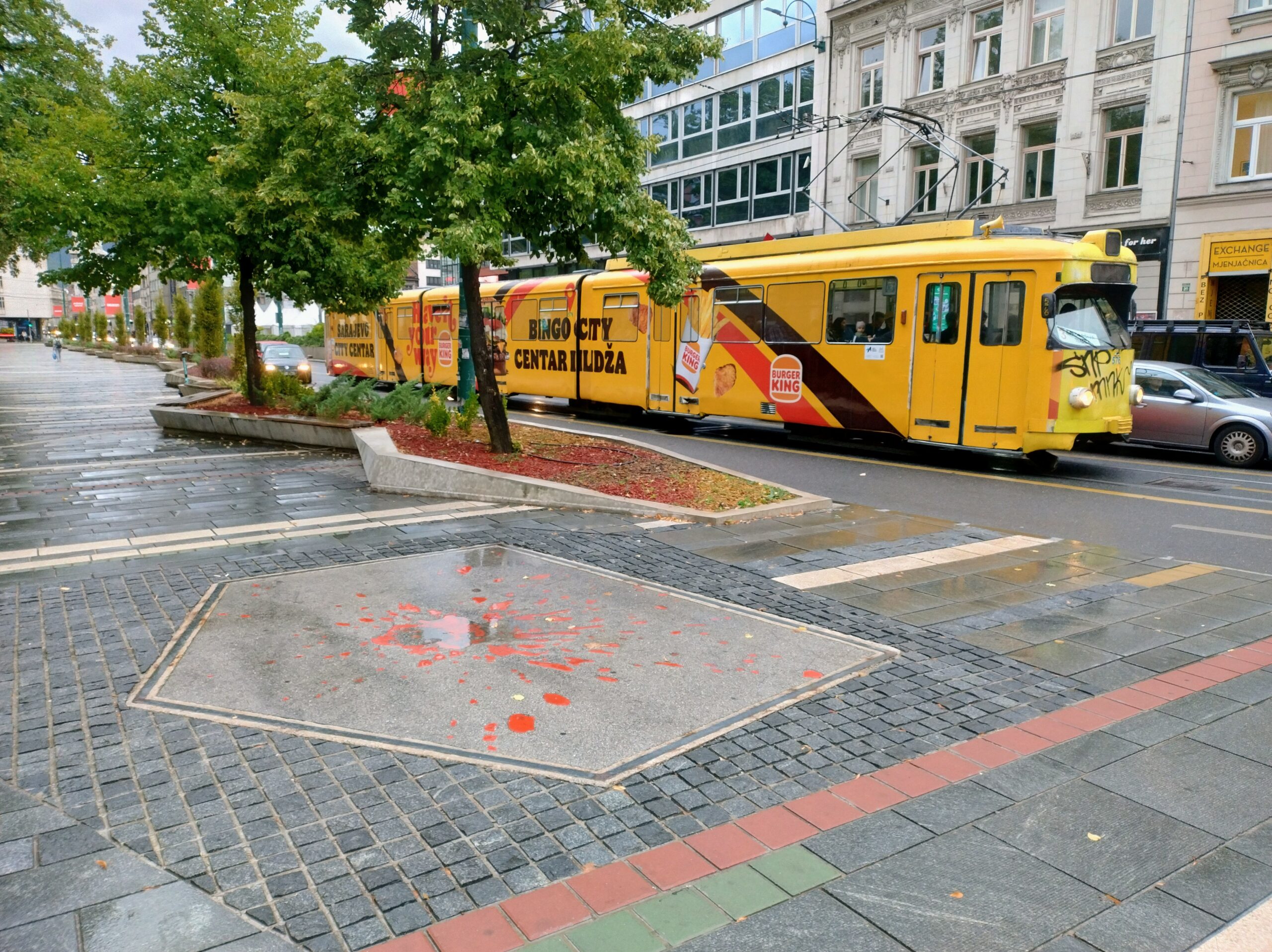 Od tego miejsca odchodzi ulica Ferhadija, która jest wyłączona z ruchu kołowego, i jest jednym z głównych ulic spacerowych Sarajeva. Na małym placu Trg Fra Grge Martića stoi katolicka gotycka Katedrala Srca Isusova z XIXw. A przed nią stoi pomnik naszego papieża Jana Pawła II. Kawałek dalej przy tej samej ulicy nieco na uboczu jest meczet Ferhadija džamija. I to co się od razu rzuca w oczy w tym mieście to tolerancja wyznaniowa.