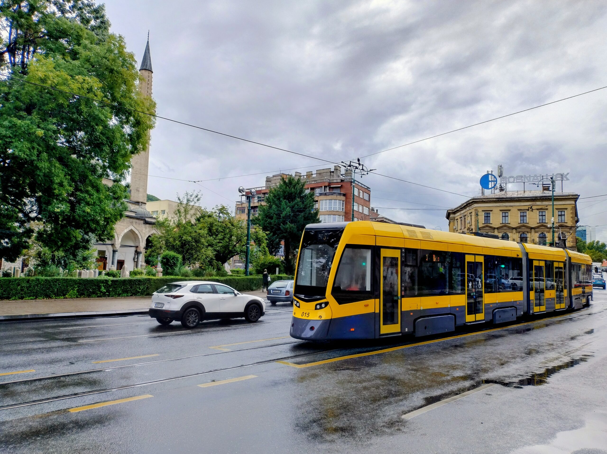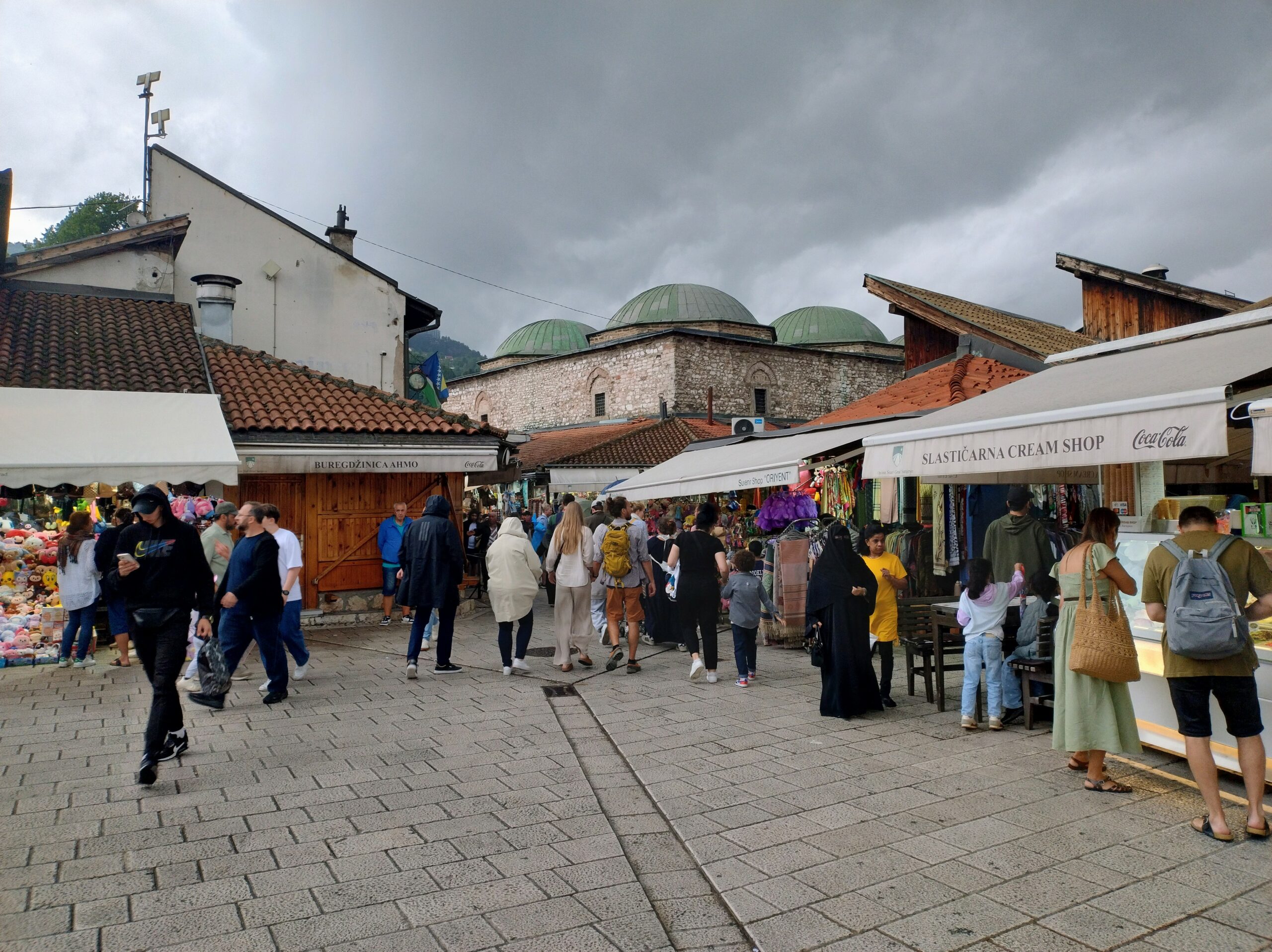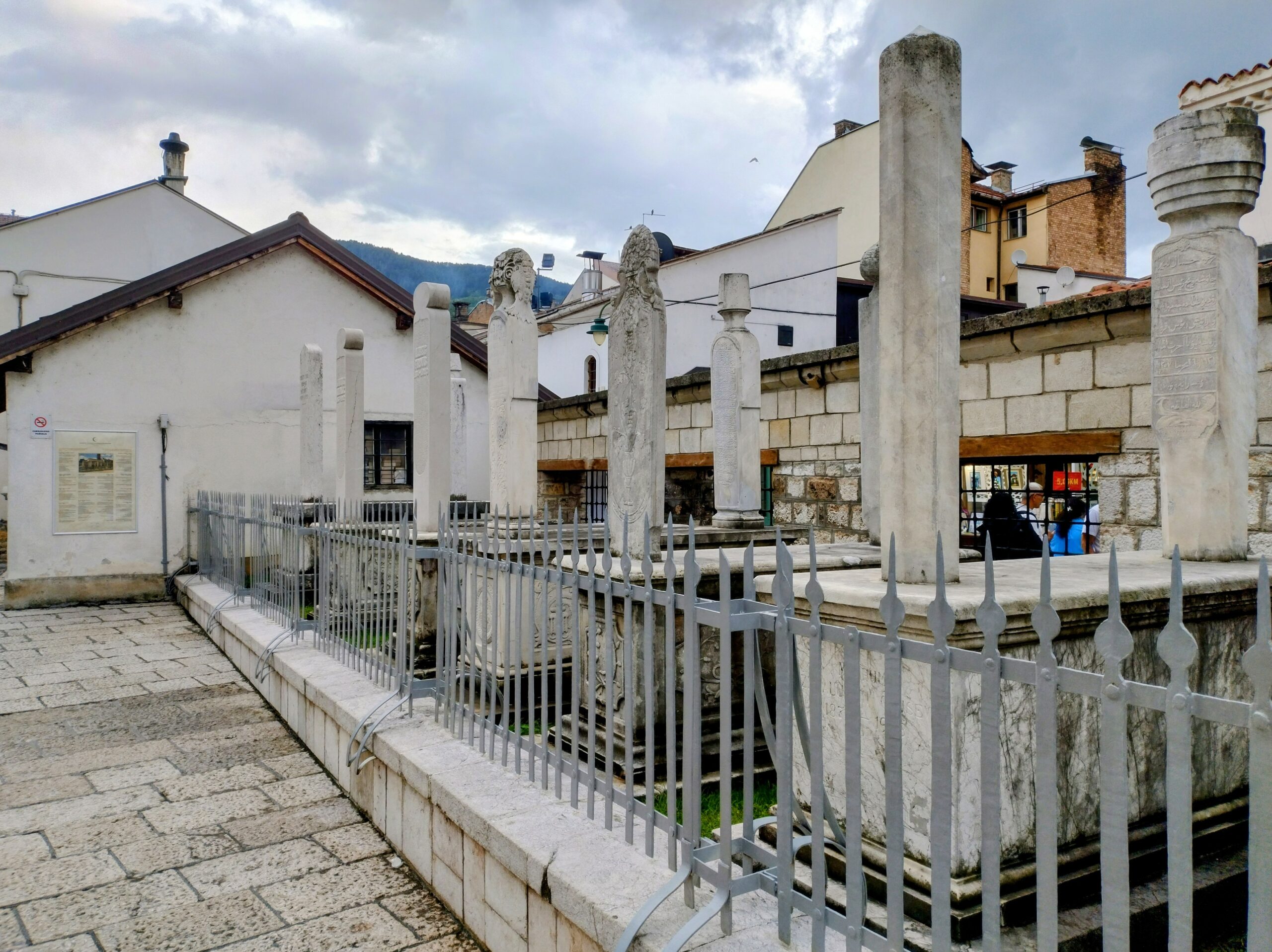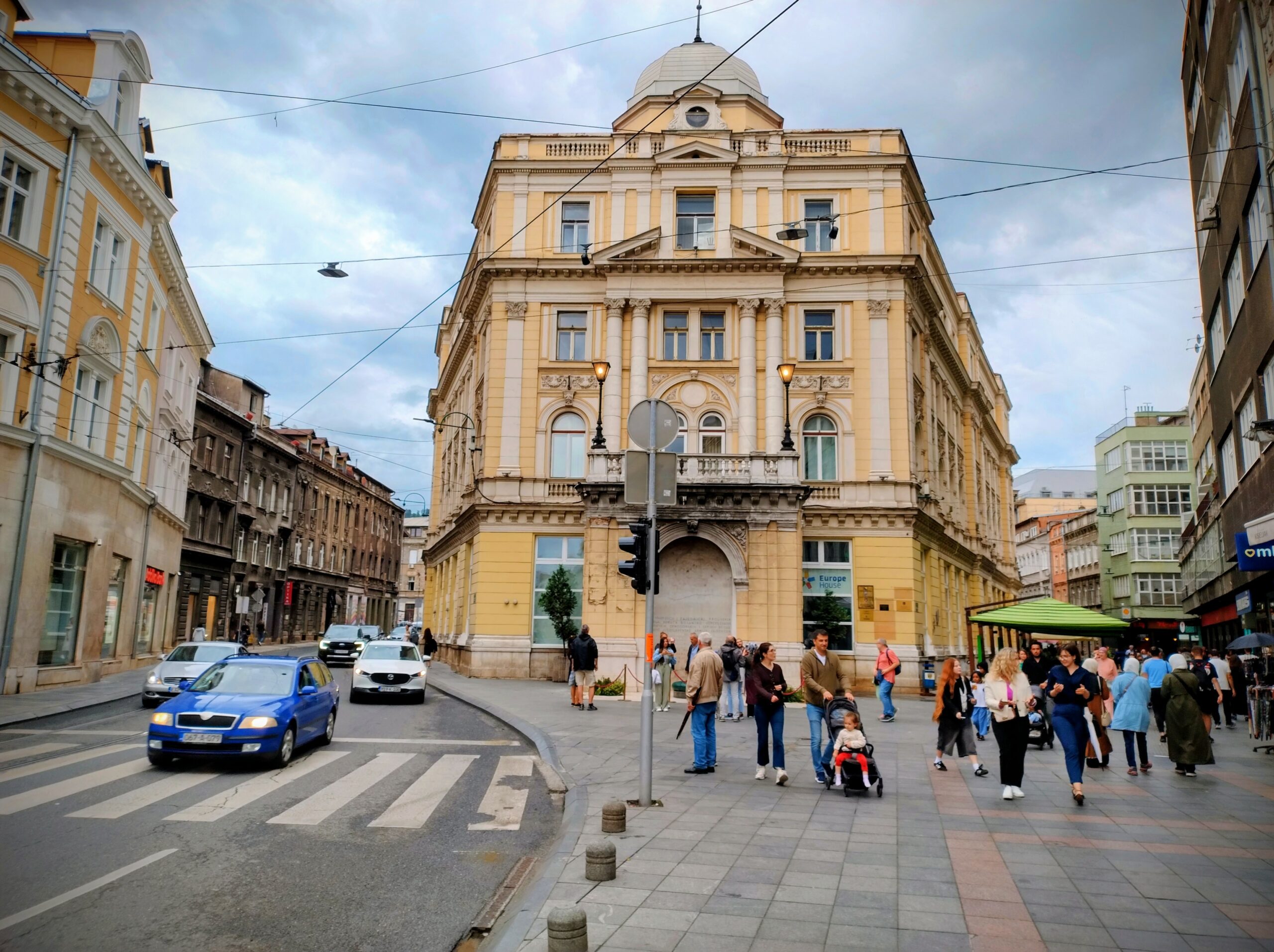 Od tego miejsca odchodzi ulica Ferhadija, która jest wyłączona z ruchu kołowego, i jest jednym z głównych ulic spacerowych Sarajeva. Na małym placu Trg Fra Grge Martića stoi katolicka gotycka Katedrala Srca Isusova z XIXw. A przed nią stoi pomnik naszego papieża Jana Pawła II. Kawałek dalej przy tej samej ulicy nieco na uboczu jest meczet Ferhadija džamija. I to co się od razu rzuca w oczy w tym mieście to tolerancja wyznaniowa.