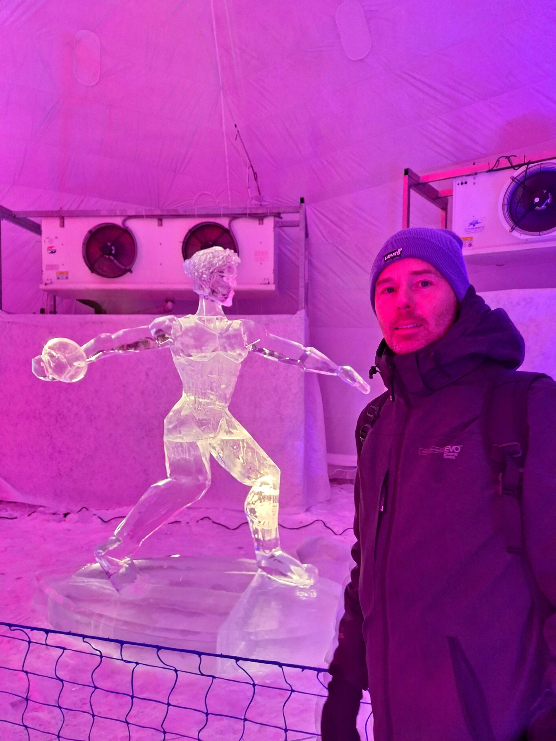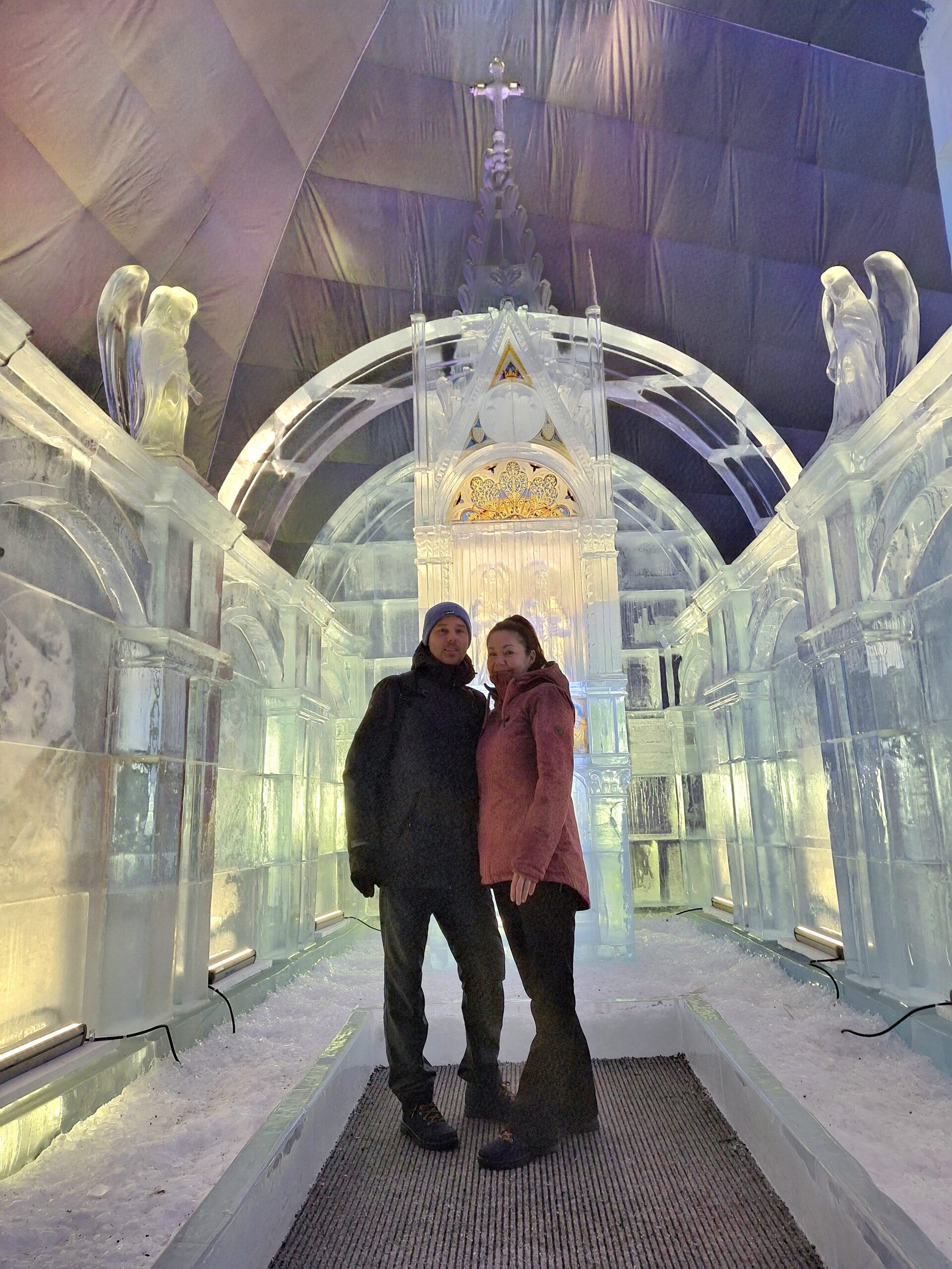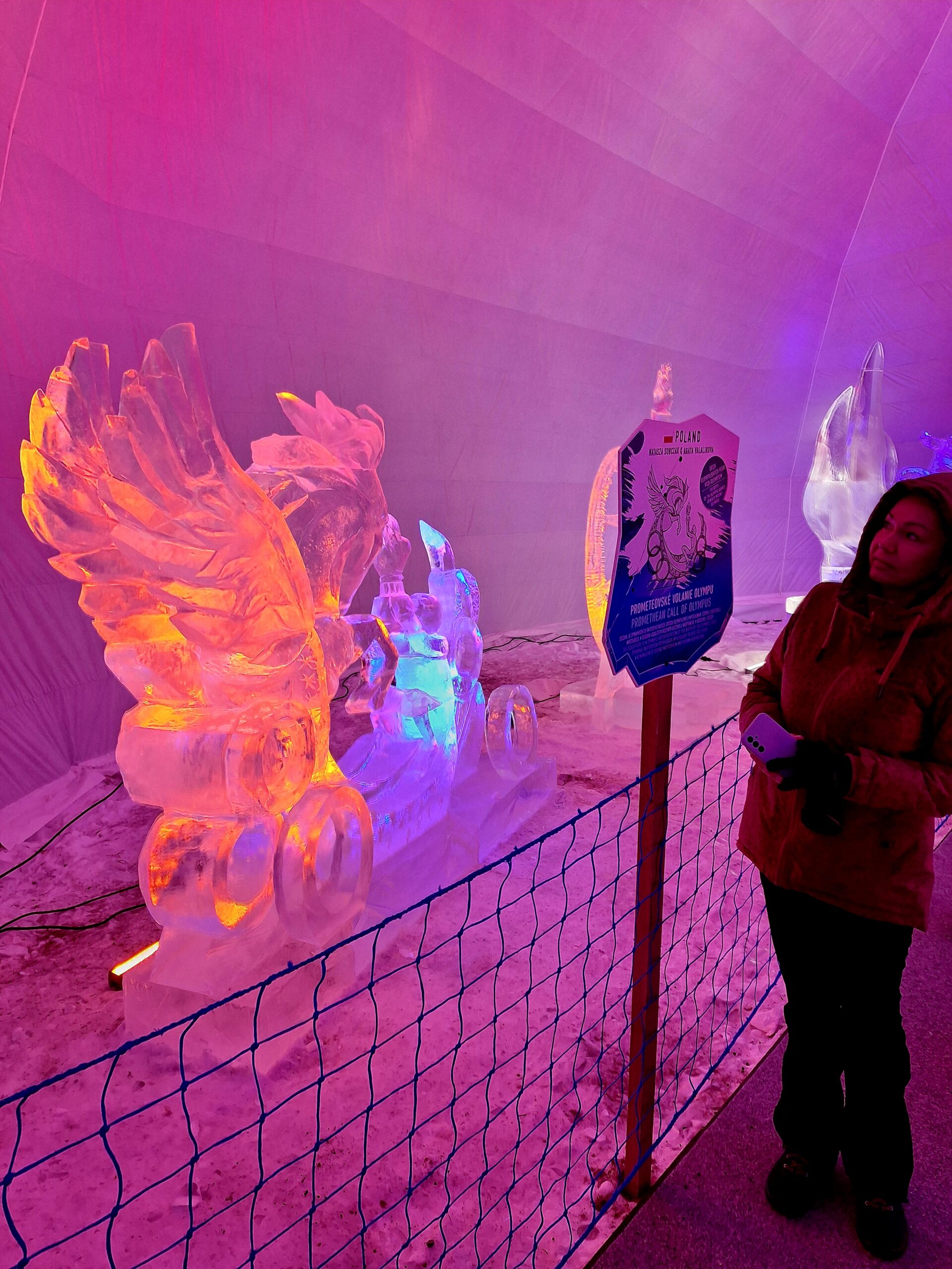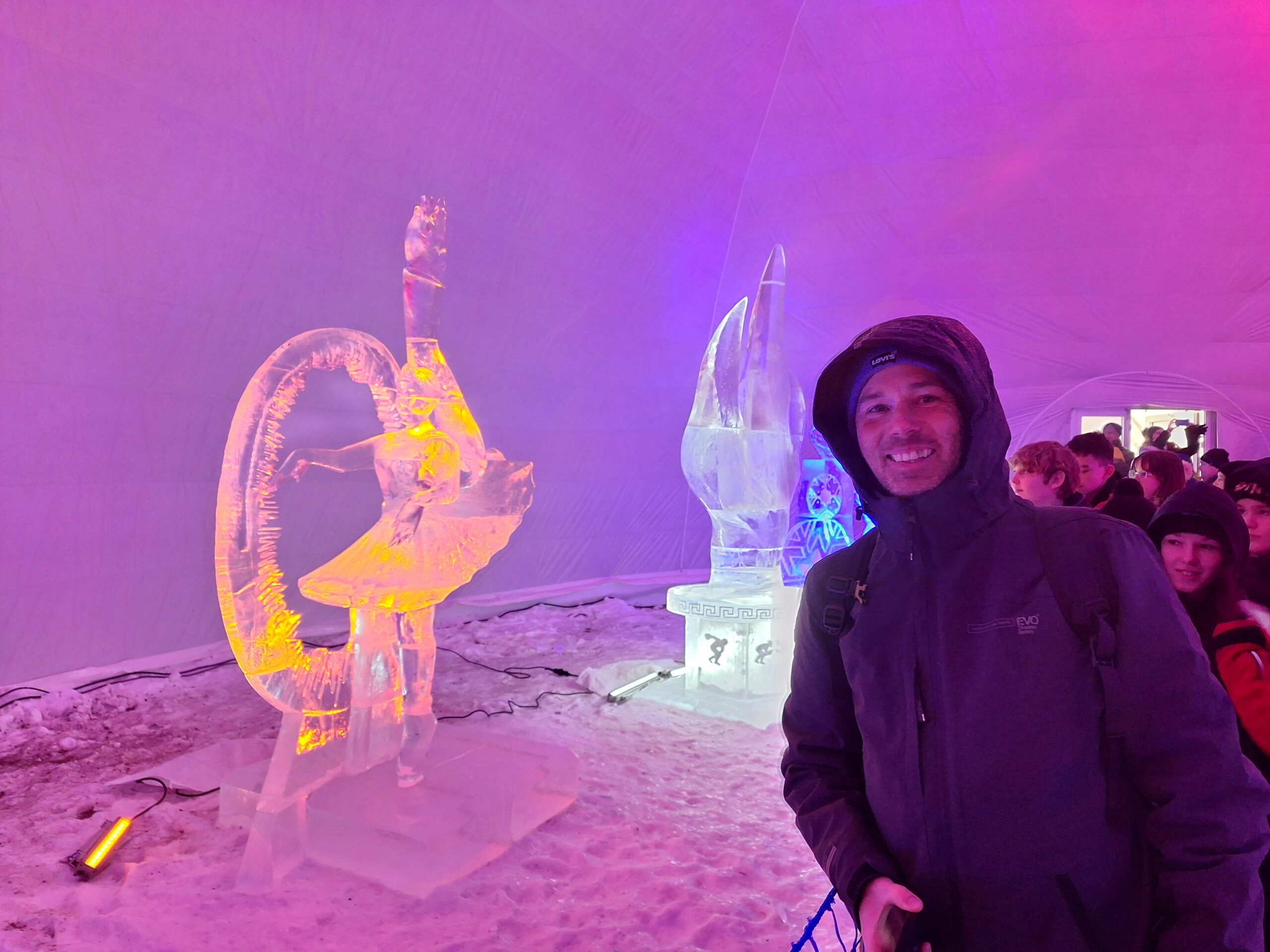 Z uwagi na oblodzenie i lekki deszcz poszliśmy na łatwiznę i na Hrebienok wjechaliśmy kolejką terenową, koszt 18.00€ za bilet na górę. Oczywiście trzeba było odstać 20min w kolejce po bilety. Na górze zanim wystartowaliśmy na szlak, ustawiliśmy się jeszcze w sznureczku chętnych by zobaczyliśmy wystawę rzeźb z lodu (Ľadový Dóm). Wstęp jest za darmo. Jest to stała ekspozycja w zimowej aurze.