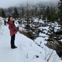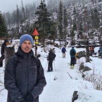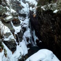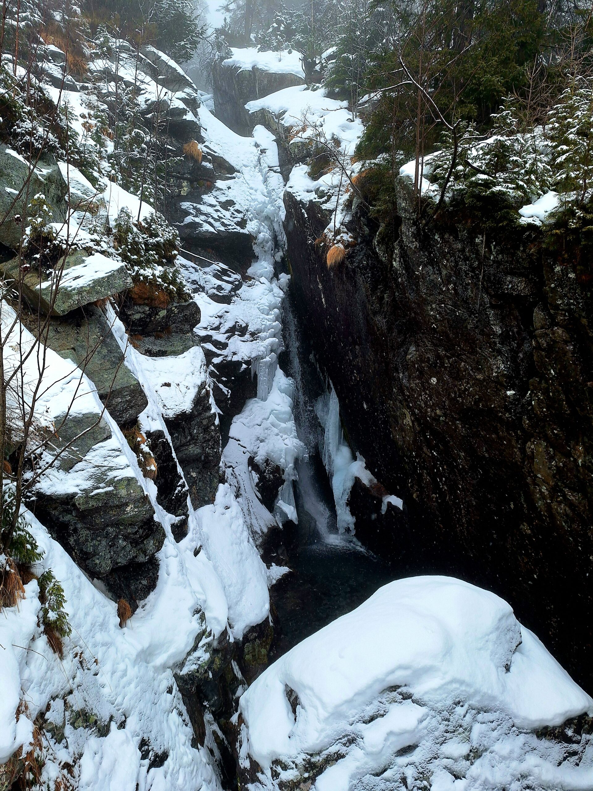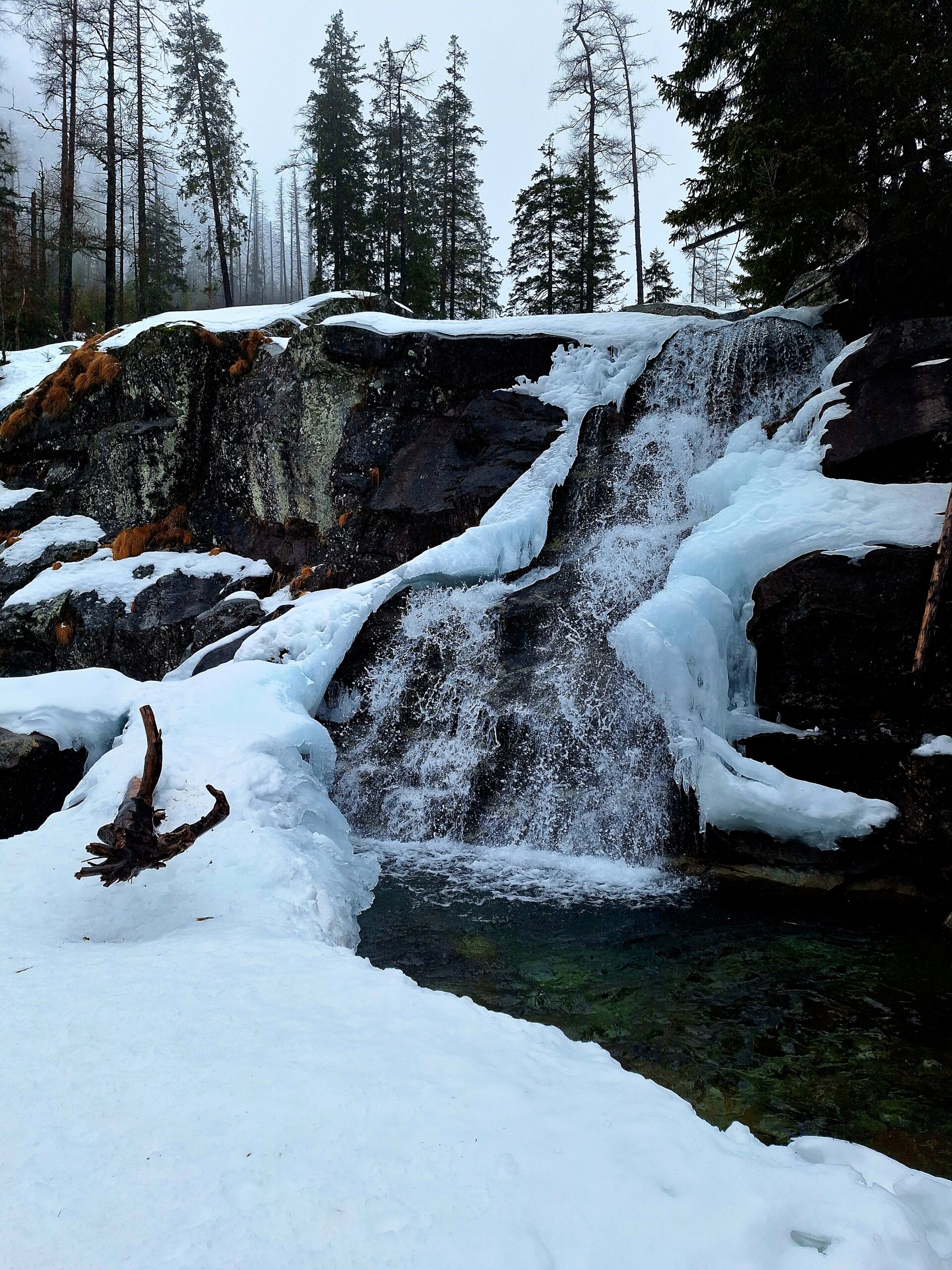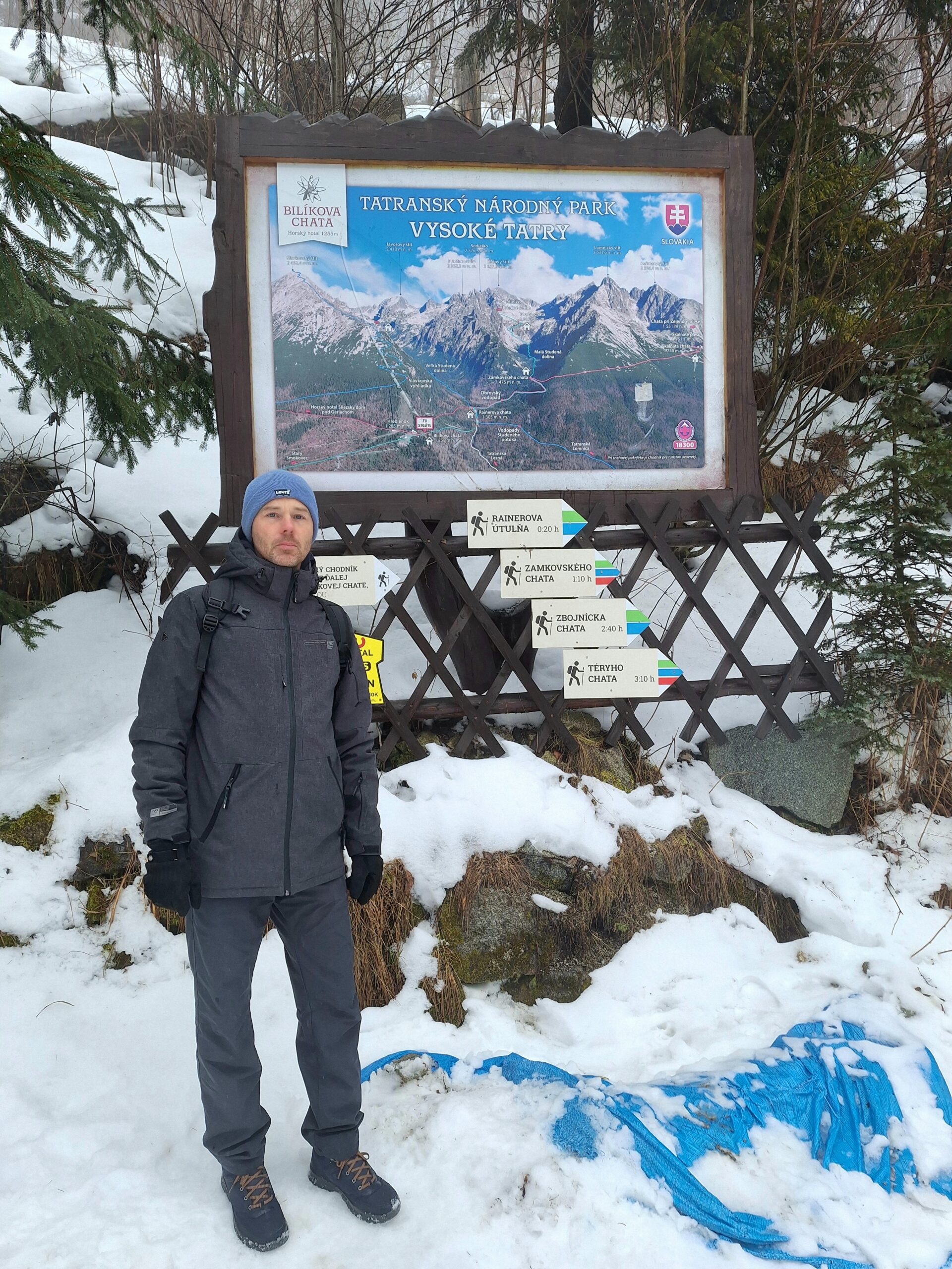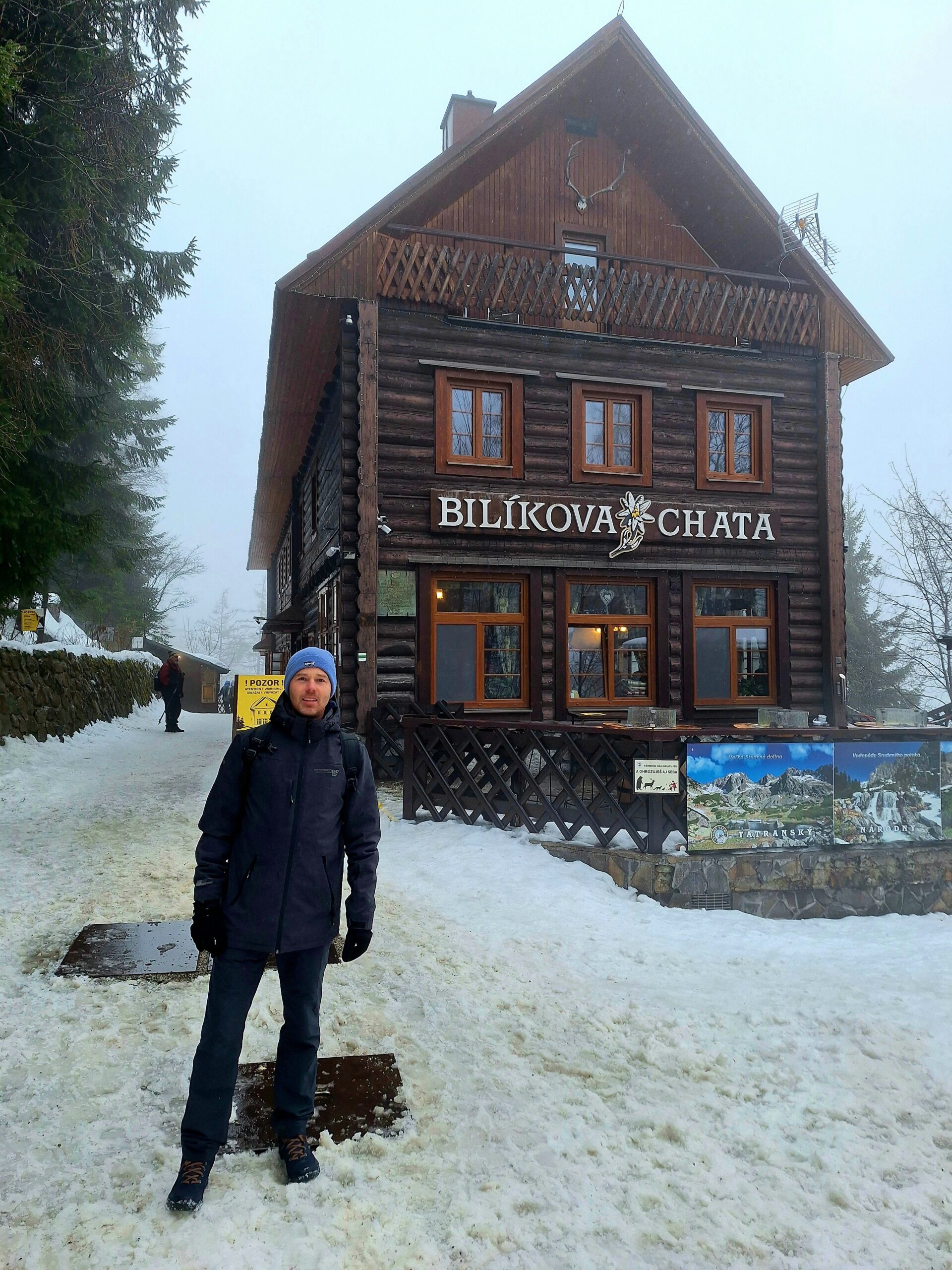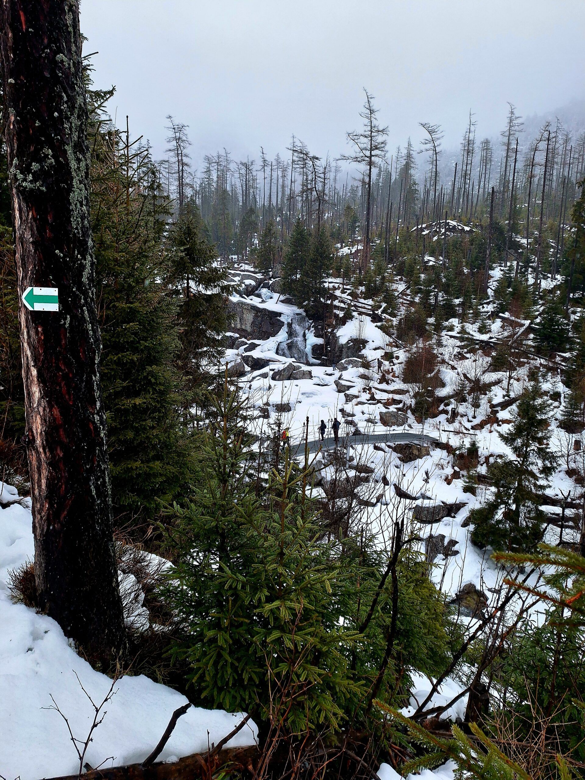 Hrebenok położony jest już na wysokości 1285m.n.p.m. Normalnie można by stąd ruszyć do naszego celu Magistralą Tatrzańską, niestety w zimie jest zamknięta. Więc trzeba iść lekkim obejściem przez schronisko Bilíkova chata i Vodopády Studeného potoka oraz Rainerova útulňa. Ale to tylko 400m dłuższej trasy, choć w dół, po lodzie. Najdłuższe podejście jest dopiero od rozstaju przy Rázcestie pod Húpačkami, od tego miejsca do schroniska jest 1,7km (ok. 45min drogi pod górę). Ale za to z ładnymi widokami na liczne wodospady oraz dolinę Popradu w oddali. Do naszego celu dotarliśmy po 1h 15min, przeszliśmy 3,6km.