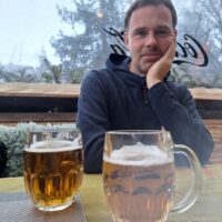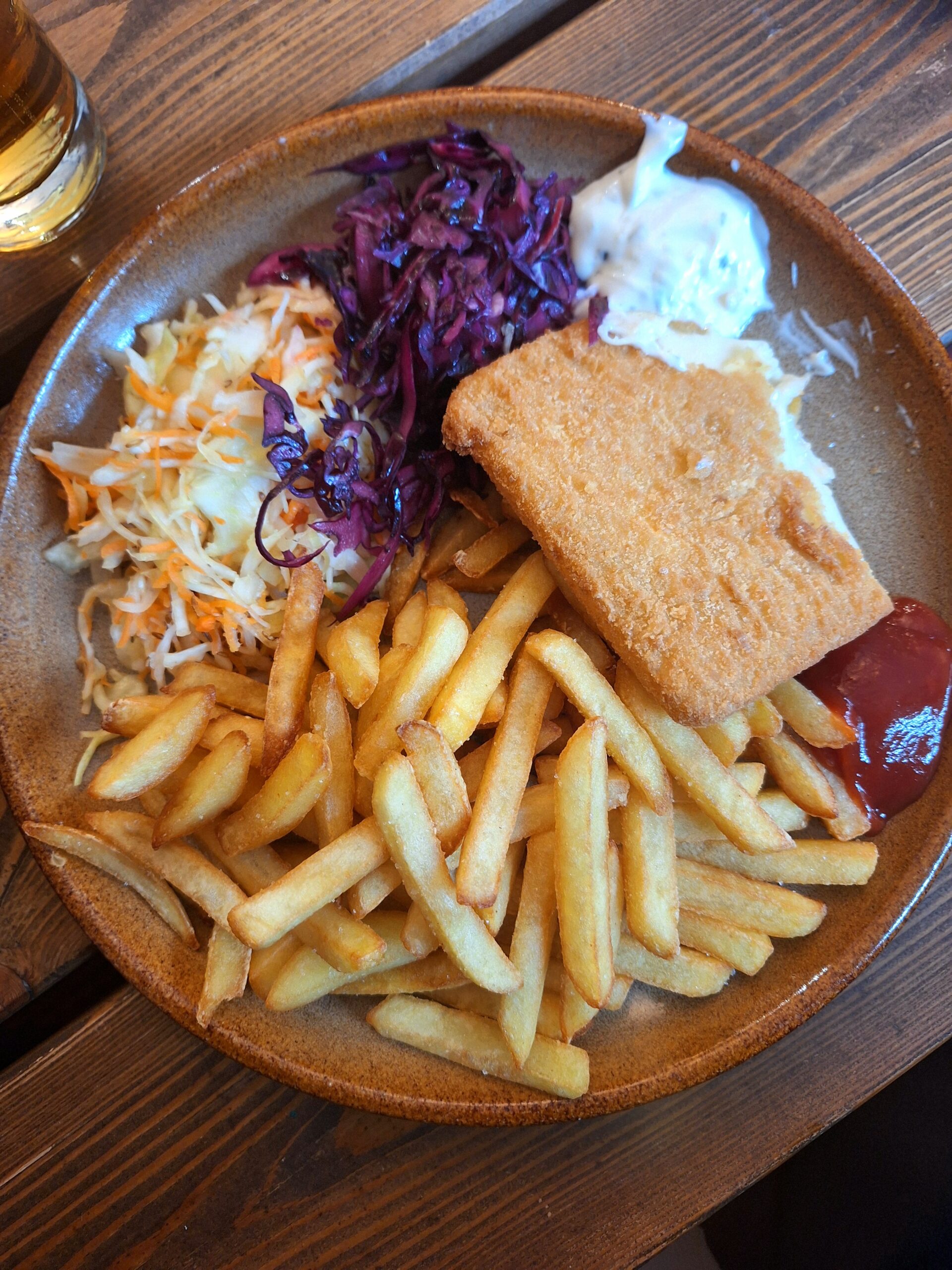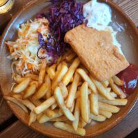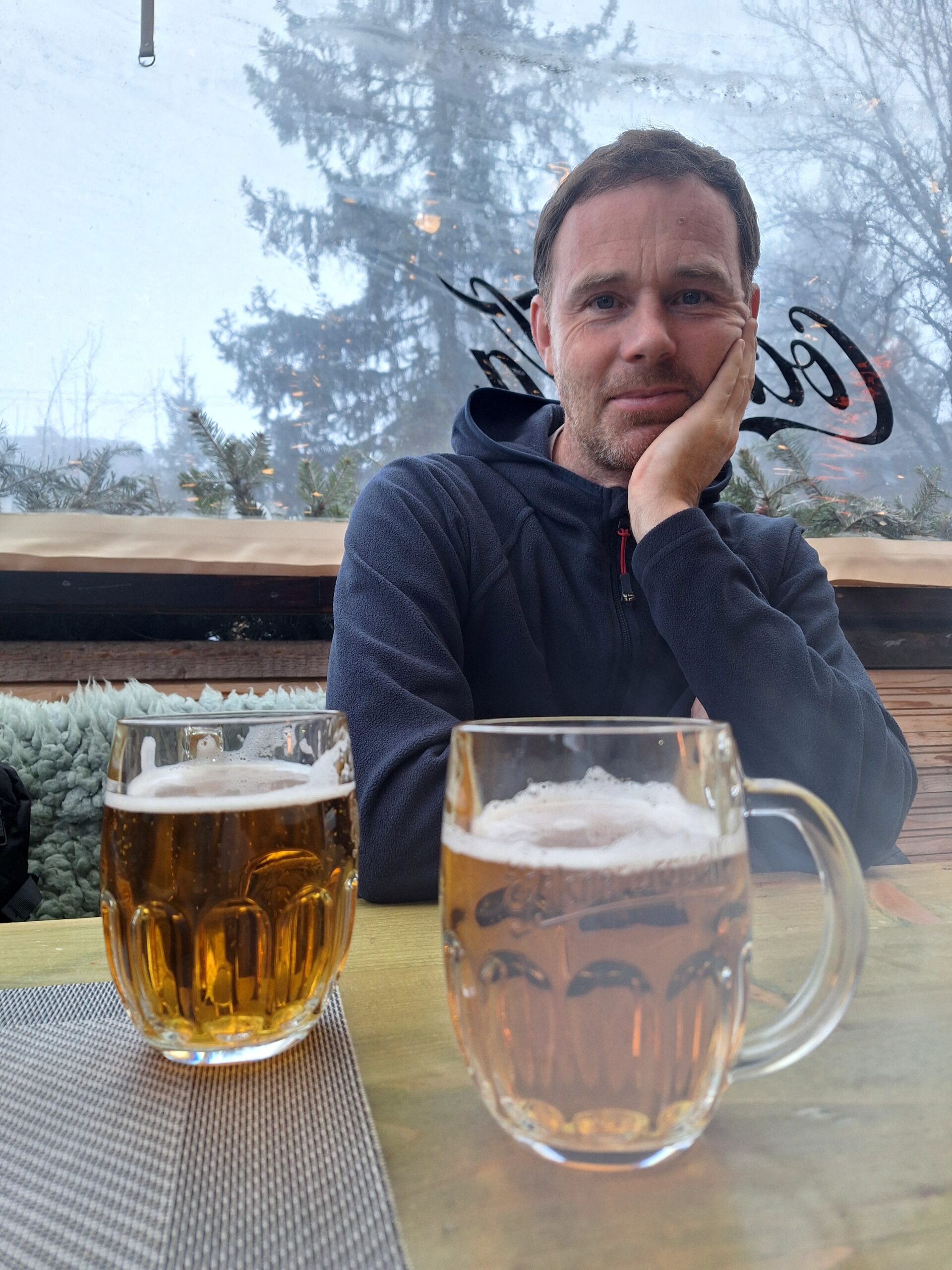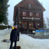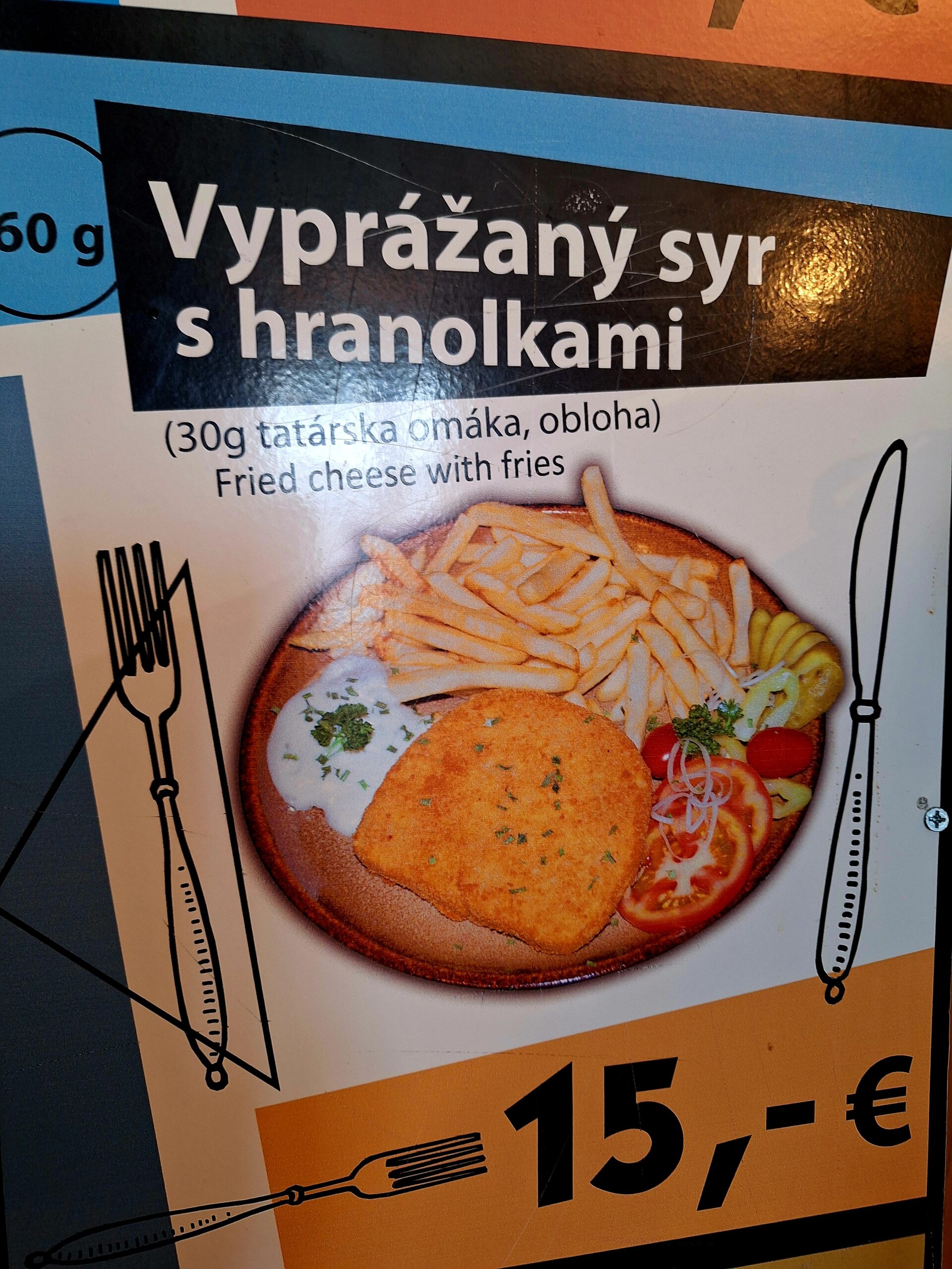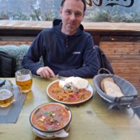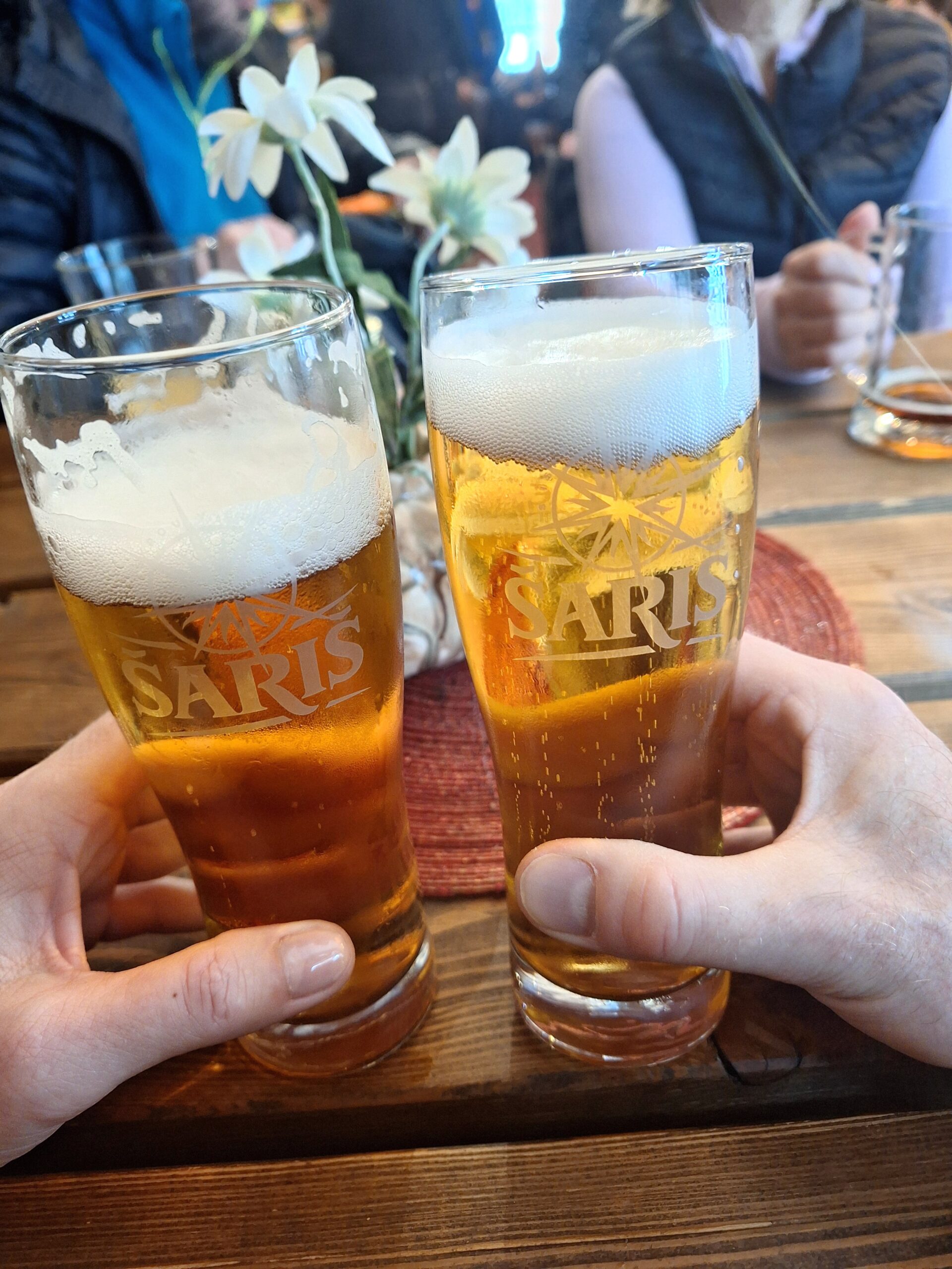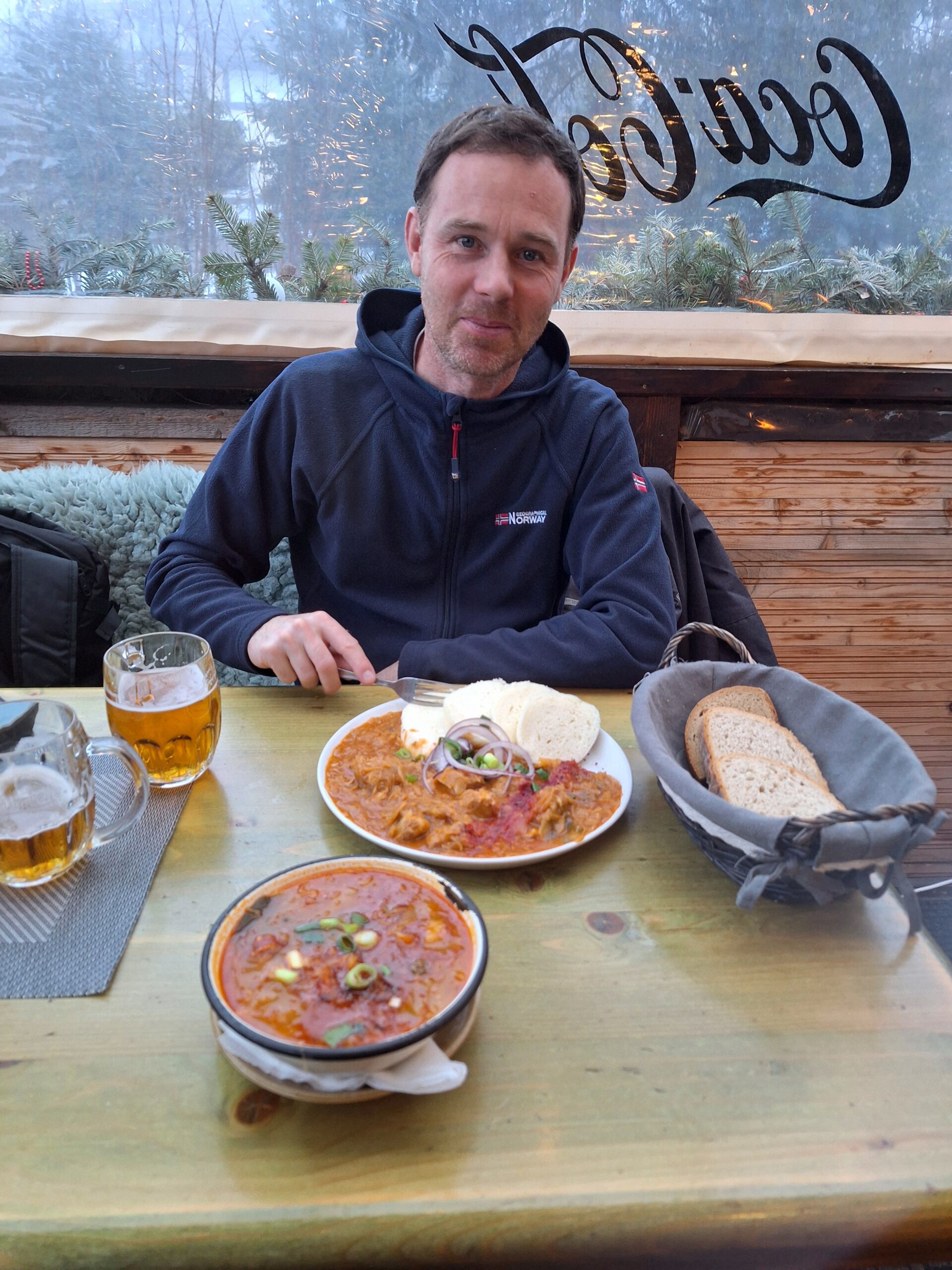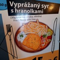 Jak to zwykle bywa w porze około obiadowej w schronisku było pełno ludzi, ale mimo to udało się nam usiąść. Ceny za posiłki są tutaj wyższe niż wczoraj w hotelu (co mnie trochę zaskoczyło). Dociera tutaj też więcej osób. Dziś mieliśmy ochotę na Wyprážaný syr (smażony ser) z frytkami, za które zapłaciliśmy 15.00€. Ser super w smaku. Piwko też tutaj było ciut droższe. Ale i tak taniej niż u nas…